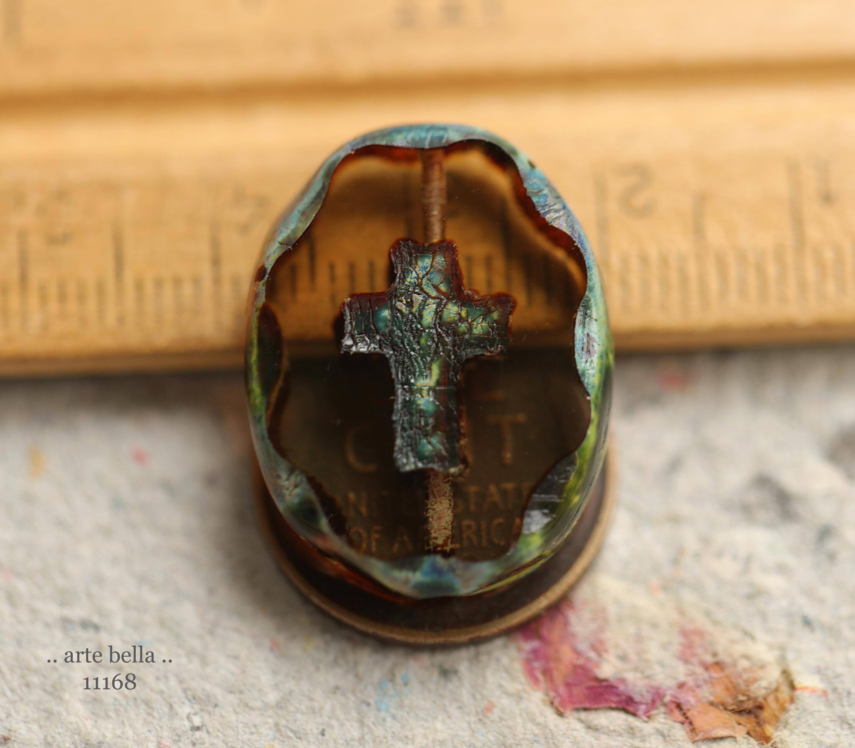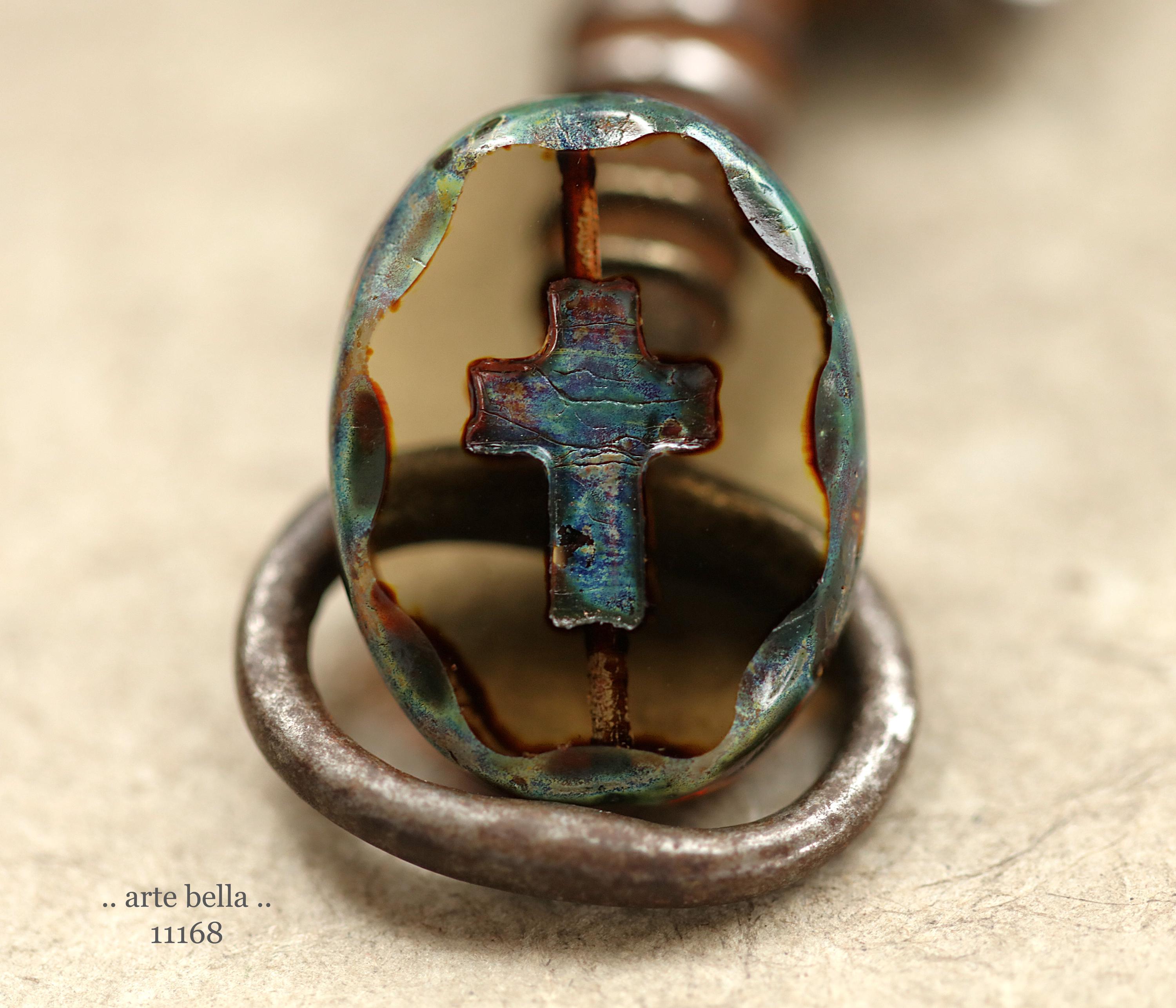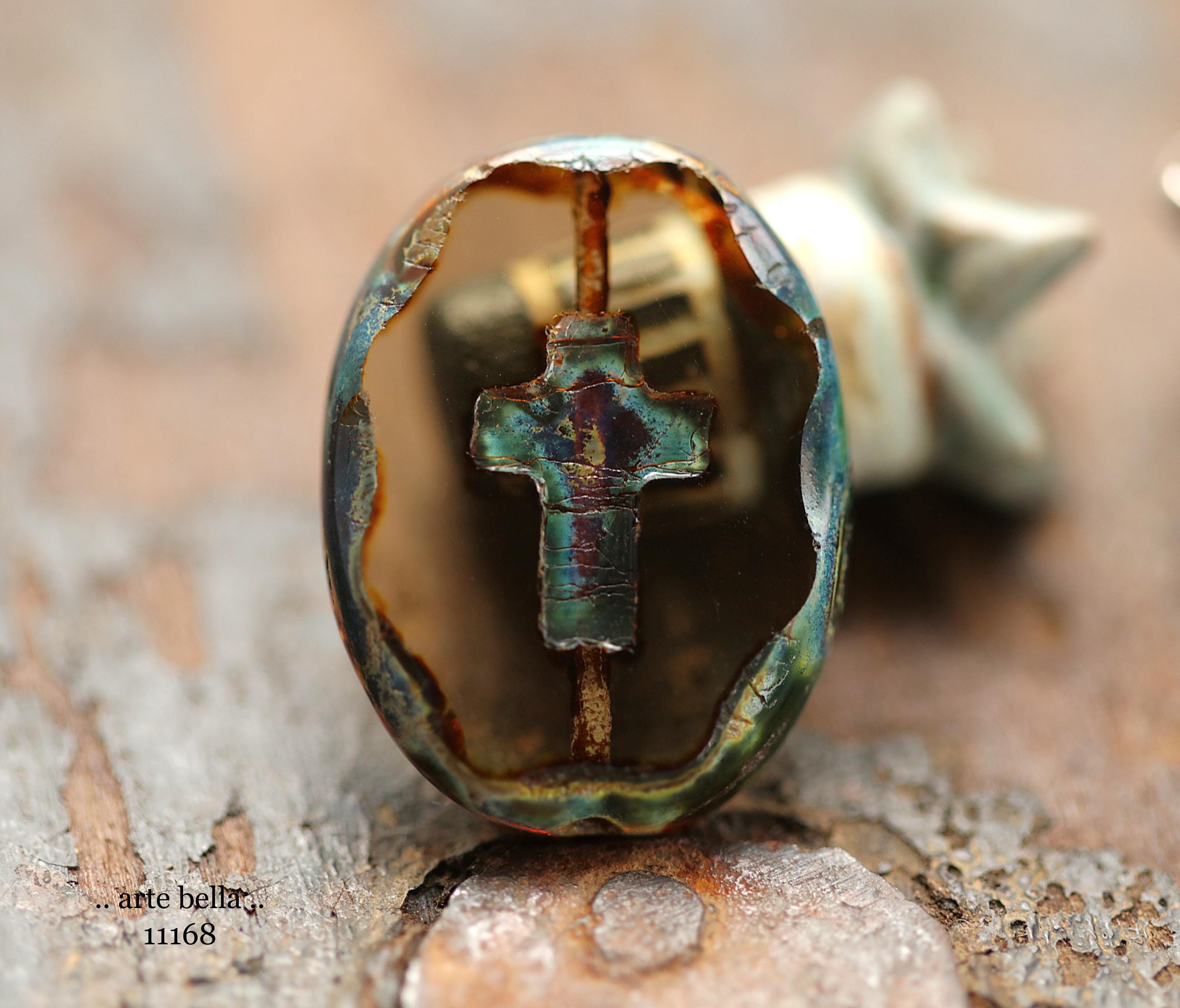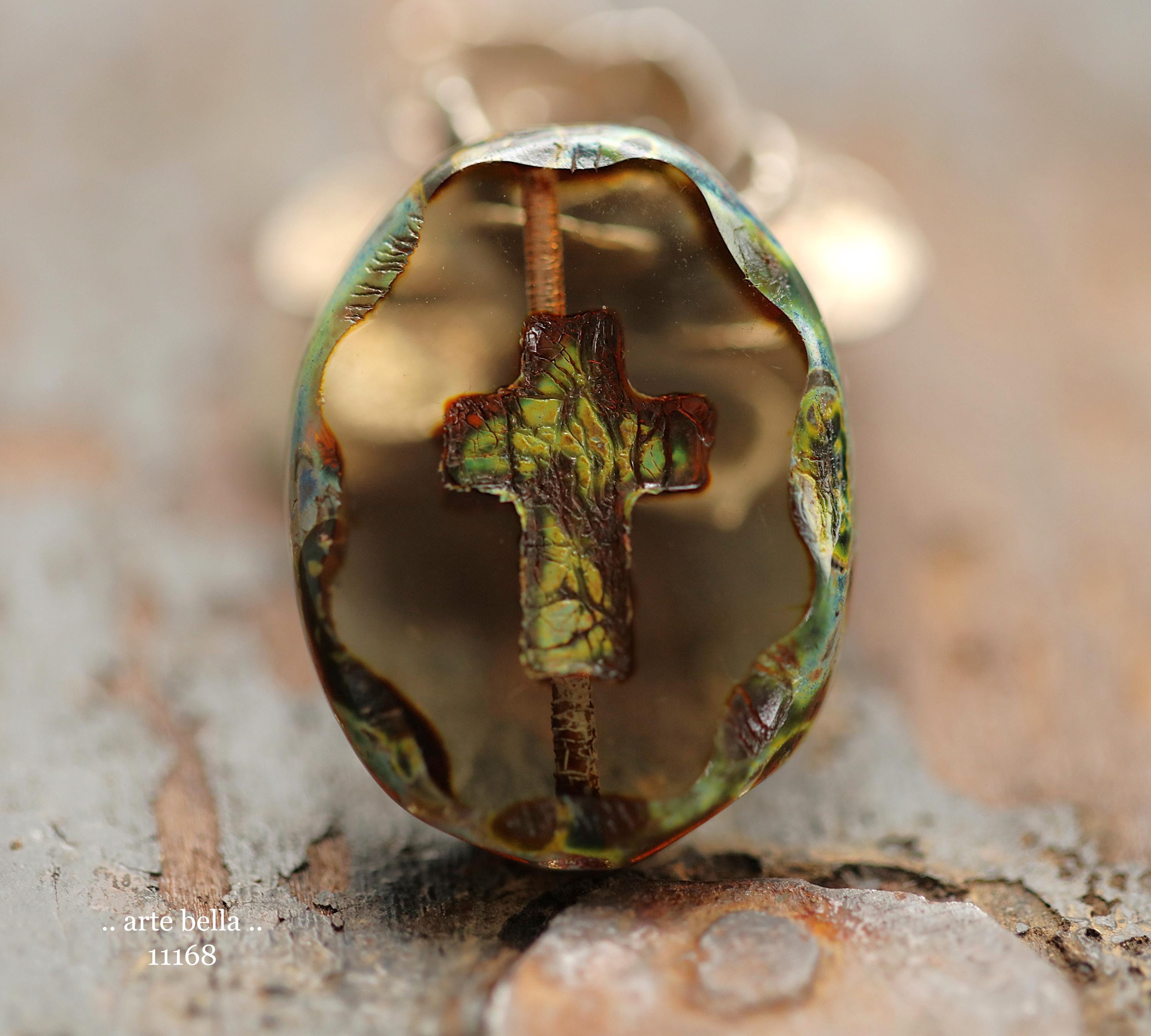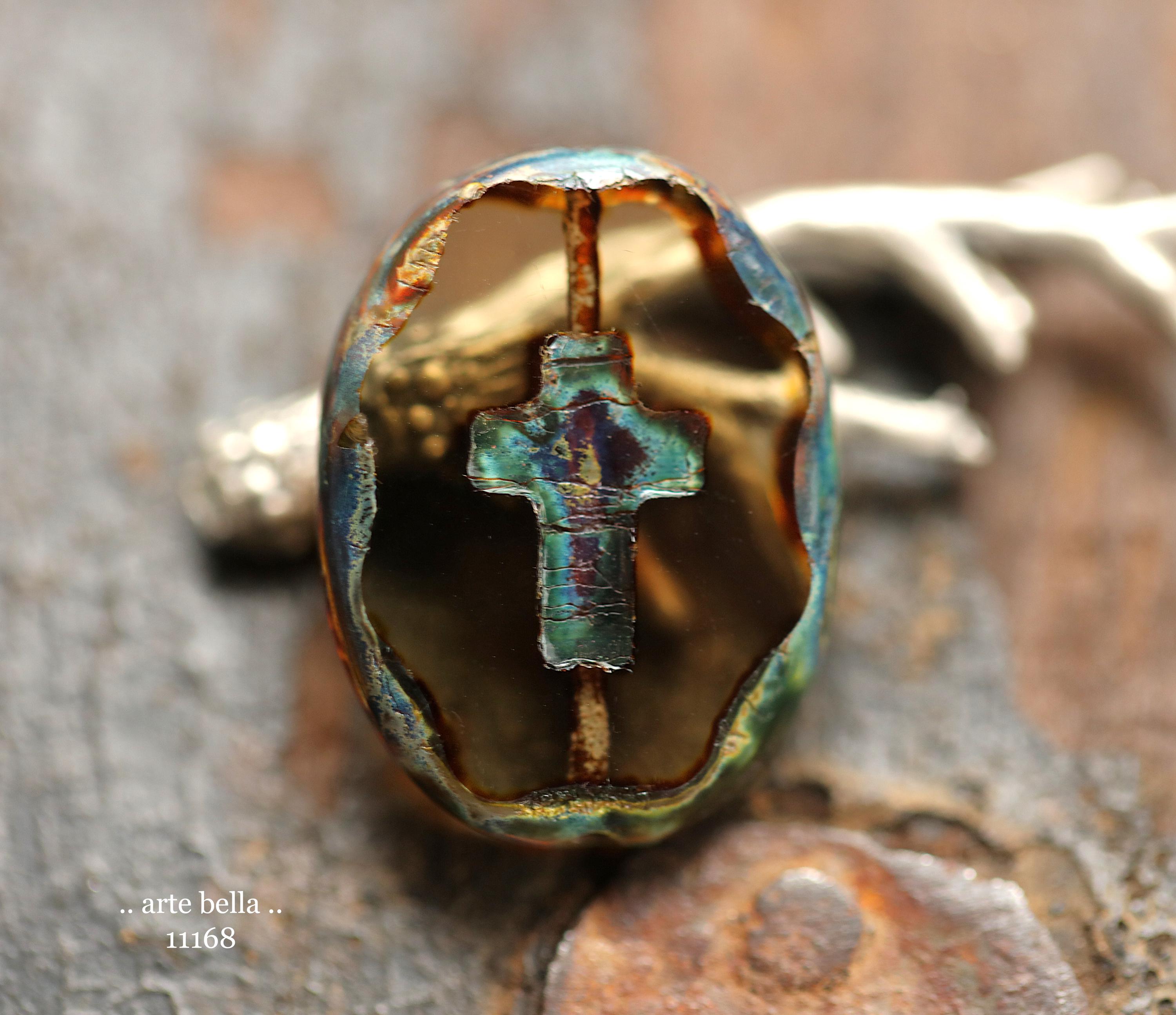 EARTHY FAWN CROSSES .. New 2 Premium Picasso Czech Glass Oval Cross Bead Mix 25x19mm (11168-2) .. jewelry making supplies