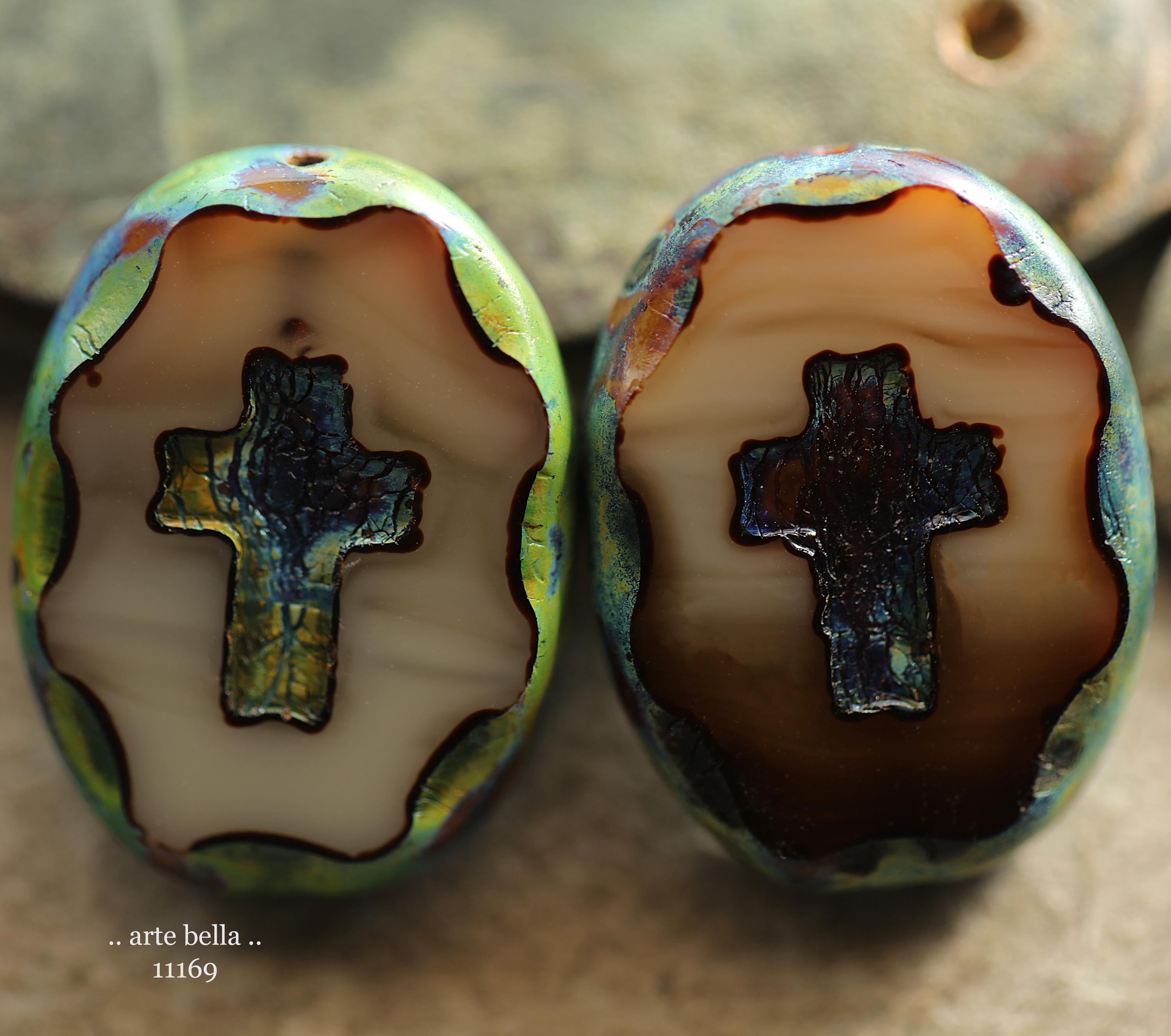 New .. ESPRESSO LATTE CROSSES .. 2 Premium Picasso Czech Glass Oval Cross Bead Mix 25x19mm (11169-2) .. jewelry making supplies