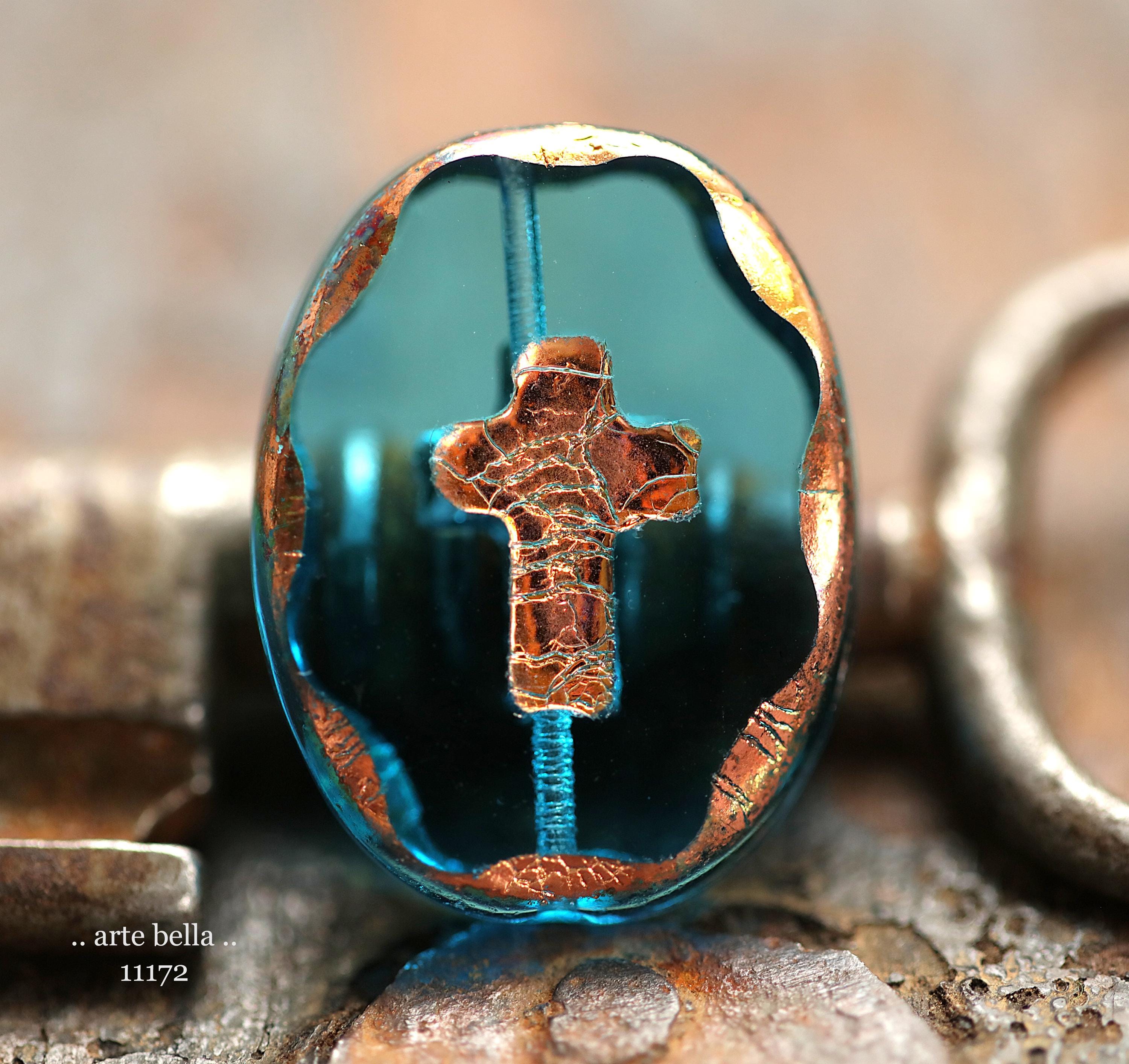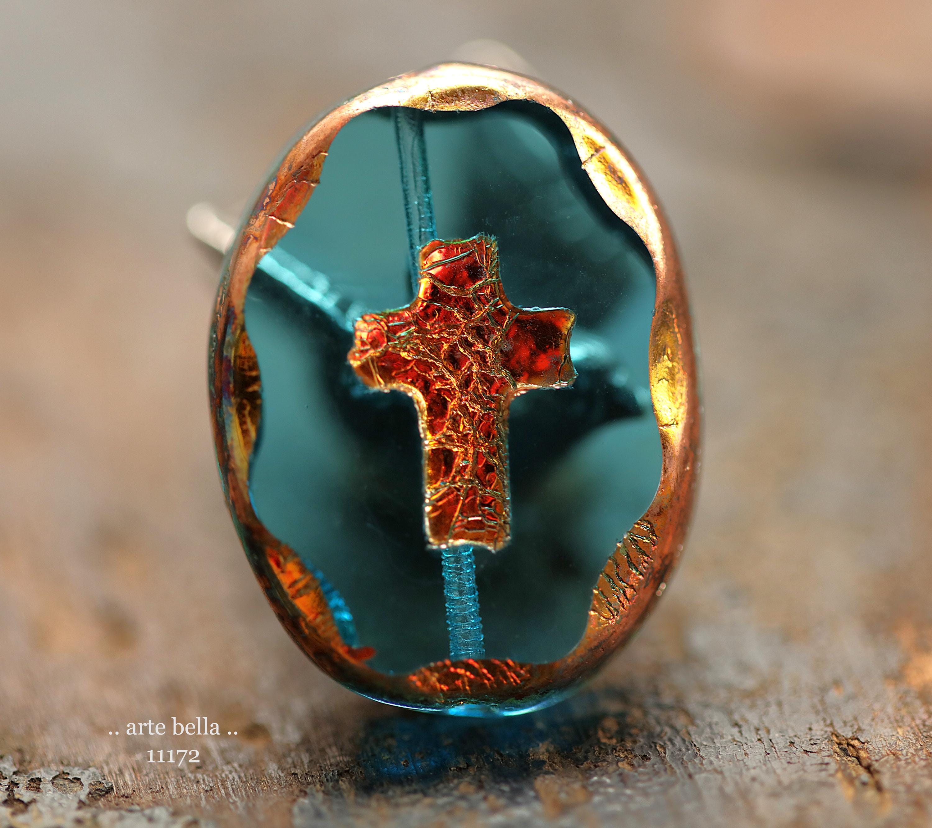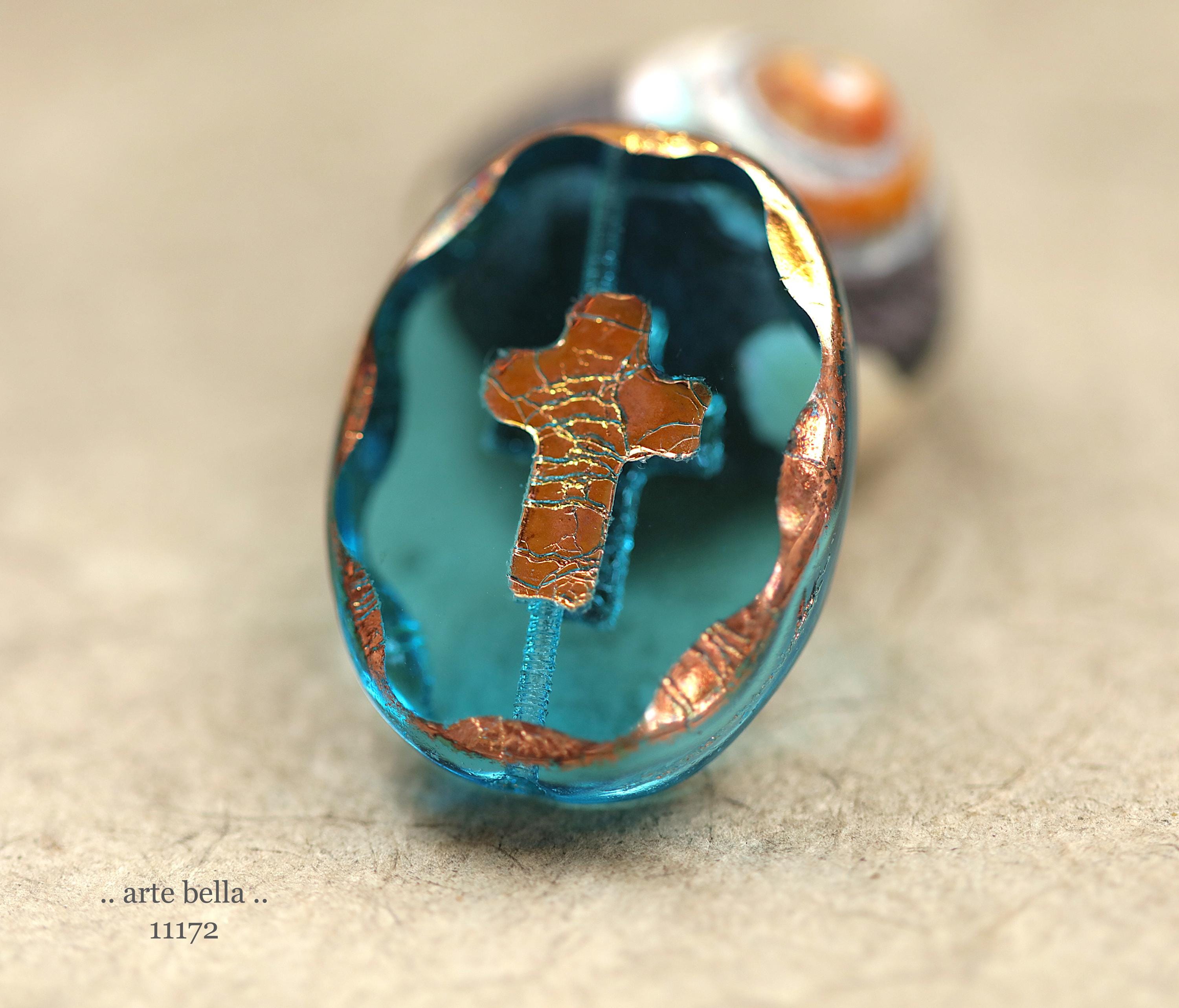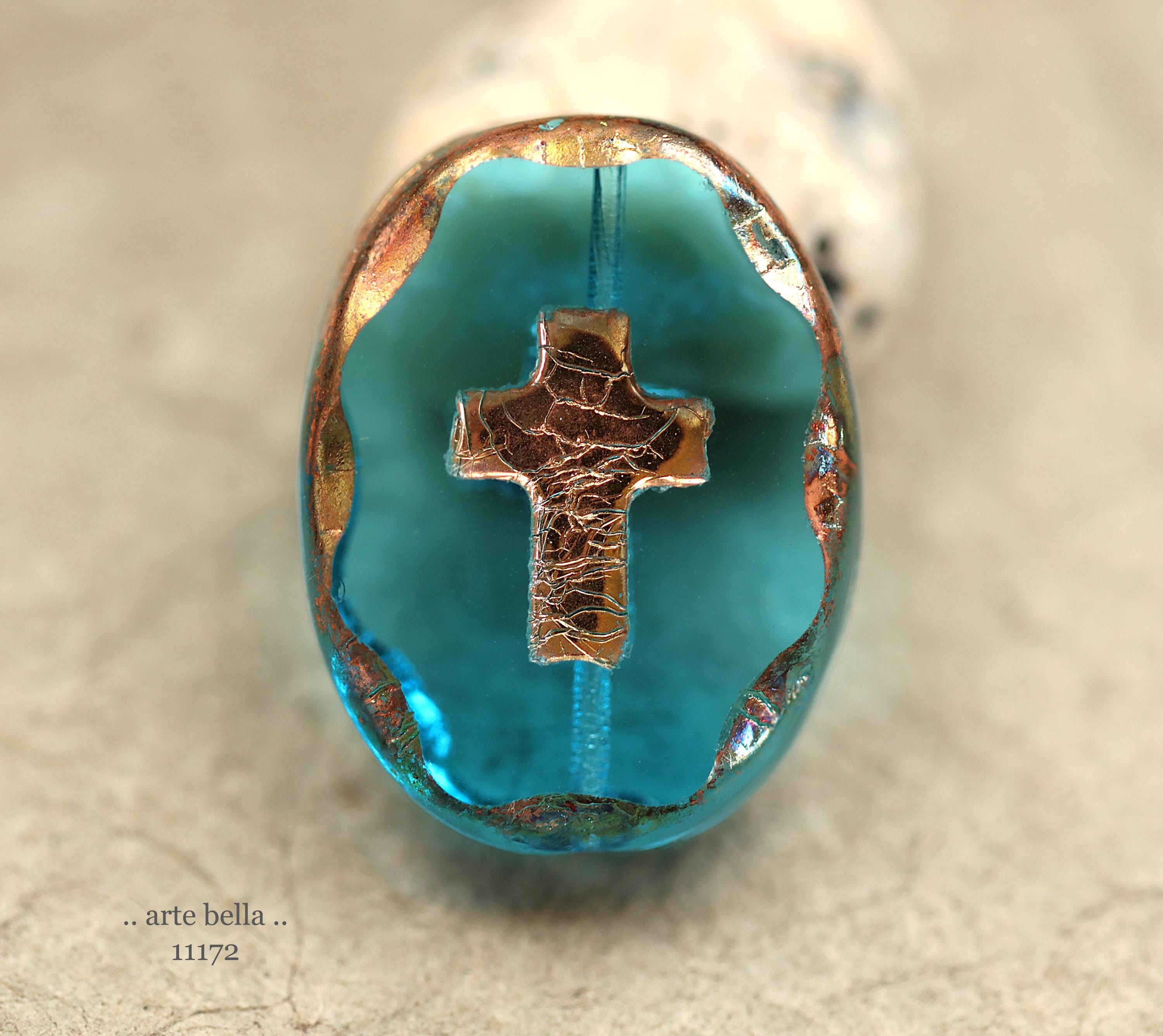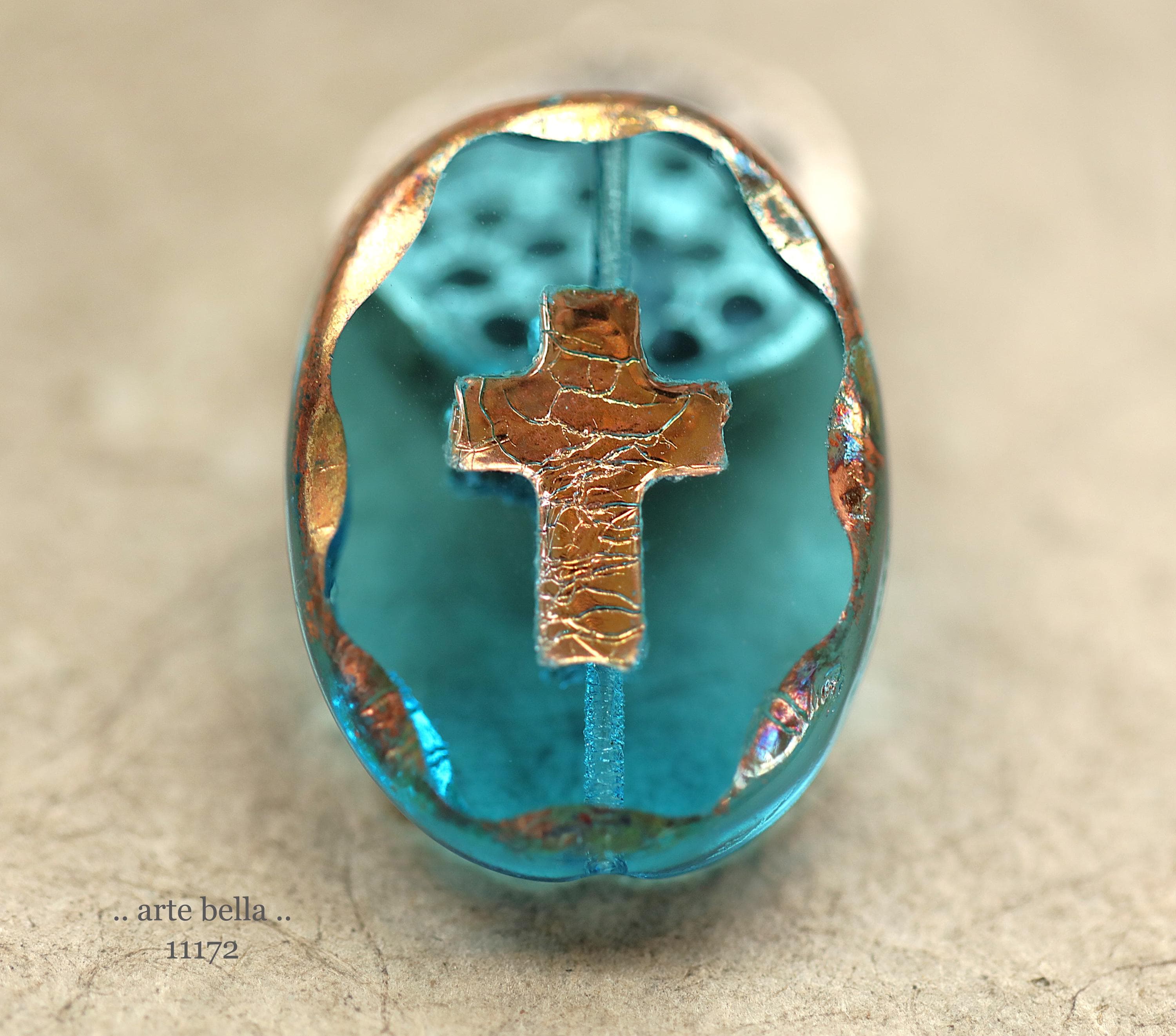 AQUA SUNSET CROSSES .. New 2 Premium Czech Glass Oval Cross Bead Mix 25x19mm (11172-2) .. jewelry making supplies