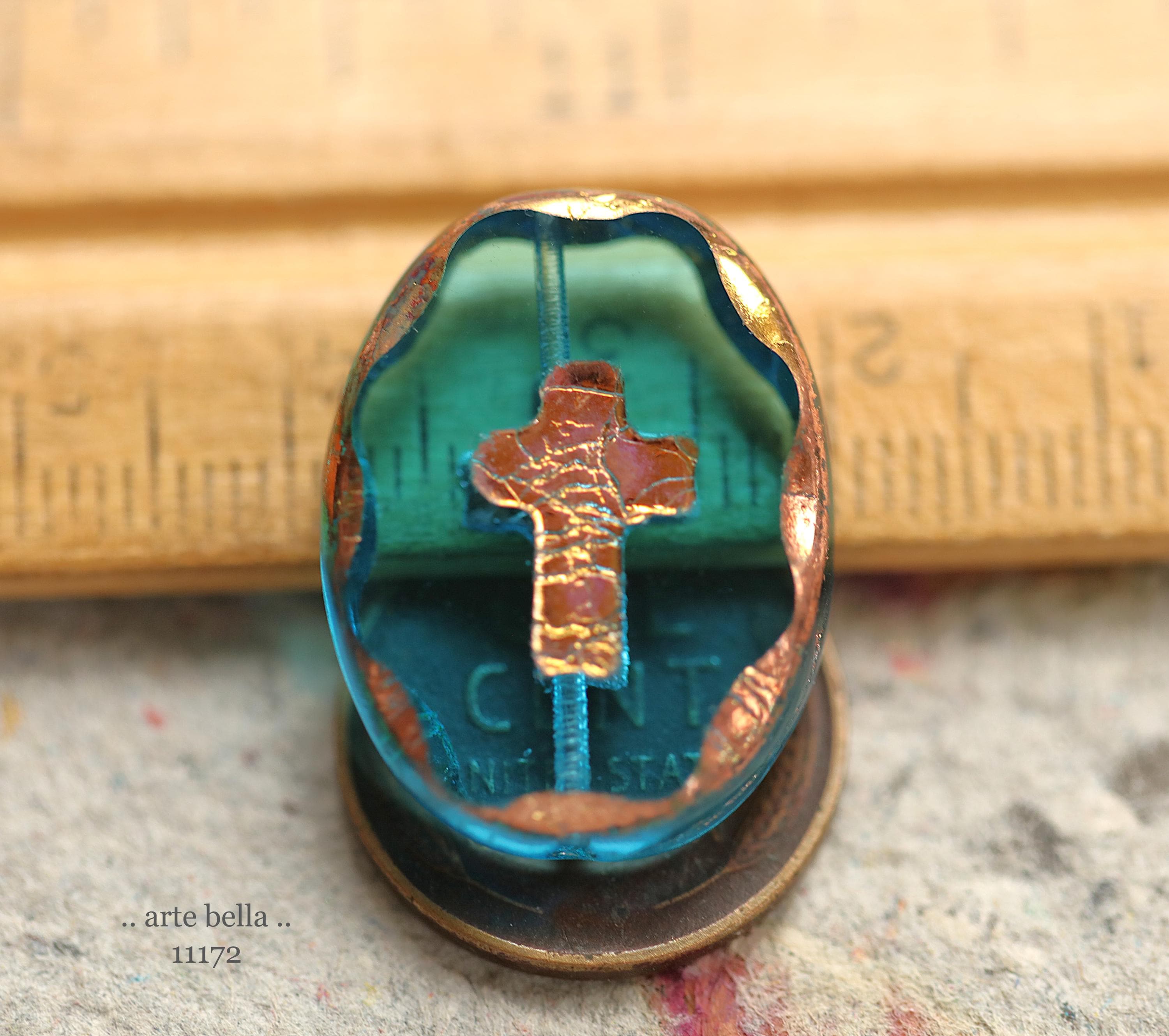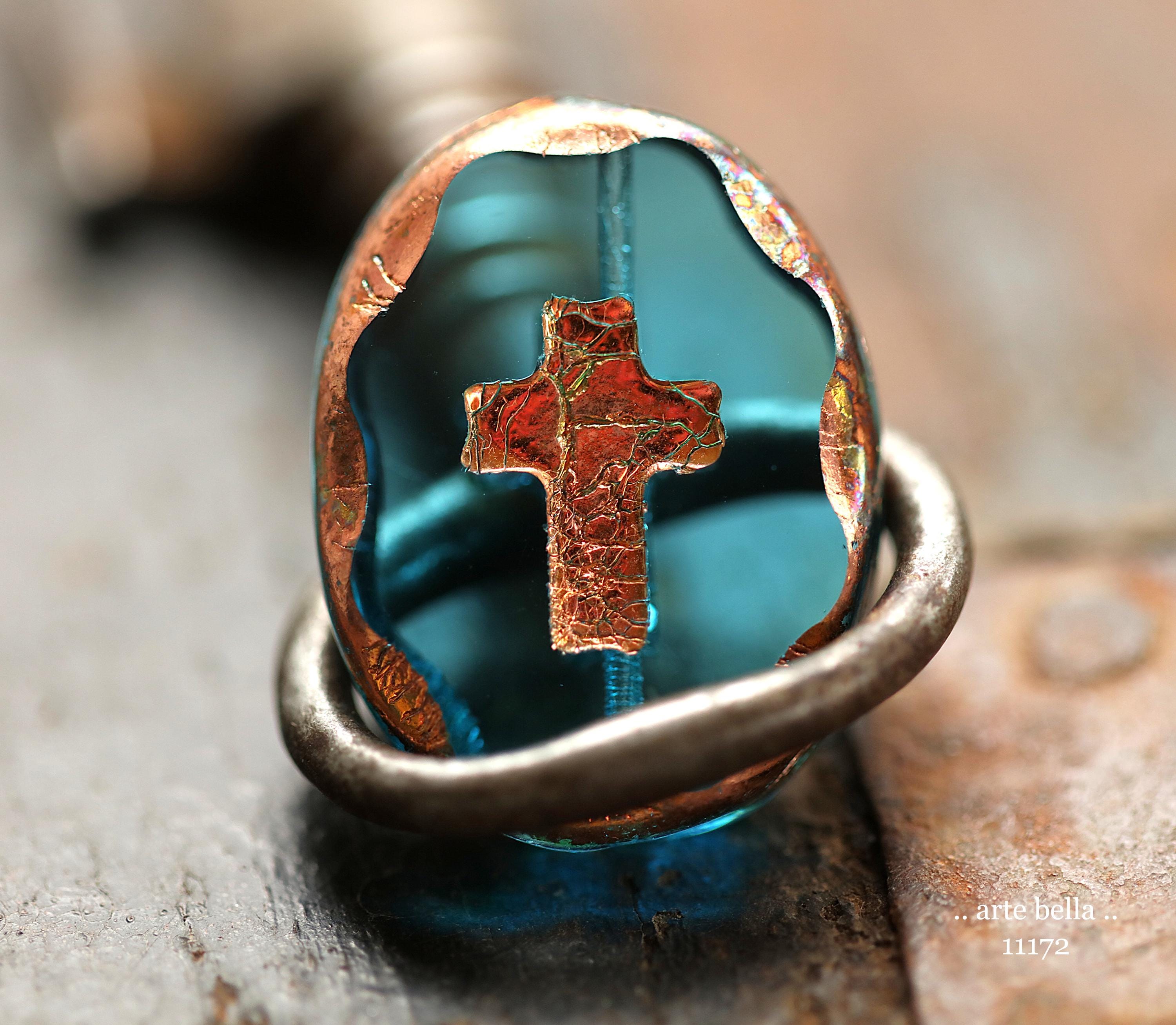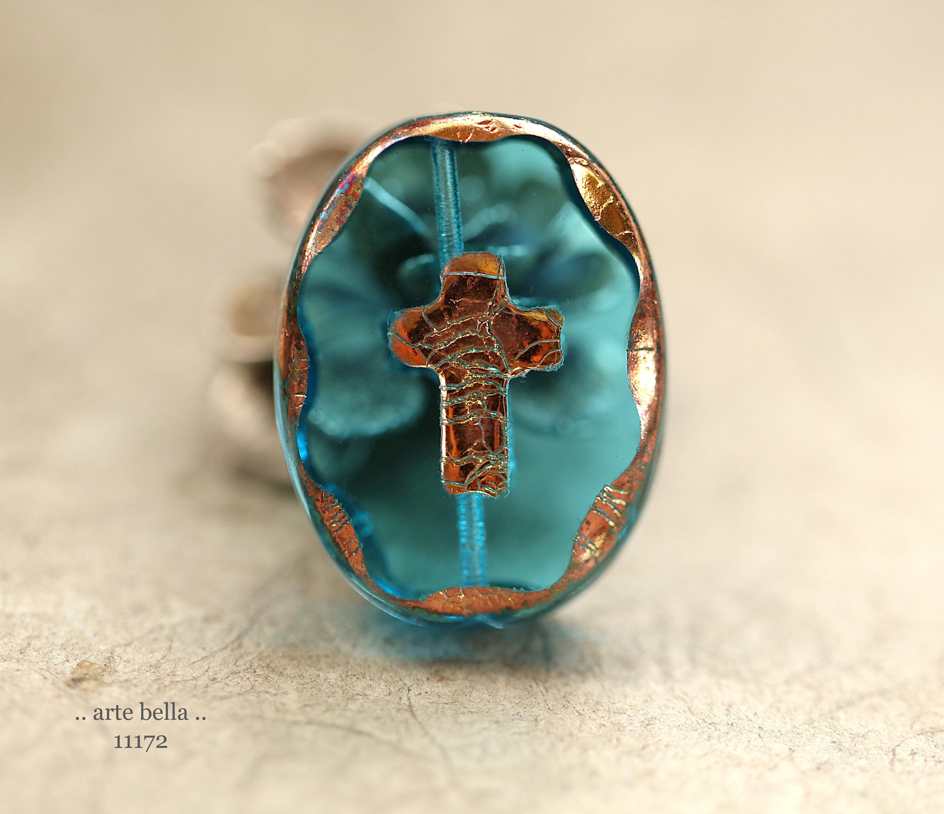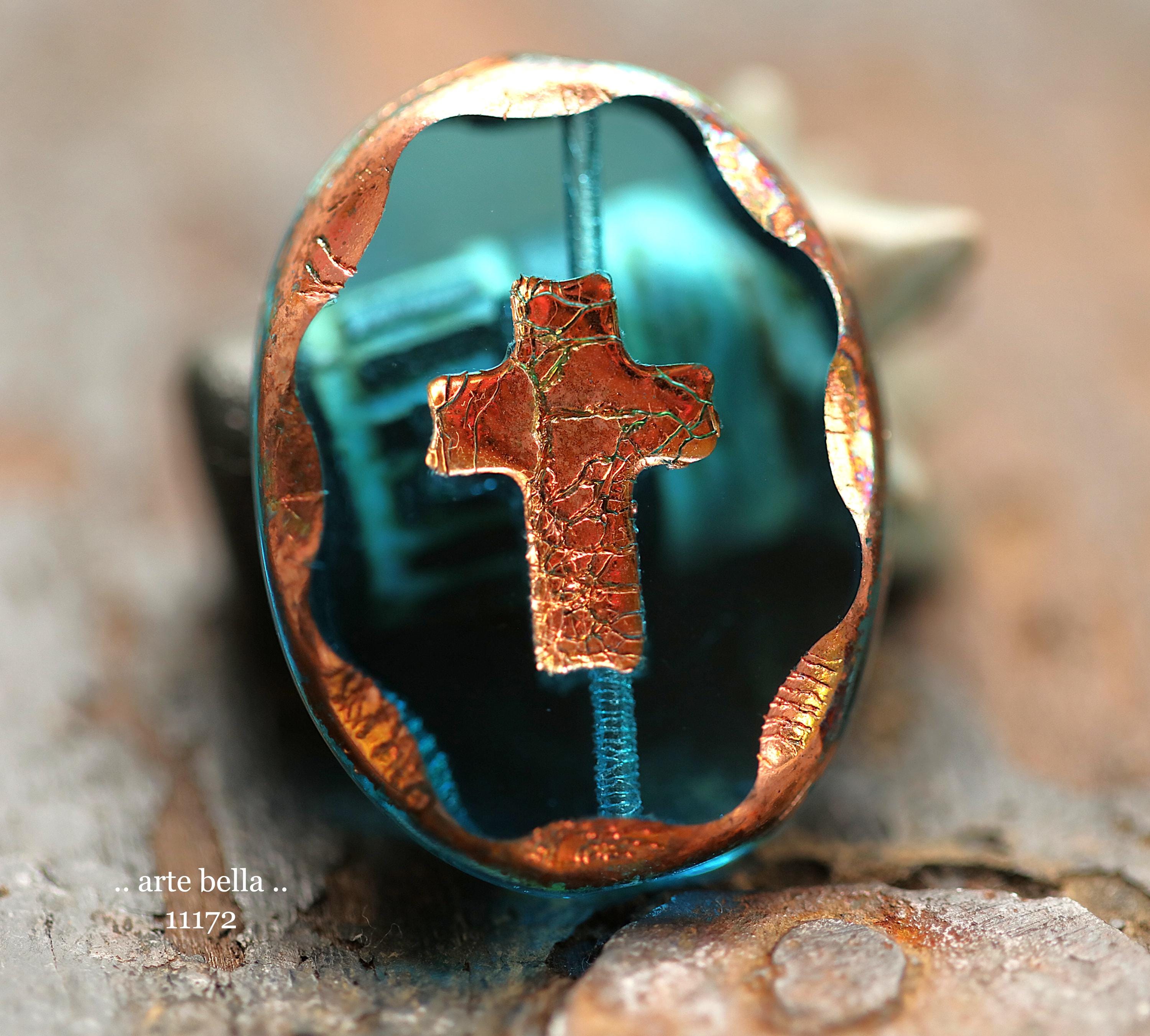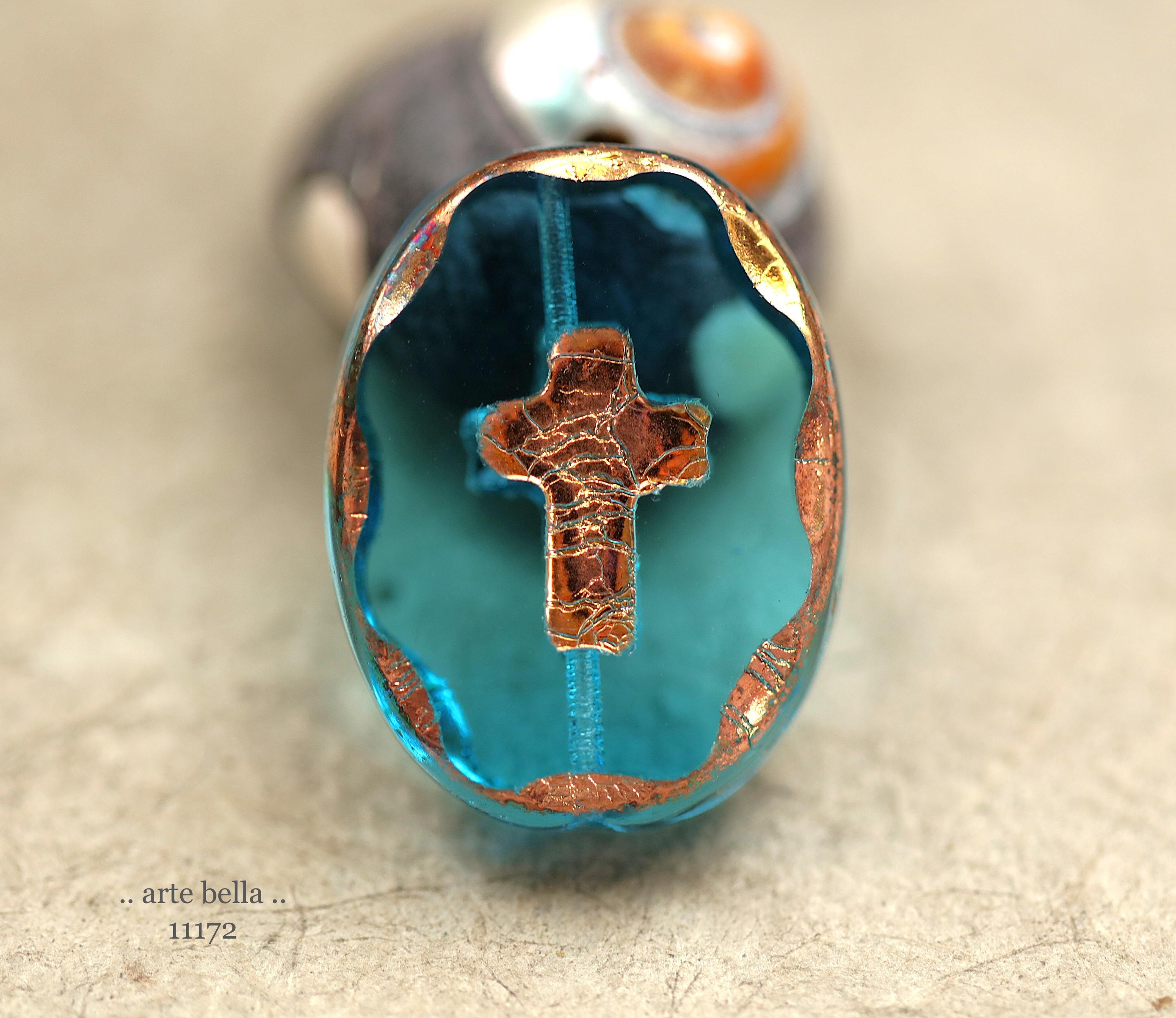 AQUA SUNSET CROSSES .. New 2 Premium Czech Glass Oval Cross Bead Mix 25x19mm (11172-2) .. jewelry making supplies