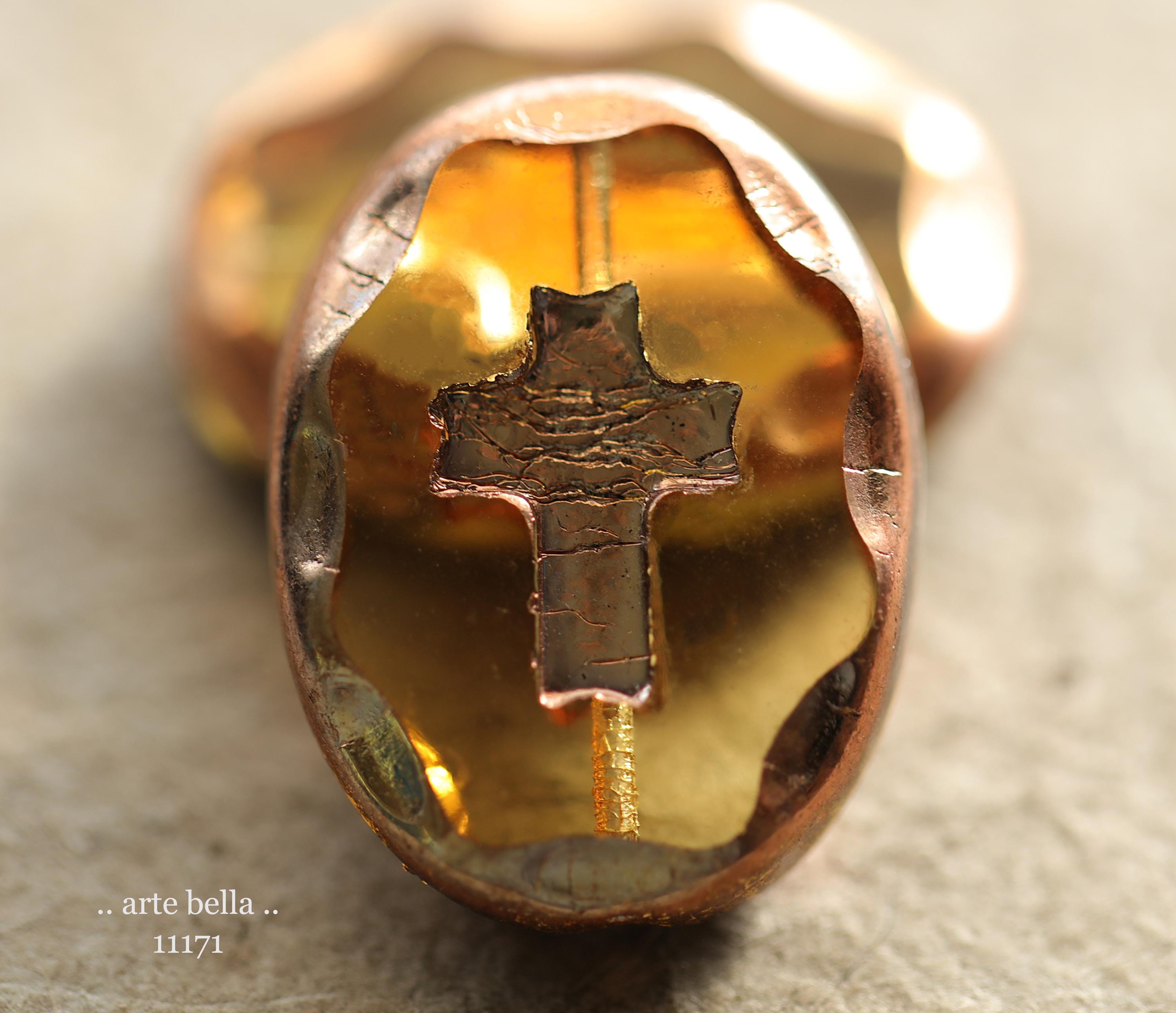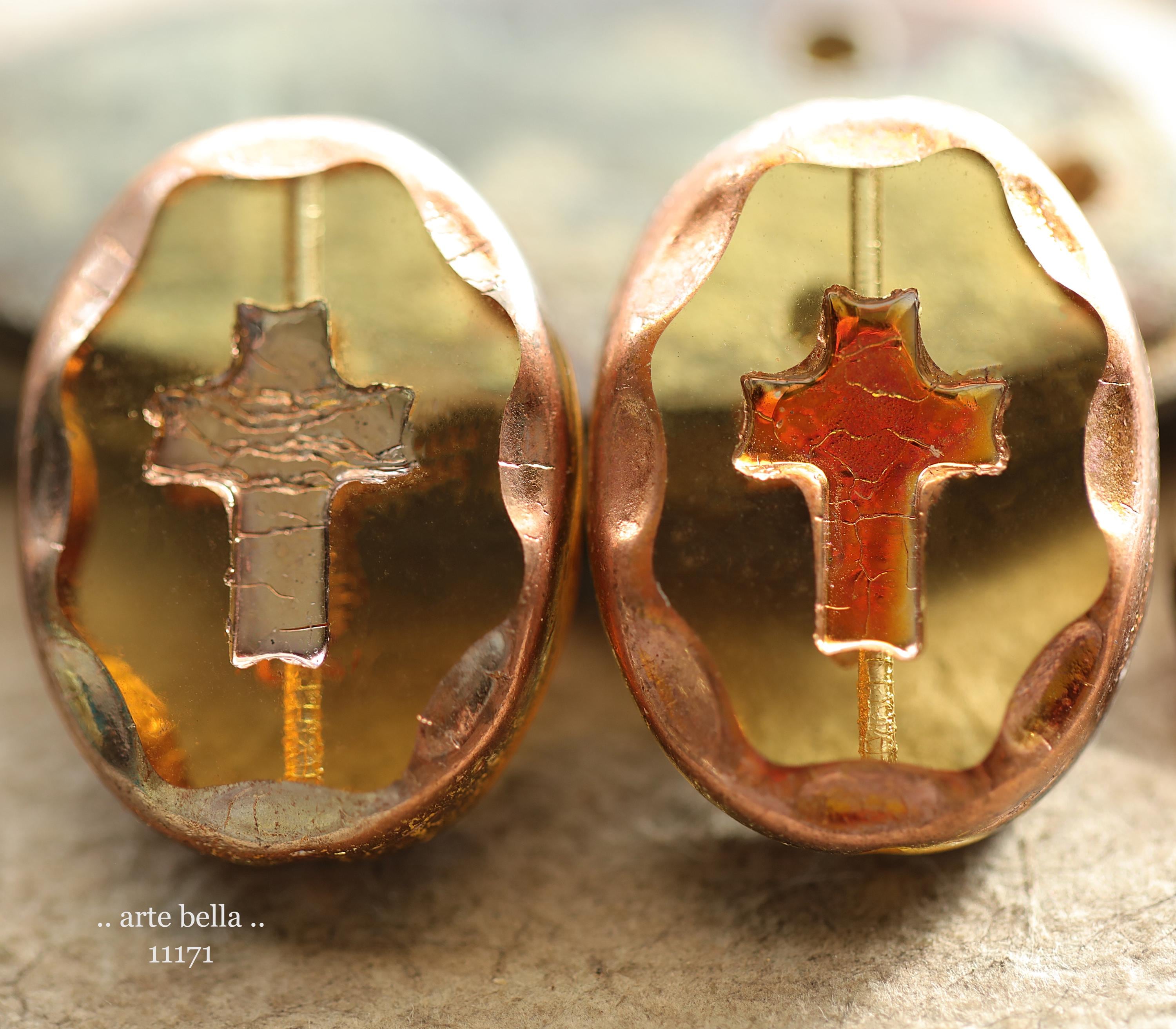 New .. YELLOW SUNSET CROSSES .. 2 Premium Czech Glass Oval Cross Bead Mix 25x19mm (11171-2) .. jewelry making supplies