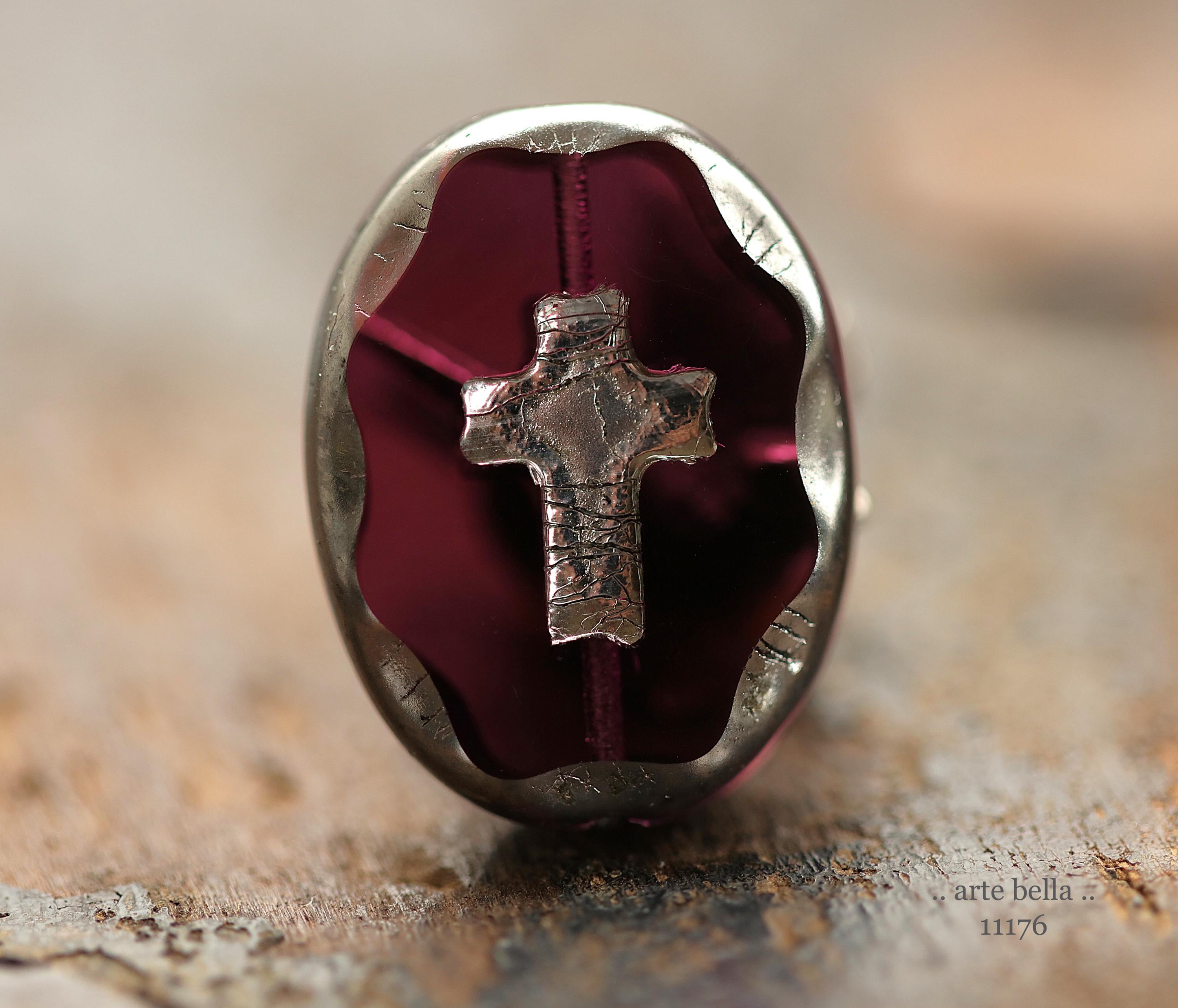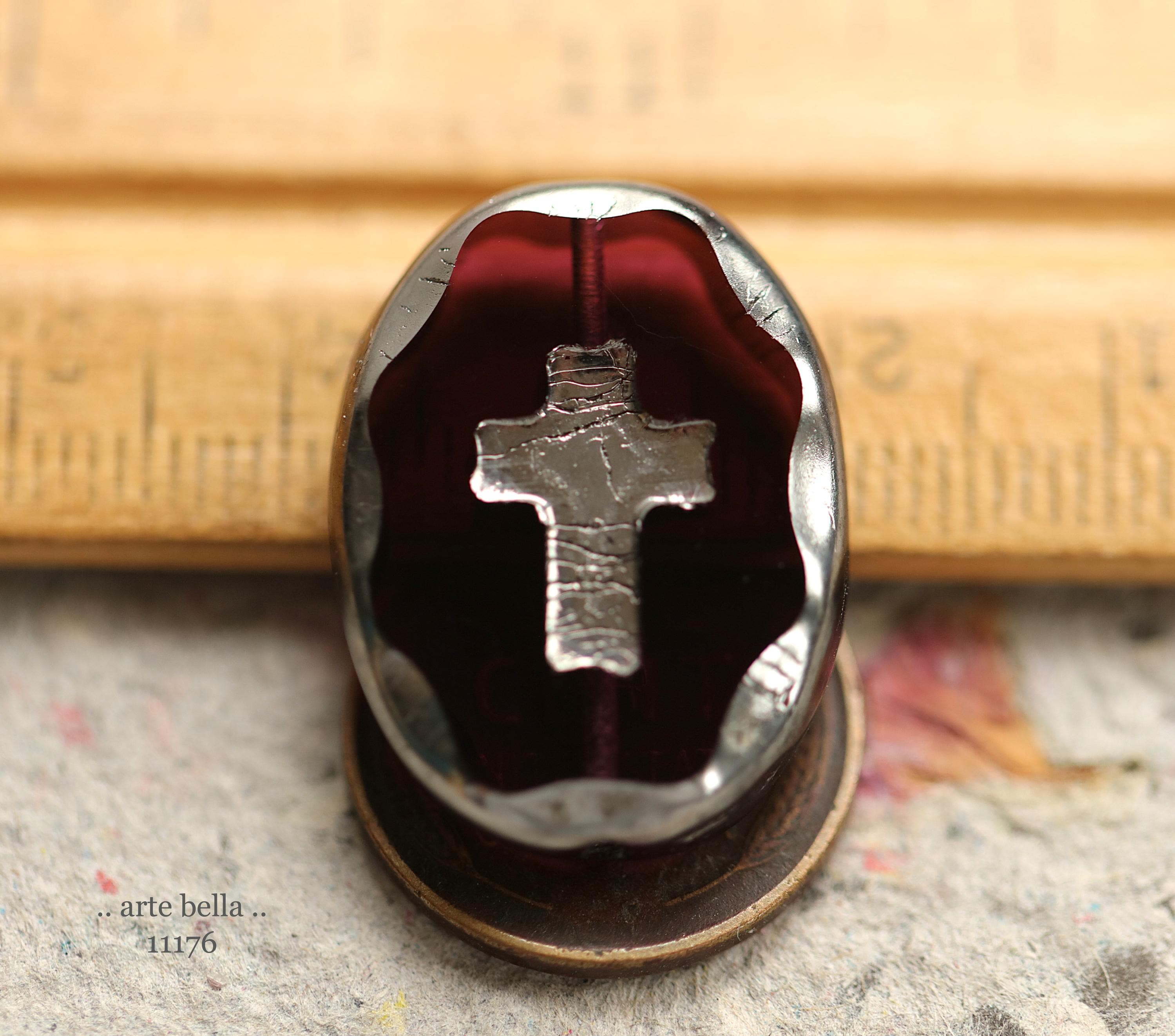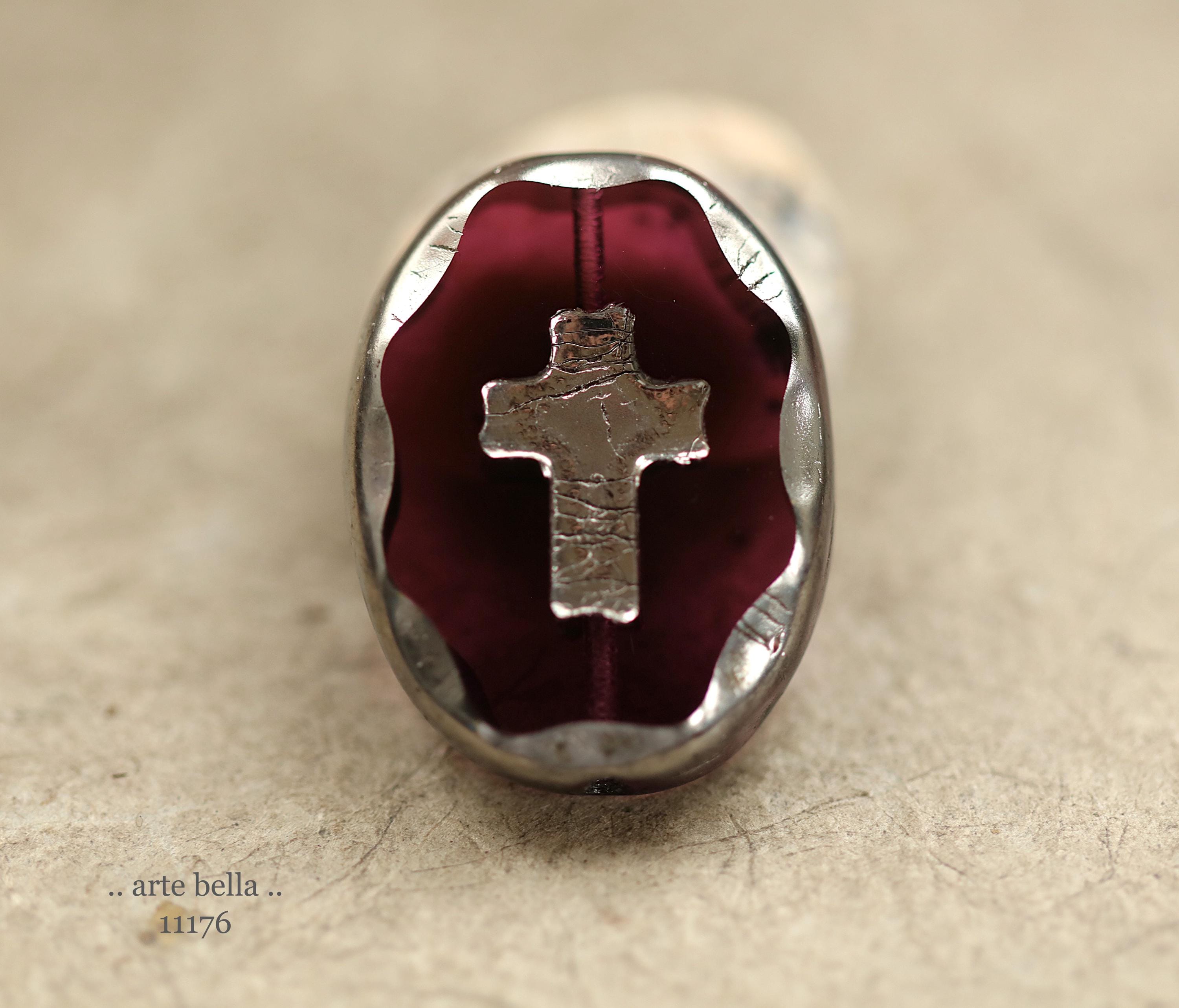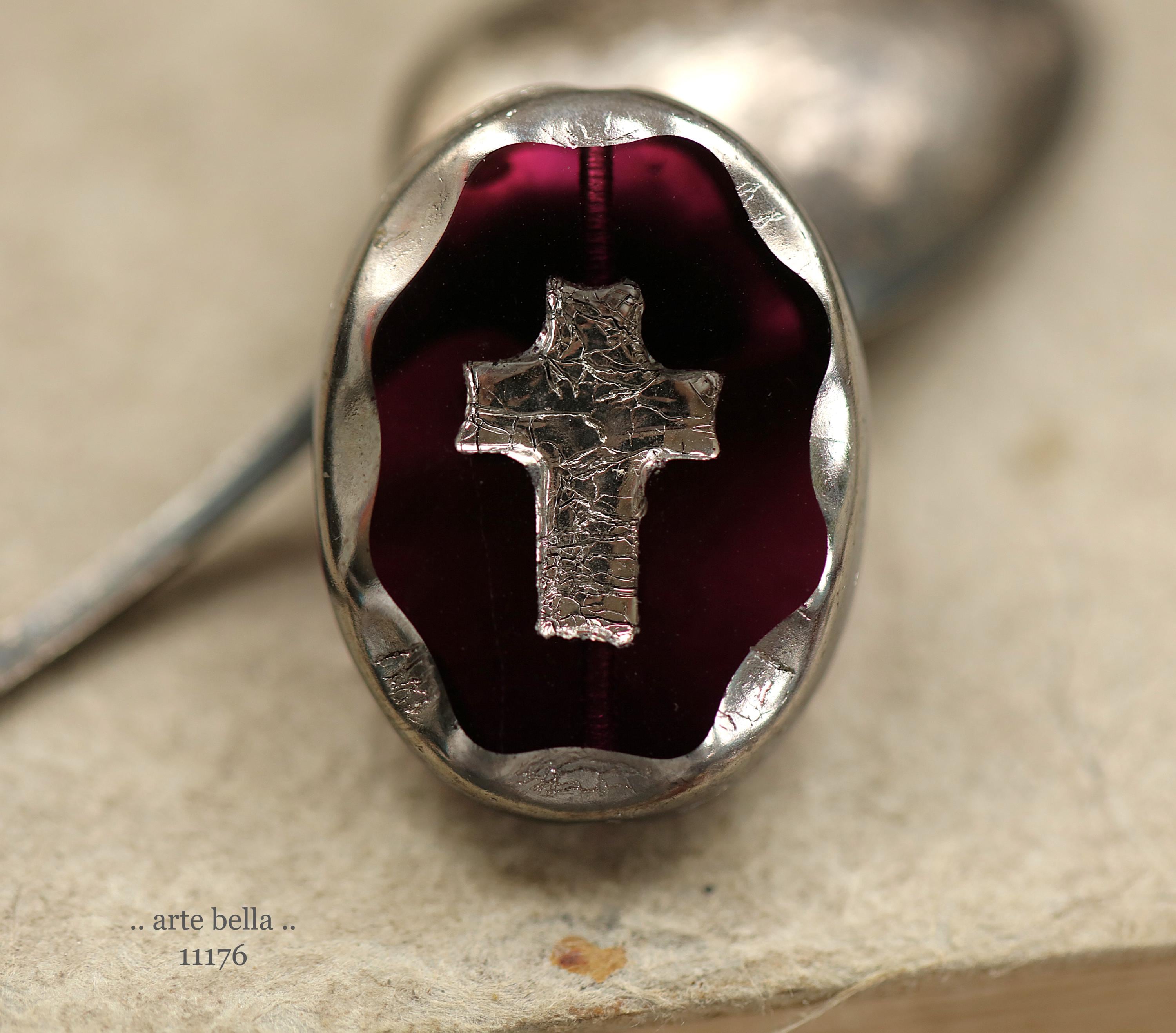 SILVERED PLUM CROSSES .. New 2 Premium Czech Glass Oval Cross Bead Mix 25x19mm (11176-2) .. jewelry making supplies