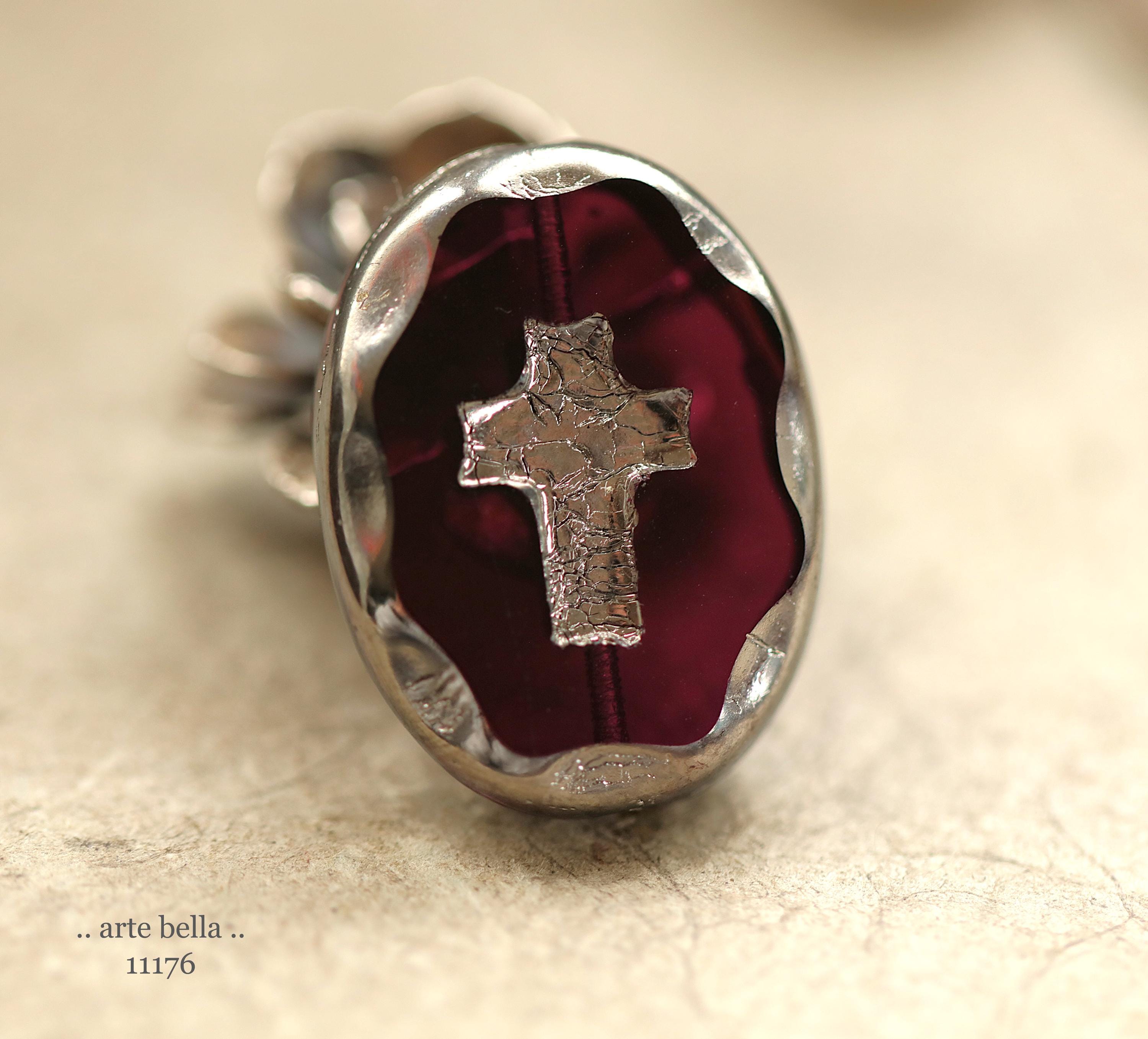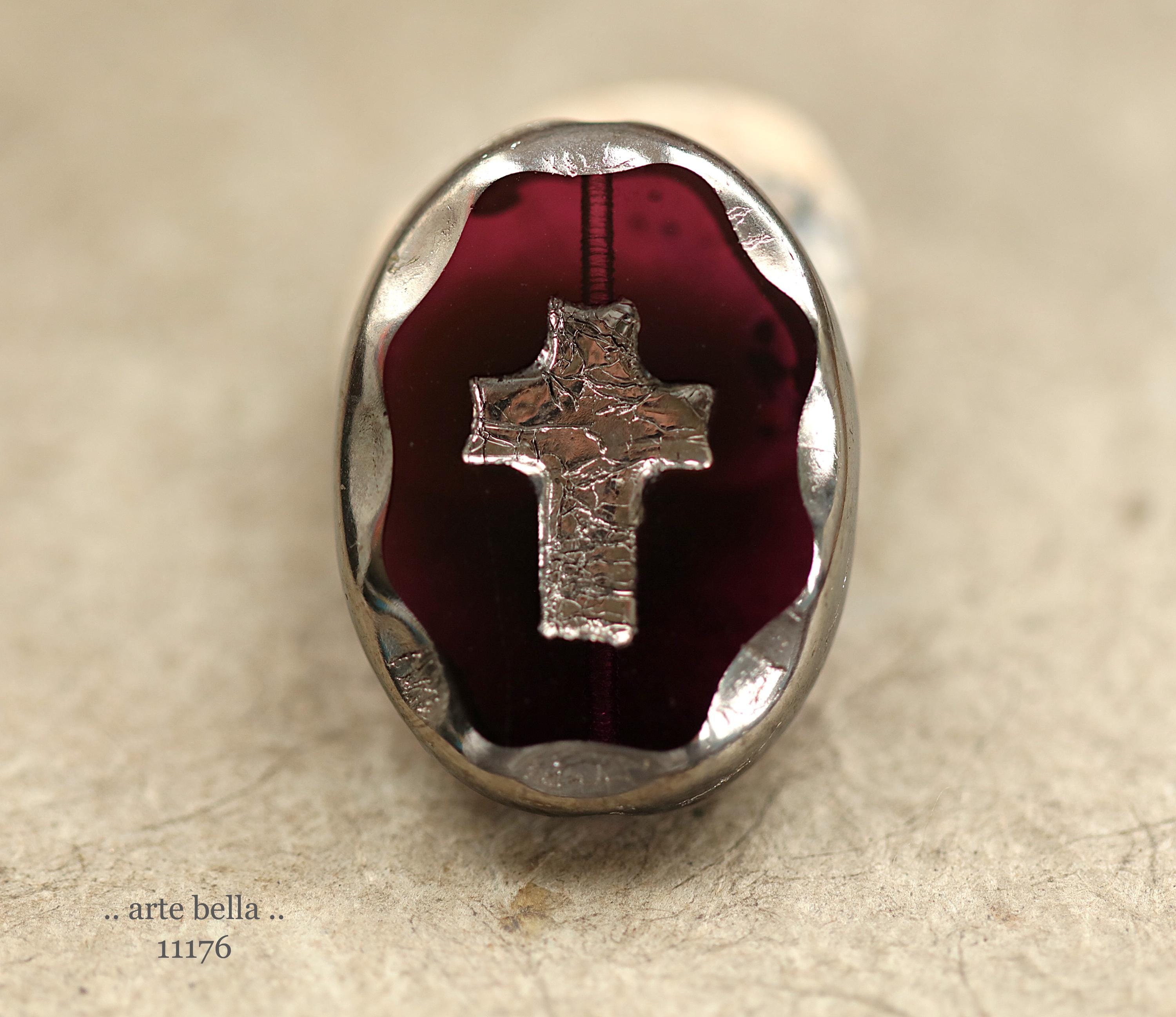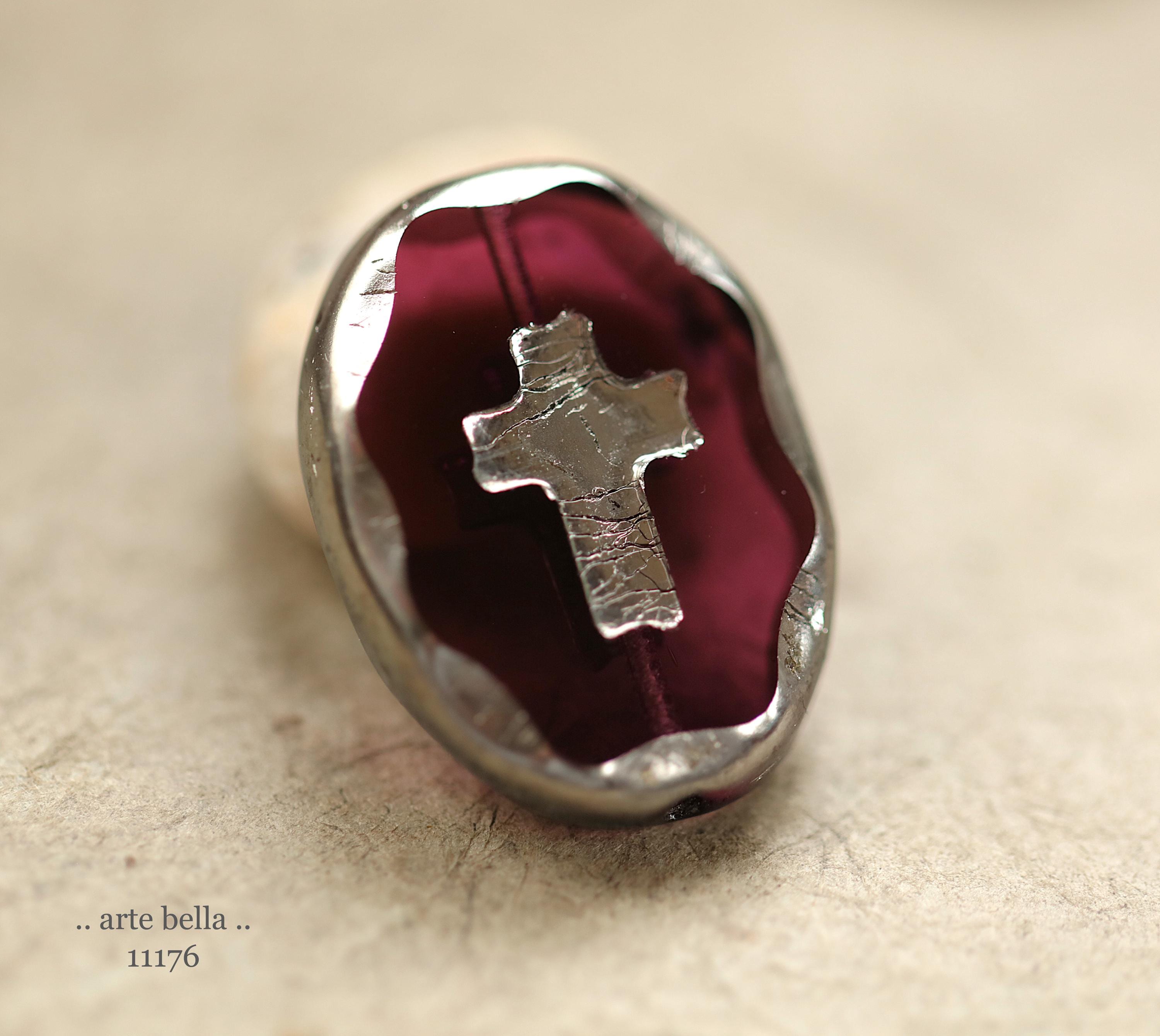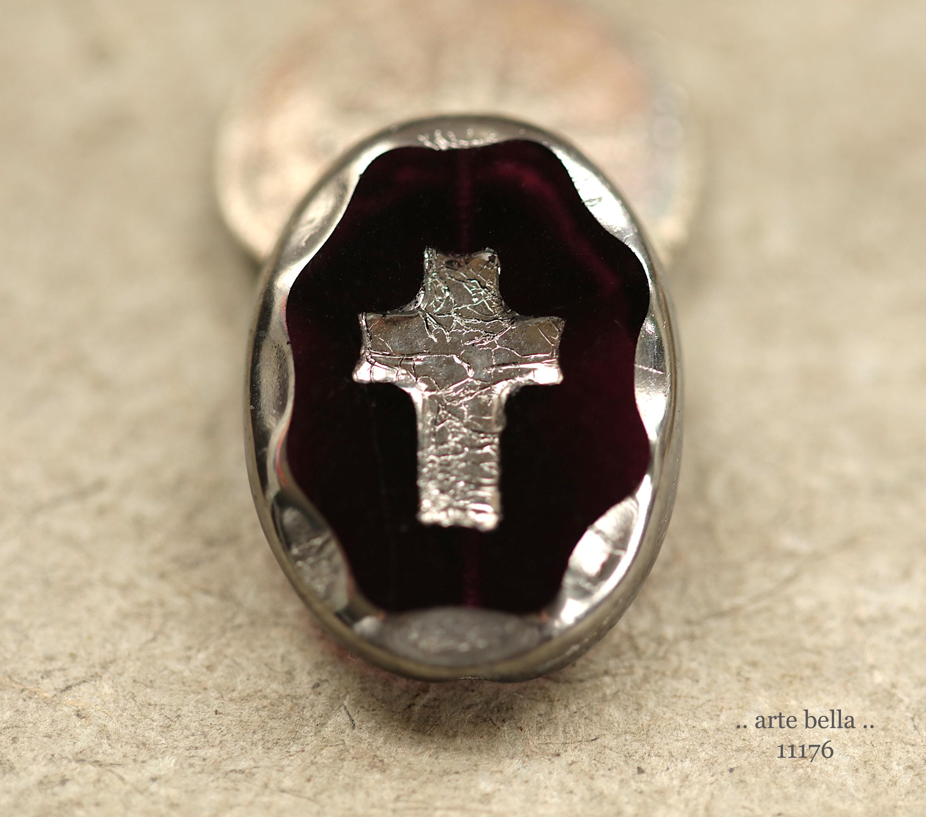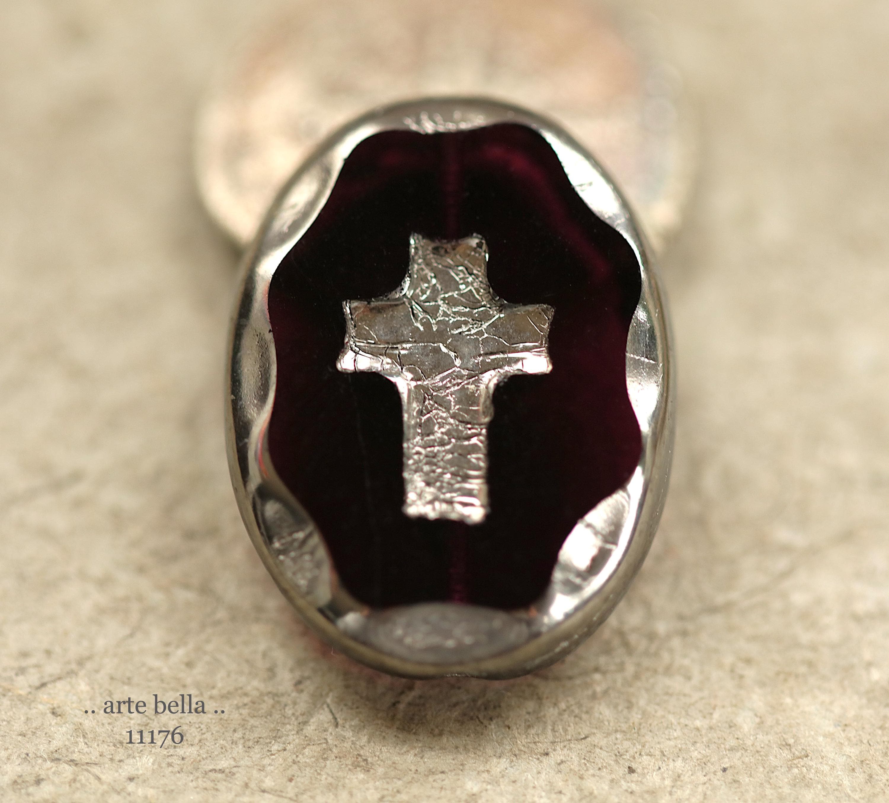 SILVERED PLUM CROSSES .. New 2 Premium Czech Glass Oval Cross Bead Mix 25x19mm (11176-2) .. jewelry making supplies