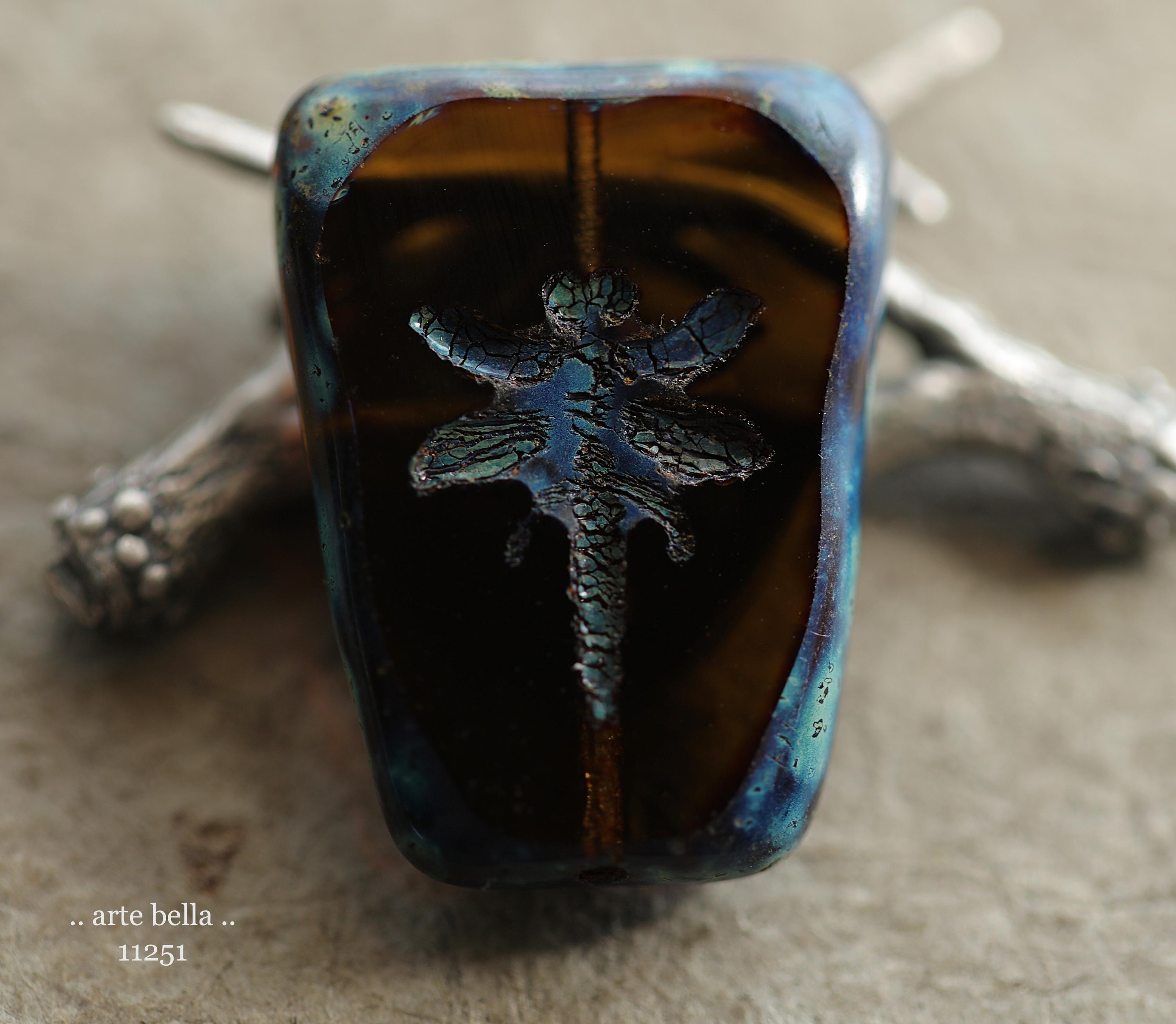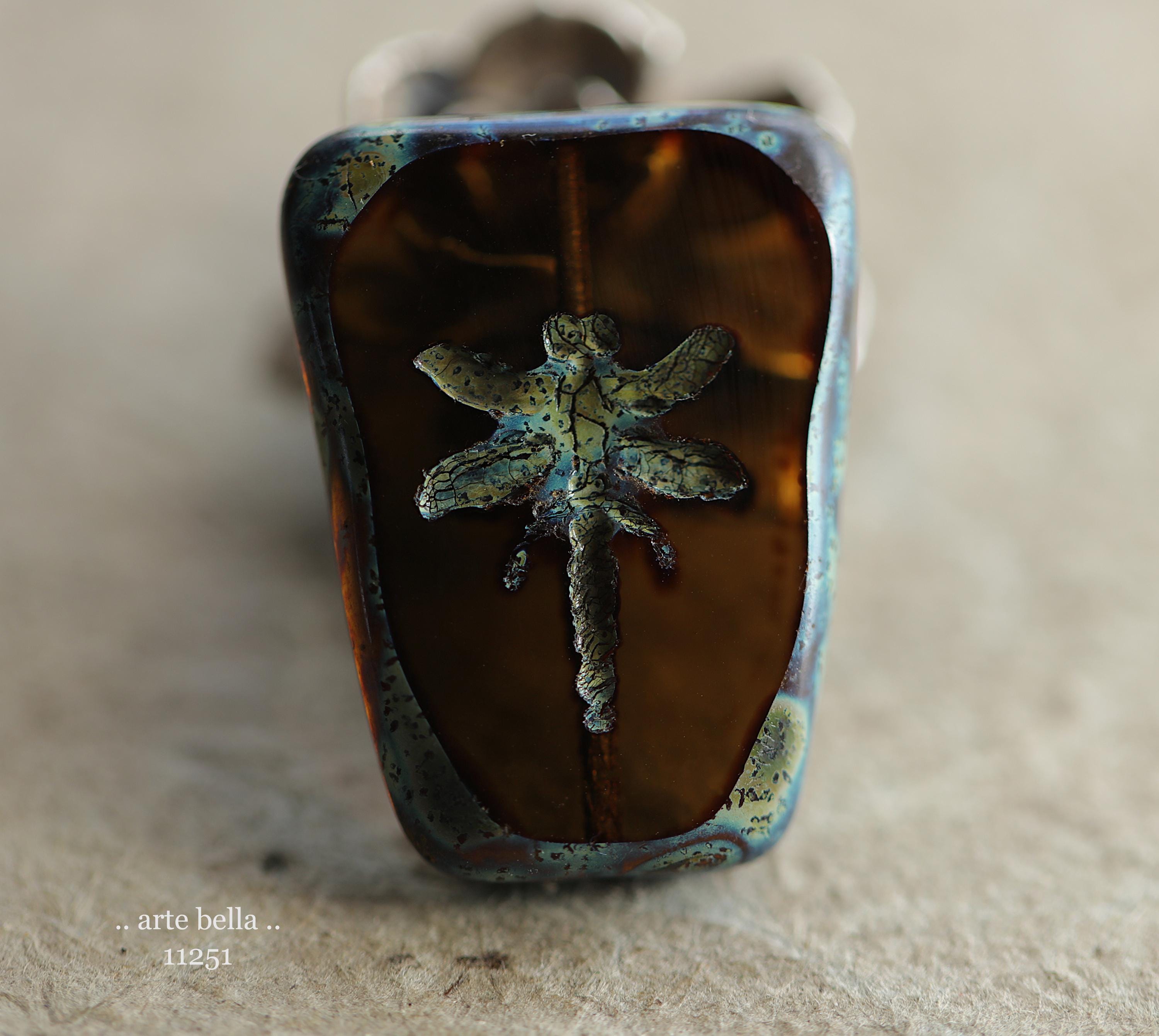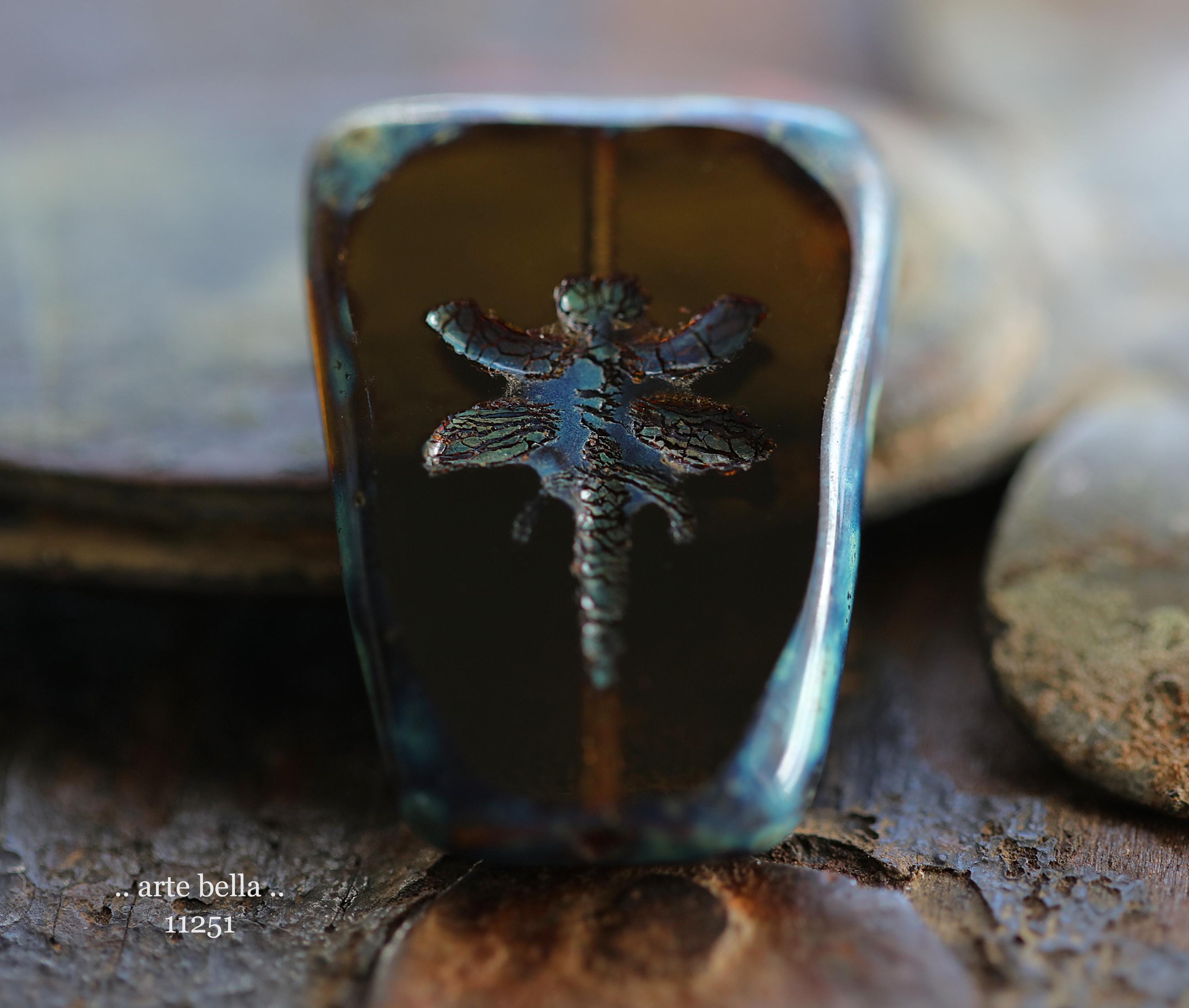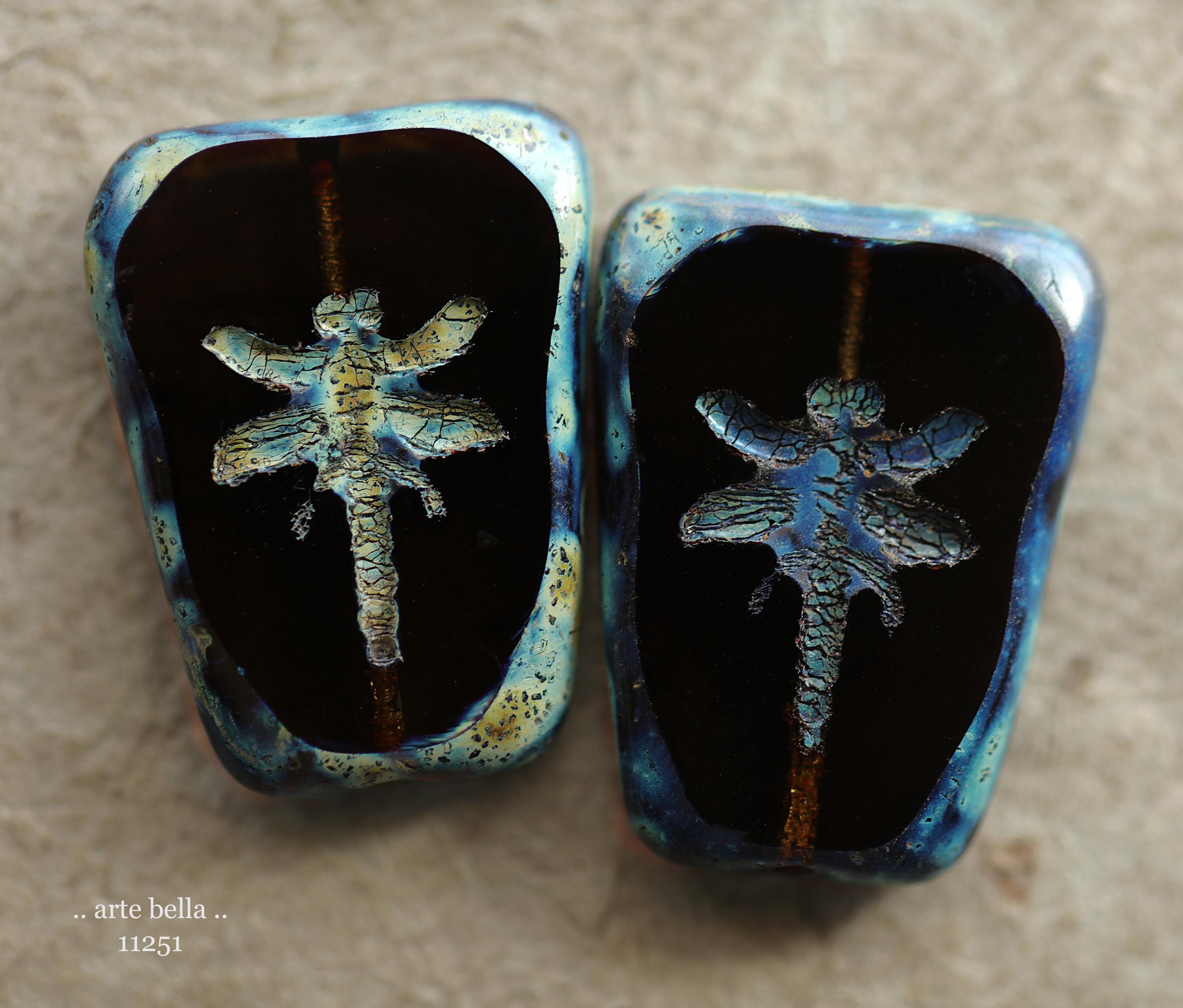 New .. EARTHY SMOKEY TOPAZ Dragonflies .. 2 Premium Picasso Czech Glass Dragonfly Bead/Pendants 28x20mm (11251-2) .. jewelry supplies