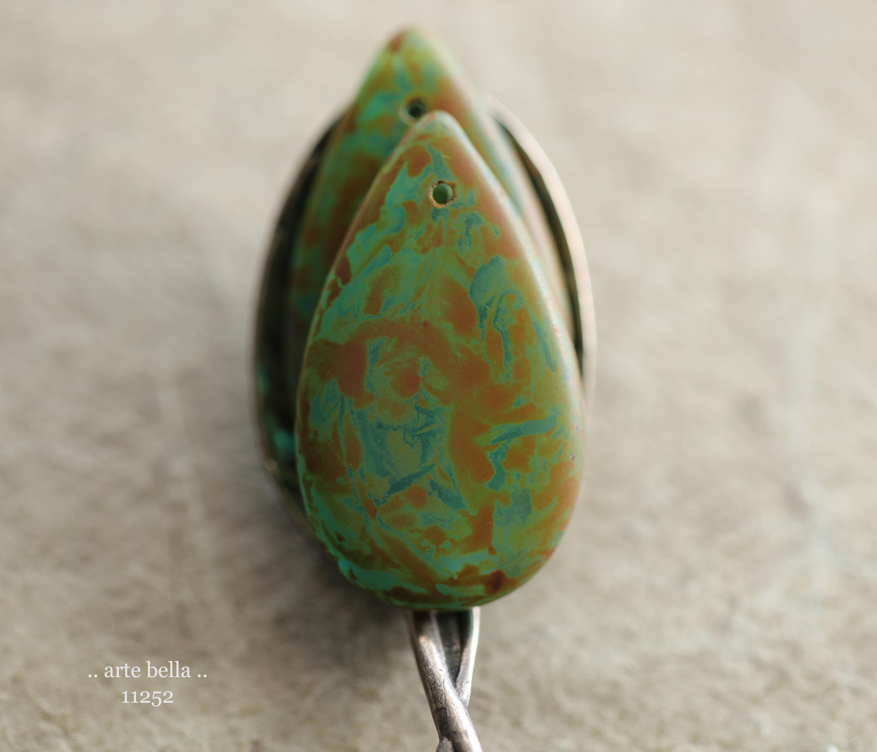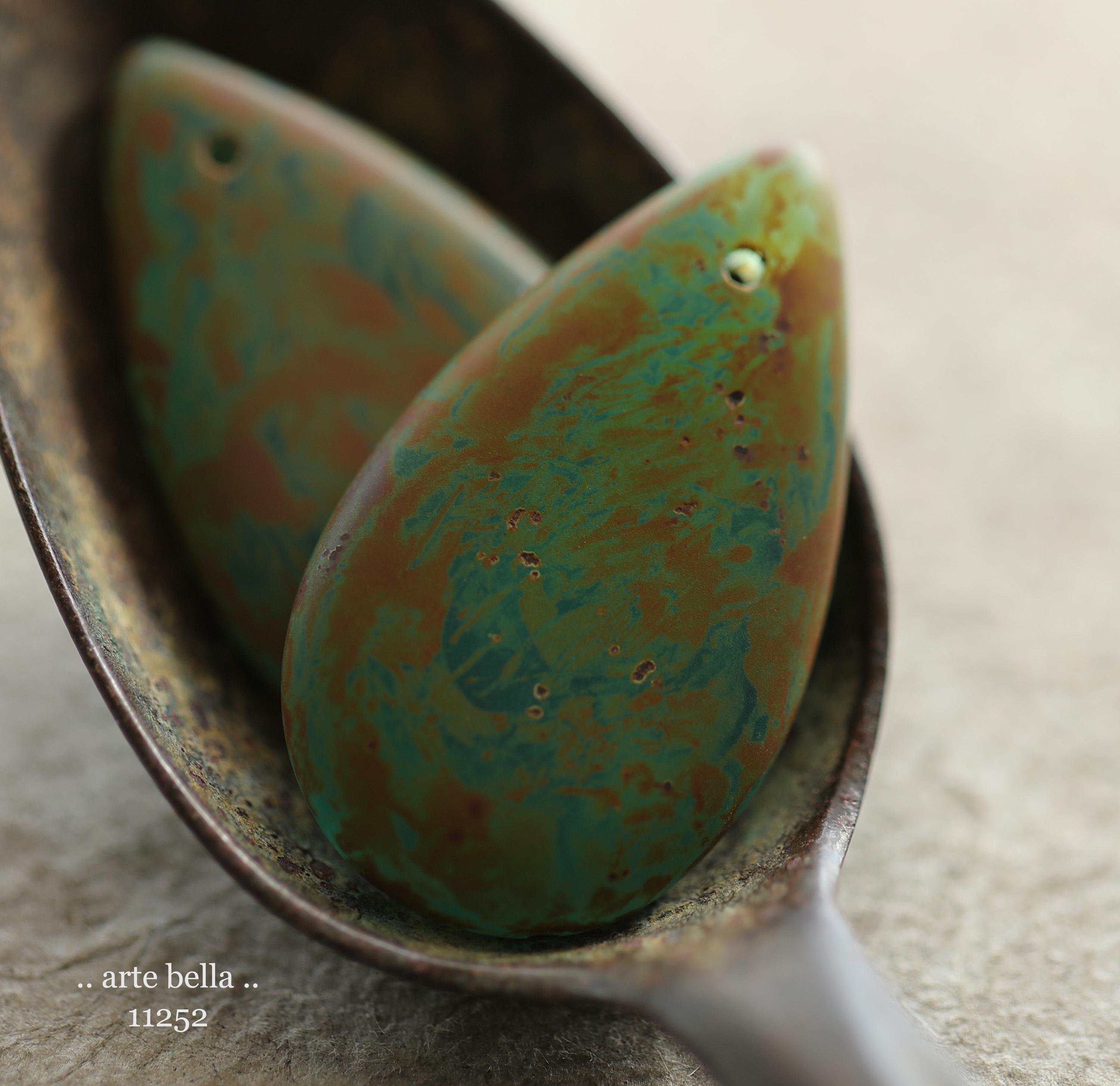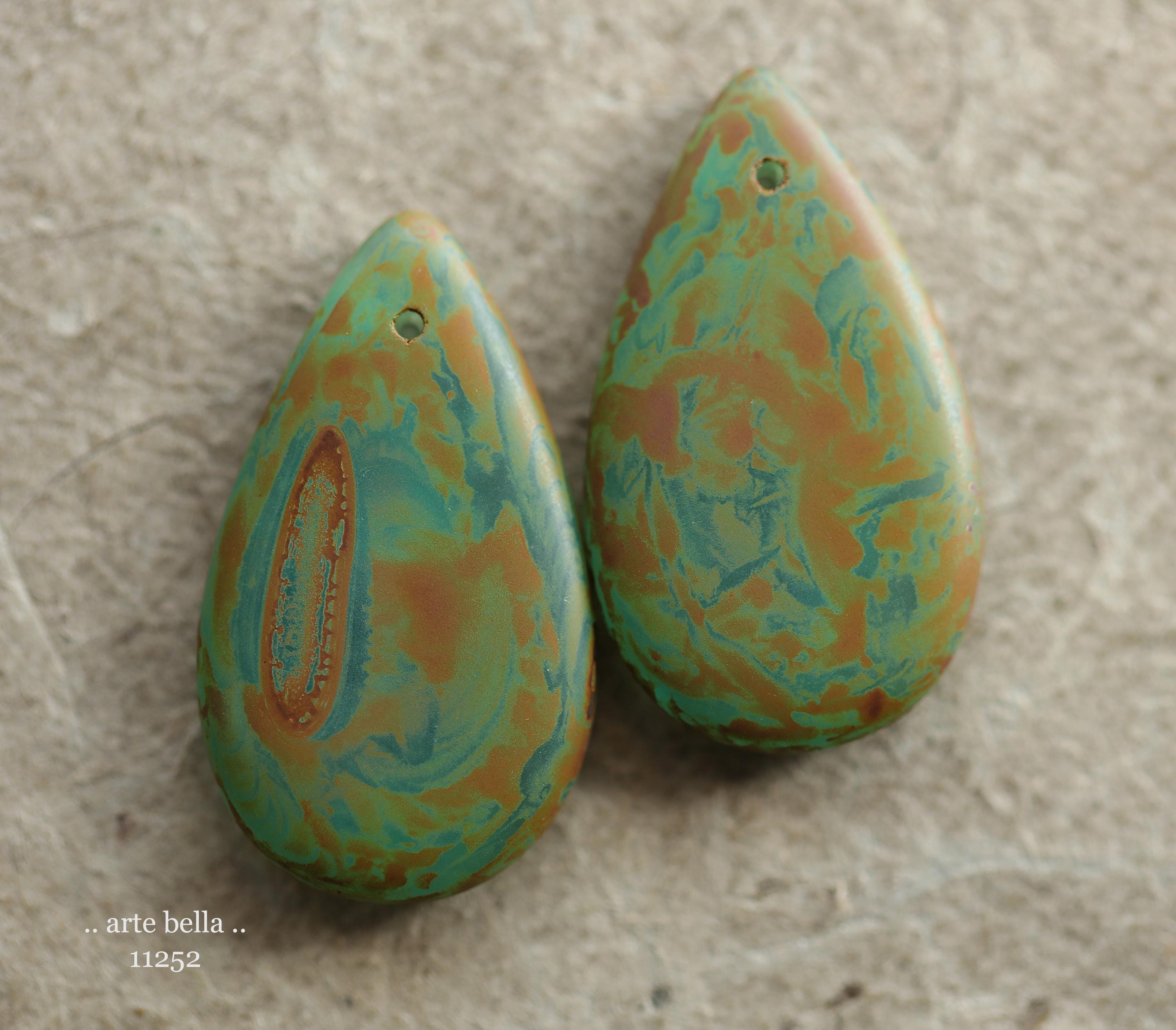 New .. MOSSY AQUA DROPS .. 2 Premium Matte Picasso Czech Glass Drop Pendant Beads 31x18mm (11252-2) .. jewelry supplies