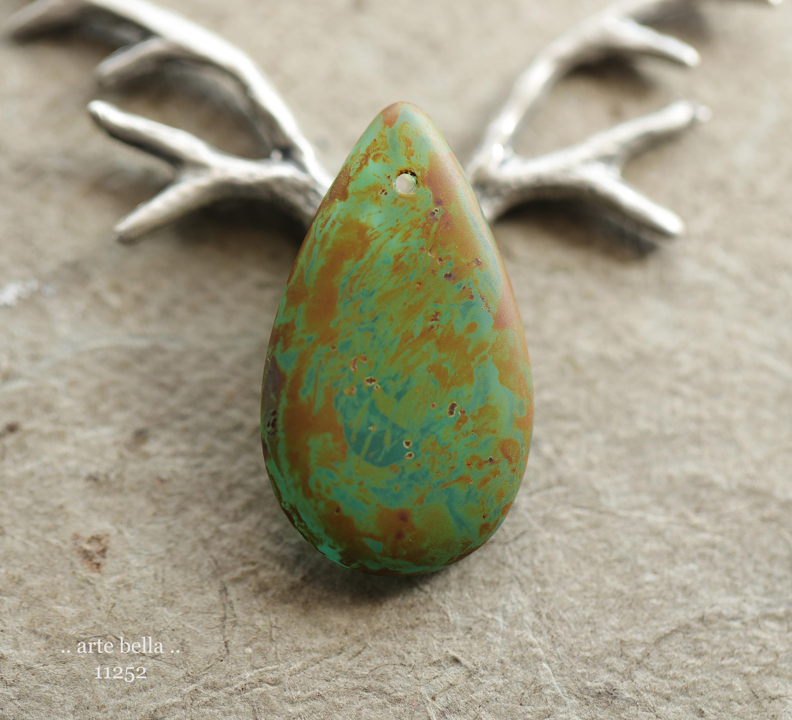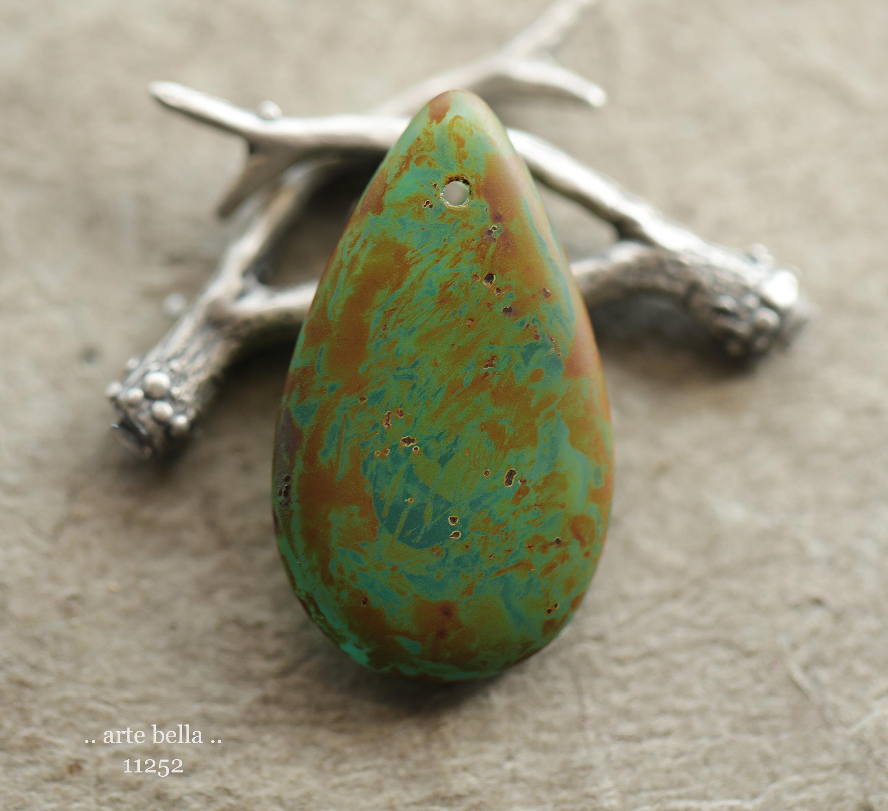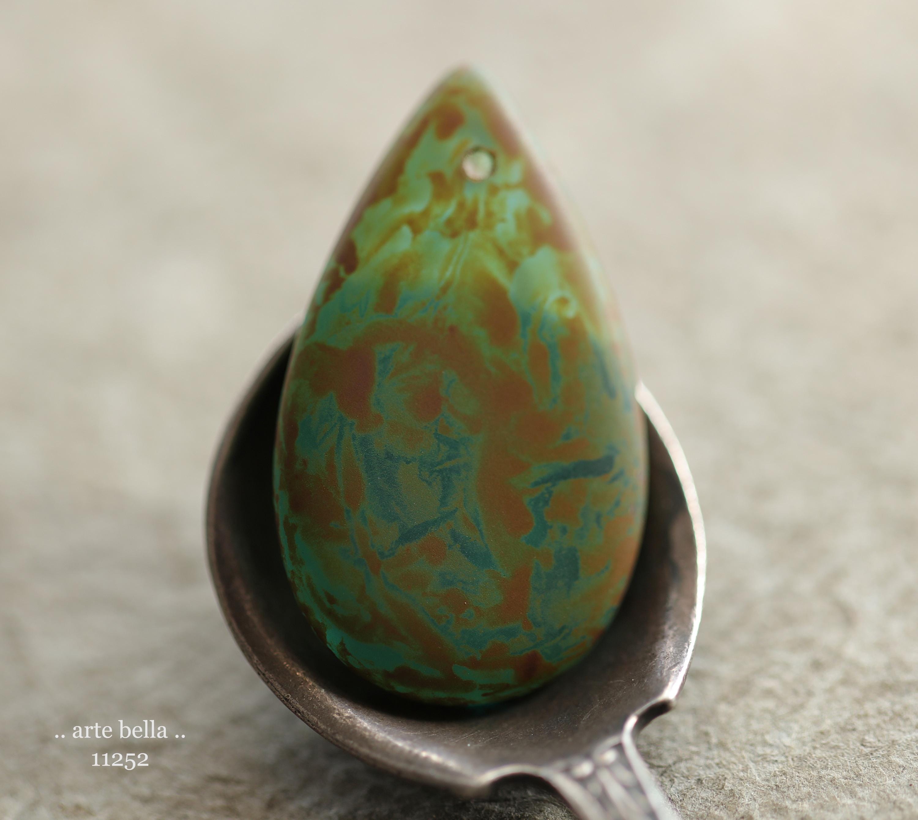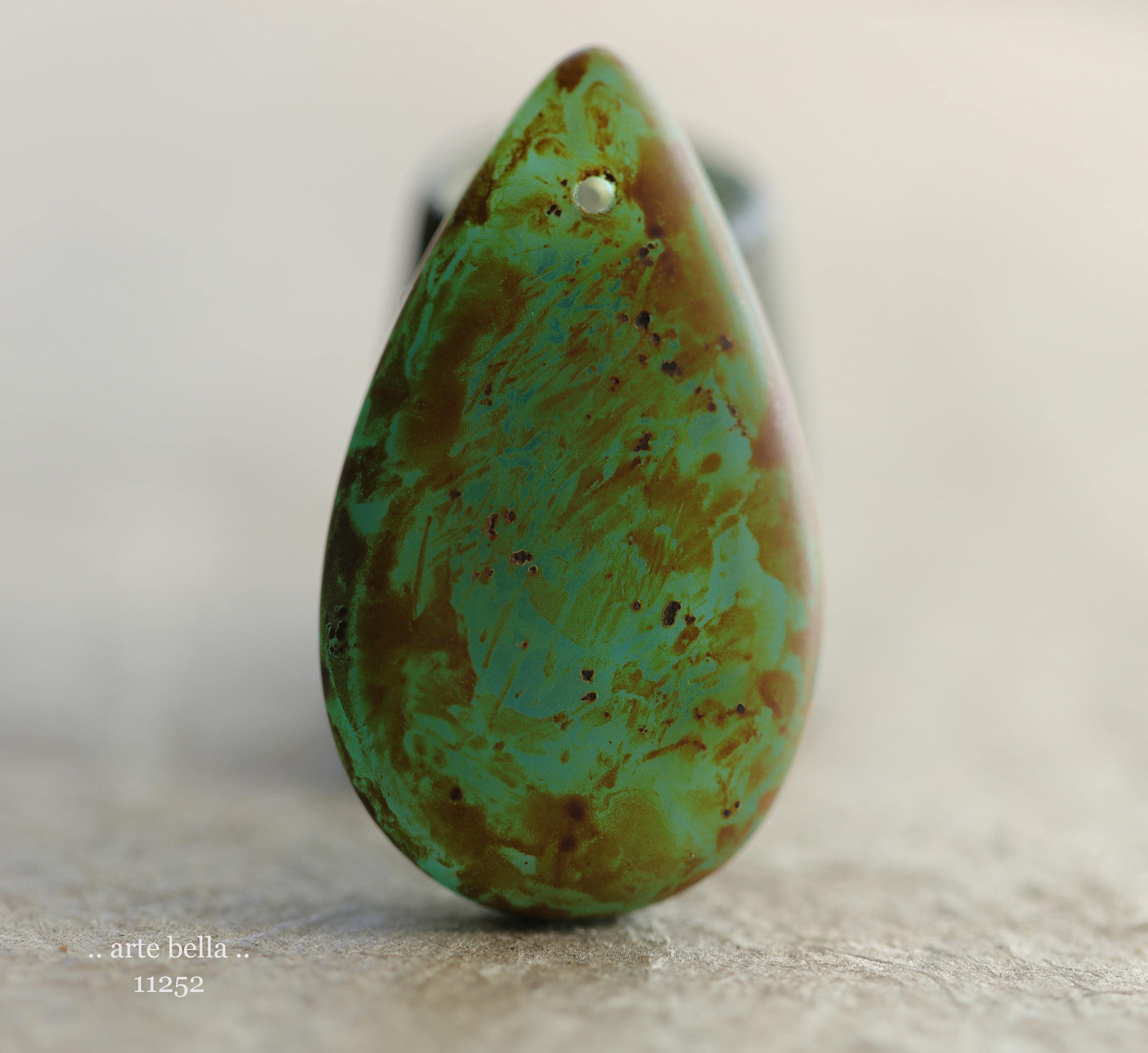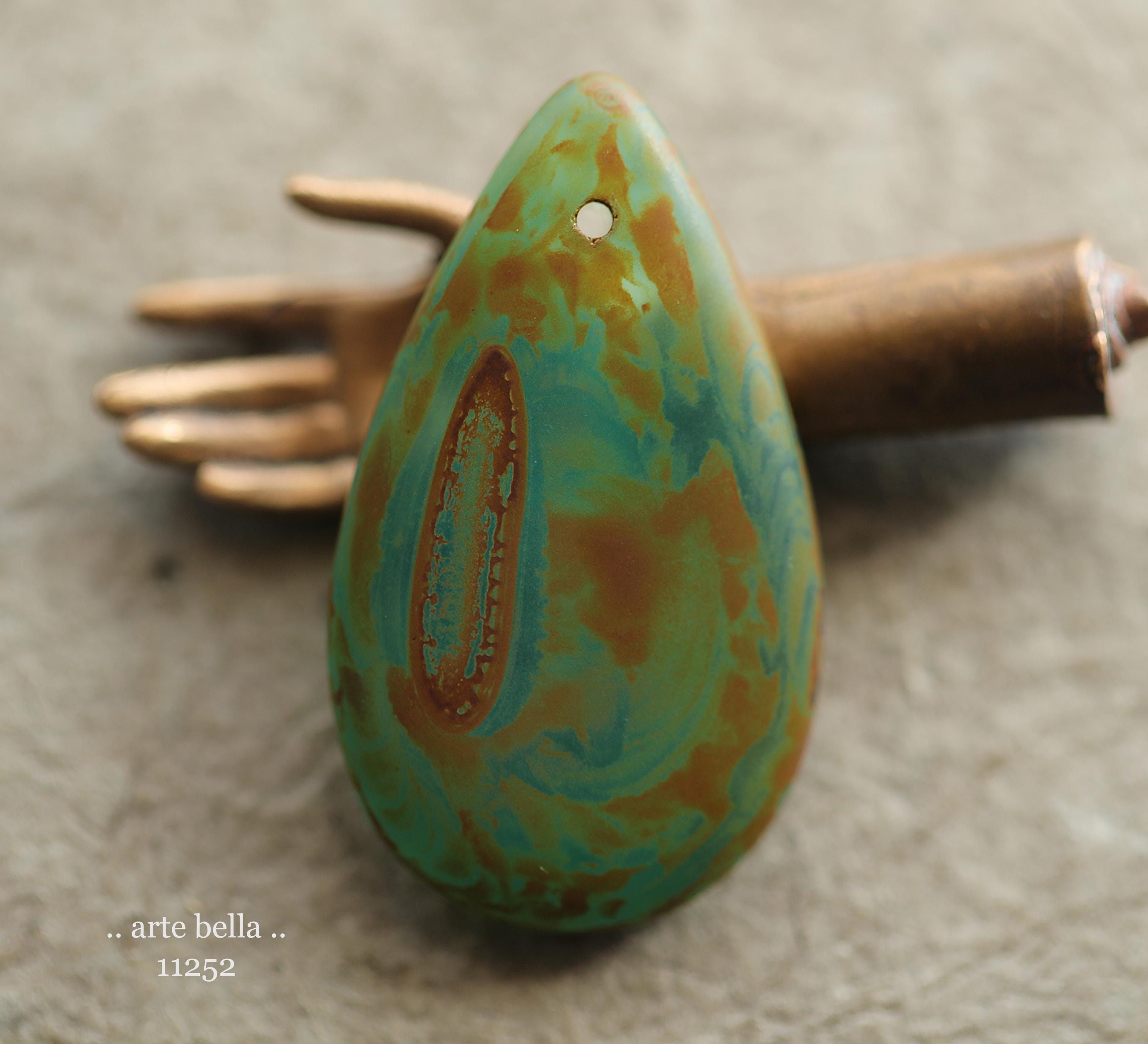 Large drop bead/pendants in translucent aqua blue glass with a matte earthy amber mossy Picasso. As seen in the pictures, they transmit light beautifully. **PLEASE NOTE: Every bead/pendant is unique and one of a kind as seen in my pictures.**