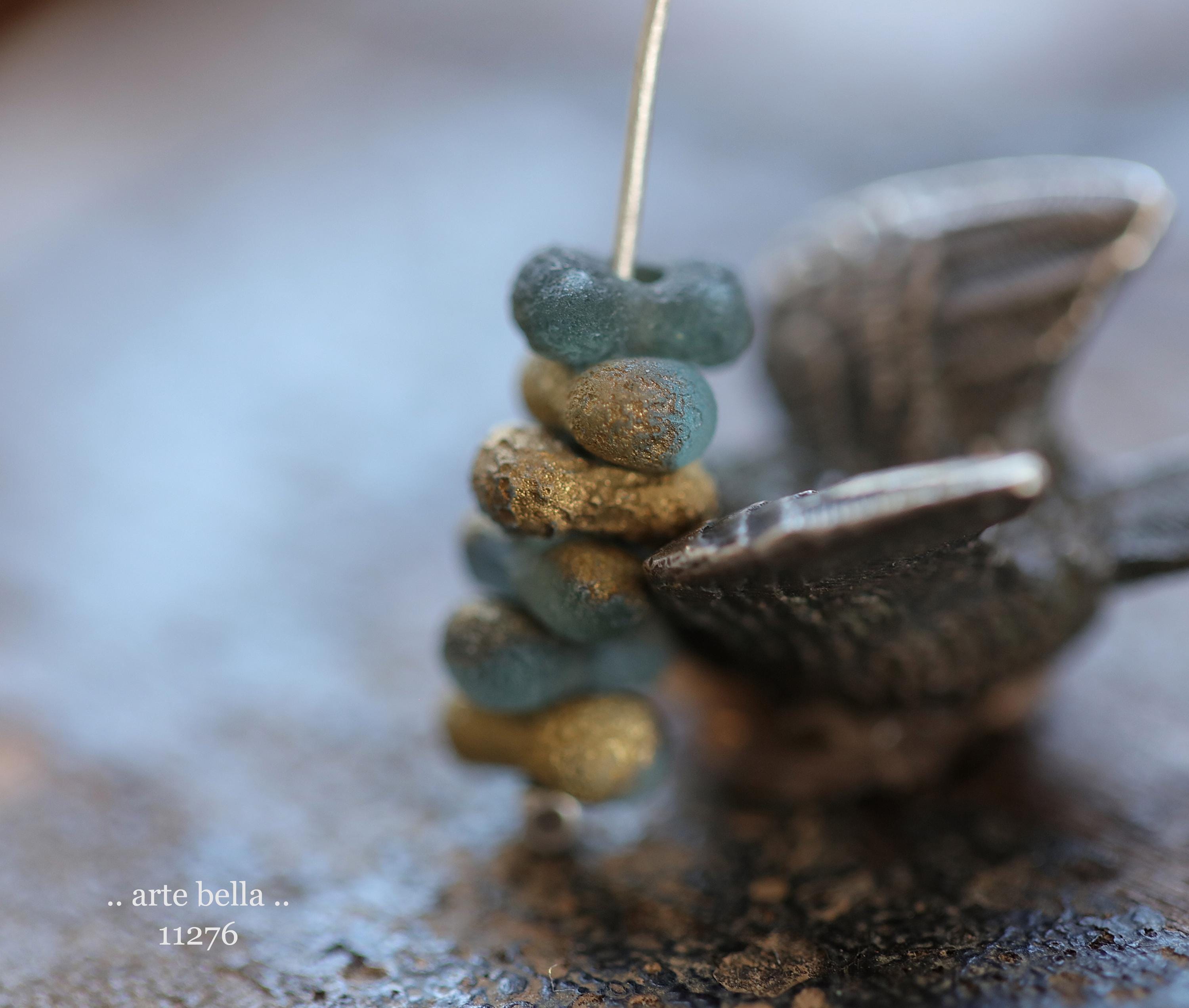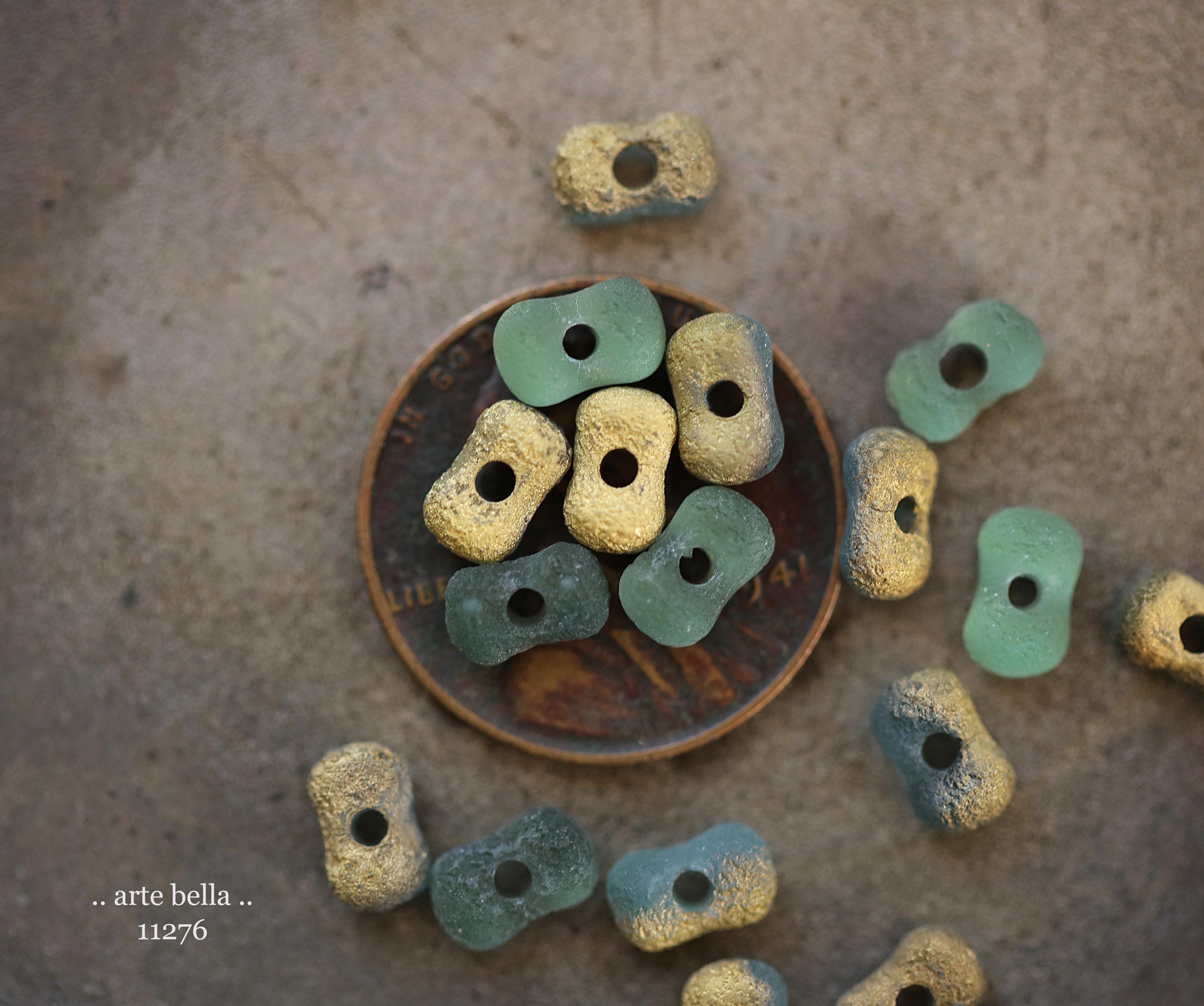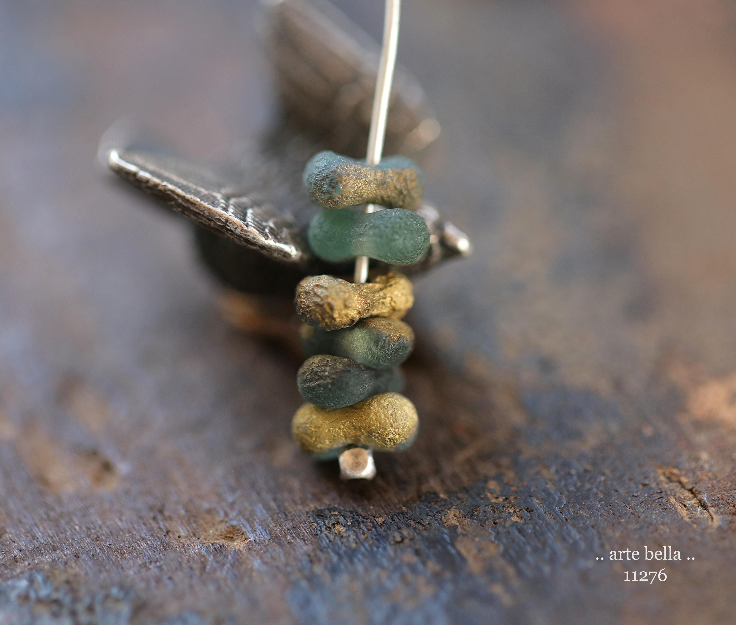 Rustic etched ocean blue green glass with a 1/2 coat matte gold finish .. these "interlock" as seen in my pics. Love.....