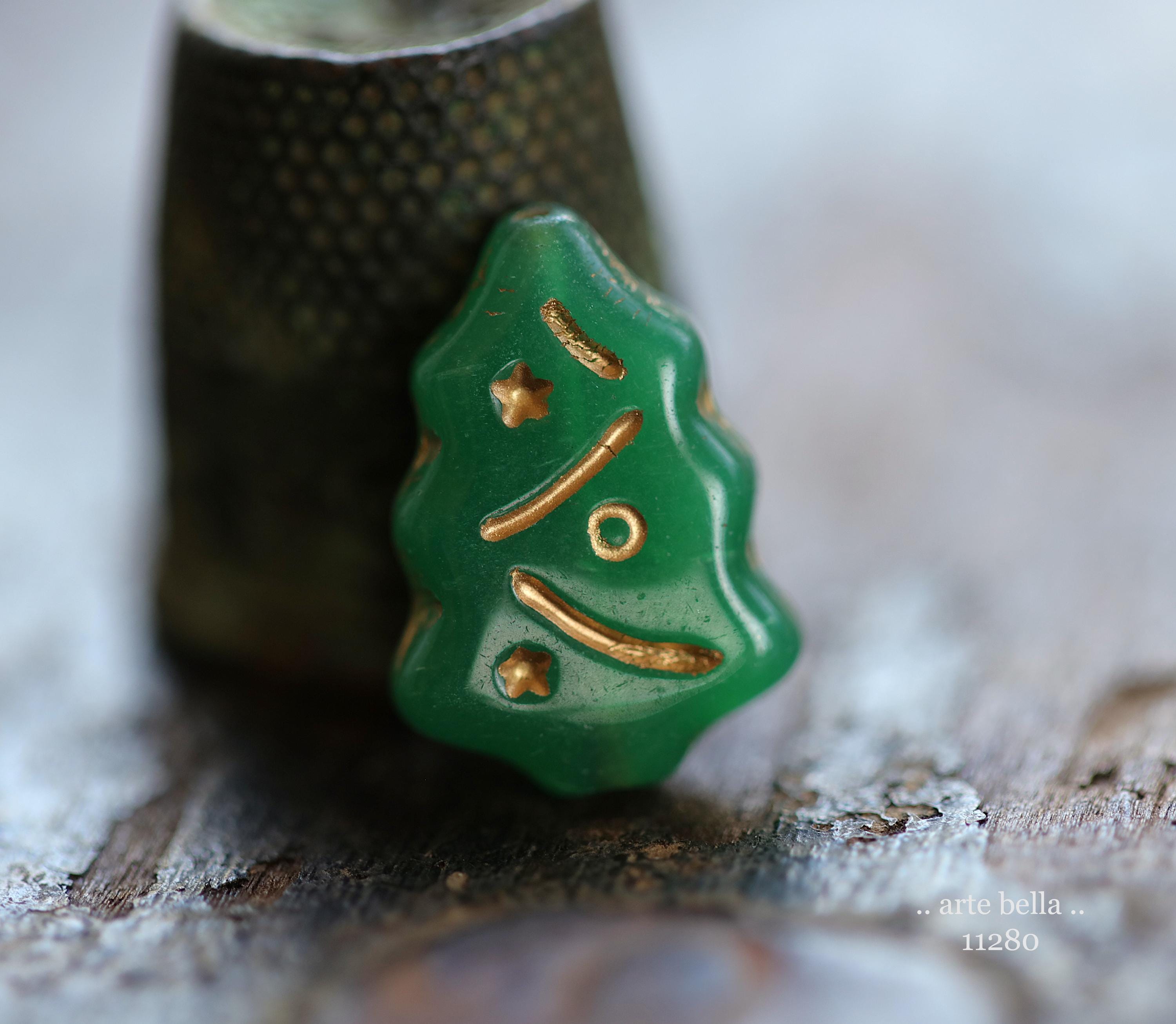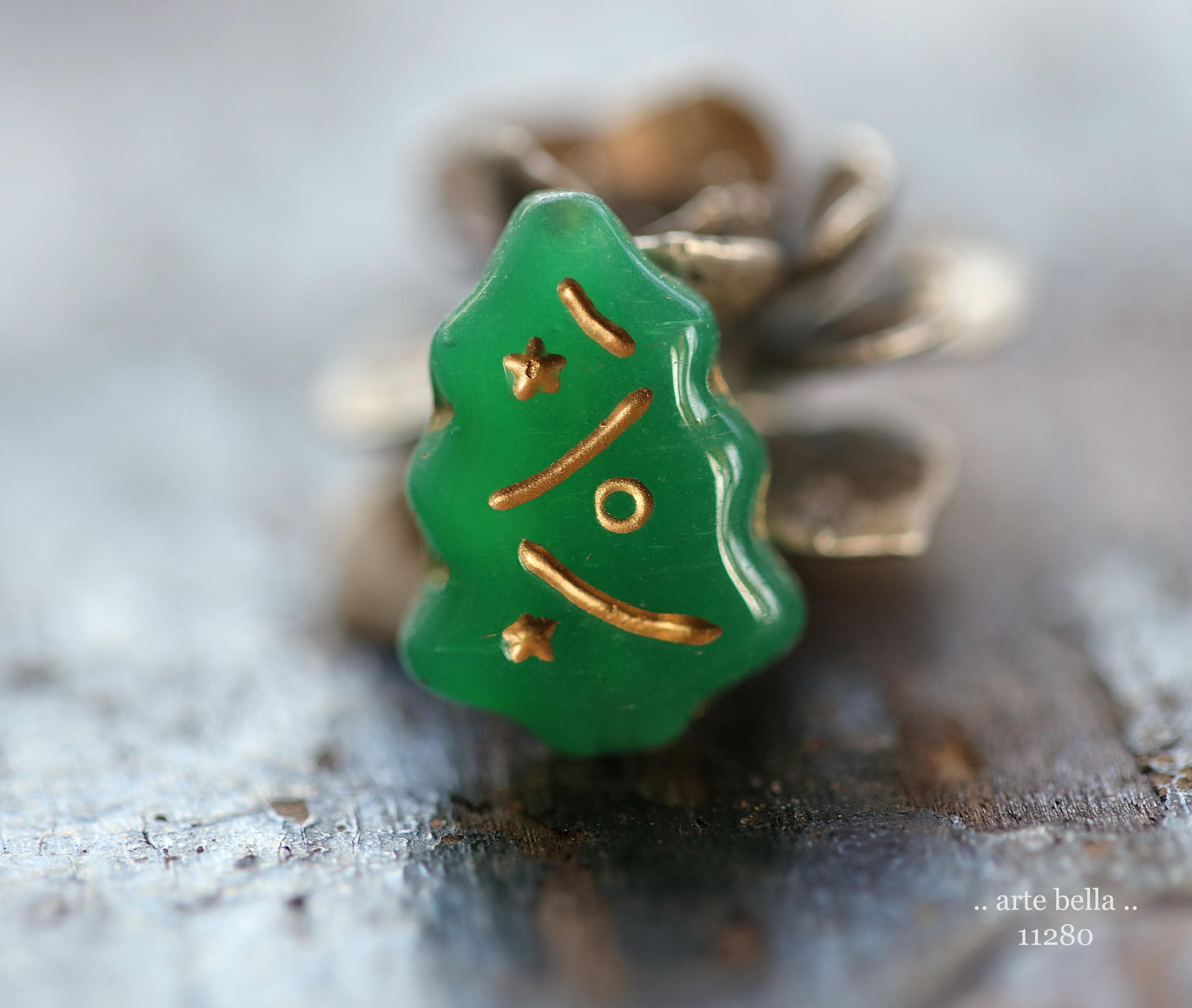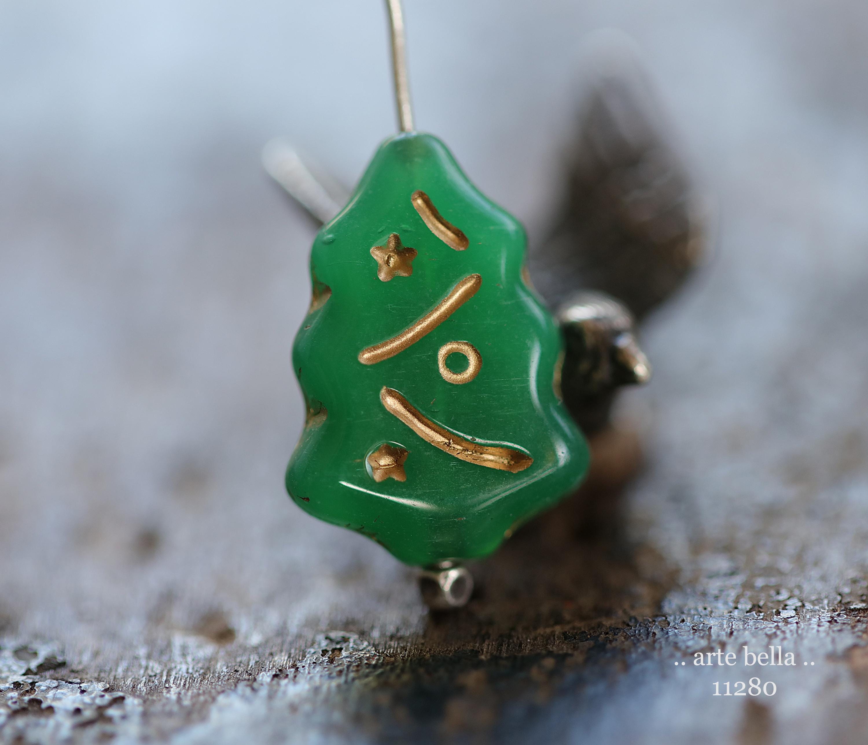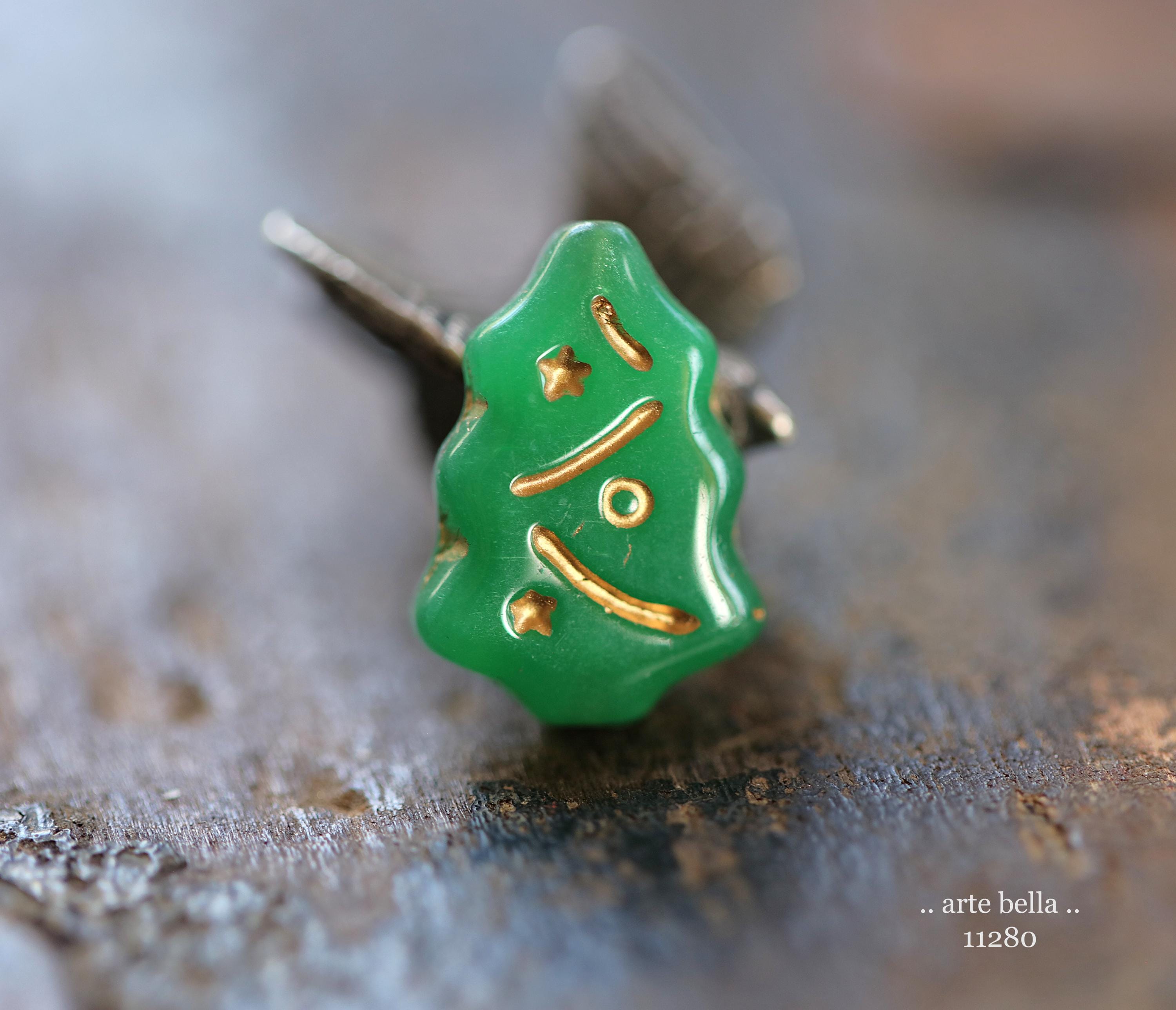 New .. GOLDEN GREEN TREES .. 6 Czech Glass Christmas Tree Bead Mix 17x12mm (11280-6) .. jewelry supplies