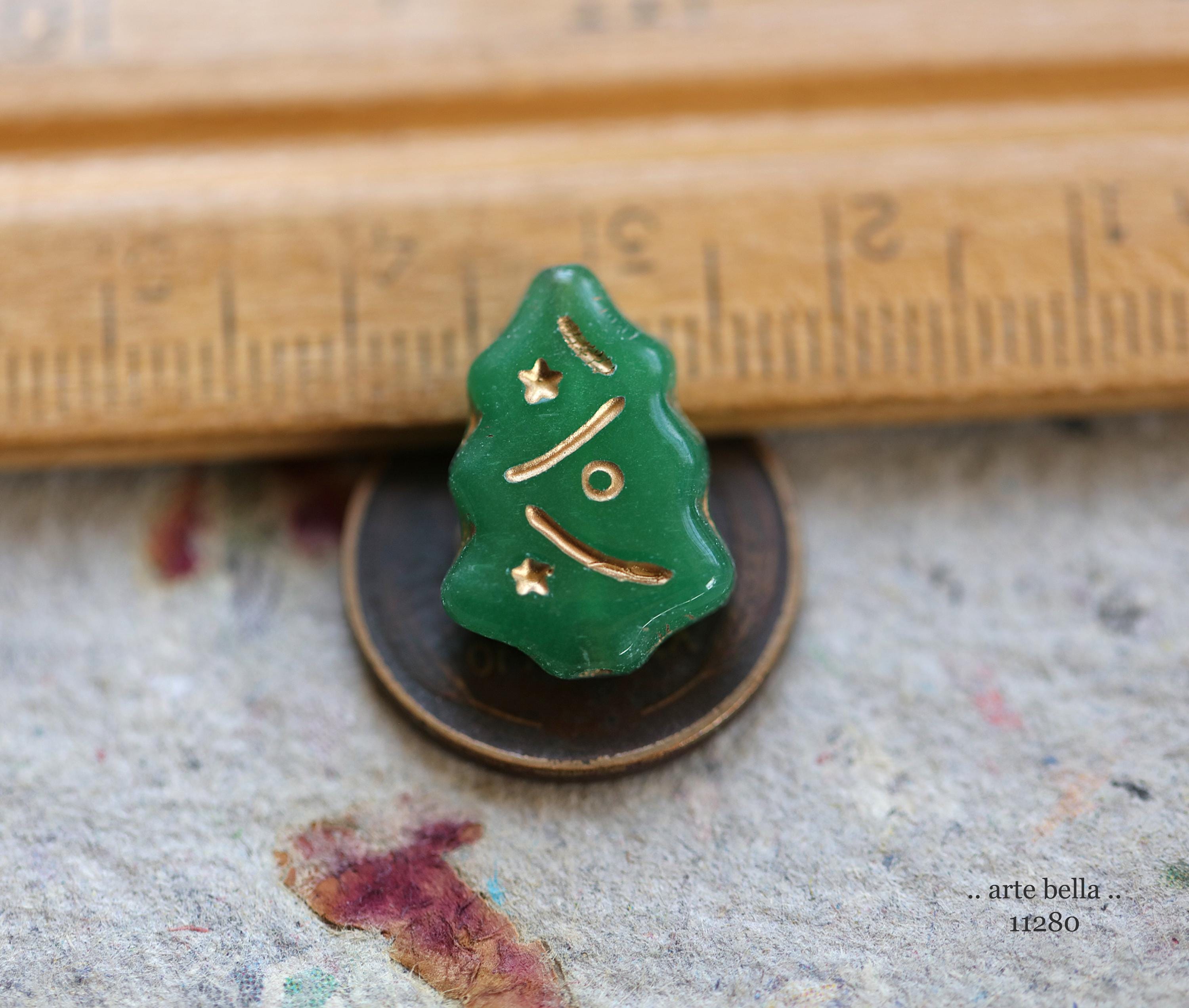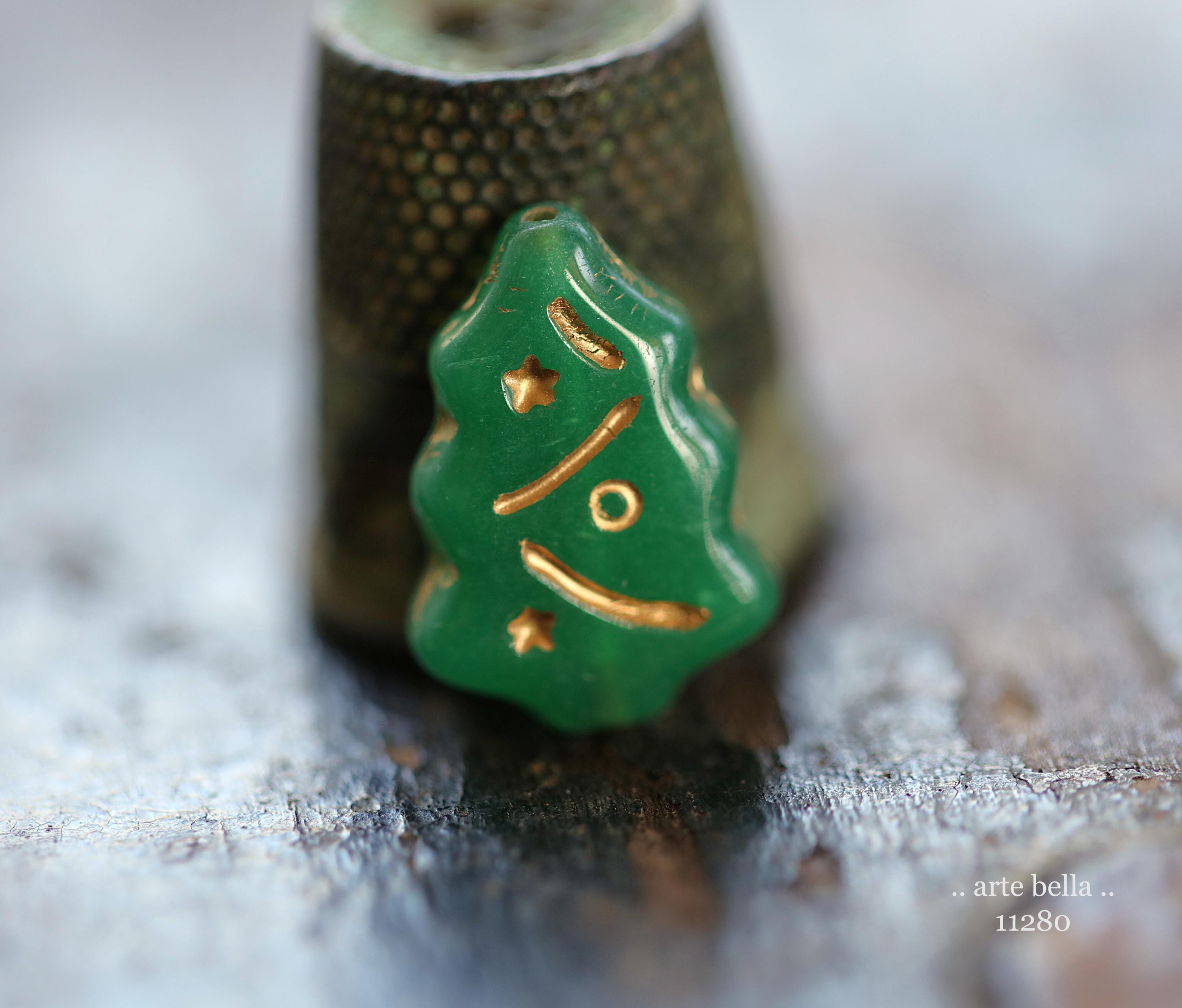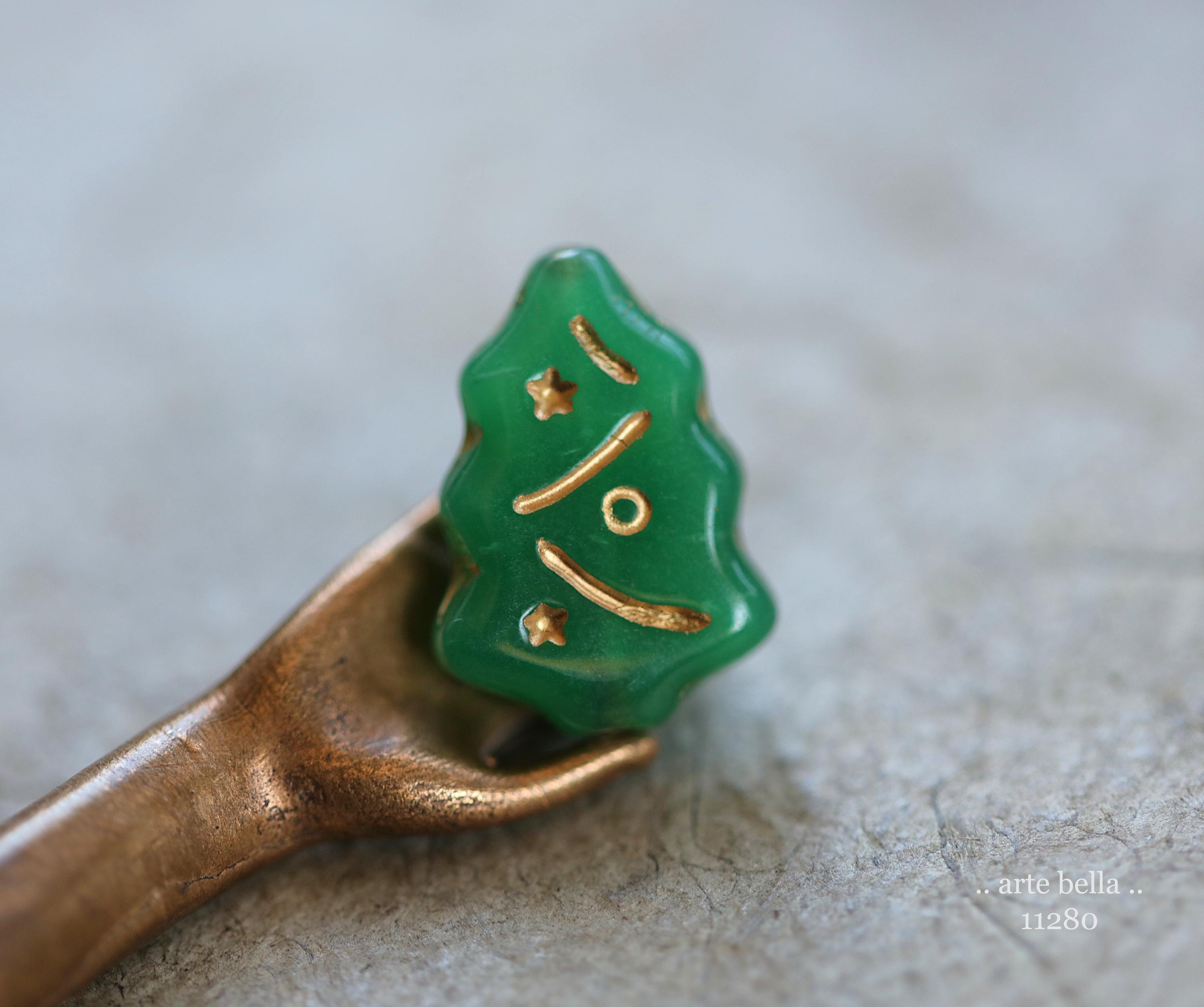New .. GOLDEN GREEN TREES .. 6 Czech Glass Christmas Tree Bead Mix 17x12mm (11280-6) .. jewelry supplies