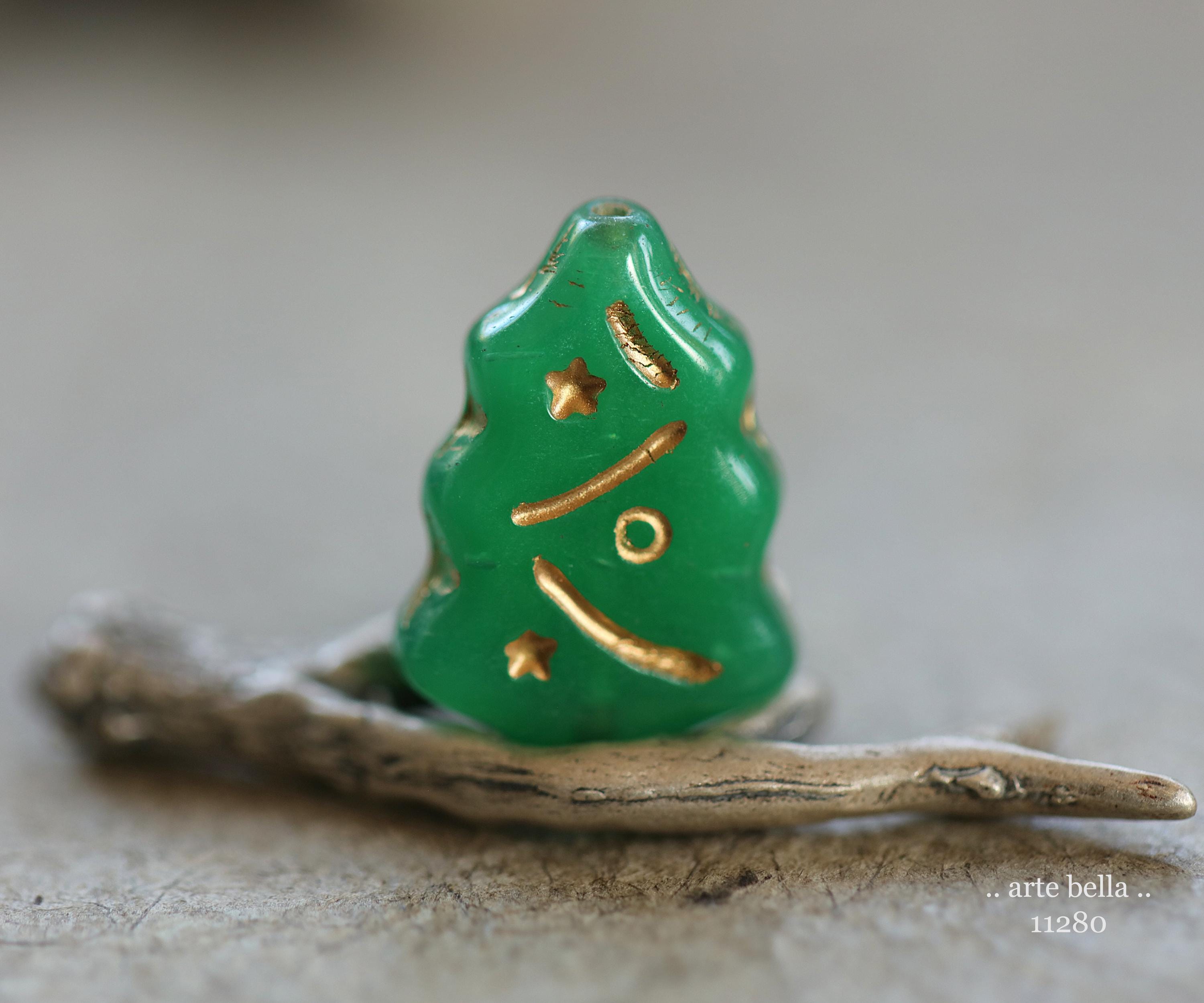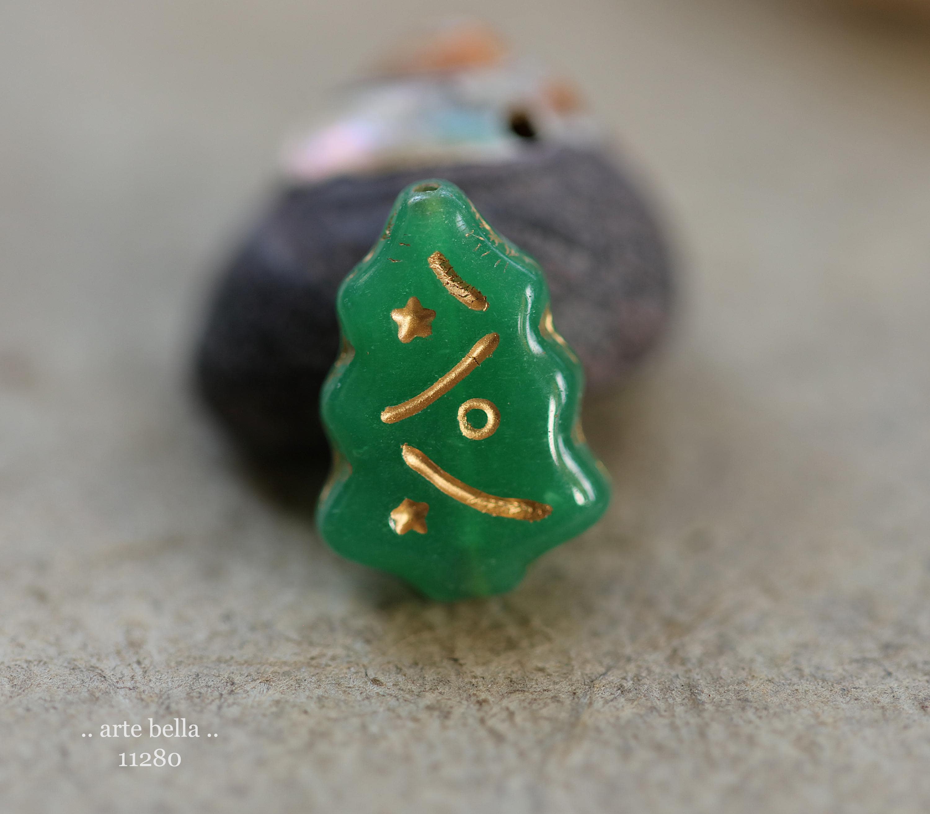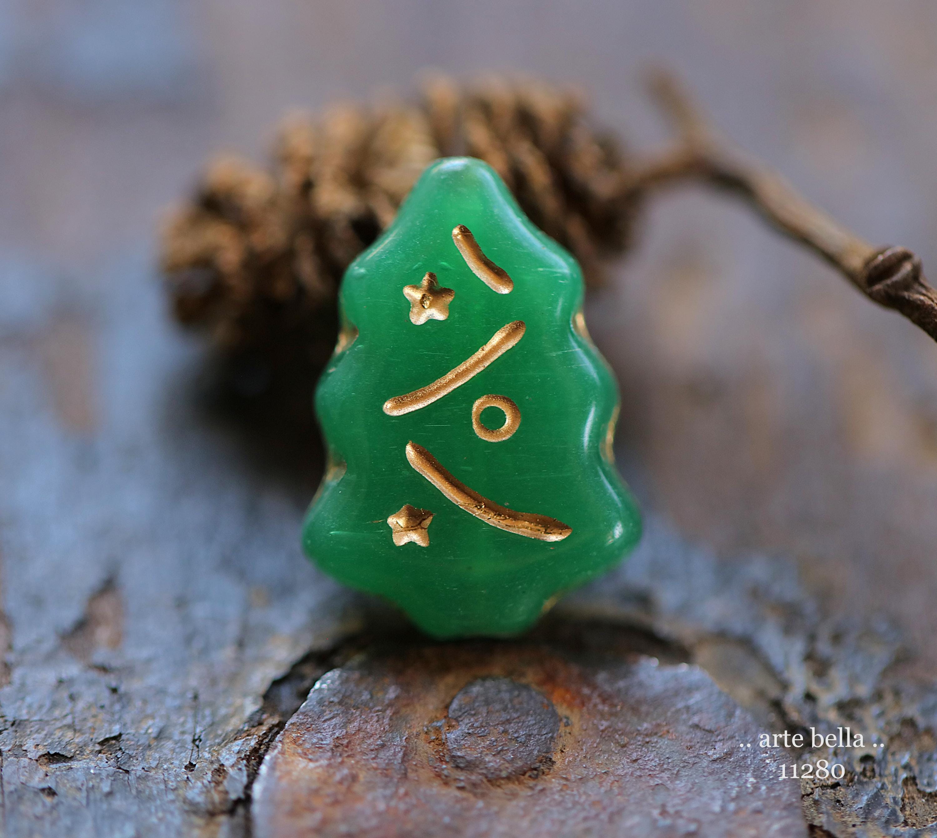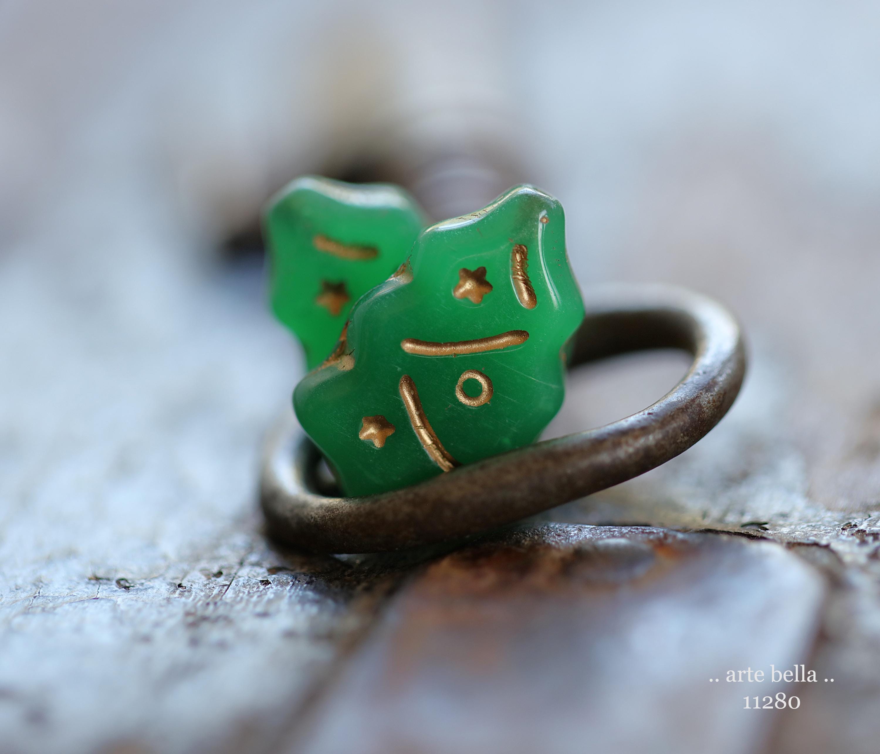 New .. GOLDEN GREEN TREES .. 6 Czech Glass Christmas Tree Bead Mix 17x12mm (11280-6) .. jewelry supplies