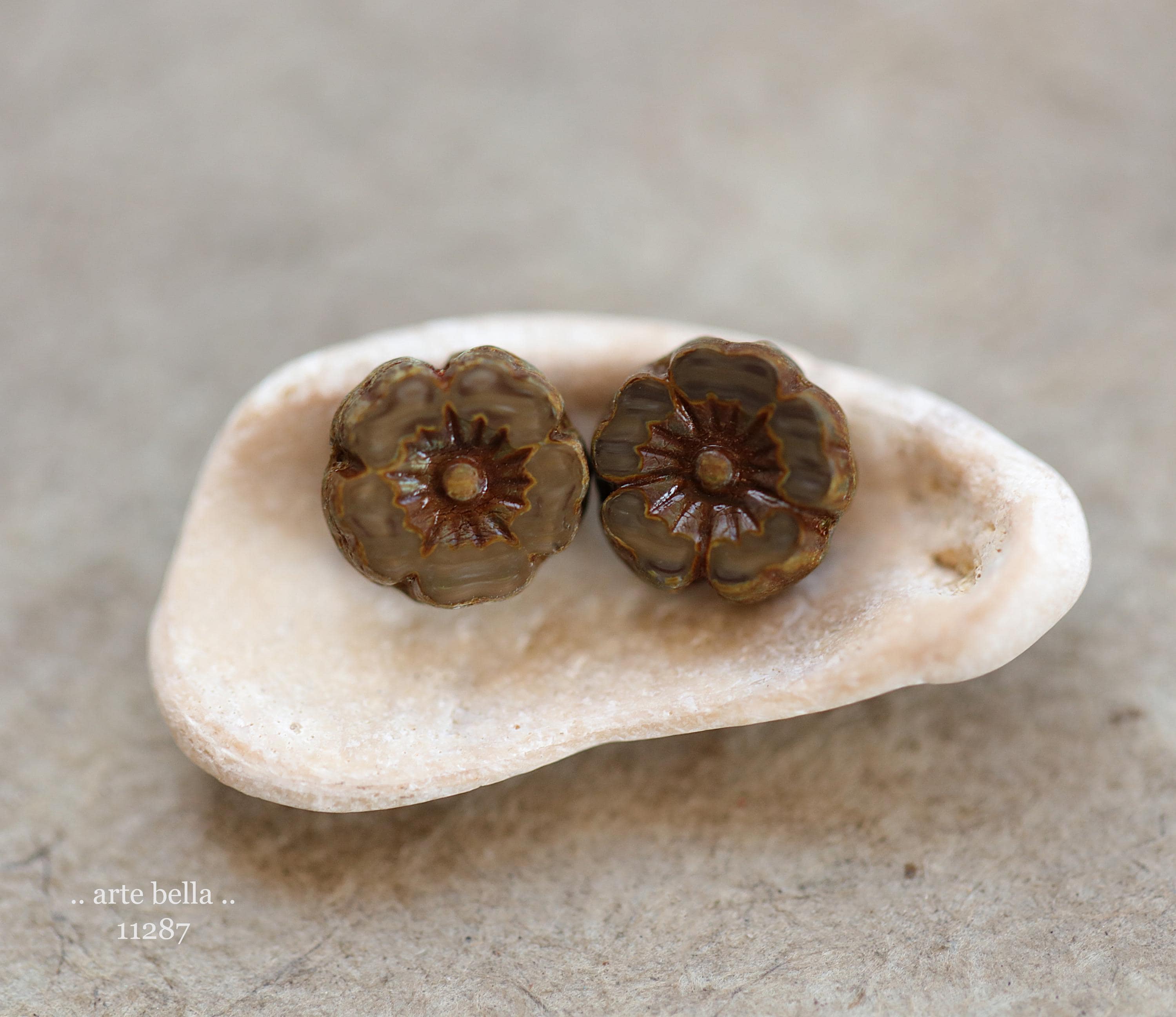 Opaque glass mix in dark mocha latte brown glass with an earthy Picasso finish around the edges and the recessed areas. Polished off on the face of the beads to reveal the gorgeous glass beneath.