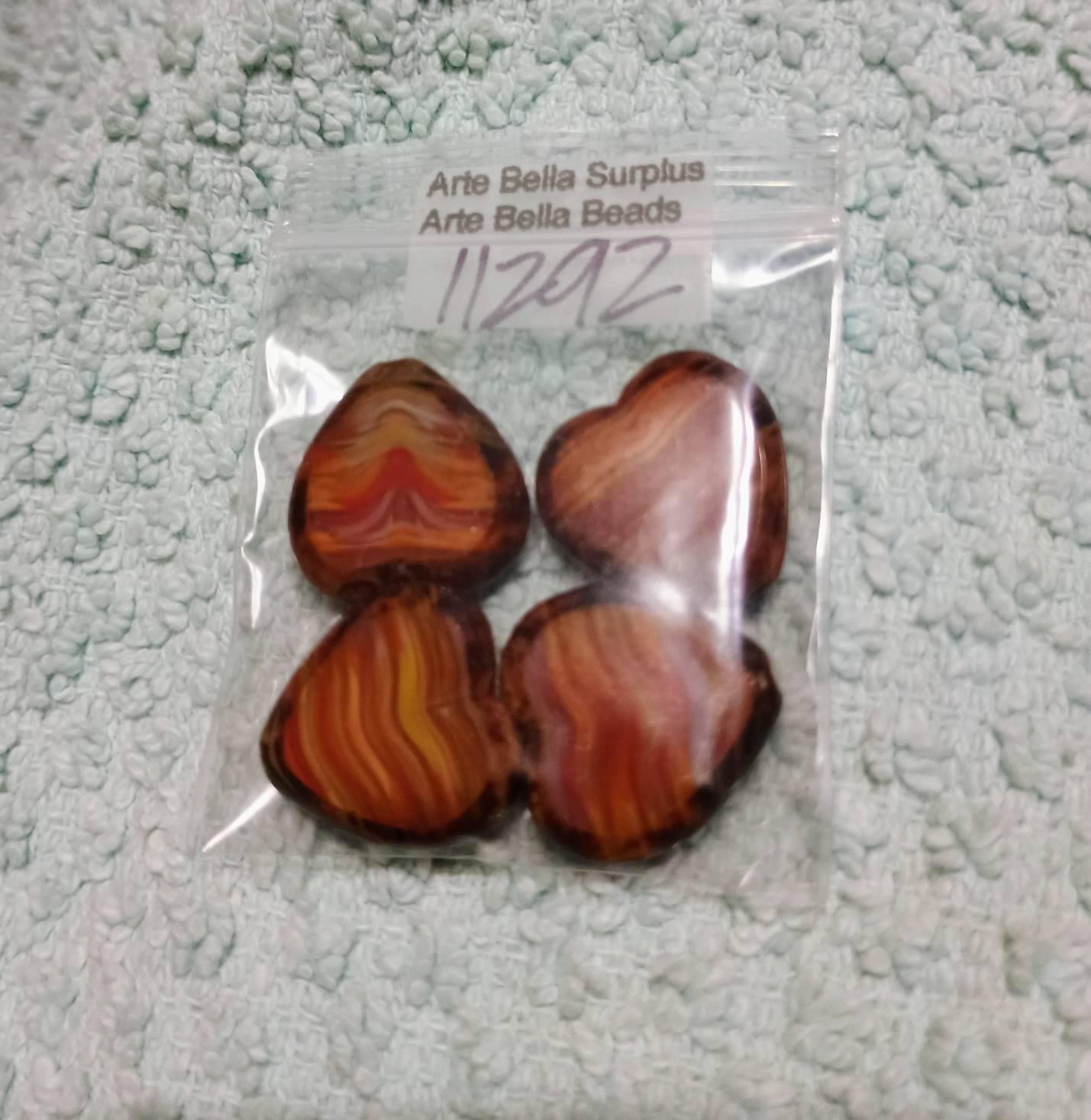 Great glass heart beads in striped red, orange, yellow and white glass mix with fire polished faces and earthy Picasso around the edge. **PLEASE NOTE: You will receive a random mix of 4 beads.**