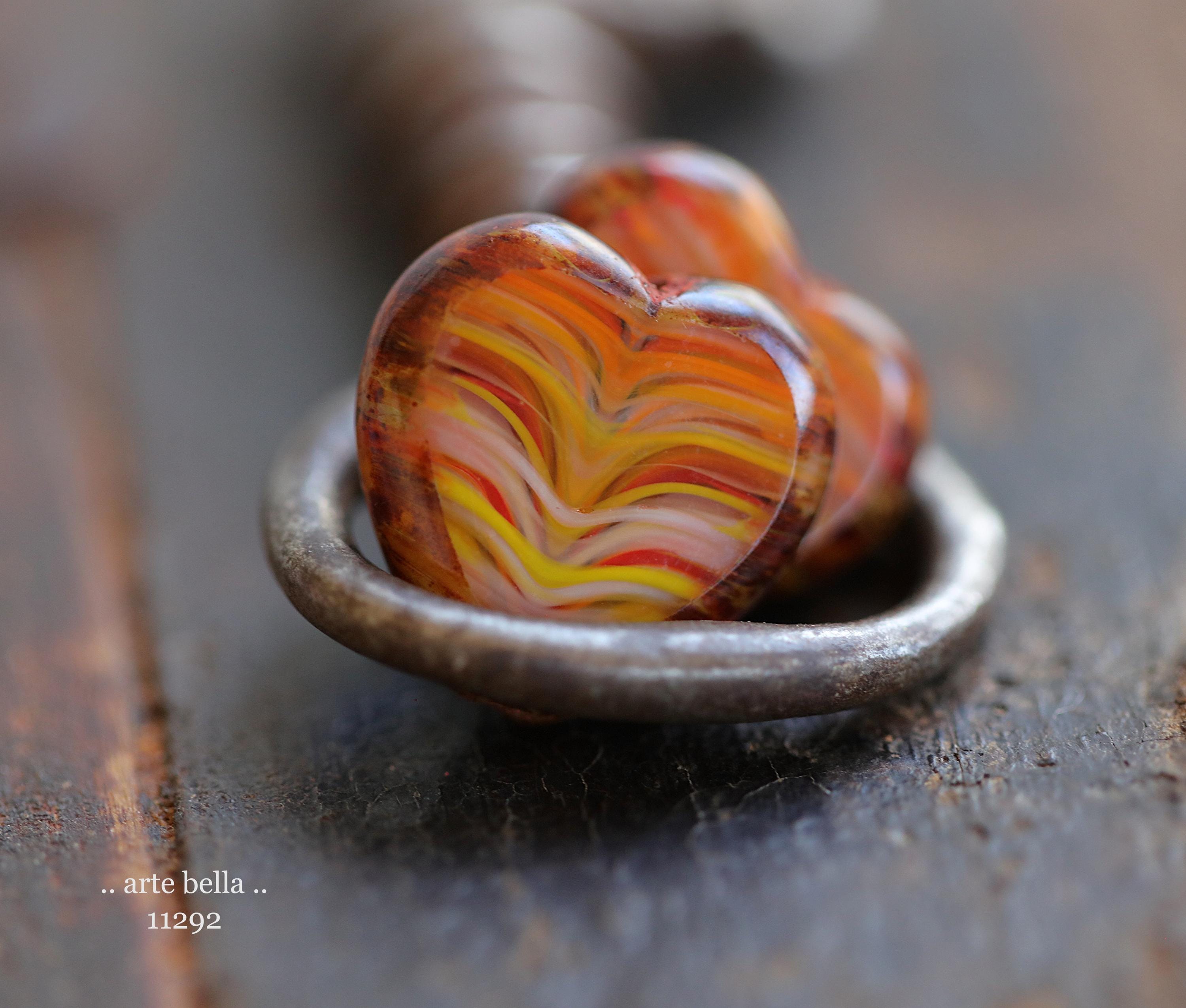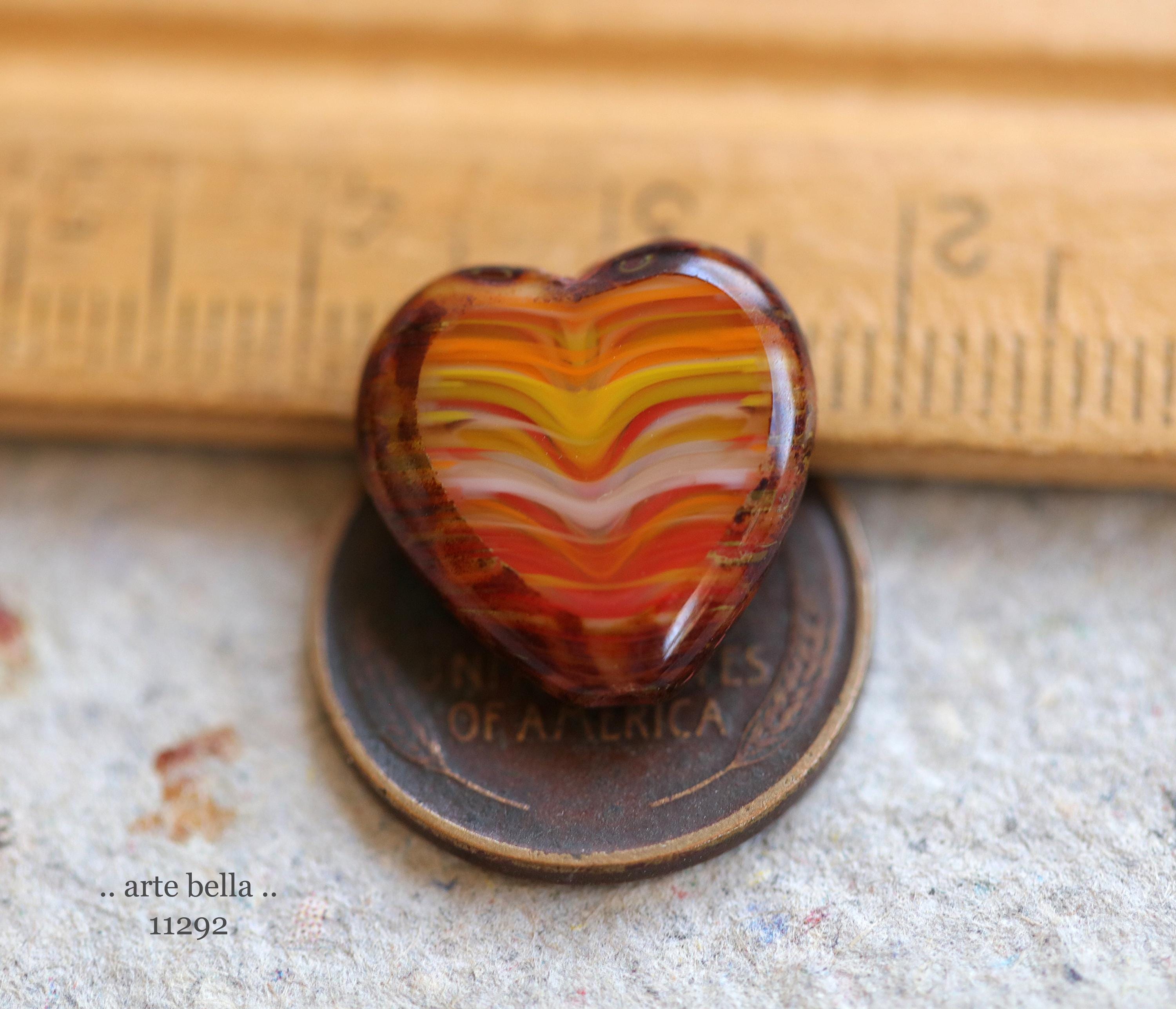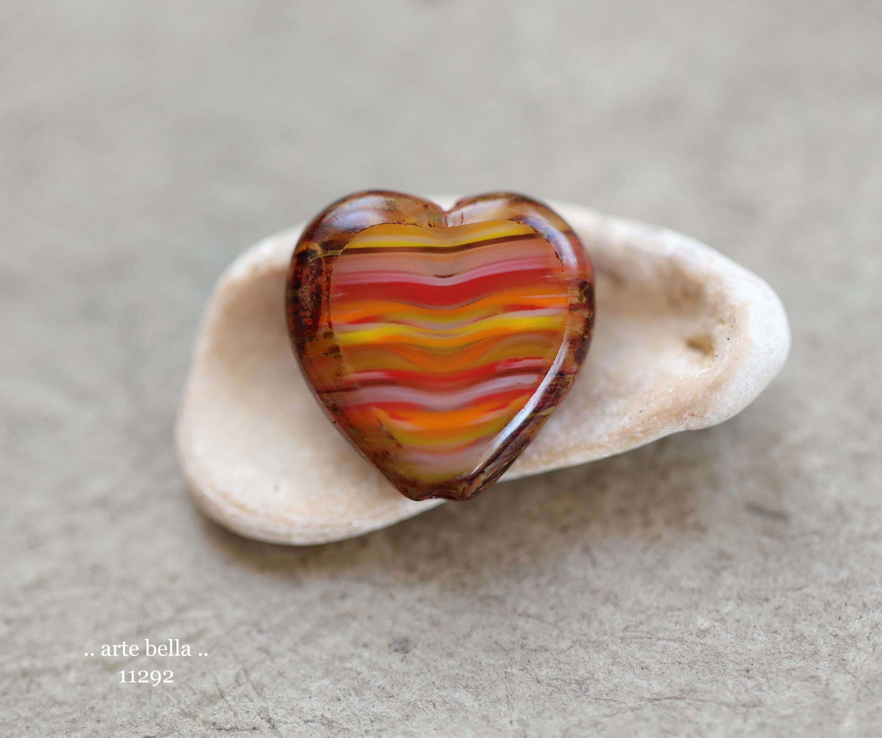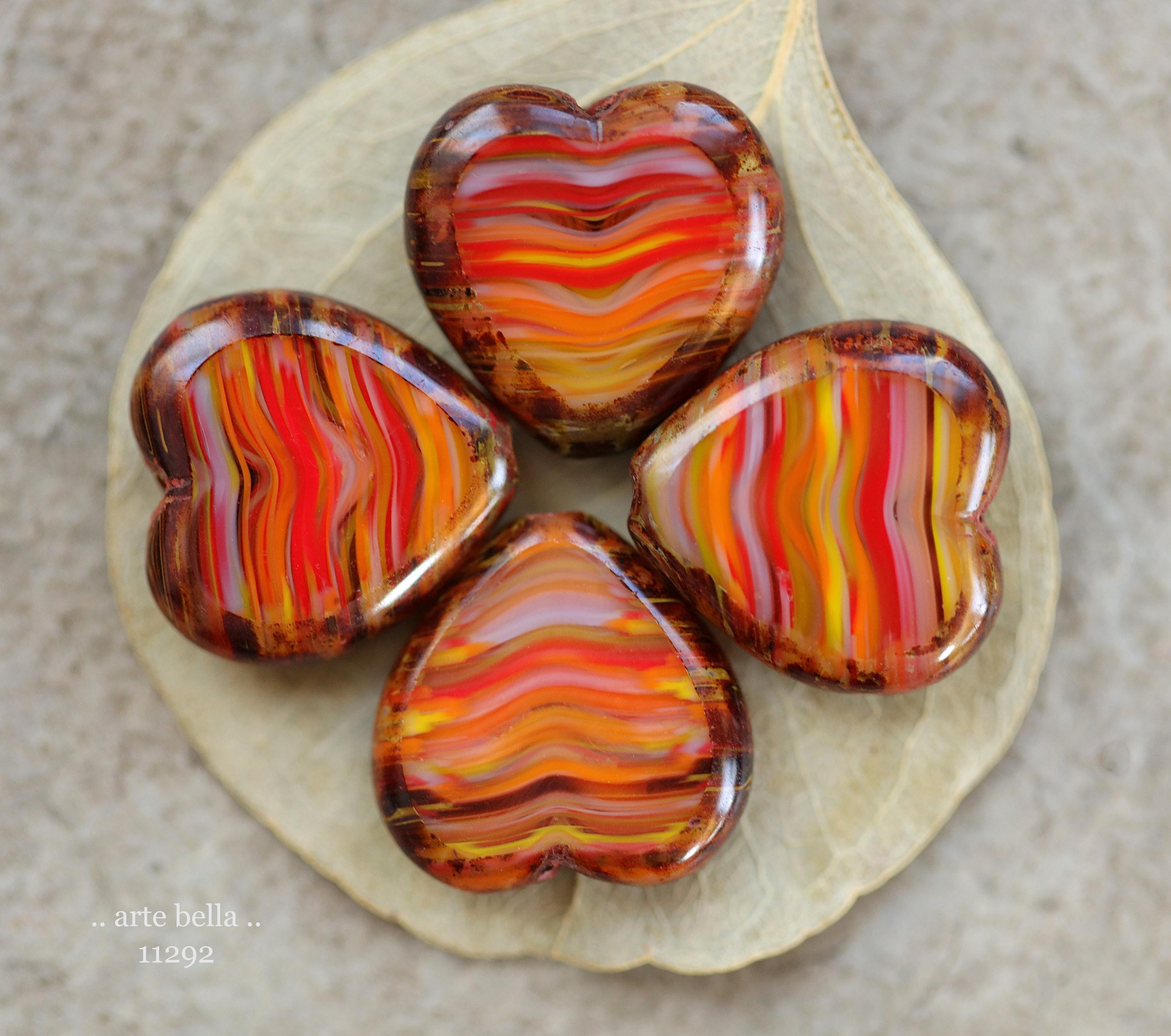 Great glass heart beads in striped red, orange, yellow and white glass mix with fire polished faces and earthy Picasso around the edge. **PLEASE NOTE: You will receive a random mix of 4 beads.**