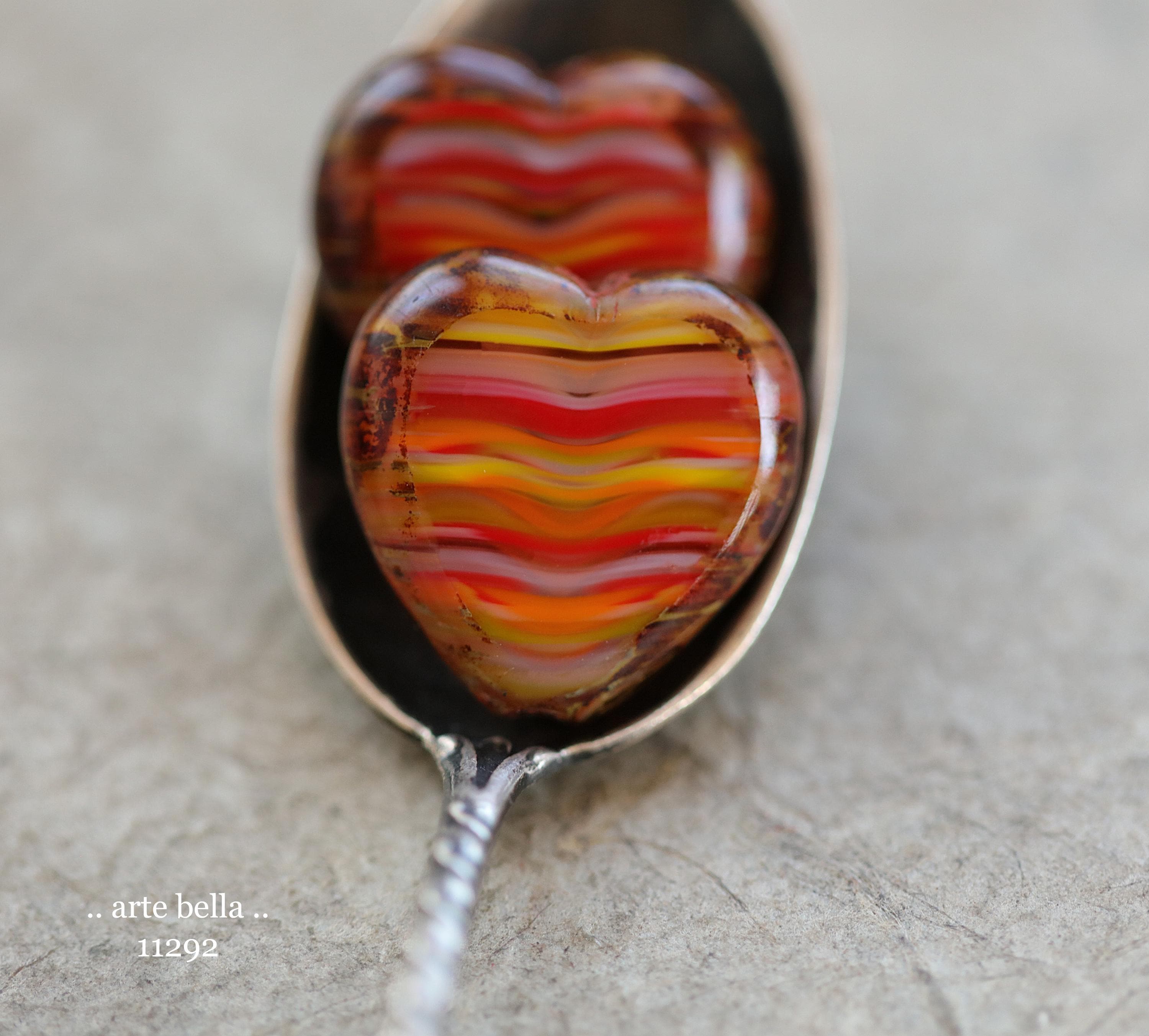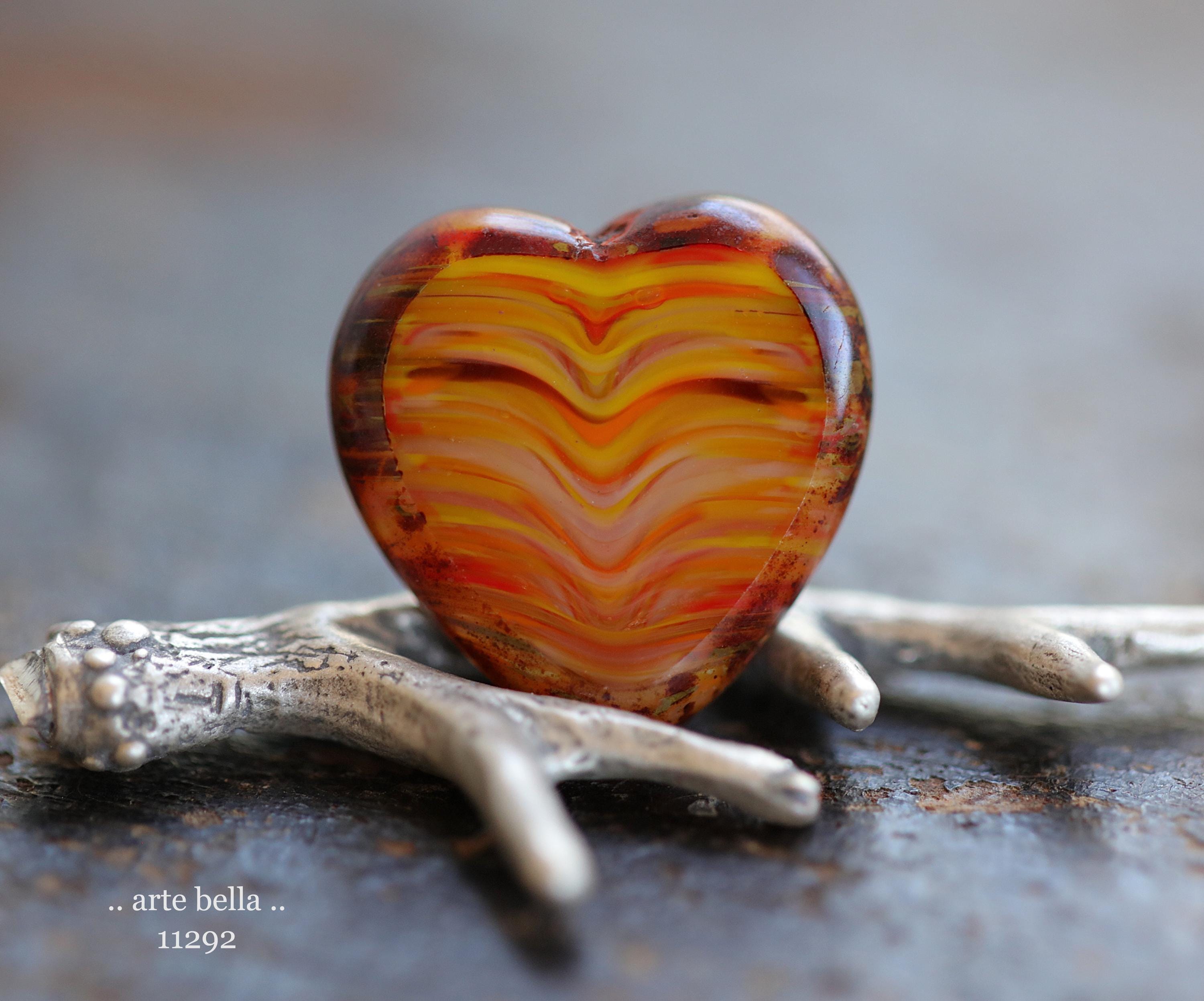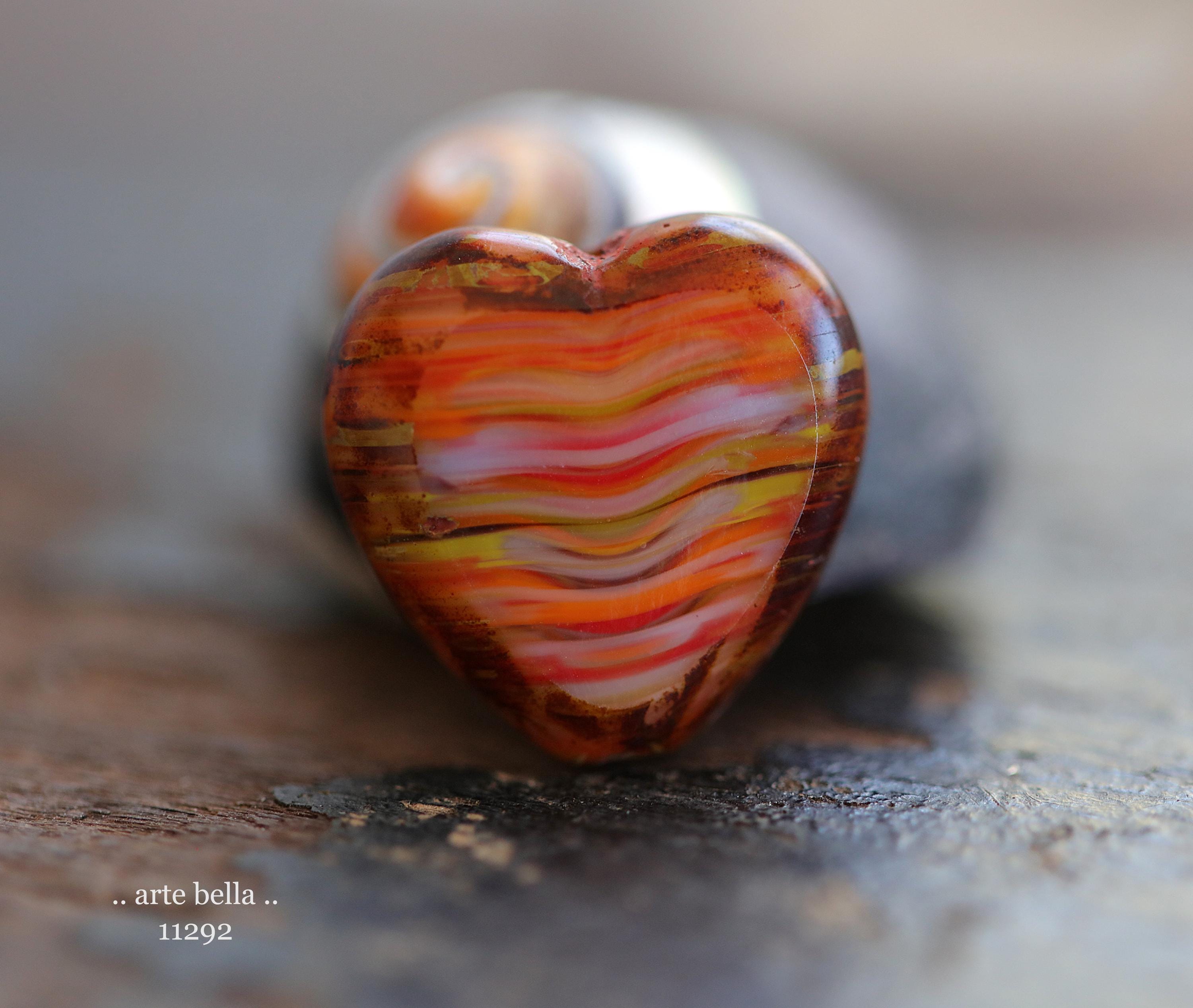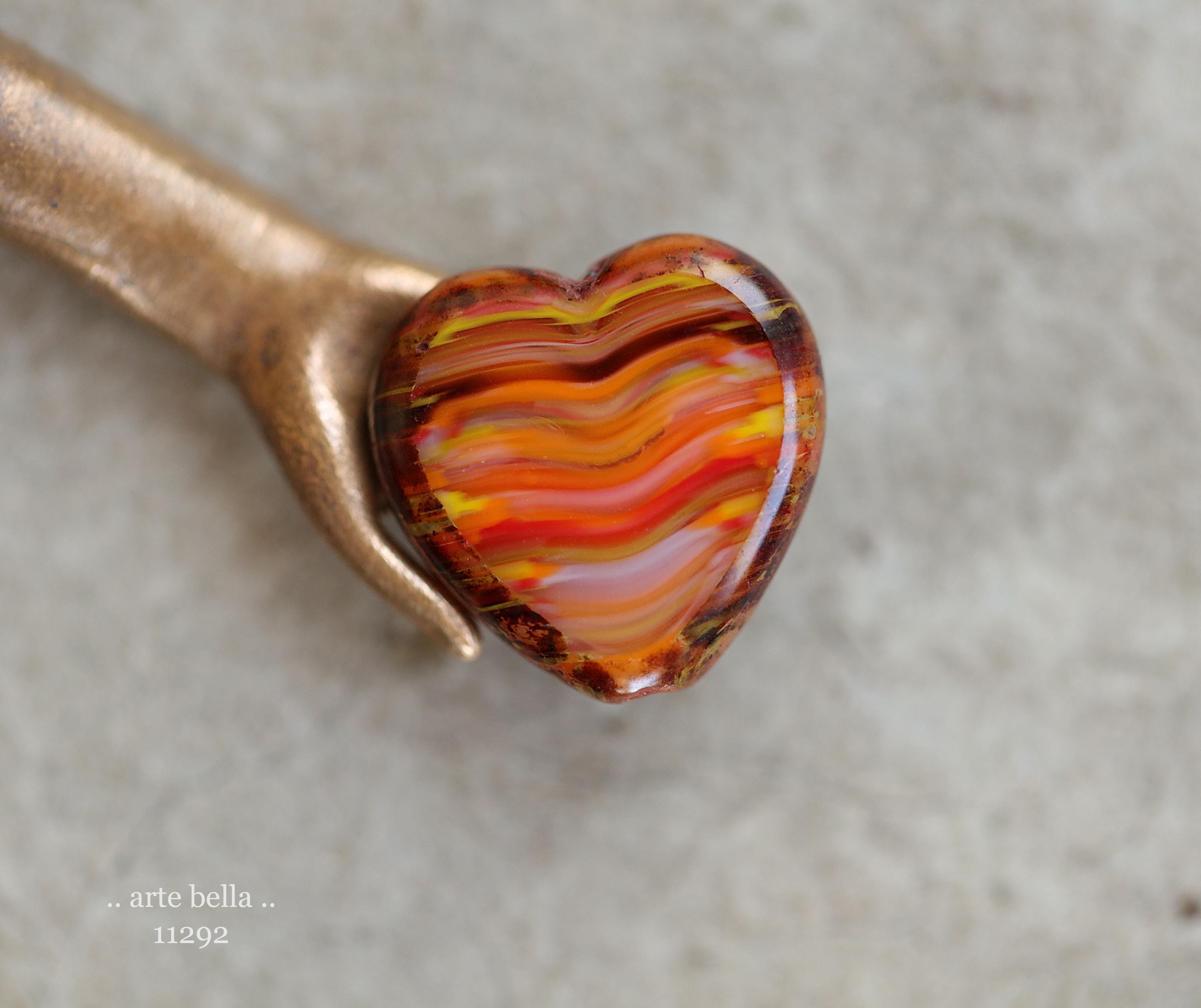 Great glass heart beads in striped red, orange, yellow and white glass mix with fire polished faces and earthy Picasso around the edge. **PLEASE NOTE: You will receive a random mix of 4 beads.**