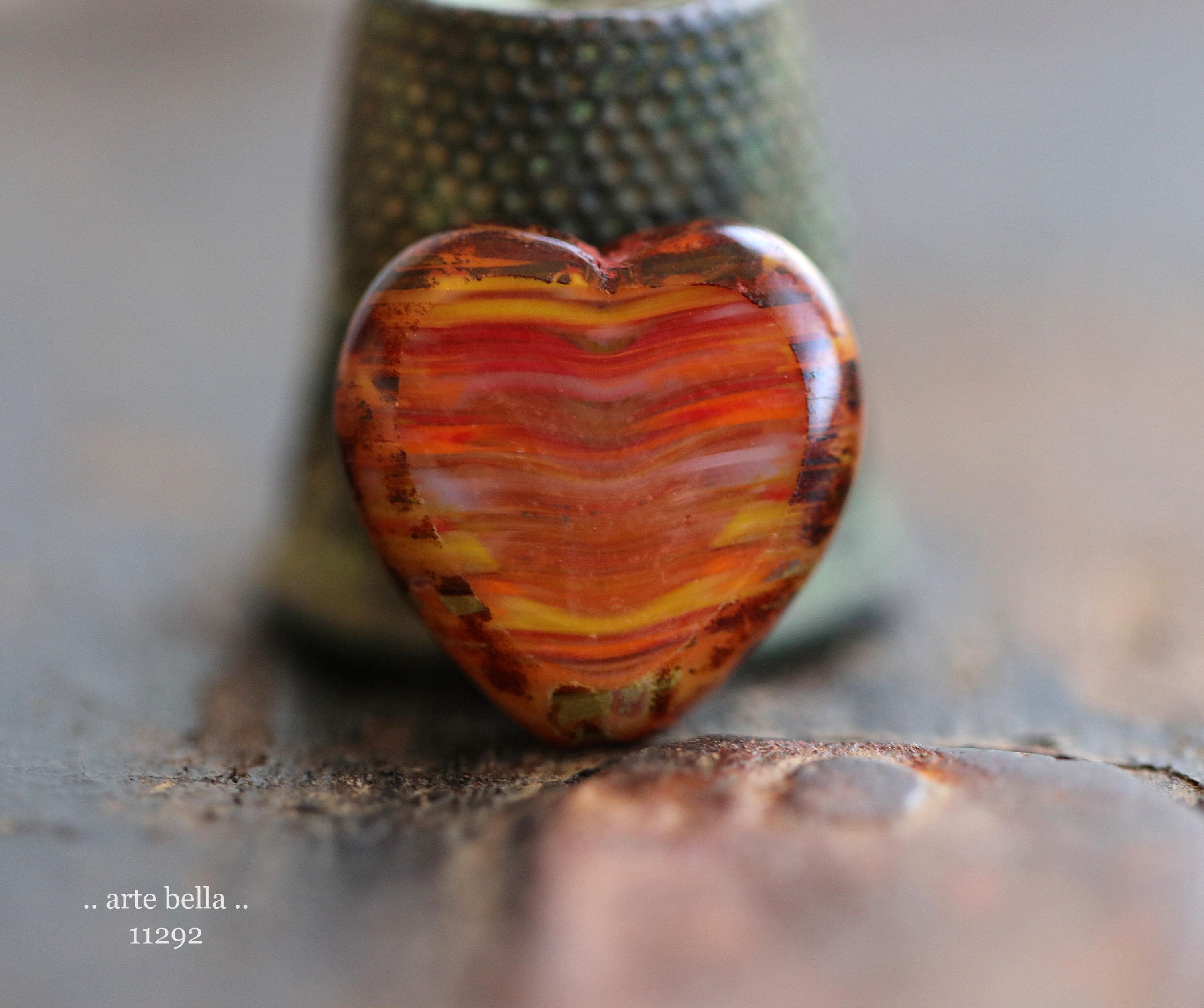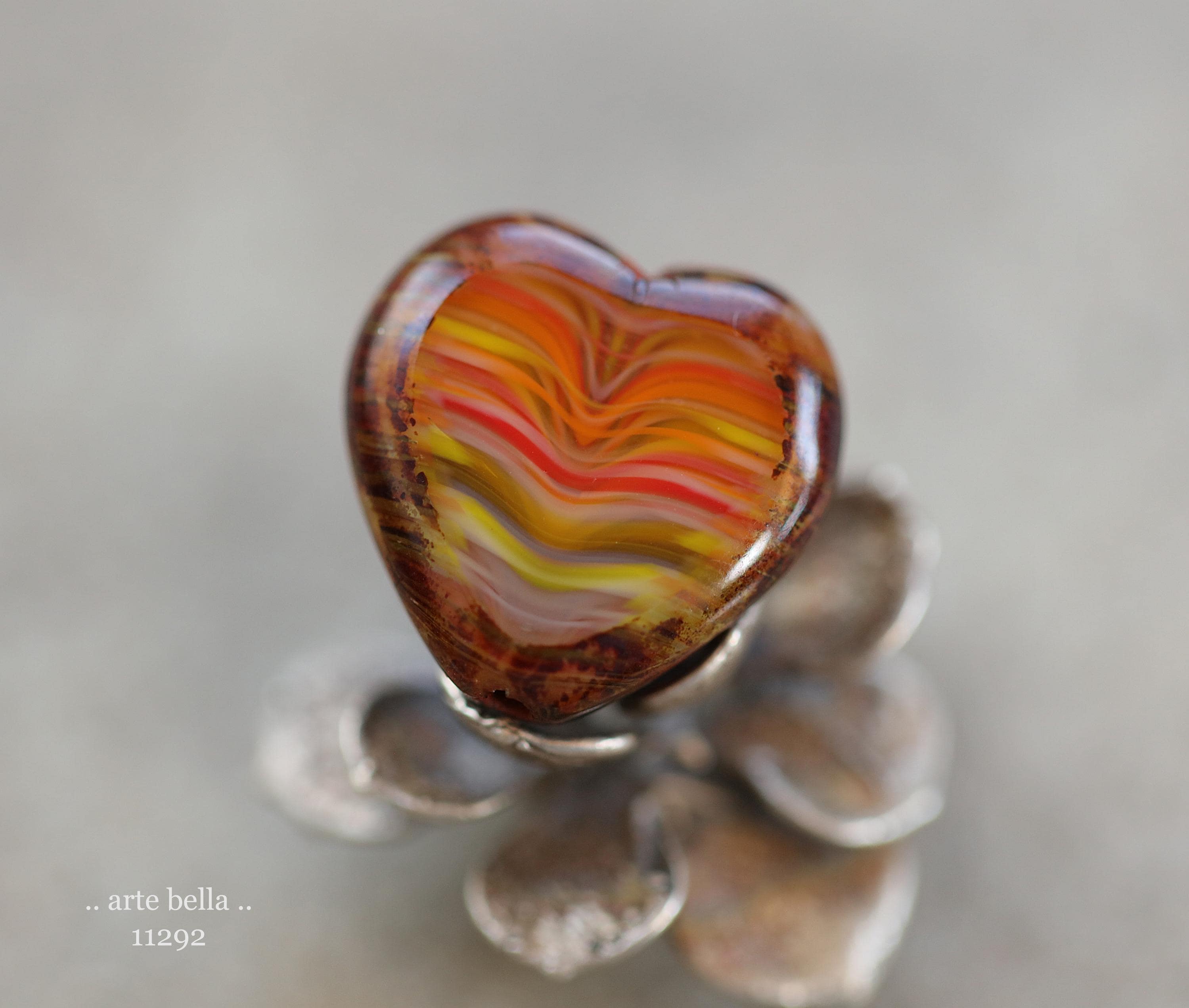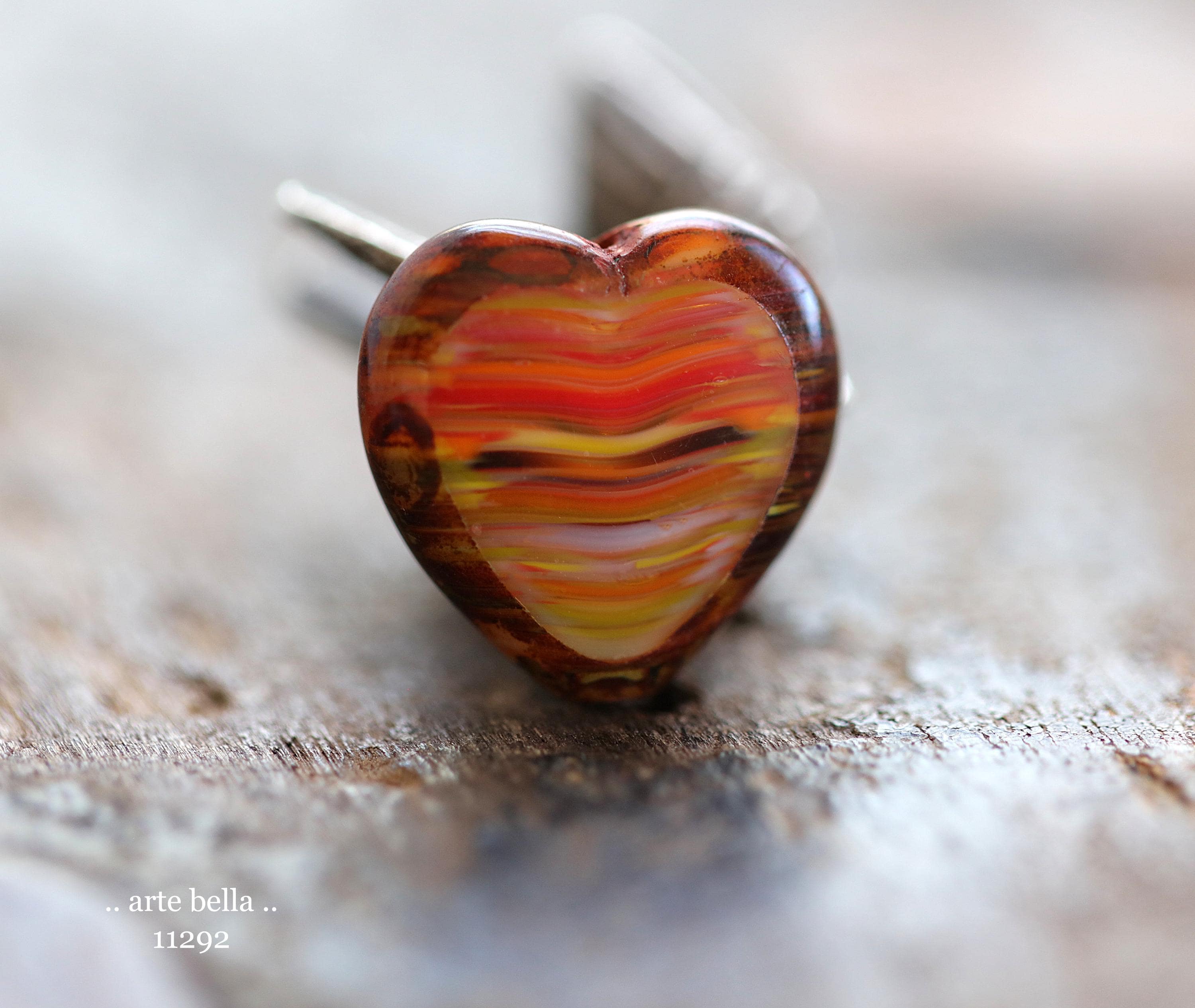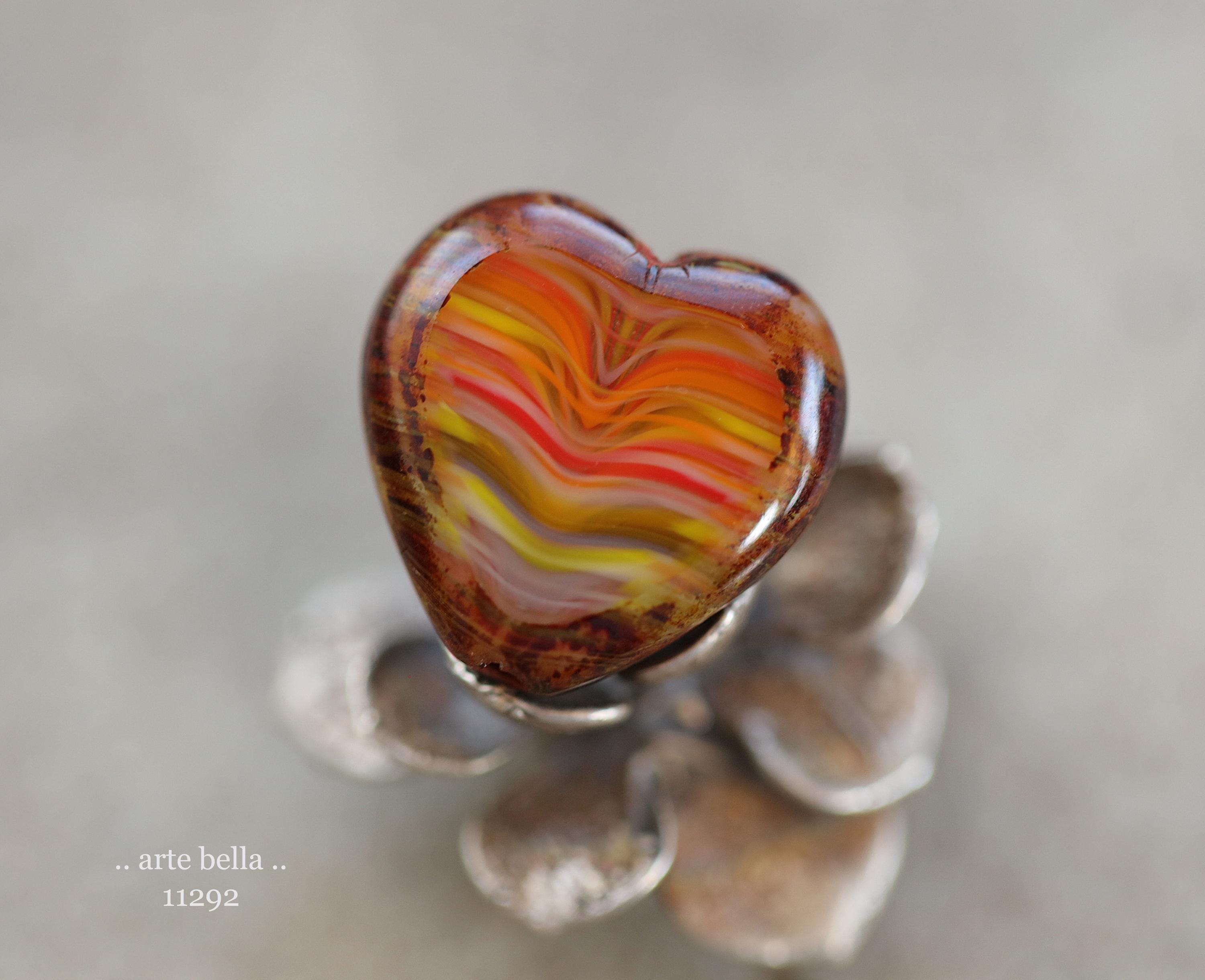 Great glass heart beads in striped red, orange, yellow and white glass mix with fire polished faces and earthy Picasso around the edge. **PLEASE NOTE: You will receive a random mix of 4 beads.**