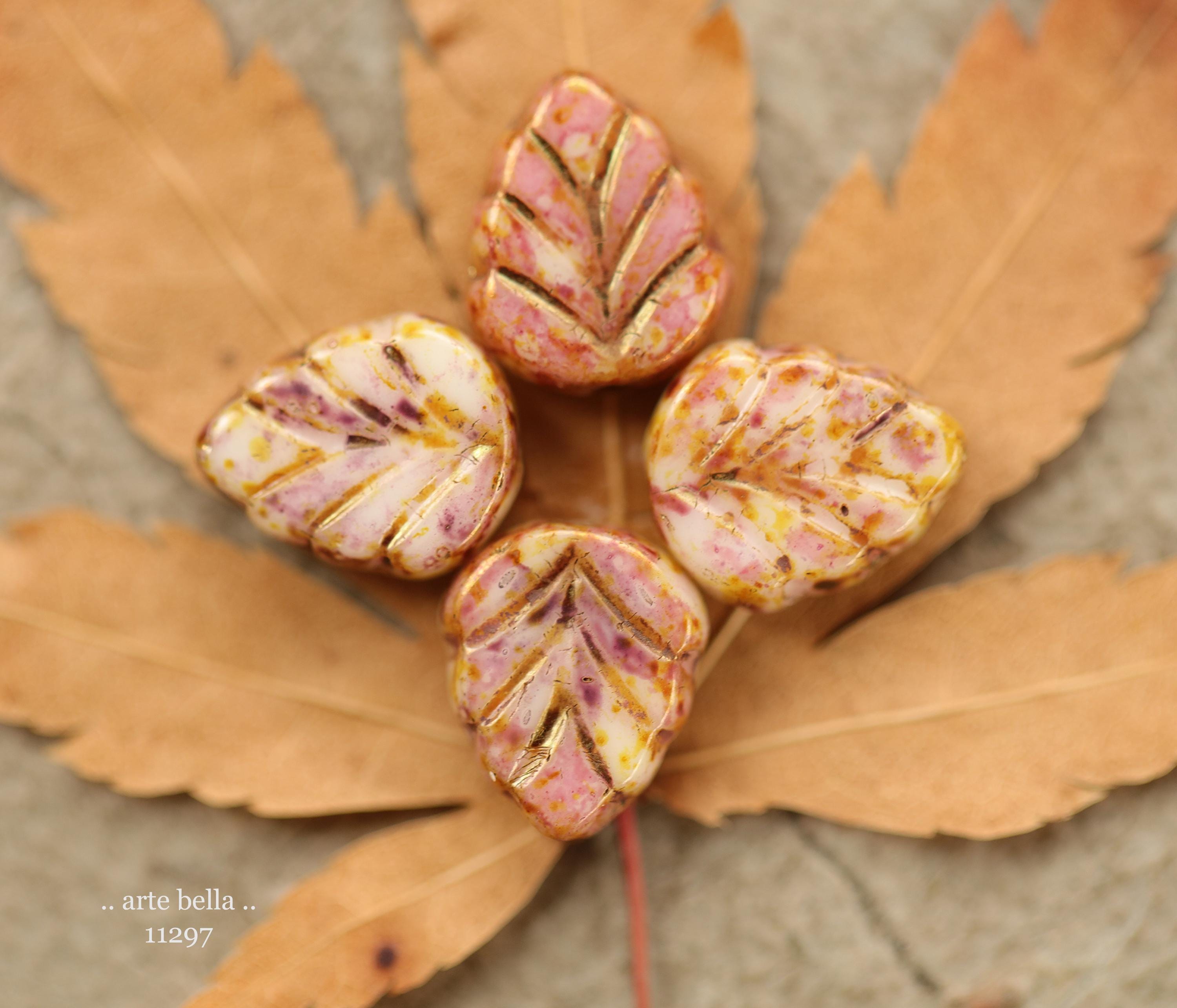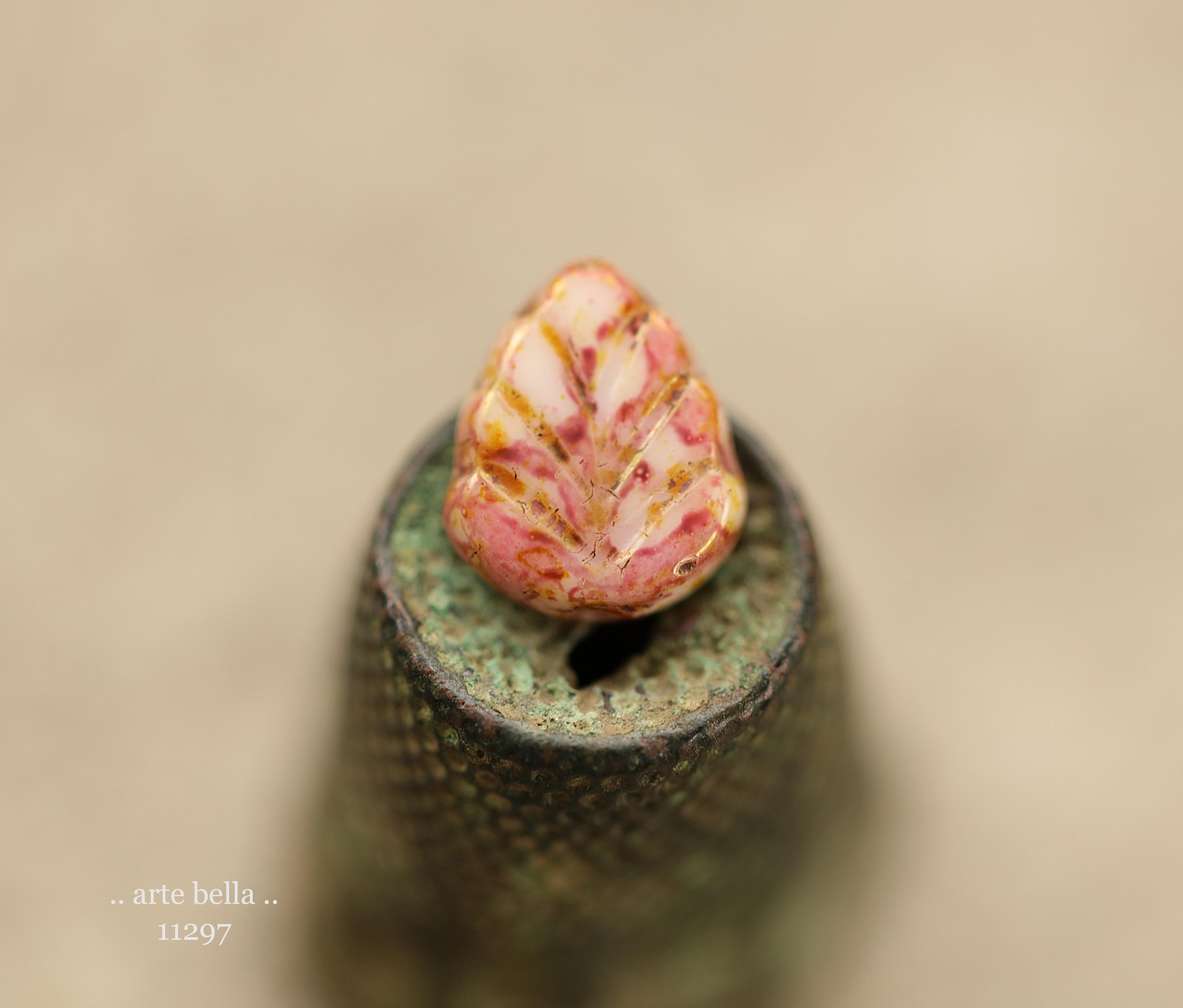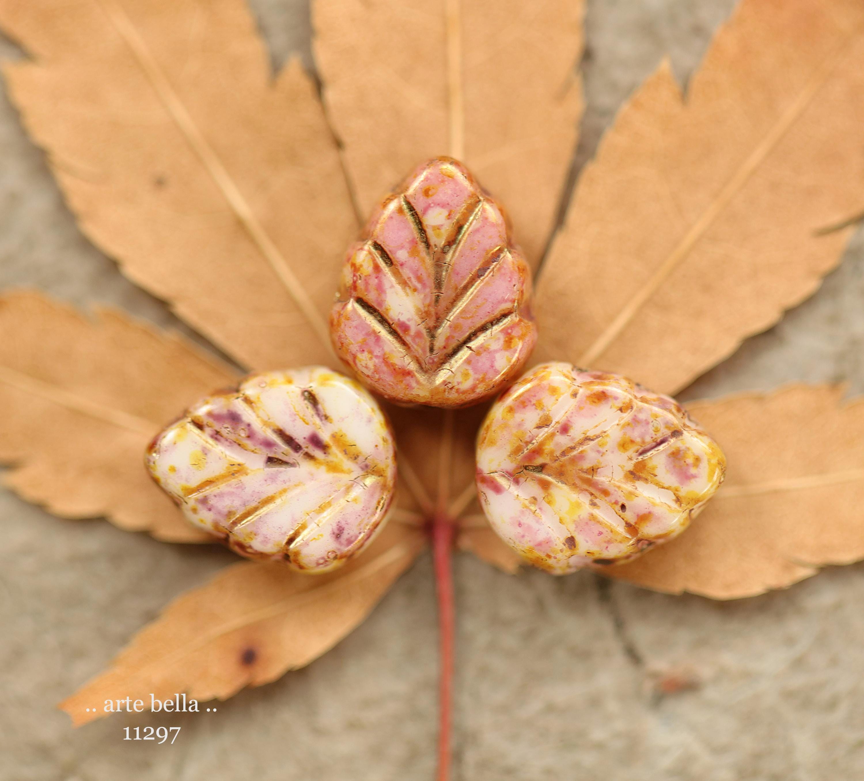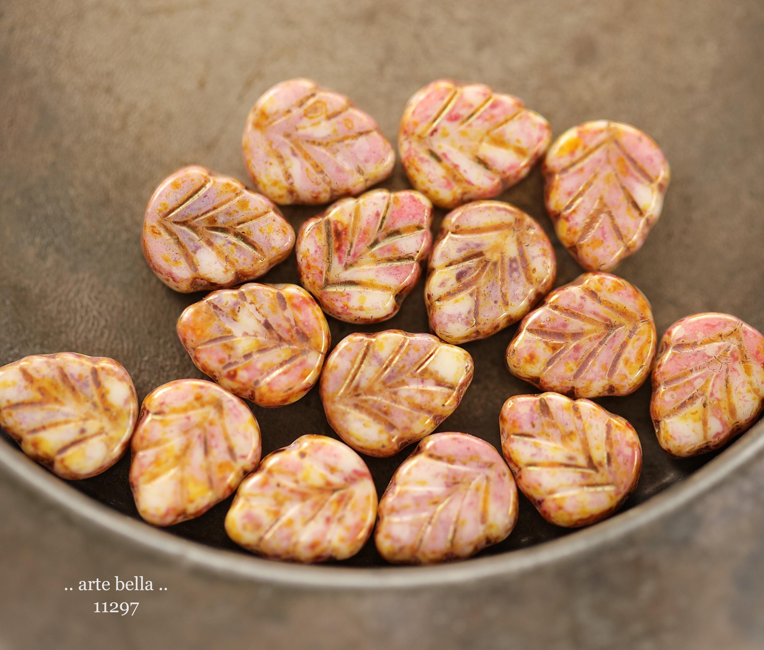 New .. RASPBERRY CREAM LEAVES .. 10 Premium Picasso Czech Glass Petite Leaf Bead Mix 10x8mm (11297-10) .. jewelry making supplies