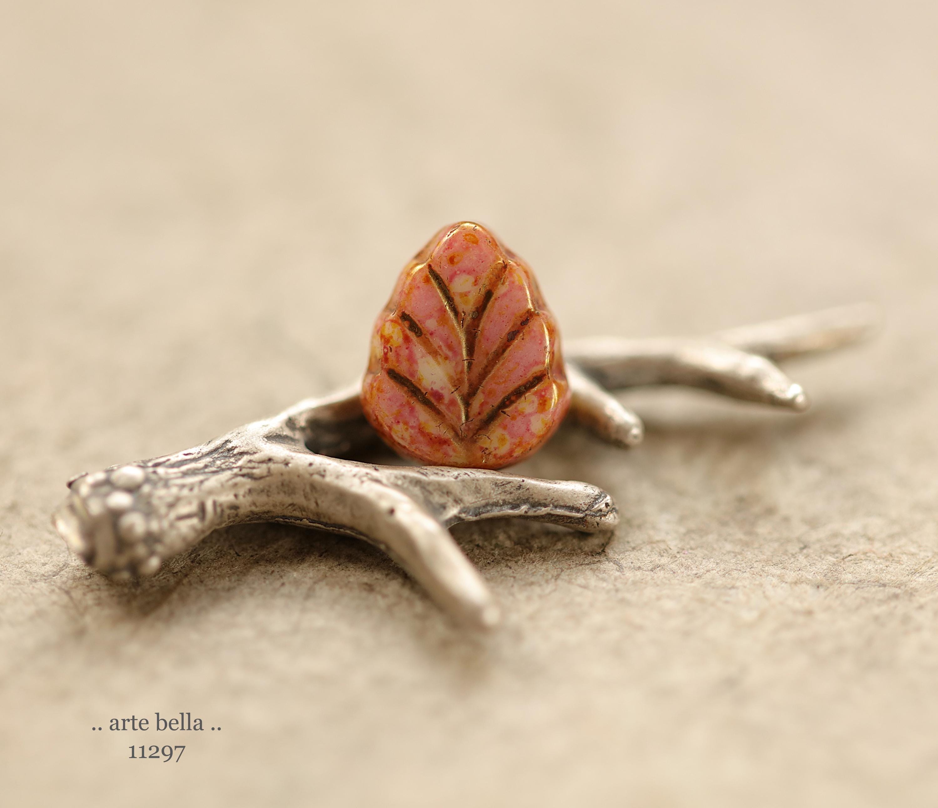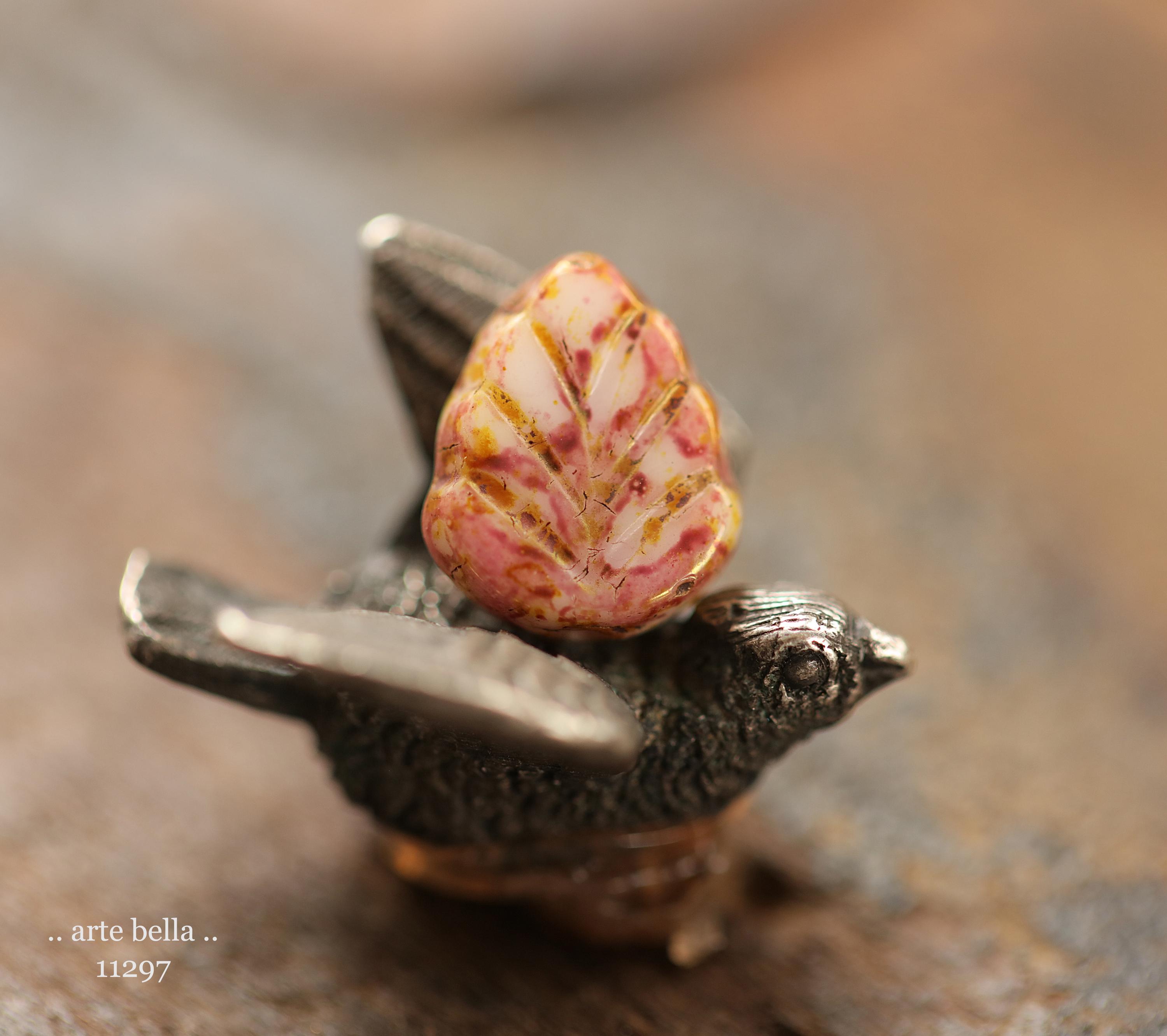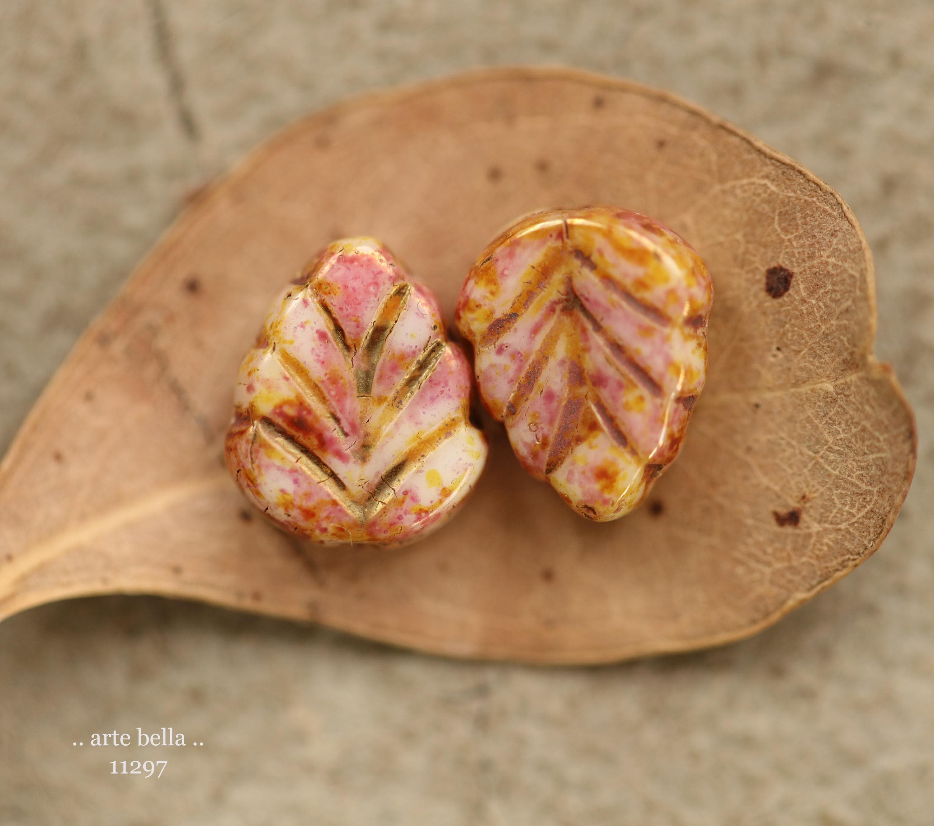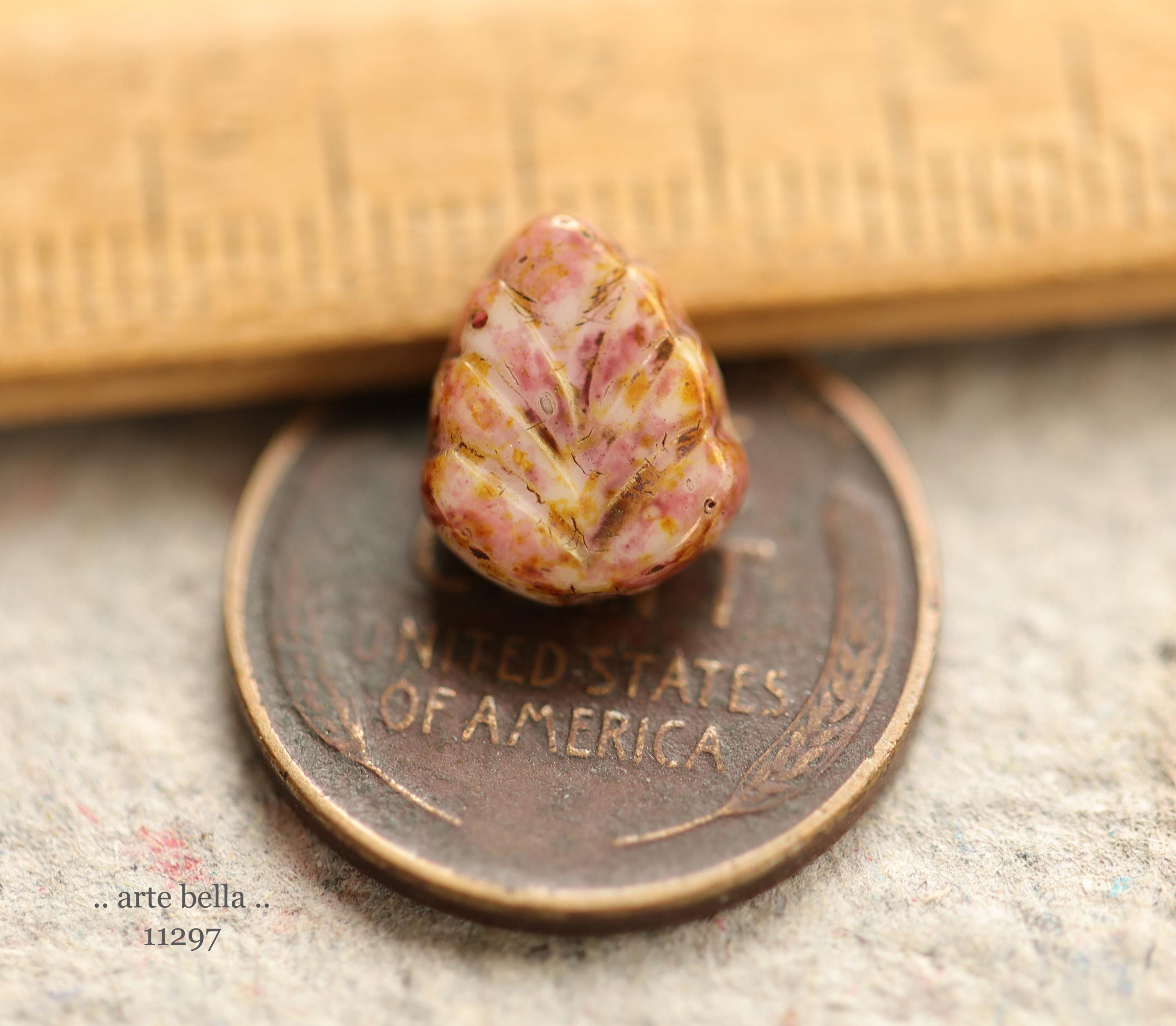 New .. RASPBERRY CREAM LEAVES .. 10 Premium Picasso Czech Glass Petite Leaf Bead Mix 10x8mm (11297-10) .. jewelry making supplies