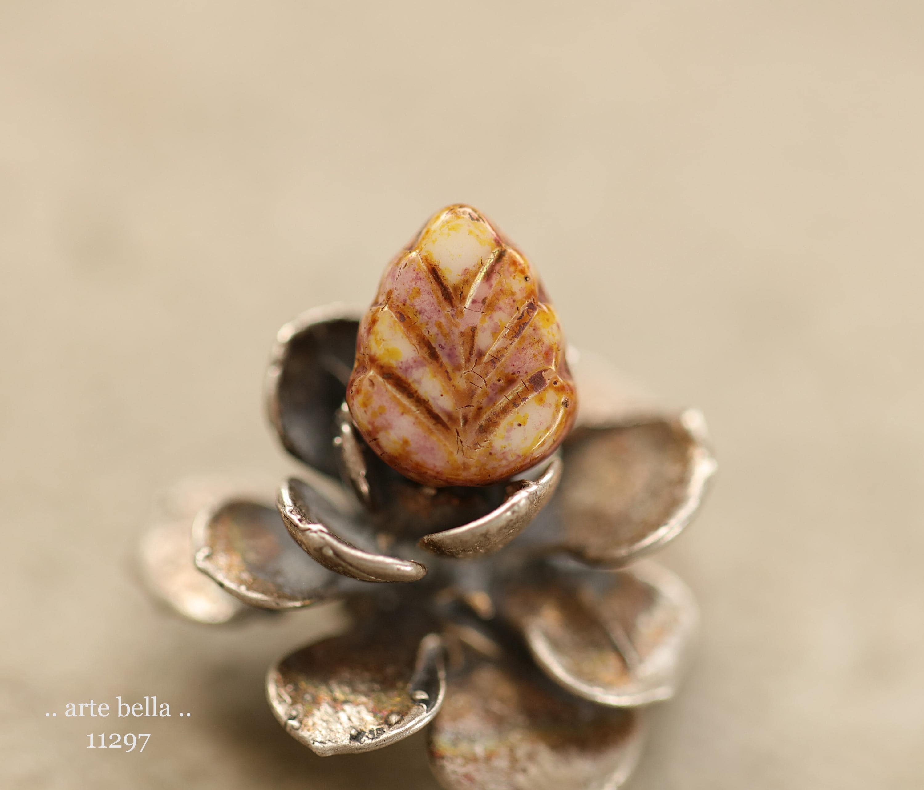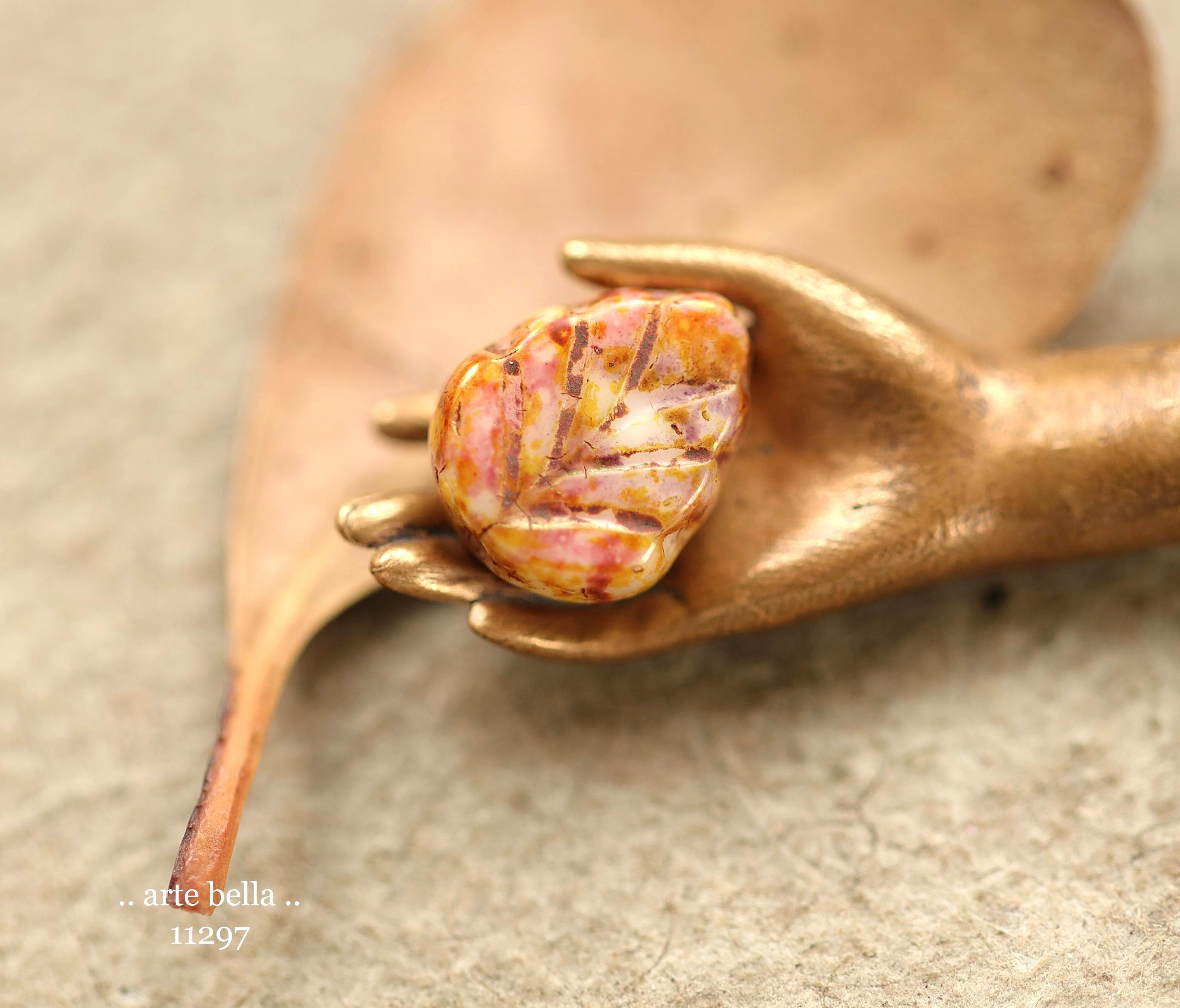 Pretty petite leaves in opaque cream glass with a mottled pink and amber luster Picasso finish. **As seen in my pictures, these vary greatly. You will receive 10 random beads.**