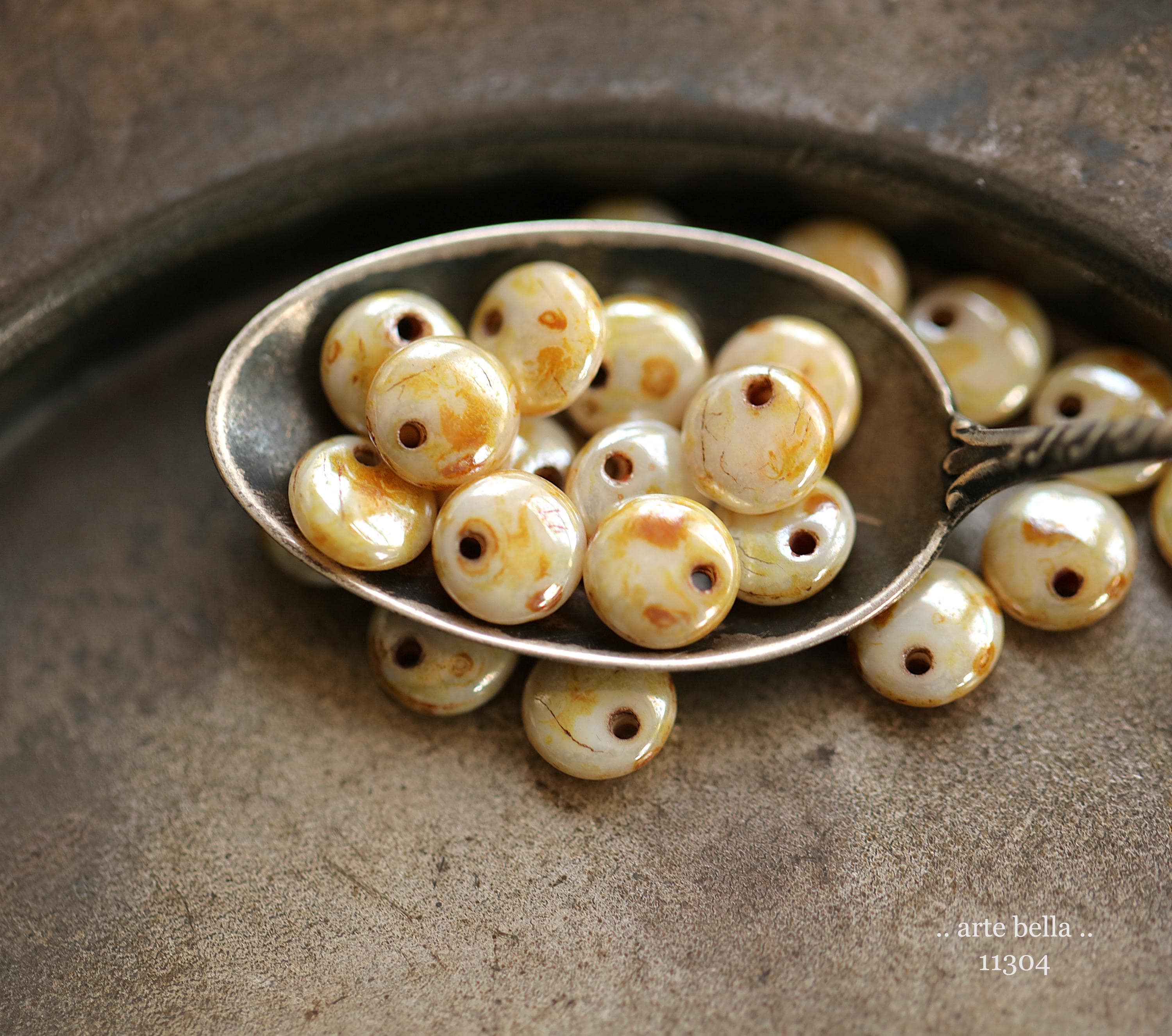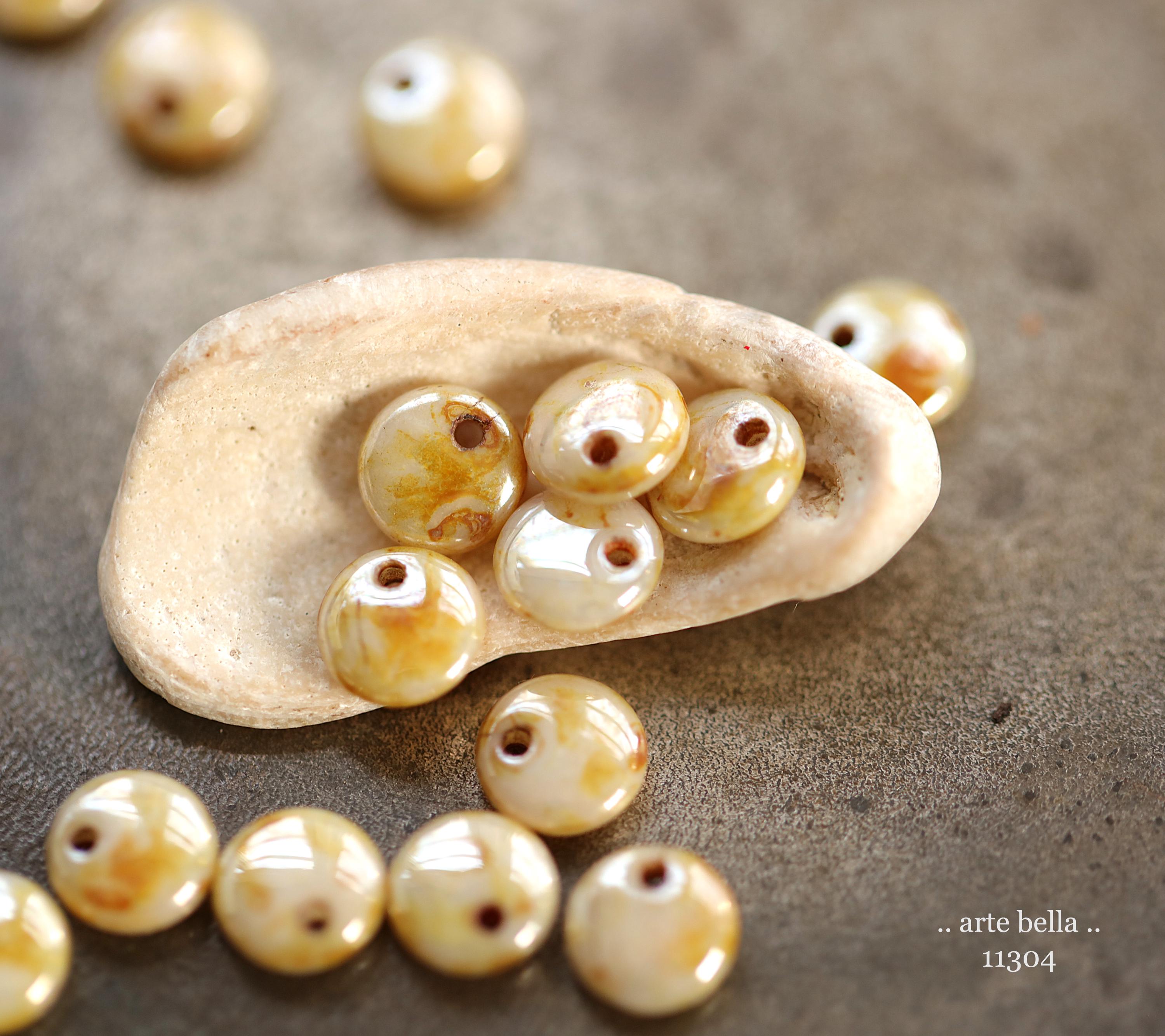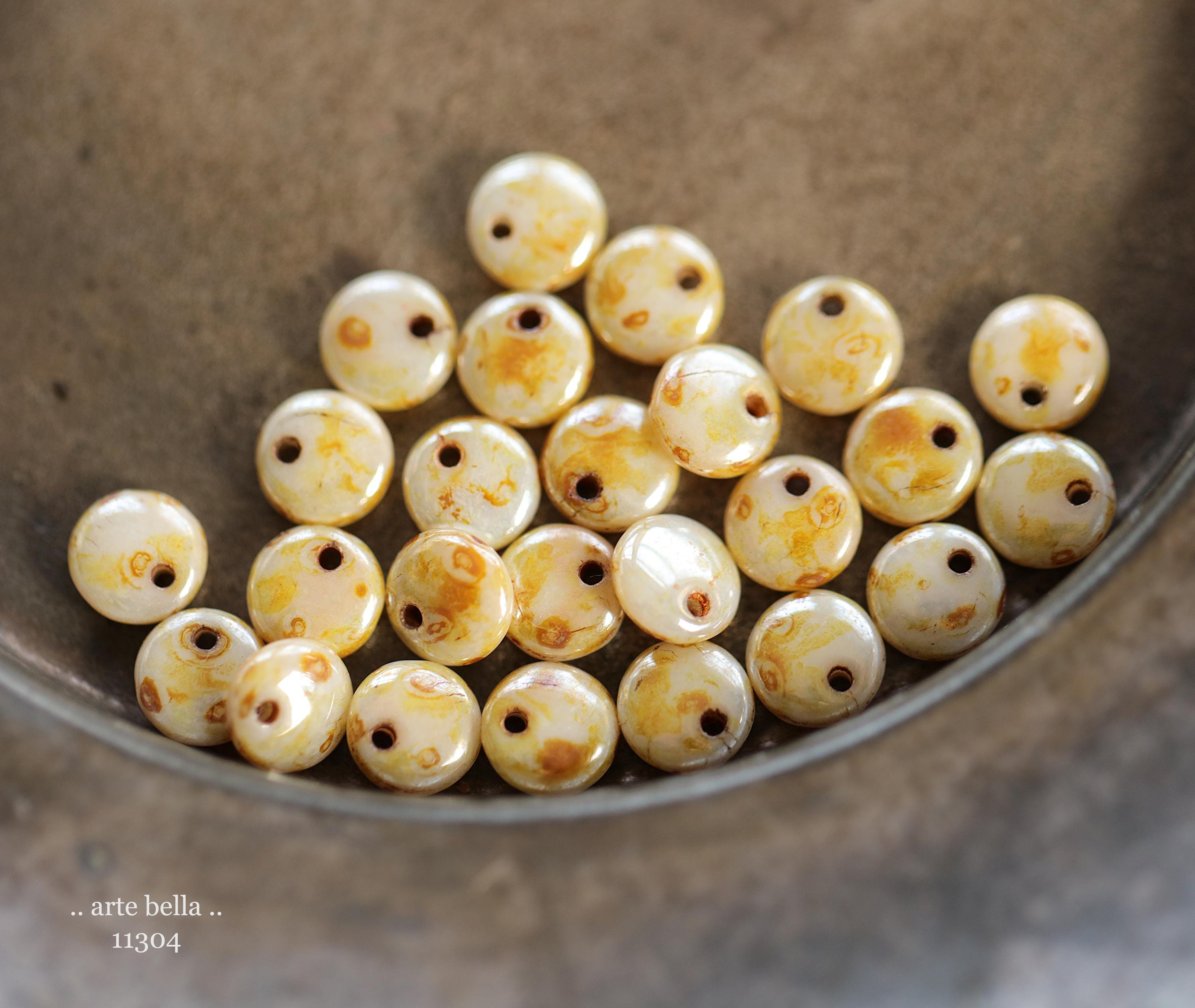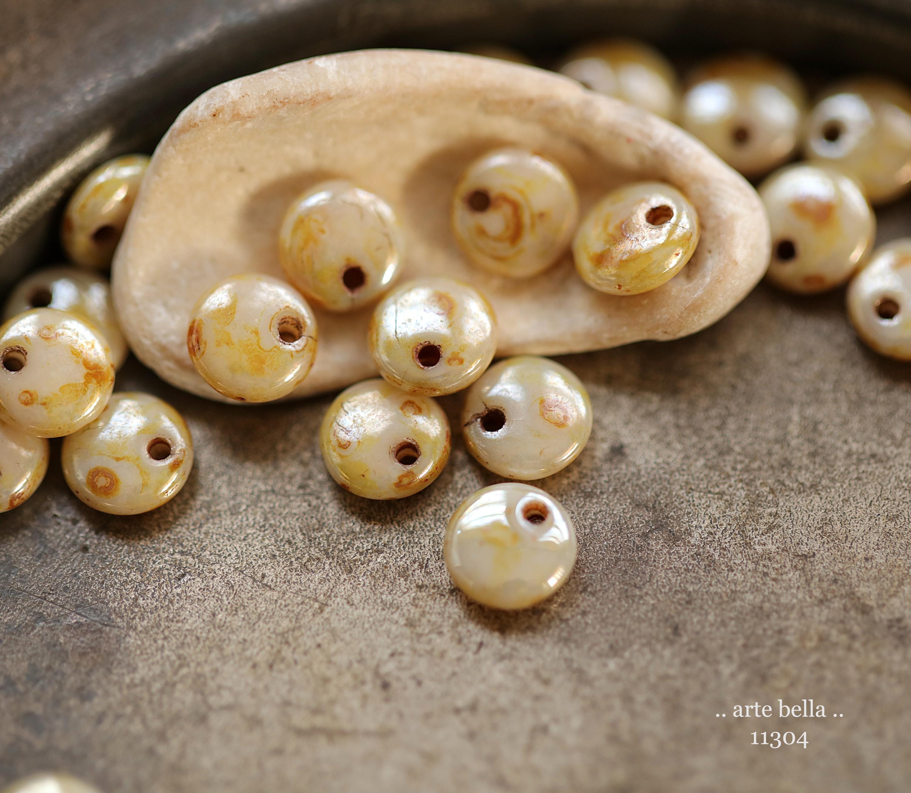 New .. CREME BRULE' DOTS .. 25 Premium Luster Picasso Czech Glass Lentil Beads 6mm (11304-25) .. jewelry supplies