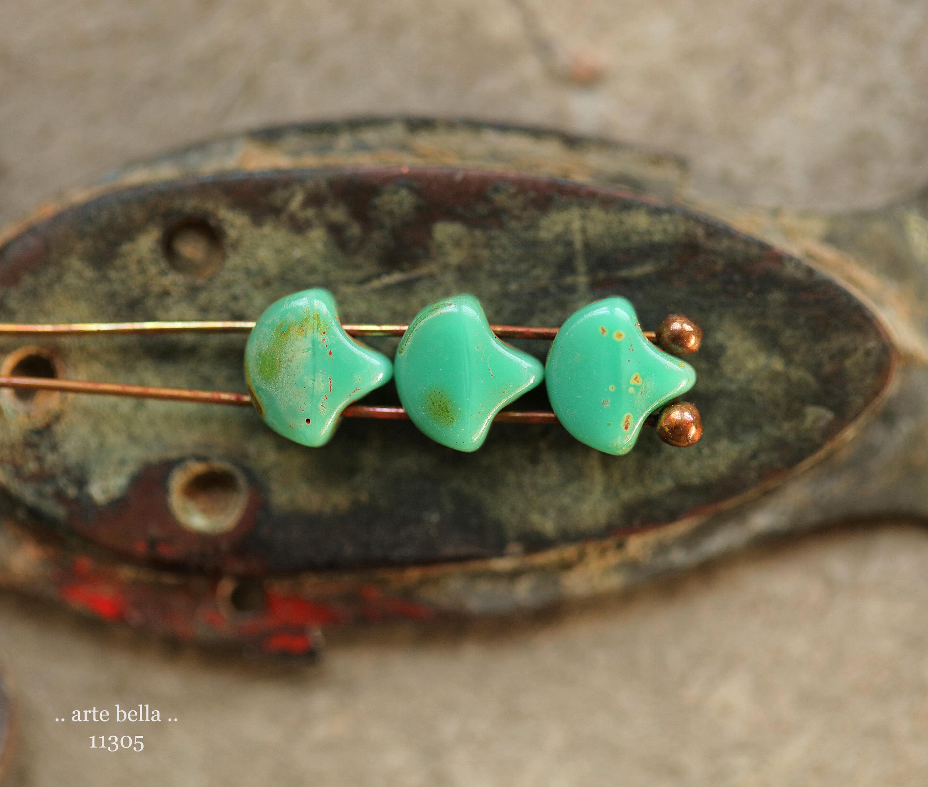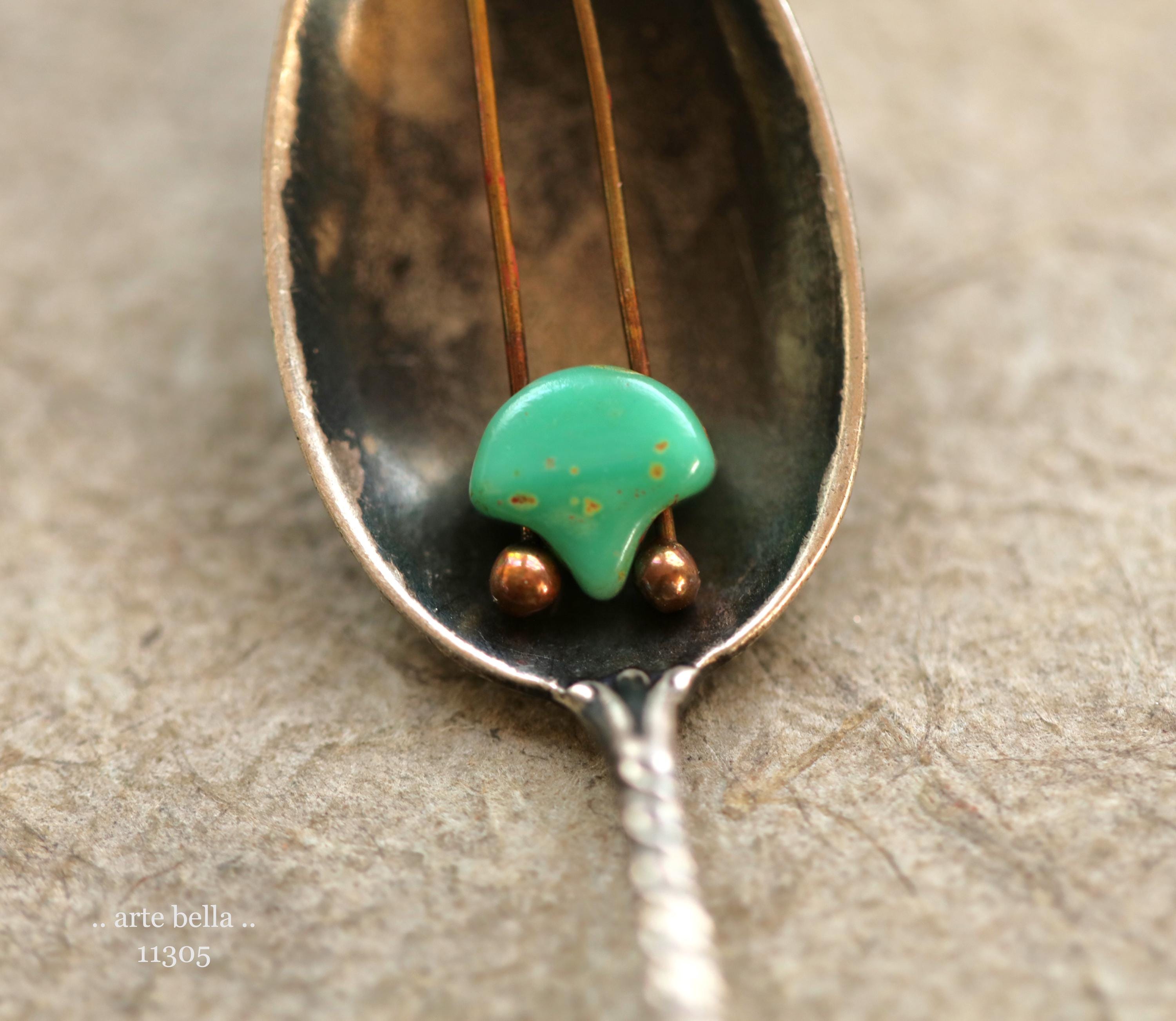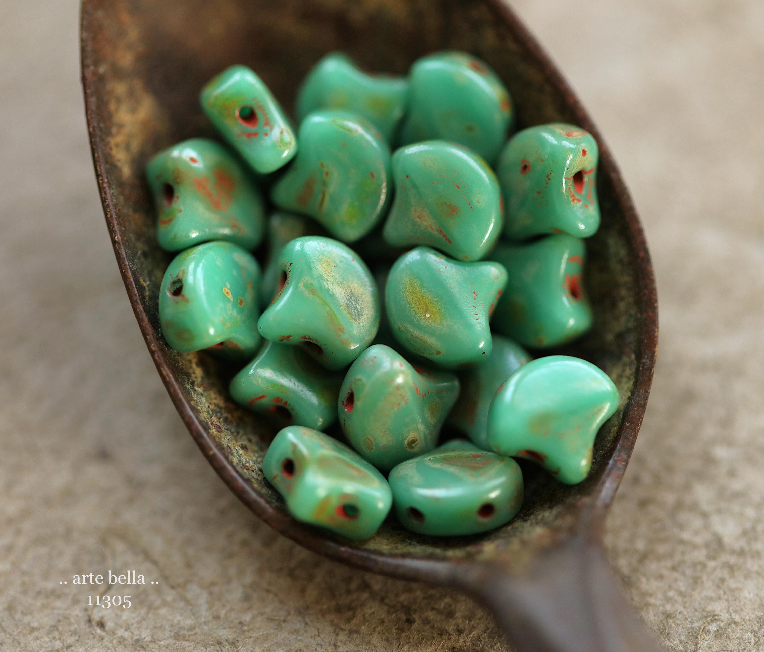 Opaque turquoise glass with an earthy Picasso finish. **PLEASE NOTE: THESE HAVE 2 HOLES.** Great for bead weaving!