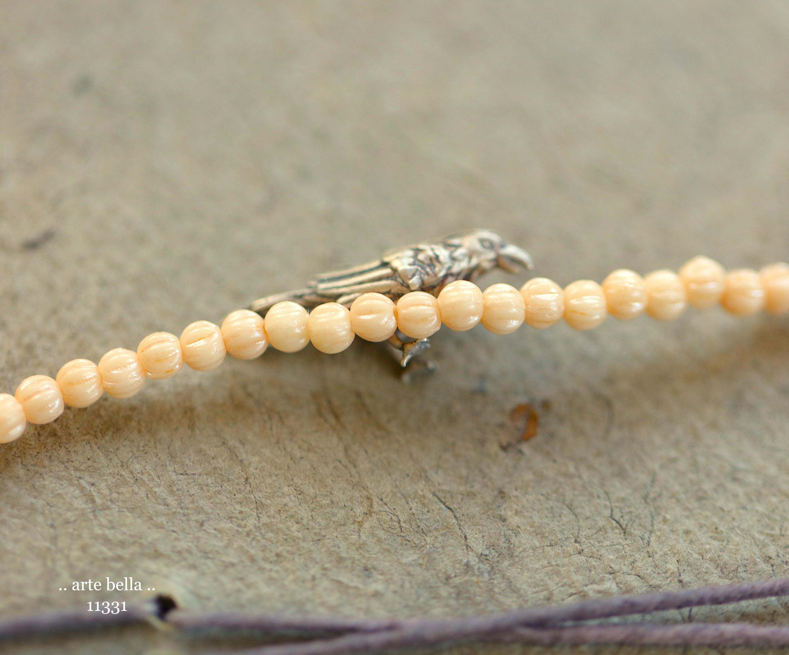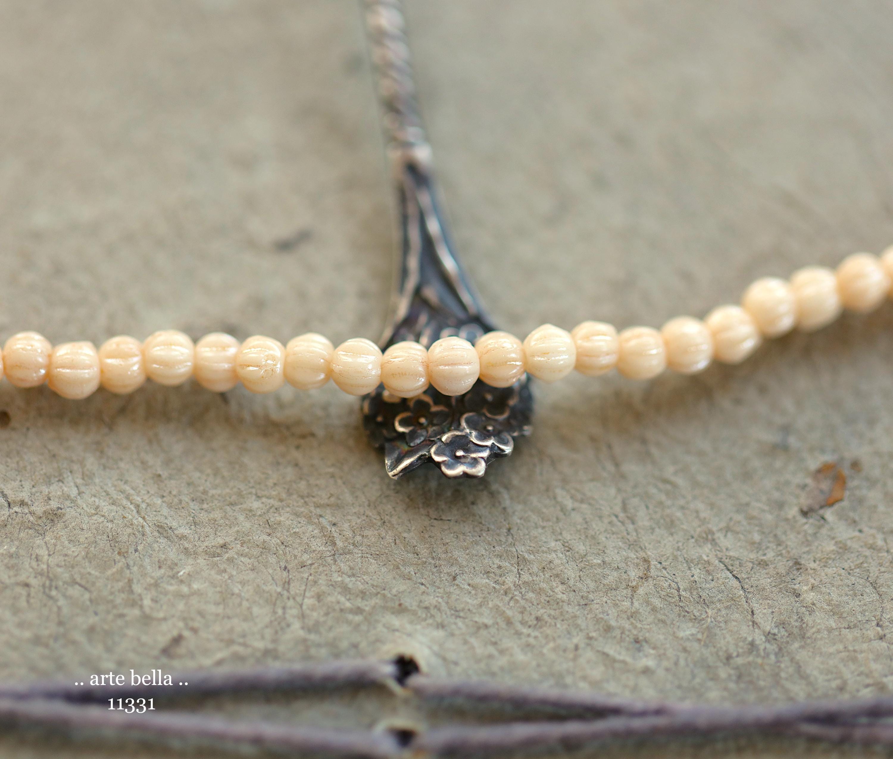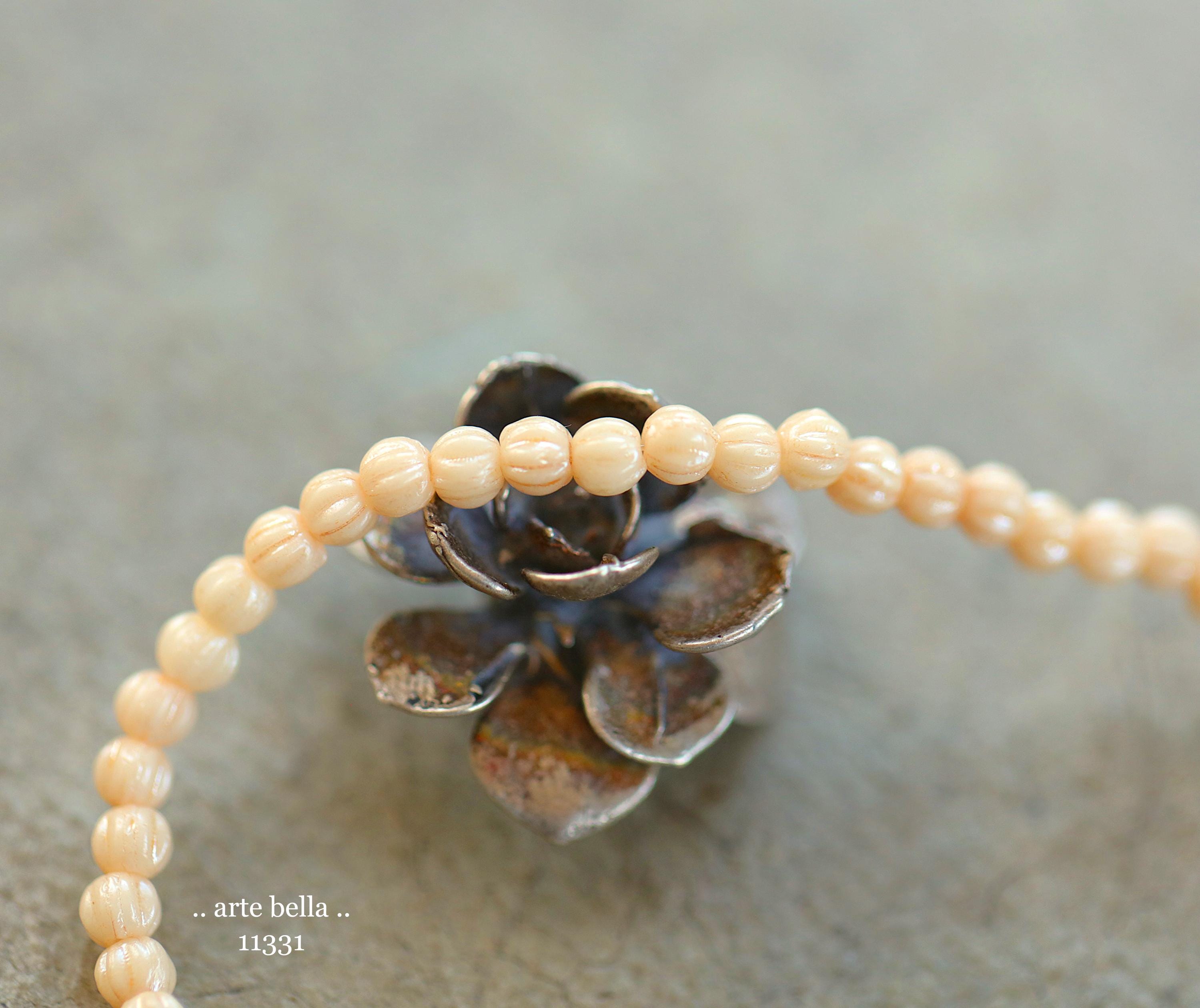 Cute itty bitty melon beads in opaque creamy ivory glass with a silver metallic luster finish.