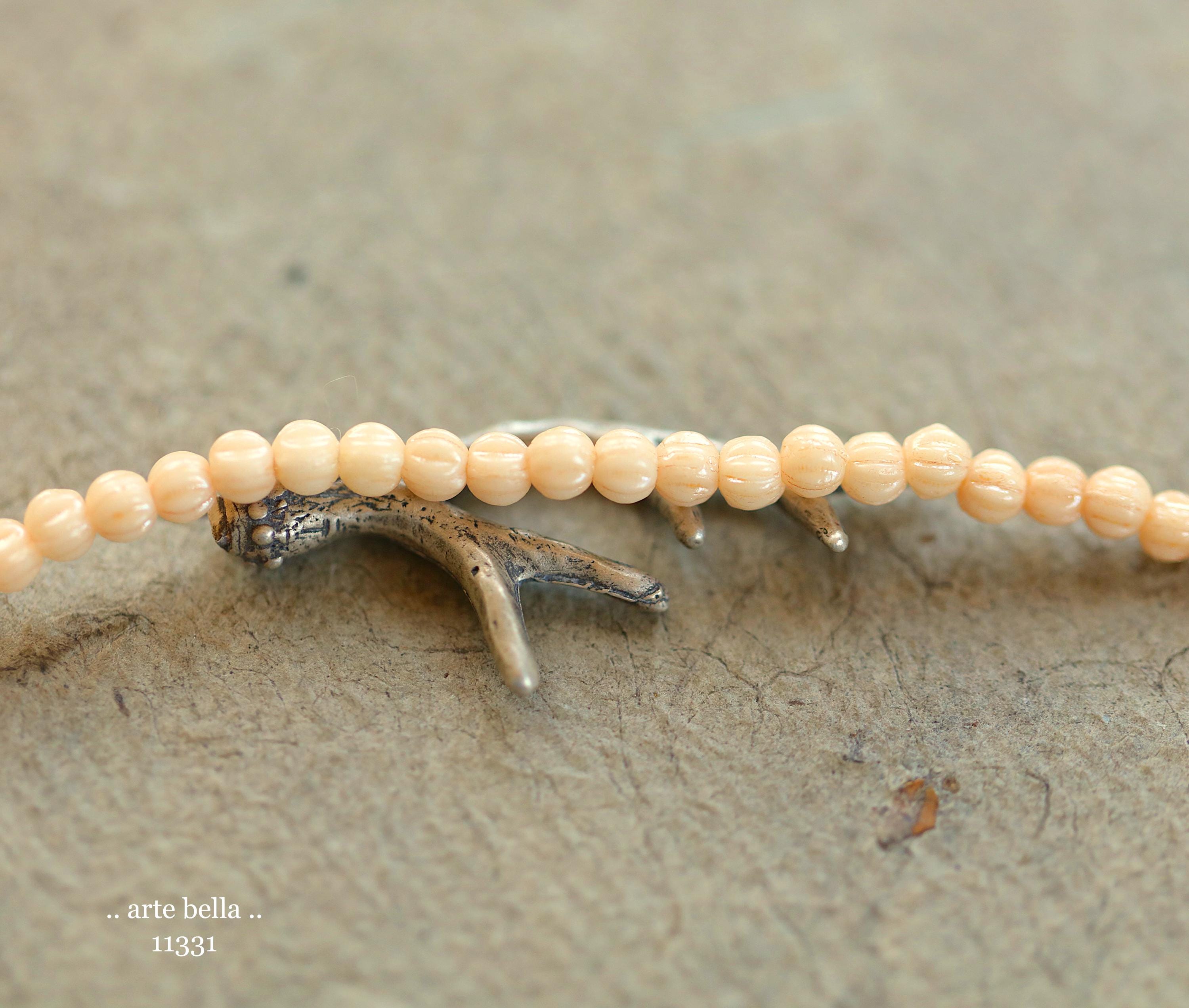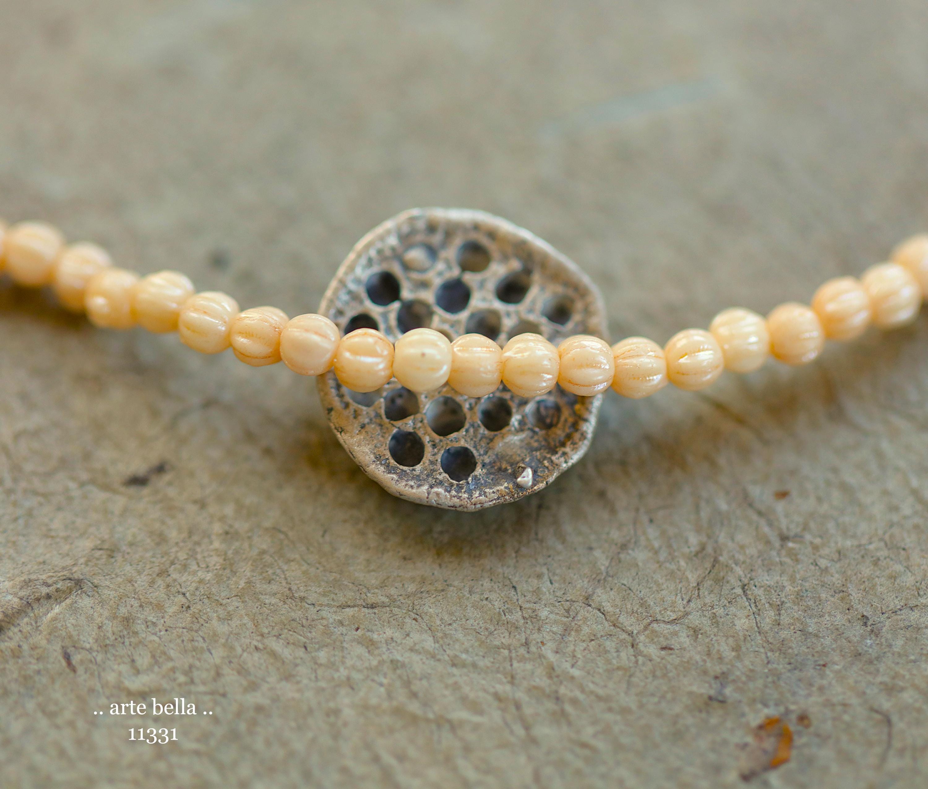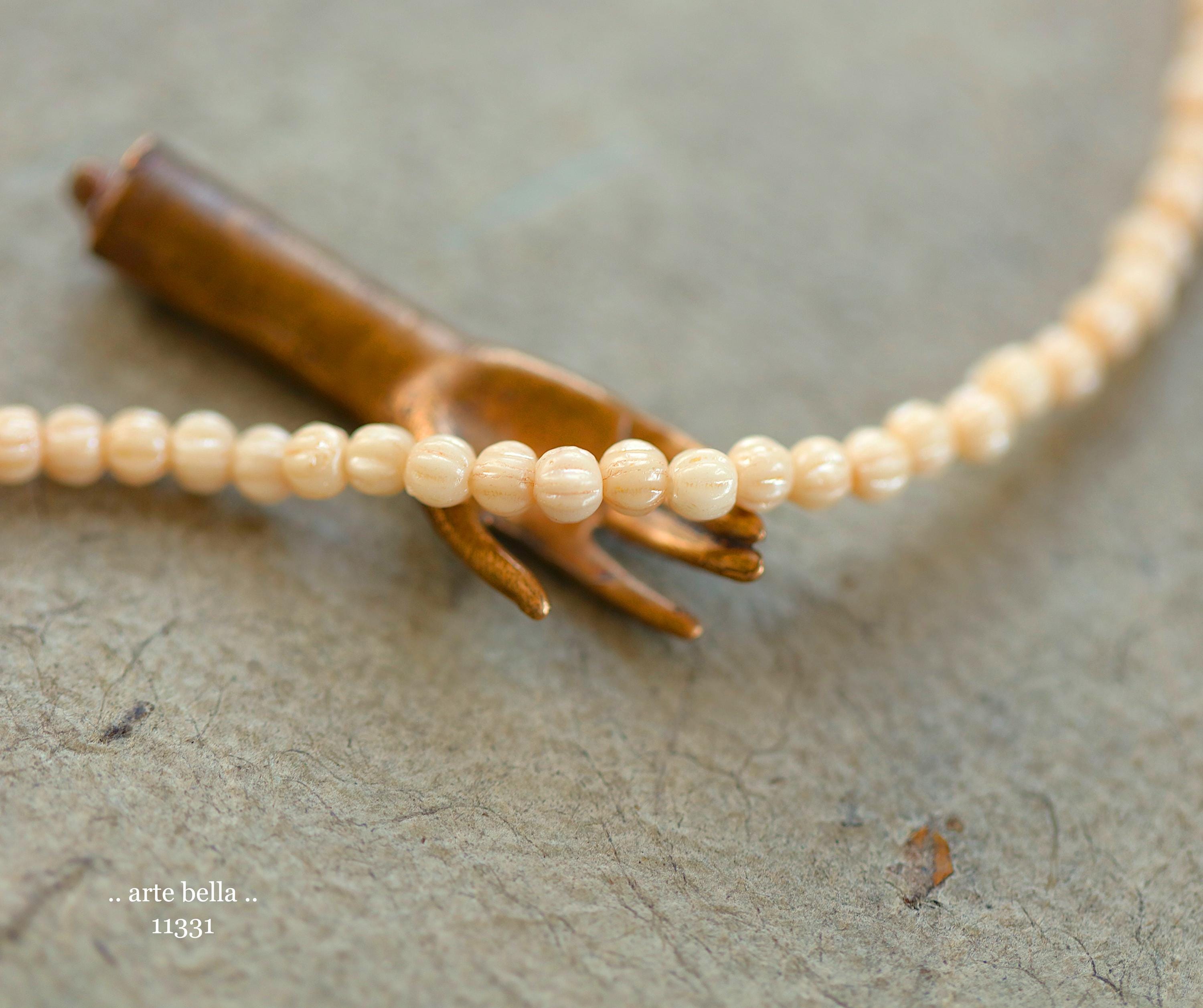 Cute itty bitty melon beads in opaque creamy ivory glass with a silver metallic luster finish.