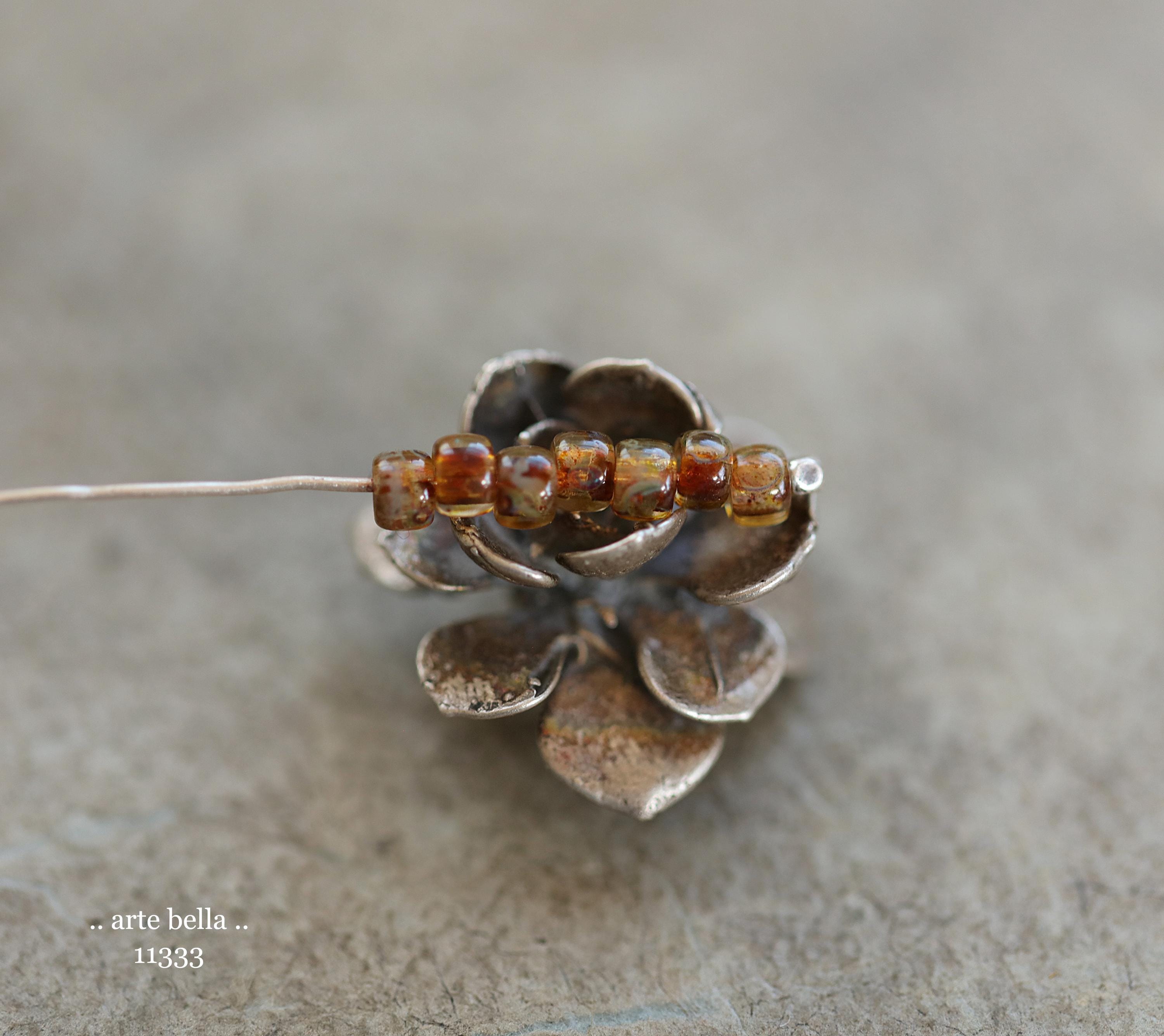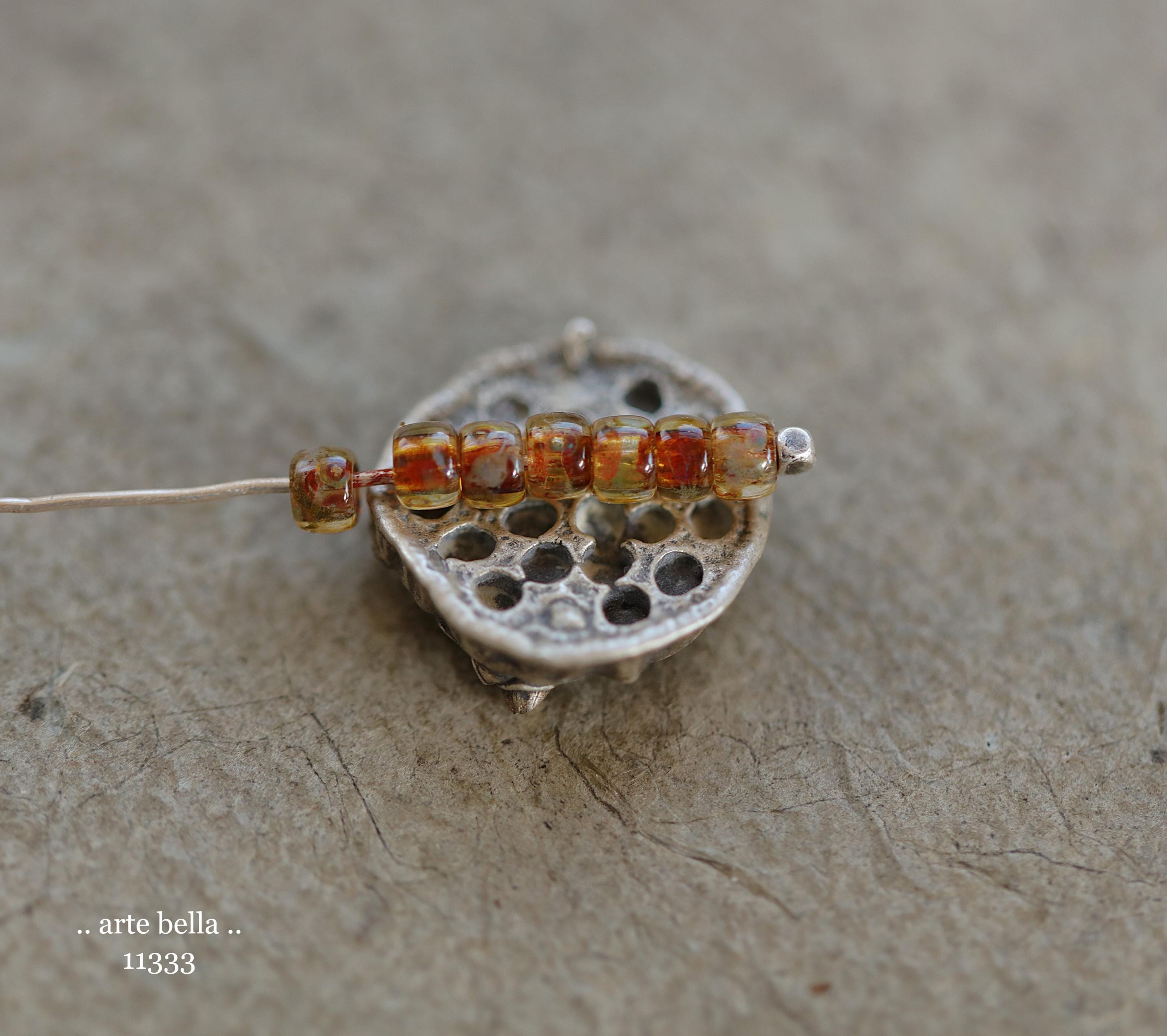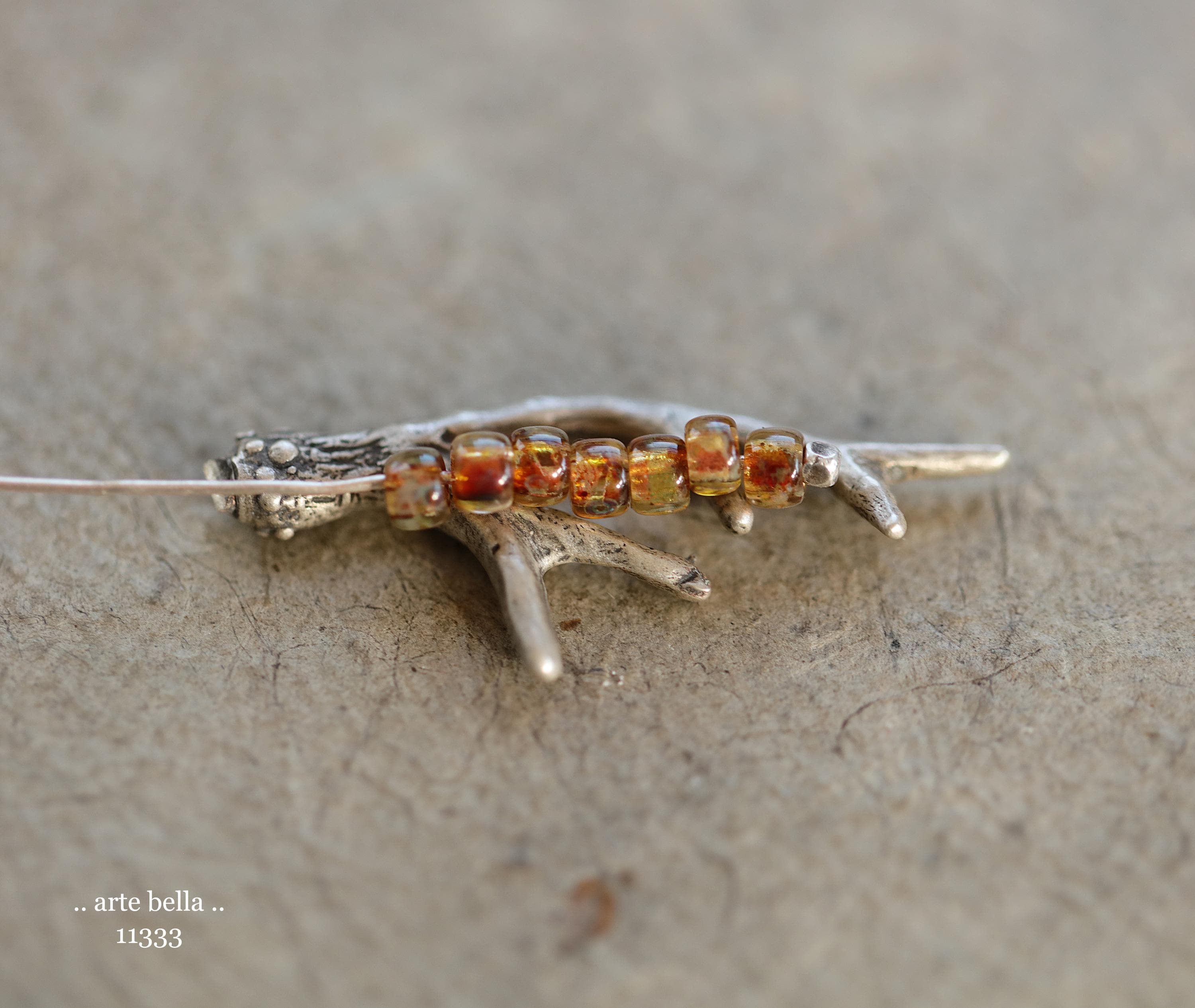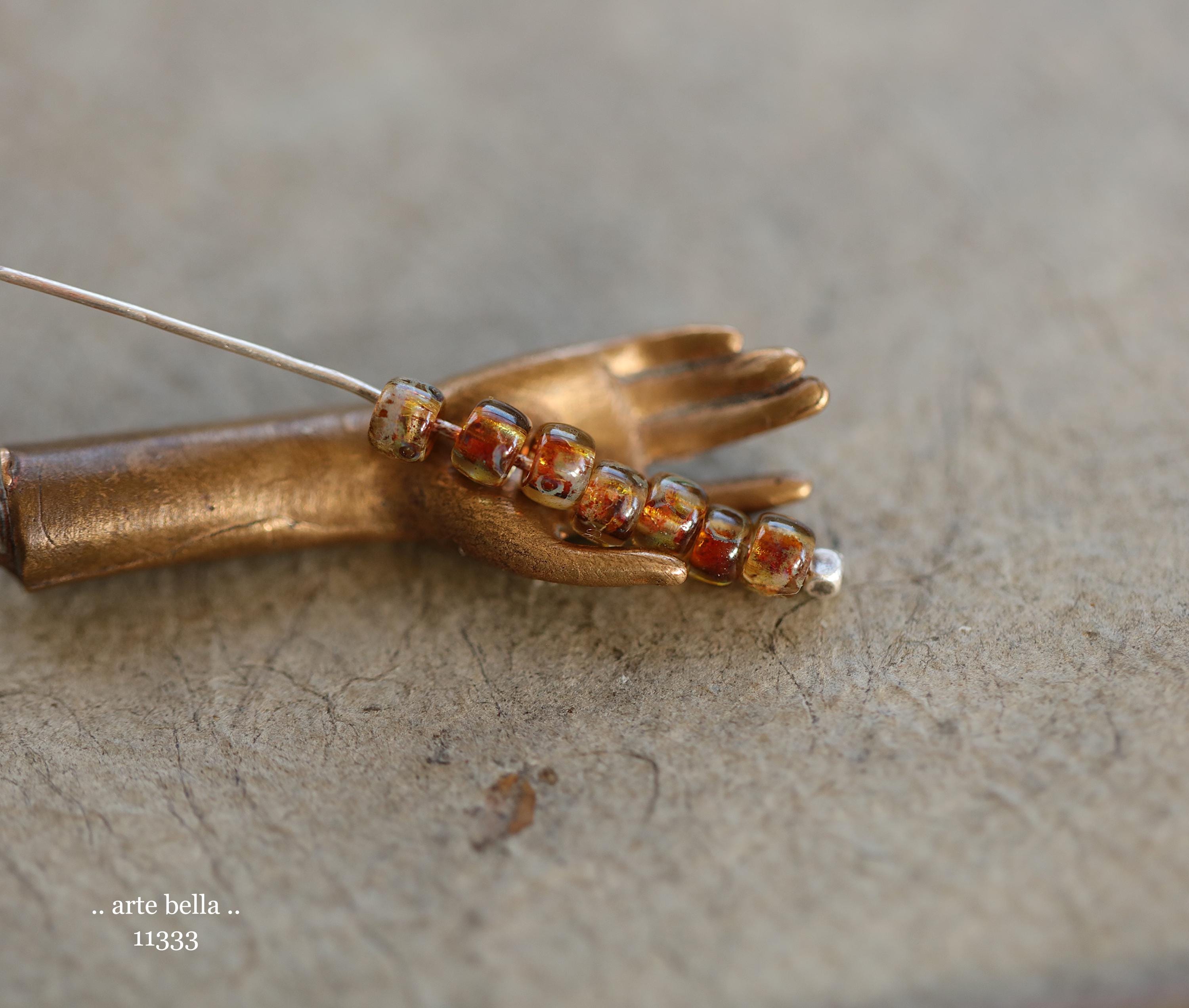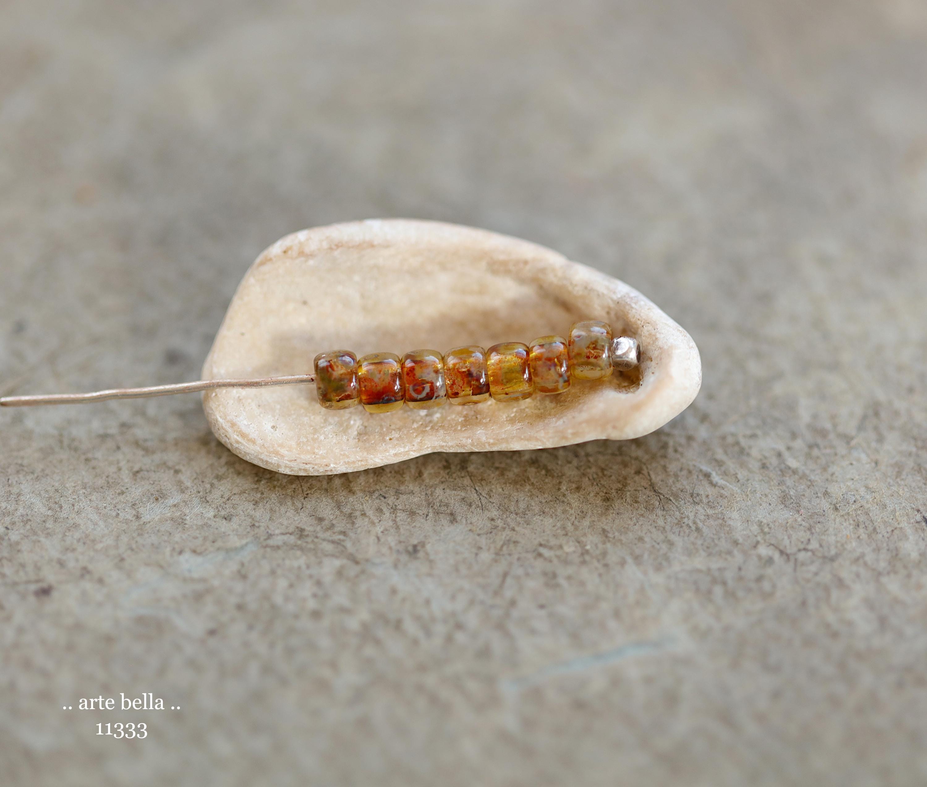 Tiny, petite little pretties .. clear glass coated in an earthy Picasso encasing a gorgeous "heart" of rust remaining in the bead hole. **PLEASE NOTE: The rust colored buffing compound that is used for final polishing has settled into the bead holes and can come off onto stringing material. I did experiment and the best solution I came up with was to string them onto a scrap piece of leather and/or twine to remove the residue before stringing onto your material of choice. I have used them with wire, customers have as well, with no problems. Sorry, this is part of the making process of some beads and is beyond my control.**
