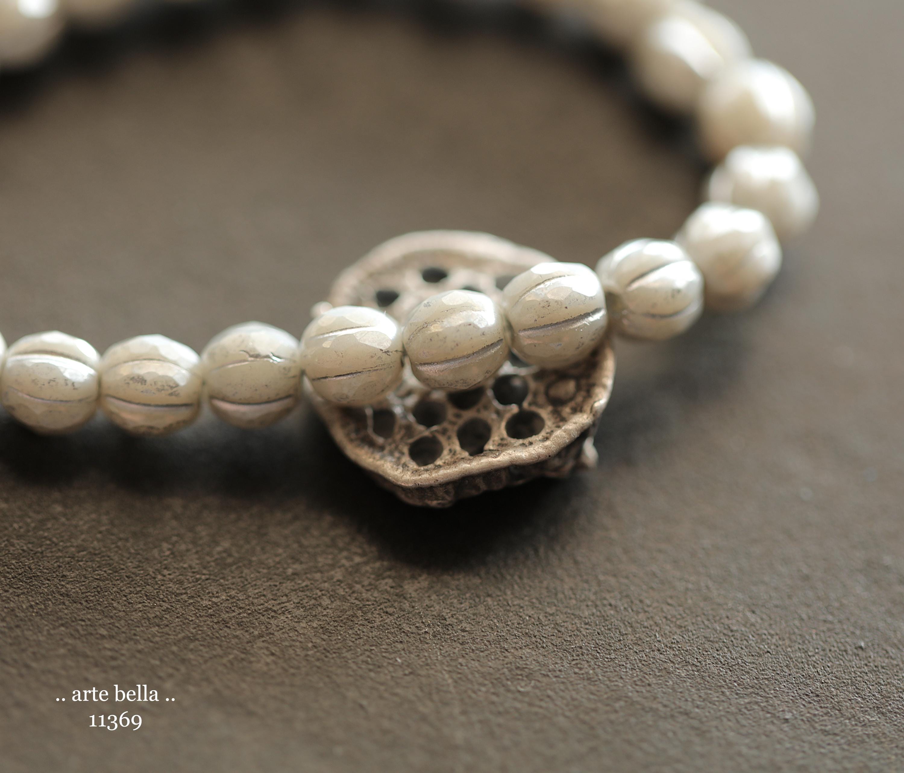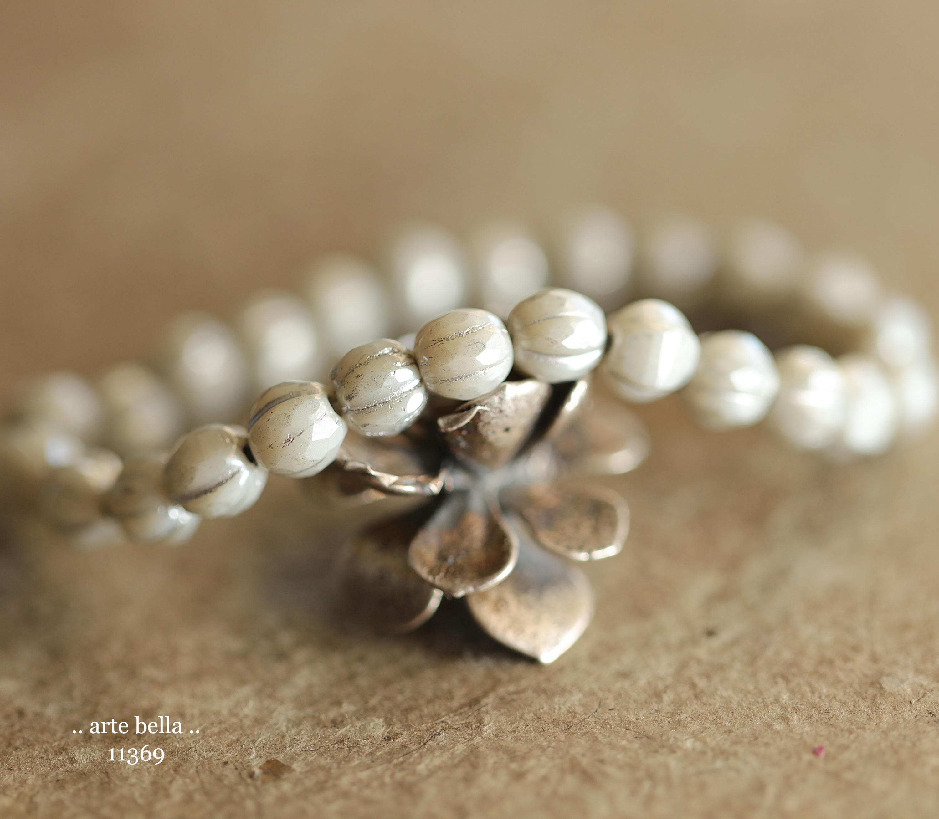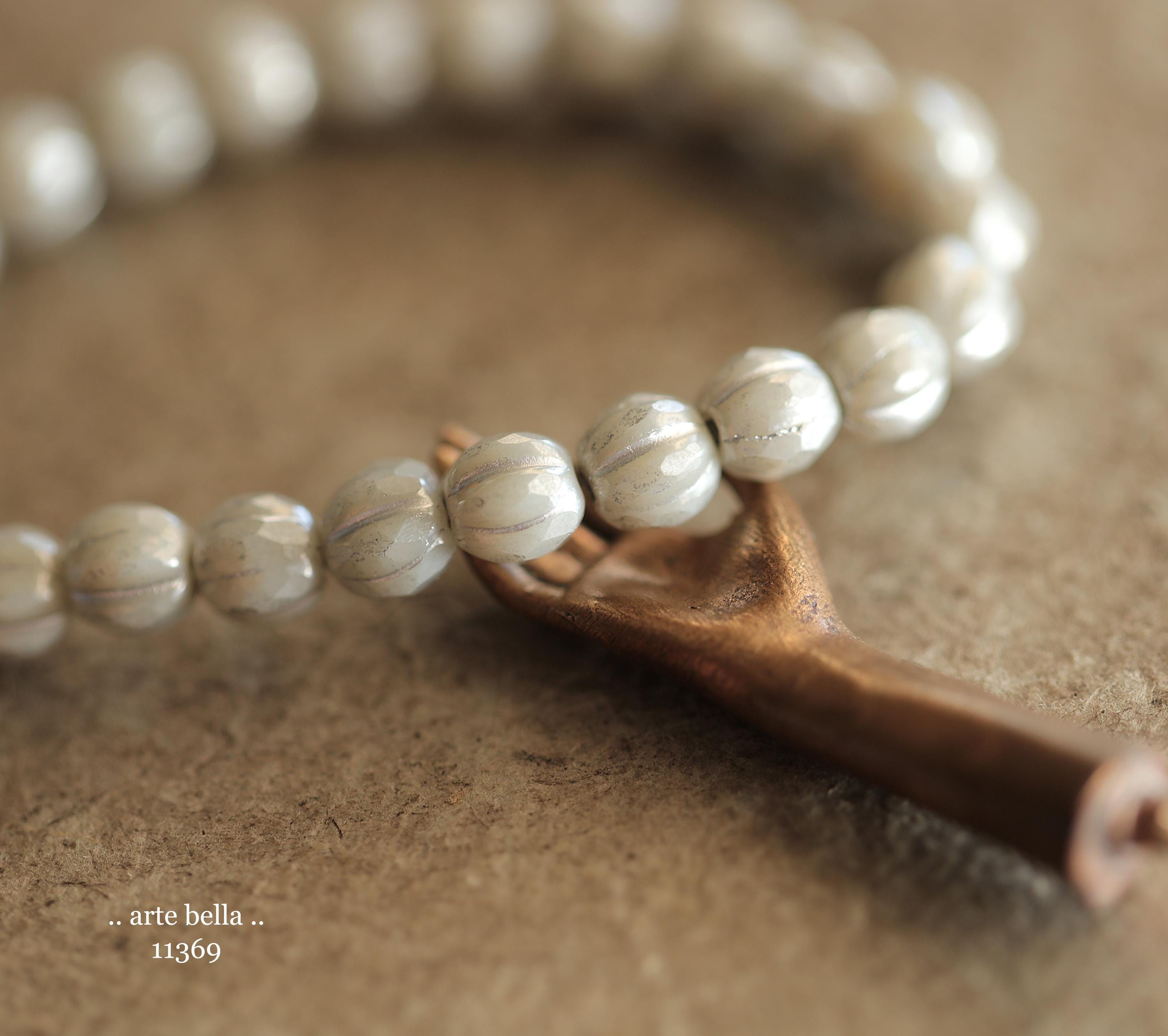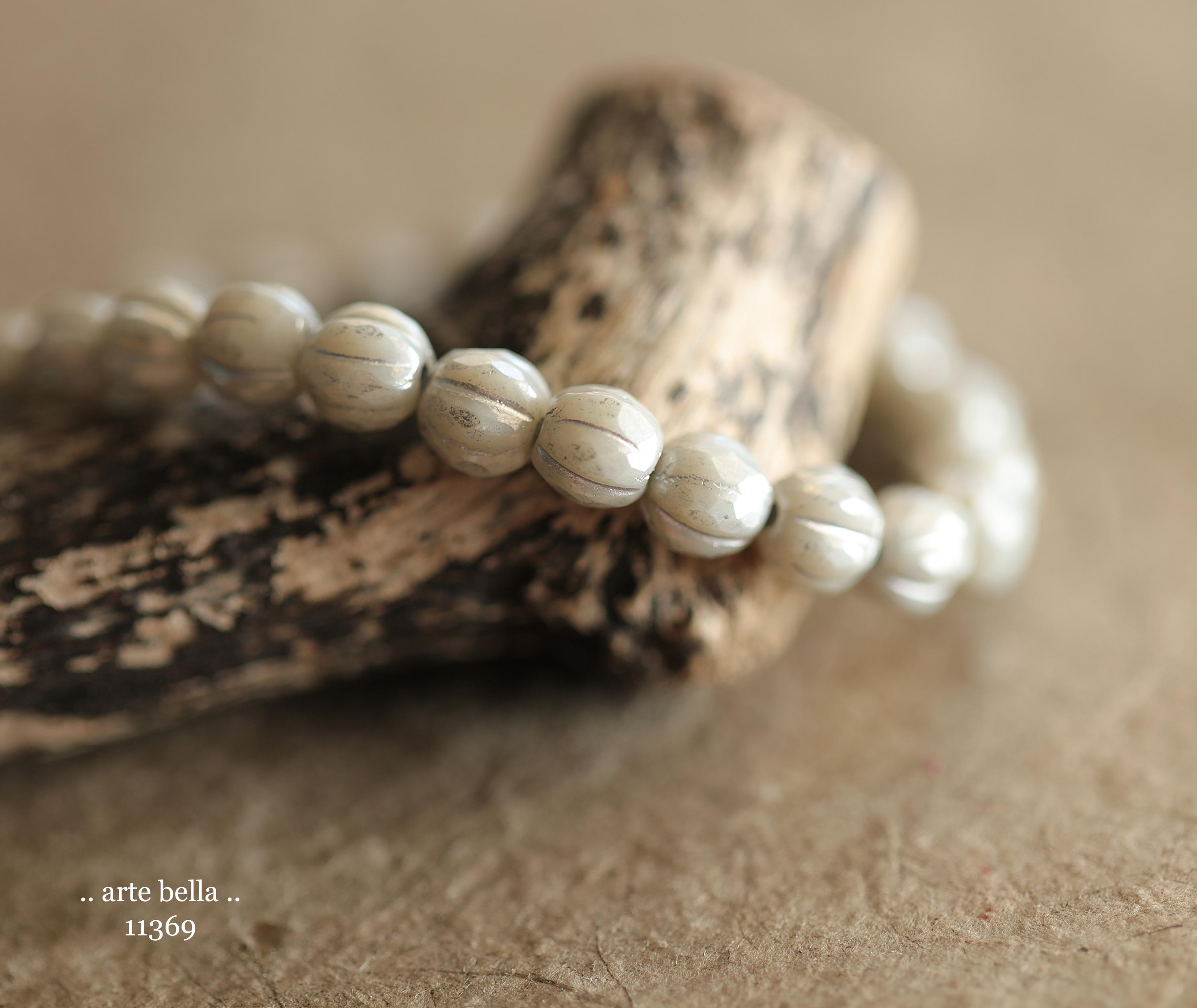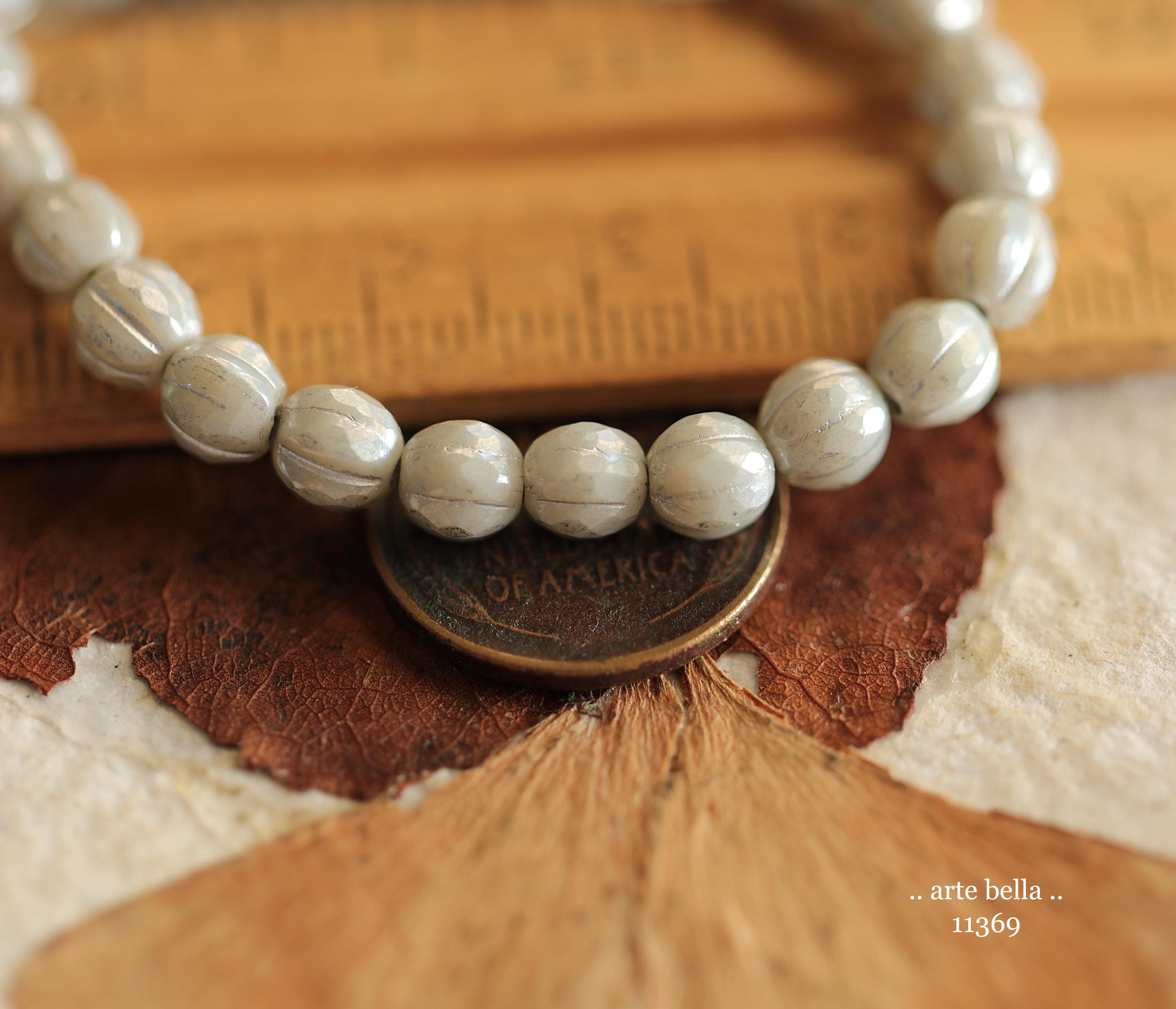 Gorgeous faceted melon beads in light gray opaque glass with a silver luster finish and silver metallic wash. PLEASE NOTE: These are not perfectly manufactured beads .. they are hand faceted and are not perfectly round as seen in my pictures. These have a vintage vibe going on.