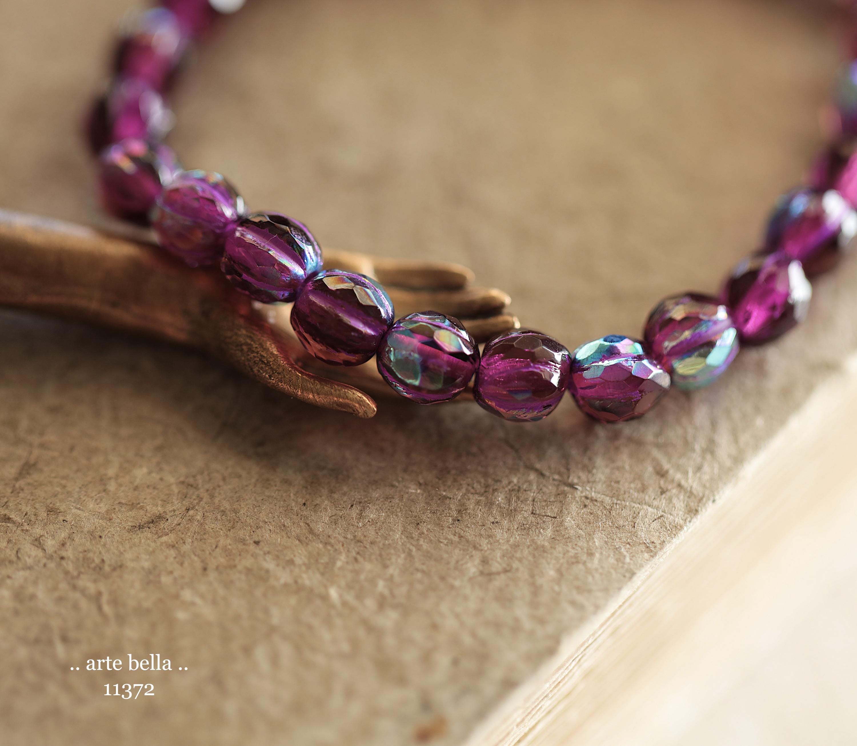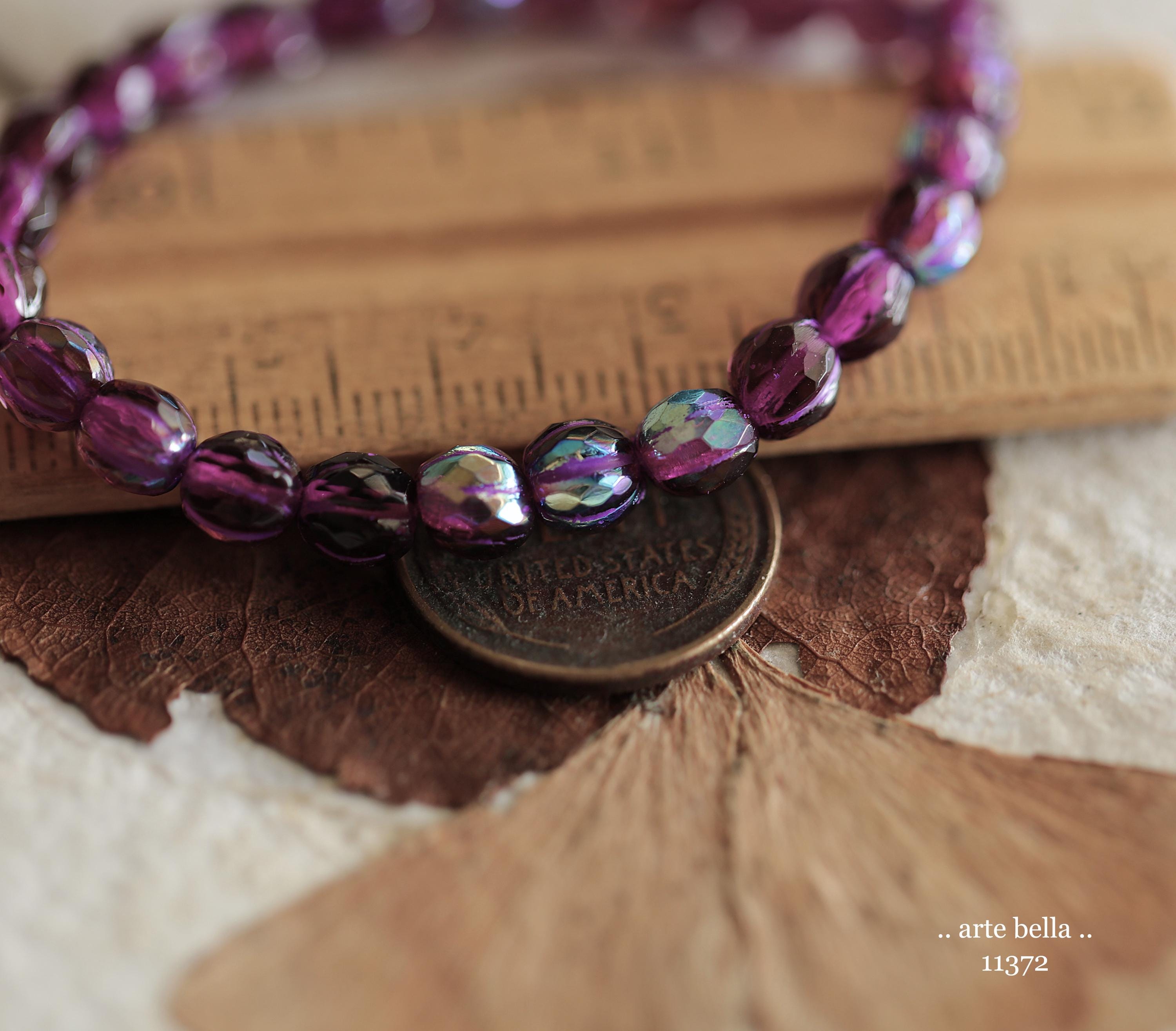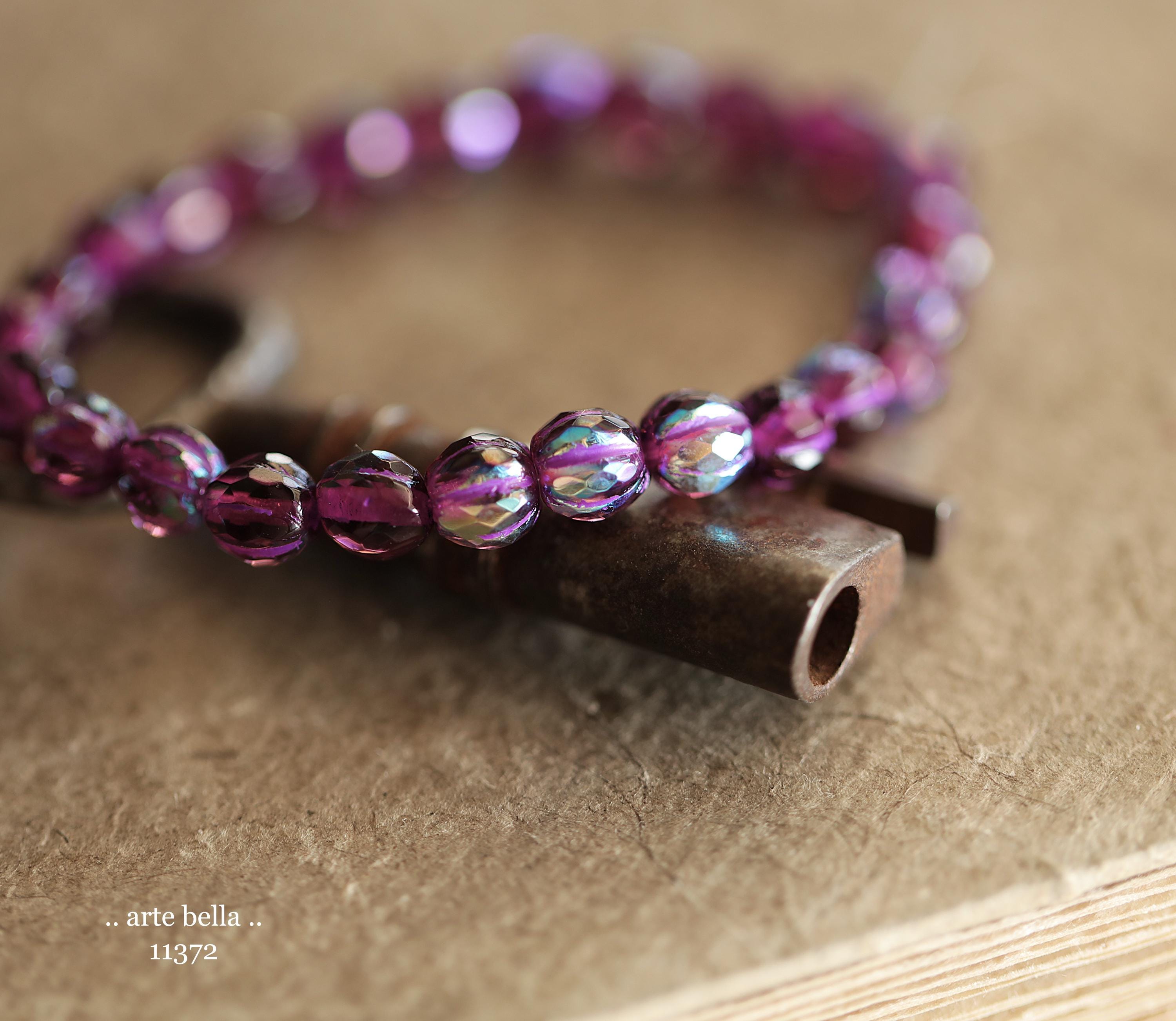 Gorgeous faceted melon beads in translucent pansy purple glass with a rainbow Aurora Borealis finish, purple wash and crisp fire polished facets. PLEASE NOTE: These are not perfectly manufactured beads .. they are hand faceted and are not perfectly round as seen in my pictures. These have a vintage vibe going on.