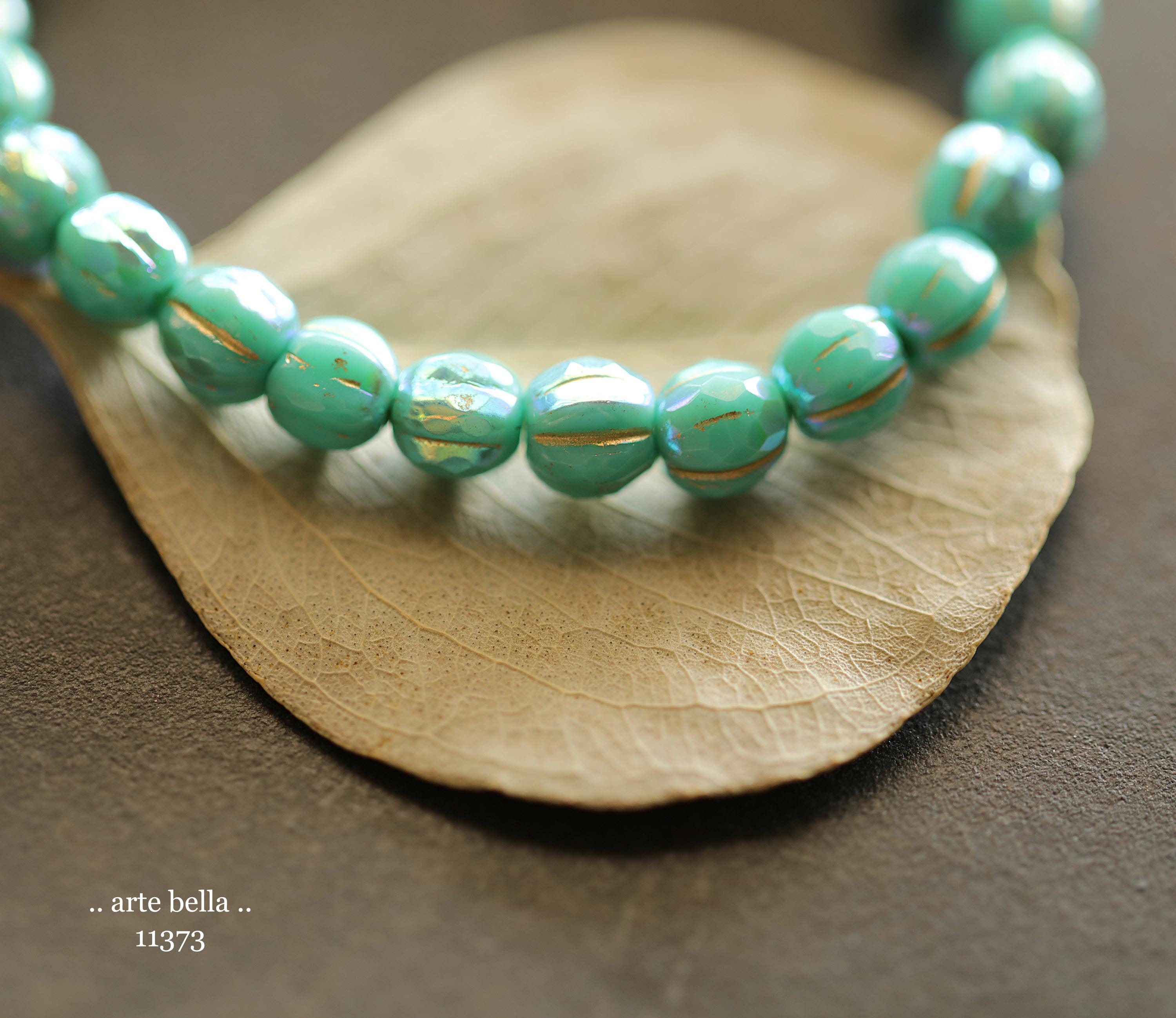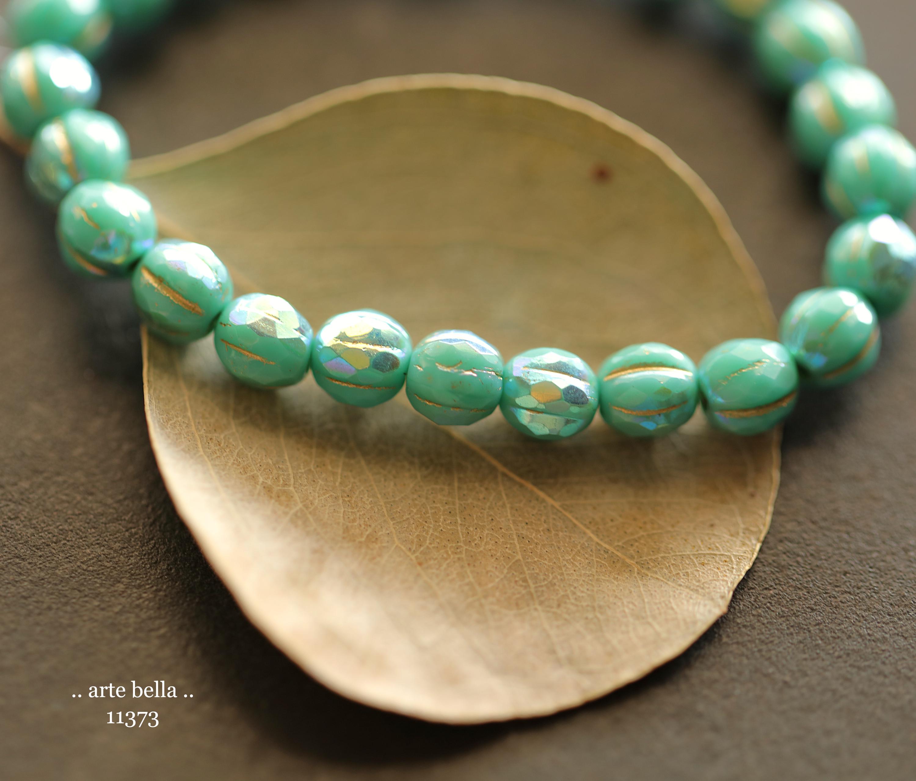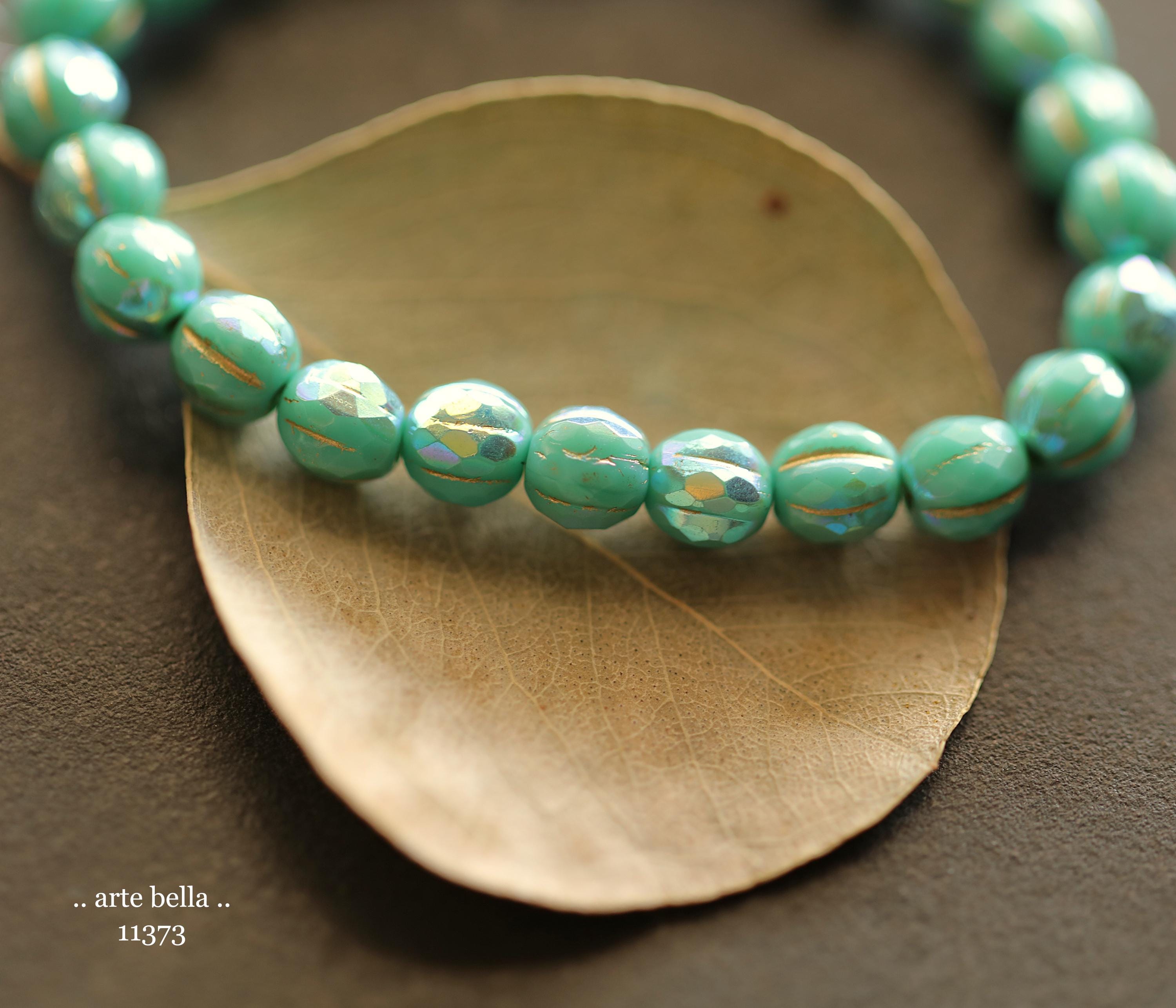 Gorgeous faceted melon beads in opaque turquoise glass with a Aurora Borealis rainbow, gold metallic wash and fire polished finish. PLEASE NOTE: These are not perfectly manufactured beads .. they are hand faceted and are not perfectly round as seen in my pictures. These have a vintage vibe going on.