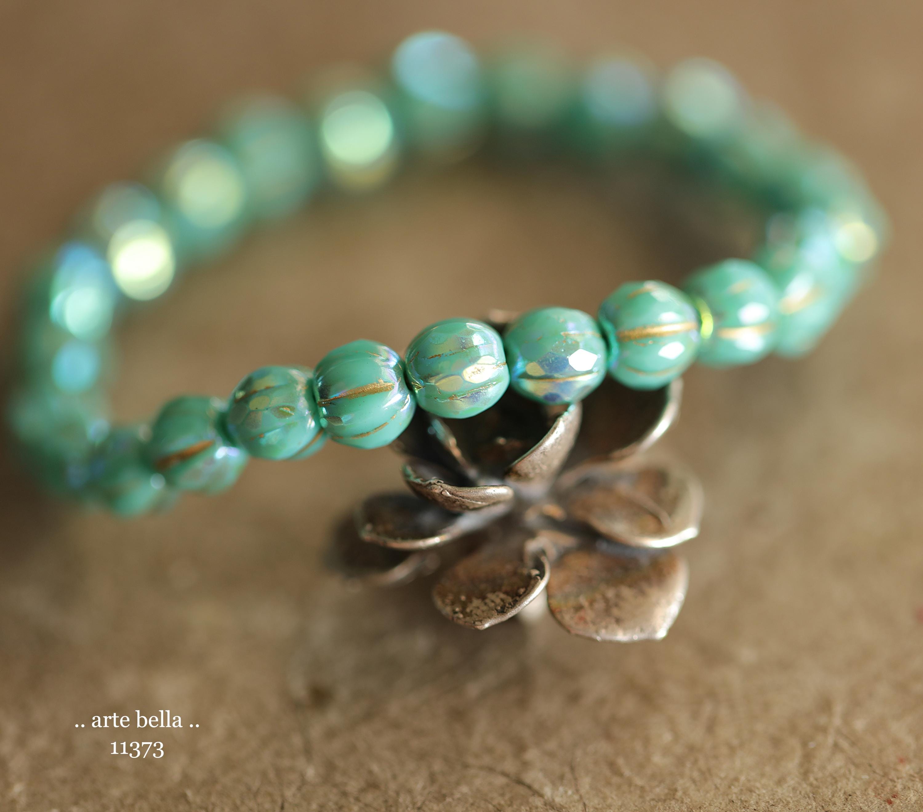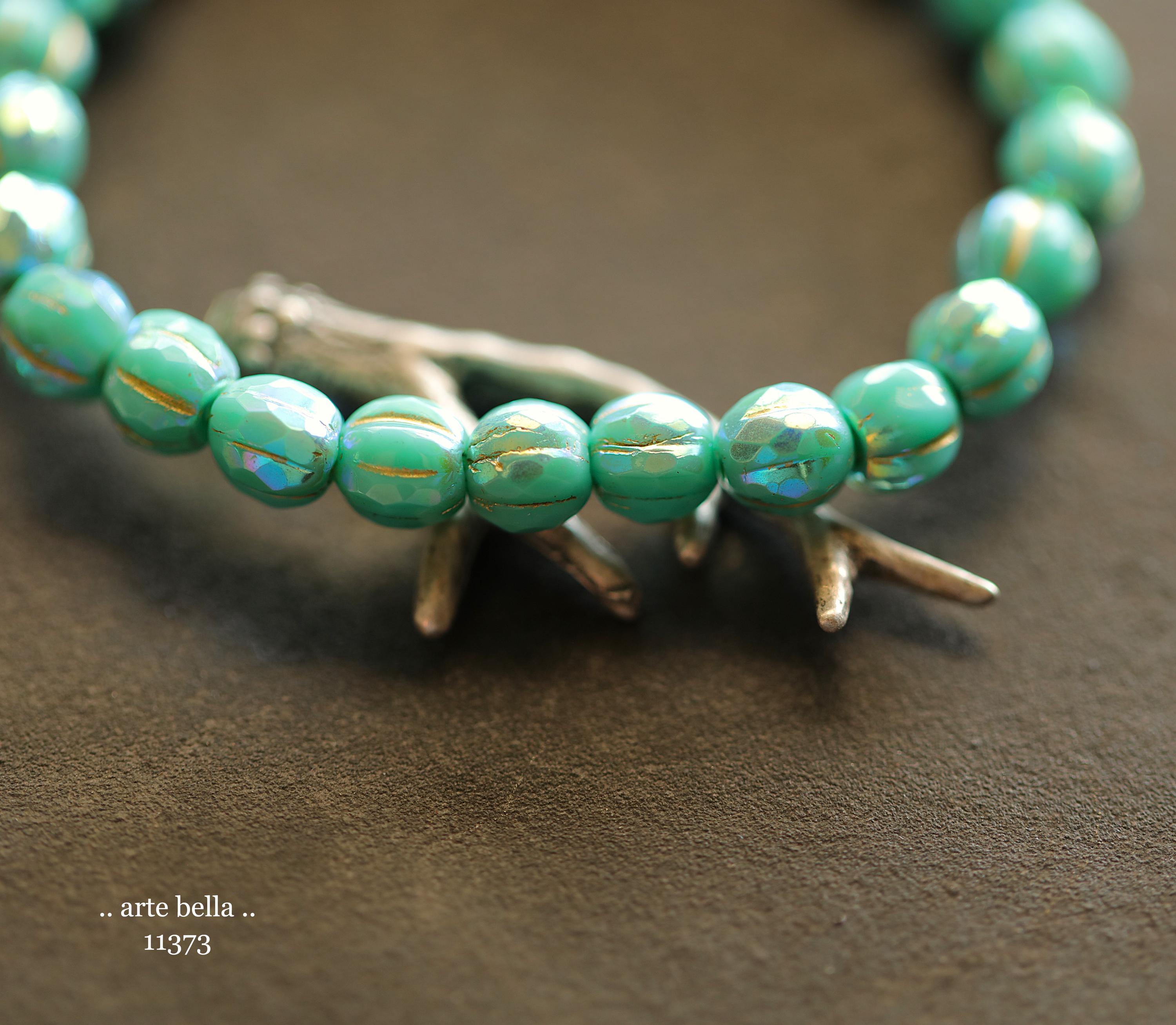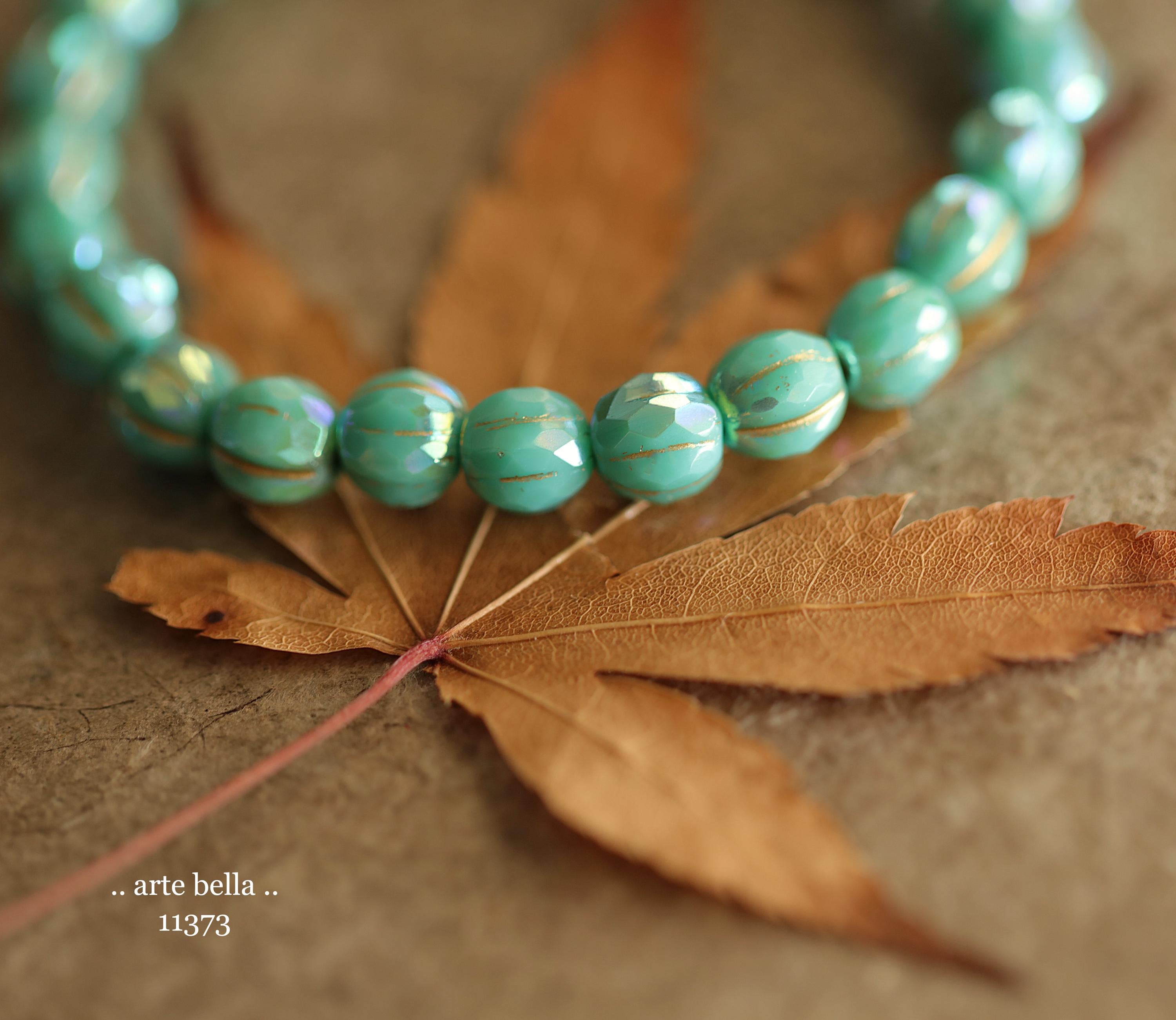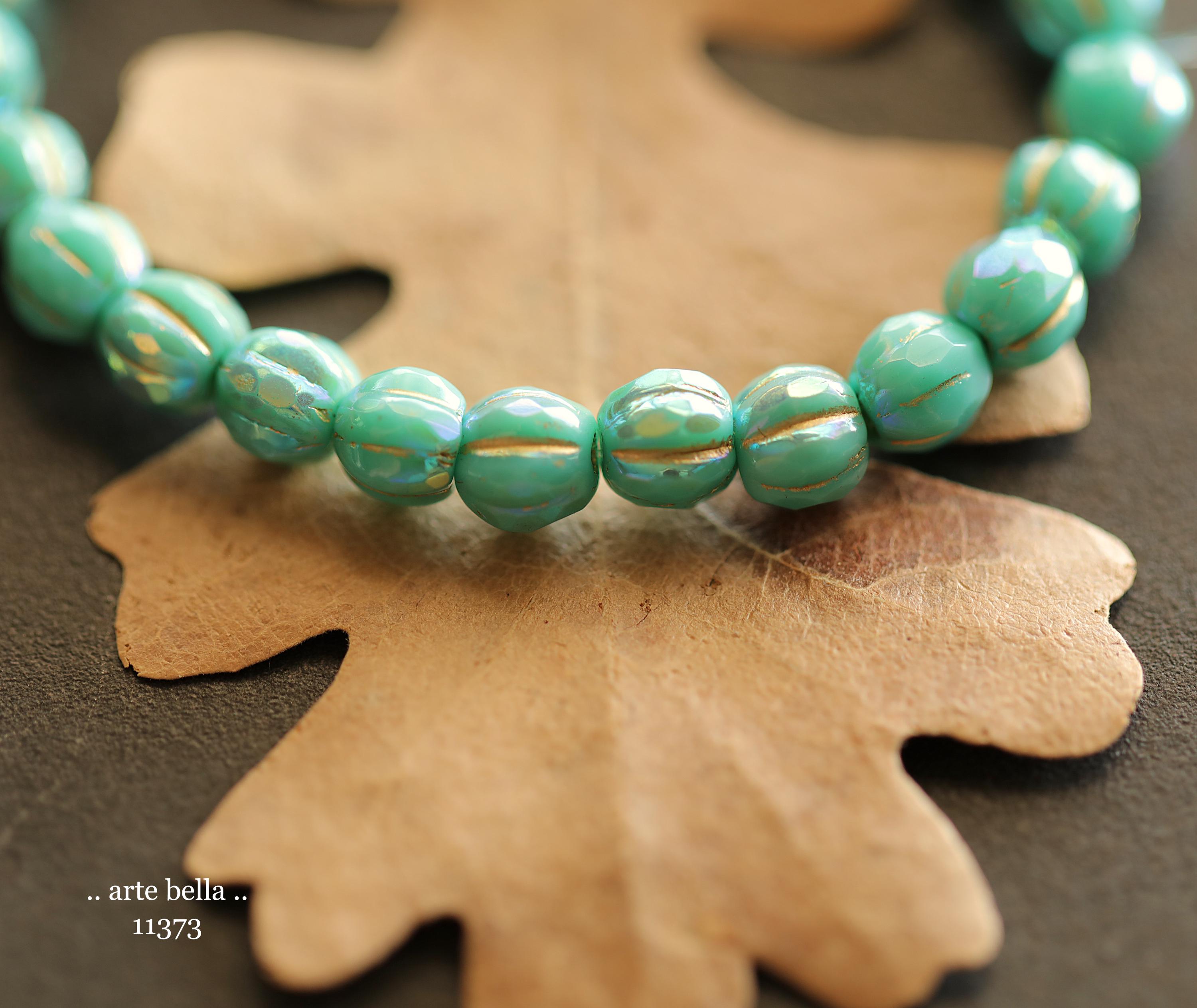 Gorgeous faceted melon beads in opaque turquoise glass with a Aurora Borealis rainbow, gold metallic wash and fire polished finish. PLEASE NOTE: These are not perfectly manufactured beads .. they are hand faceted and are not perfectly round as seen in my pictures. These have a vintage vibe going on.