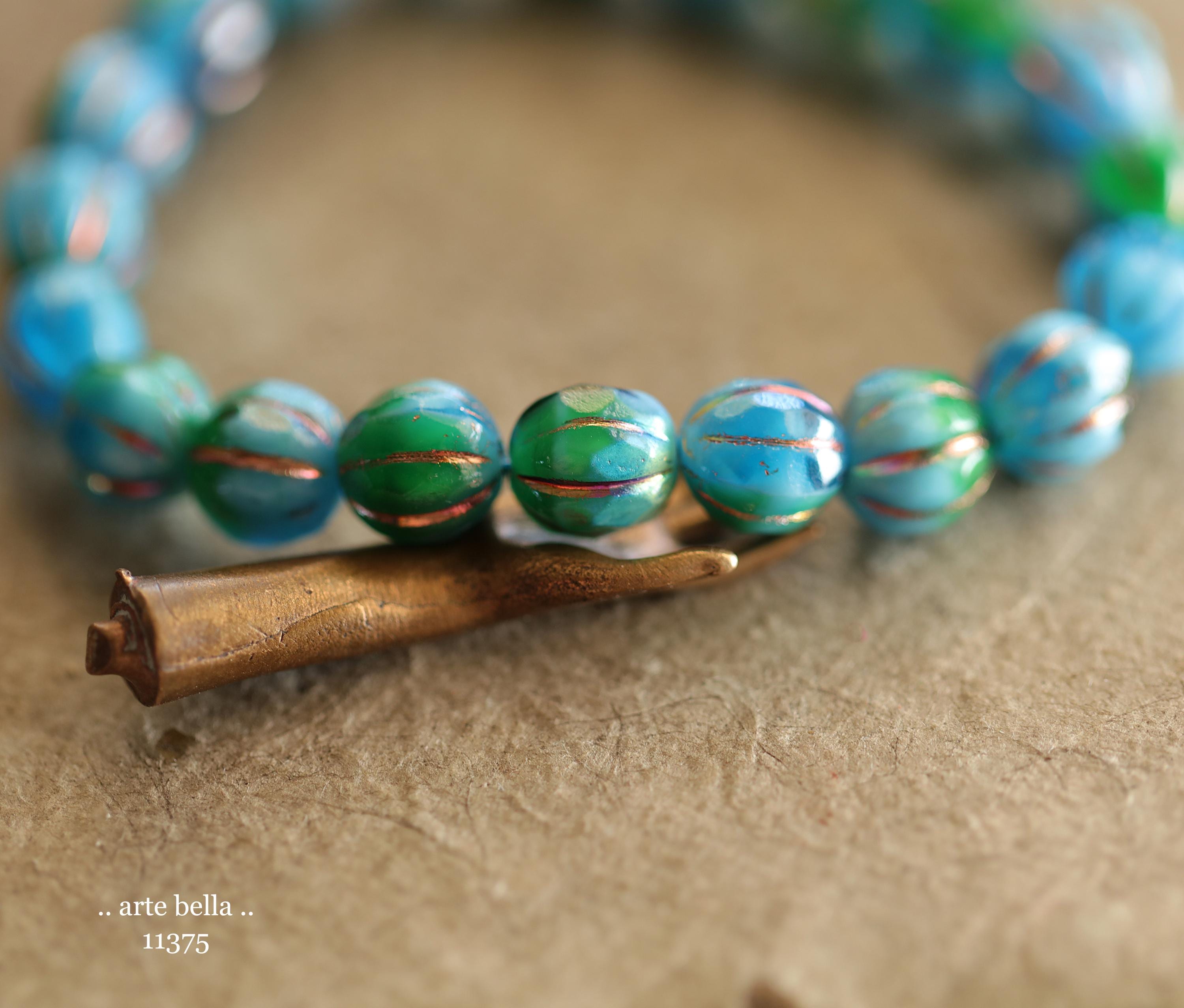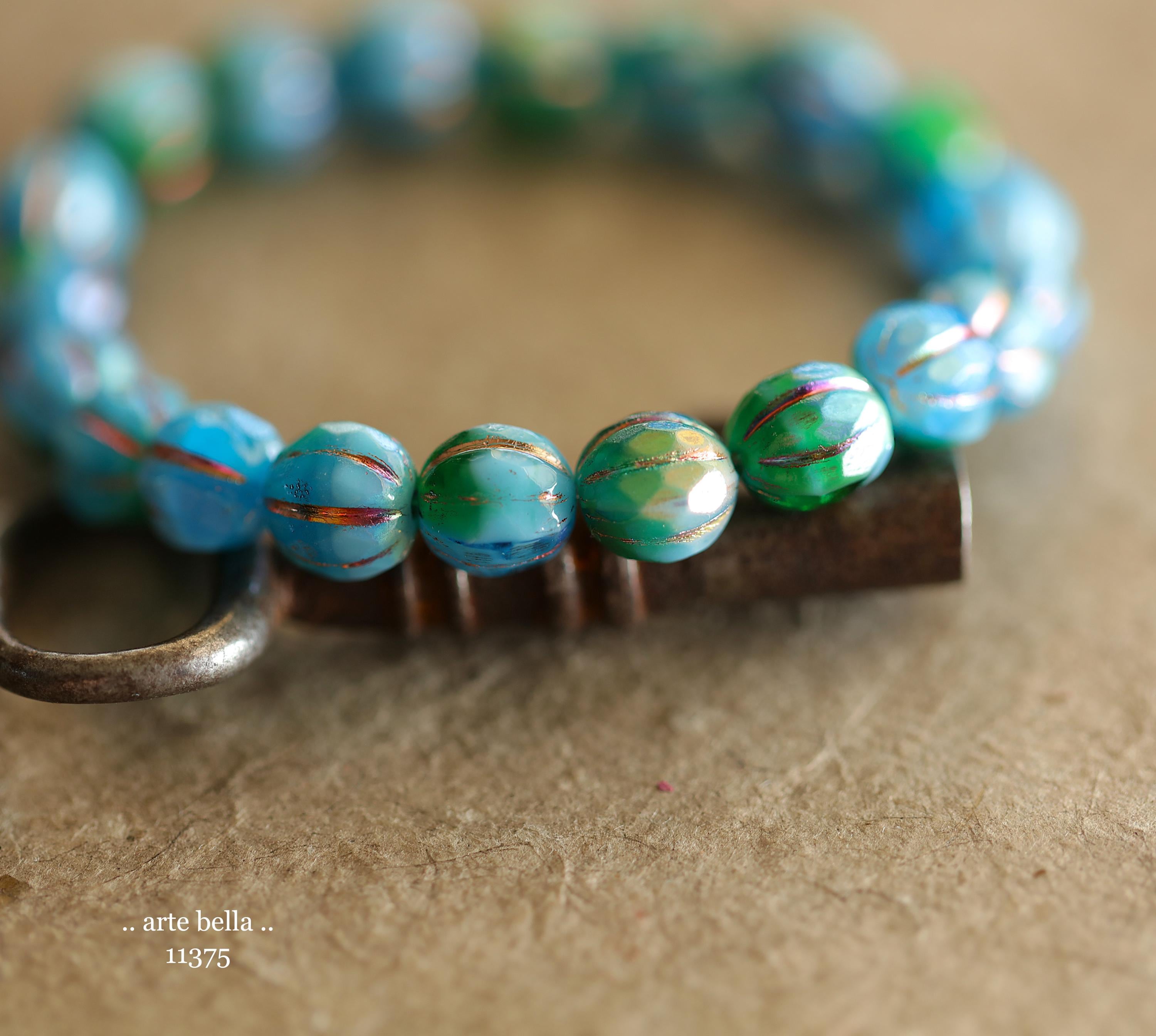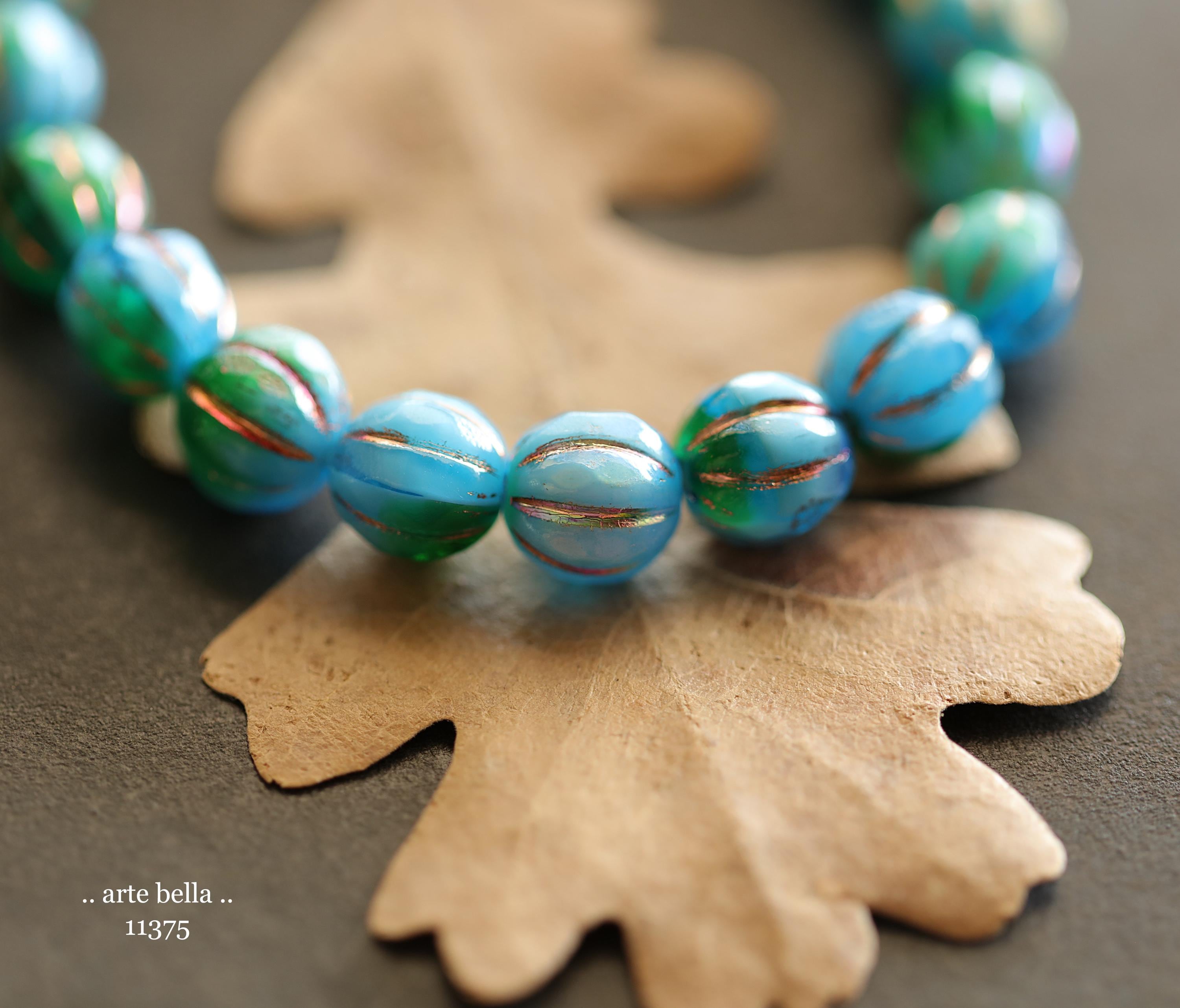 Gorgeous faceted melon beads in opaque sky blue and translucent emerald green glass with a Aurora Borealis rainbow and fire polished finish. PLEASE NOTE: These are not perfectly manufactured beads .. they are hand faceted and are not perfectly round as seen in my pictures. These have a vintage vibe going on.