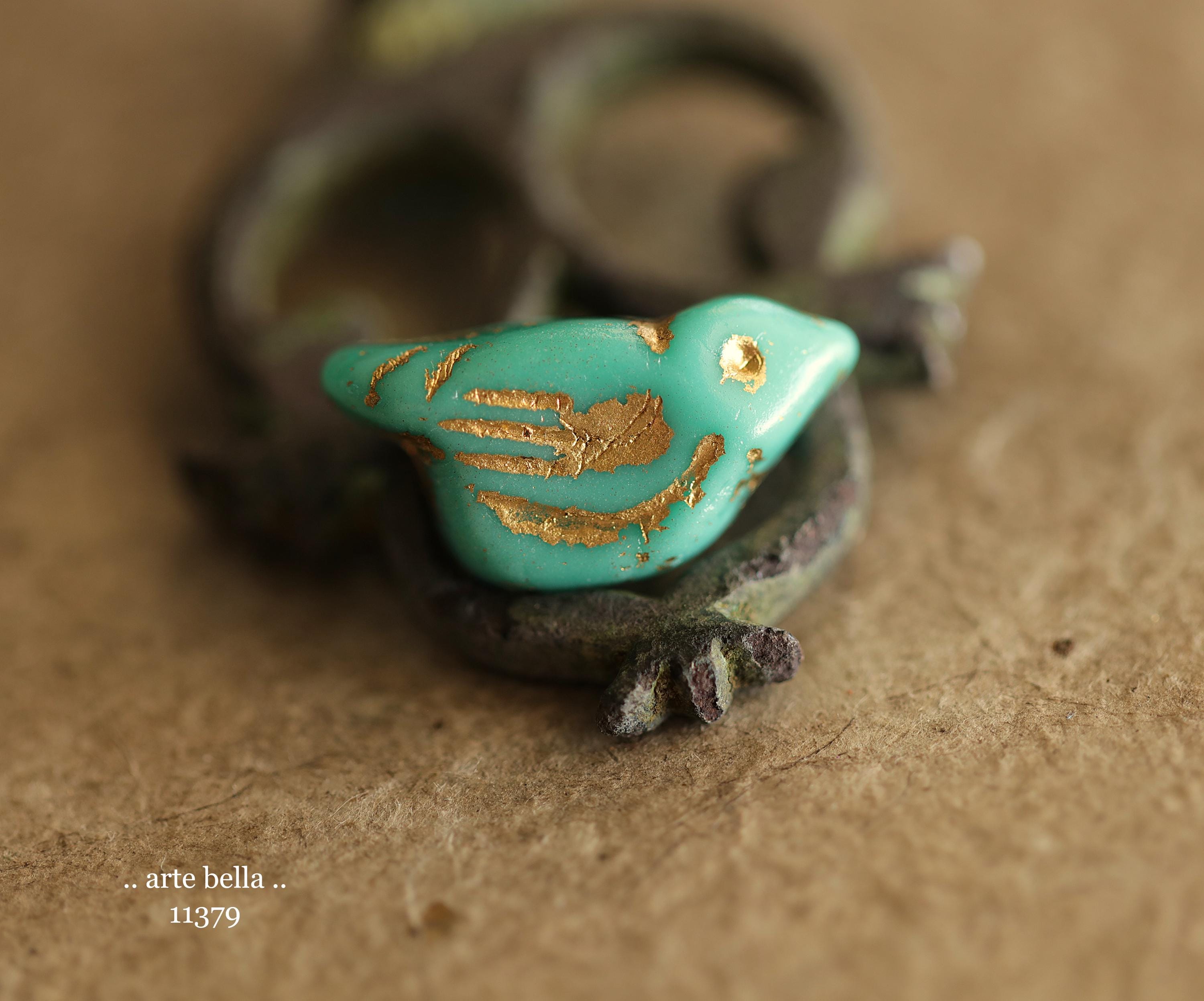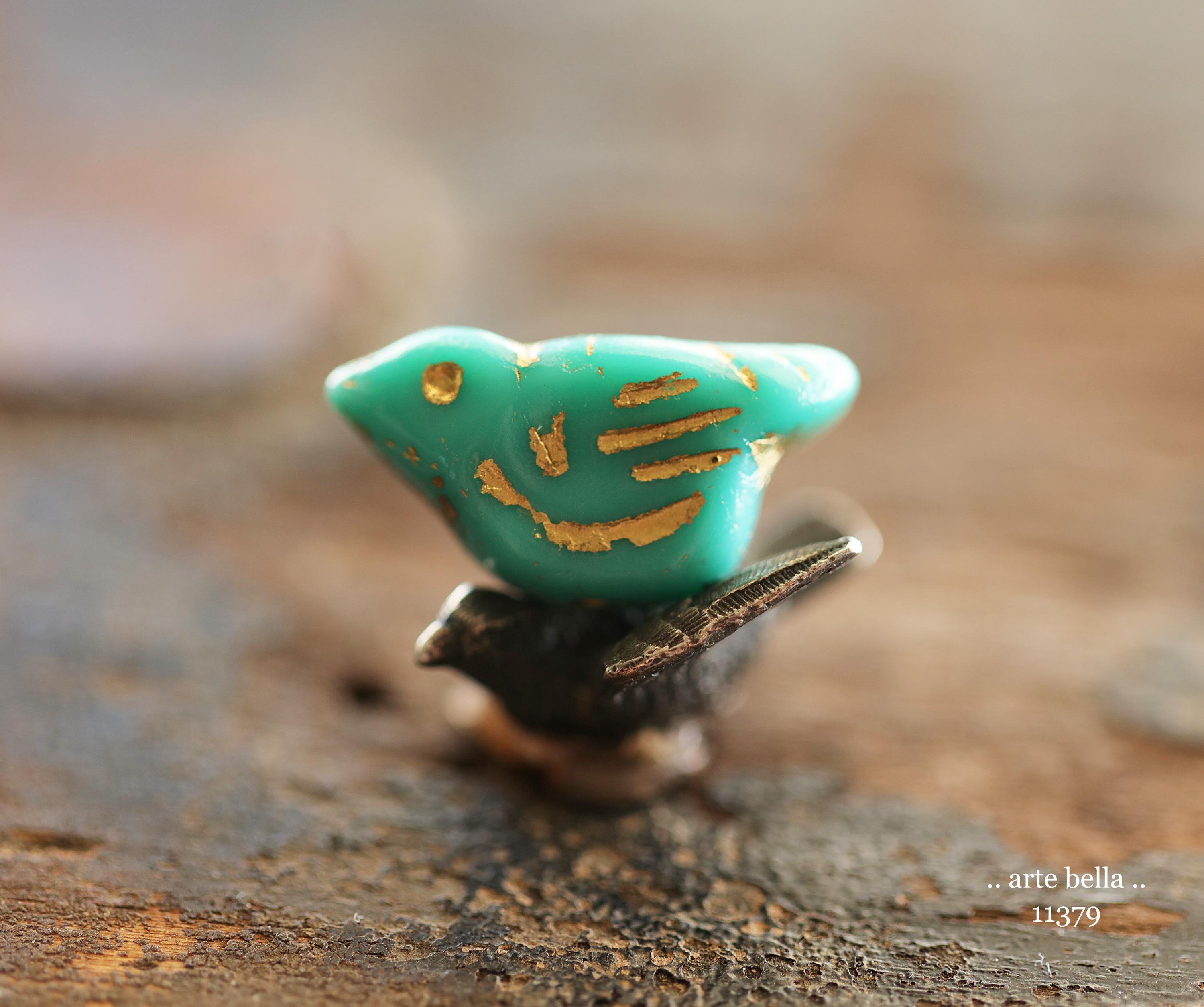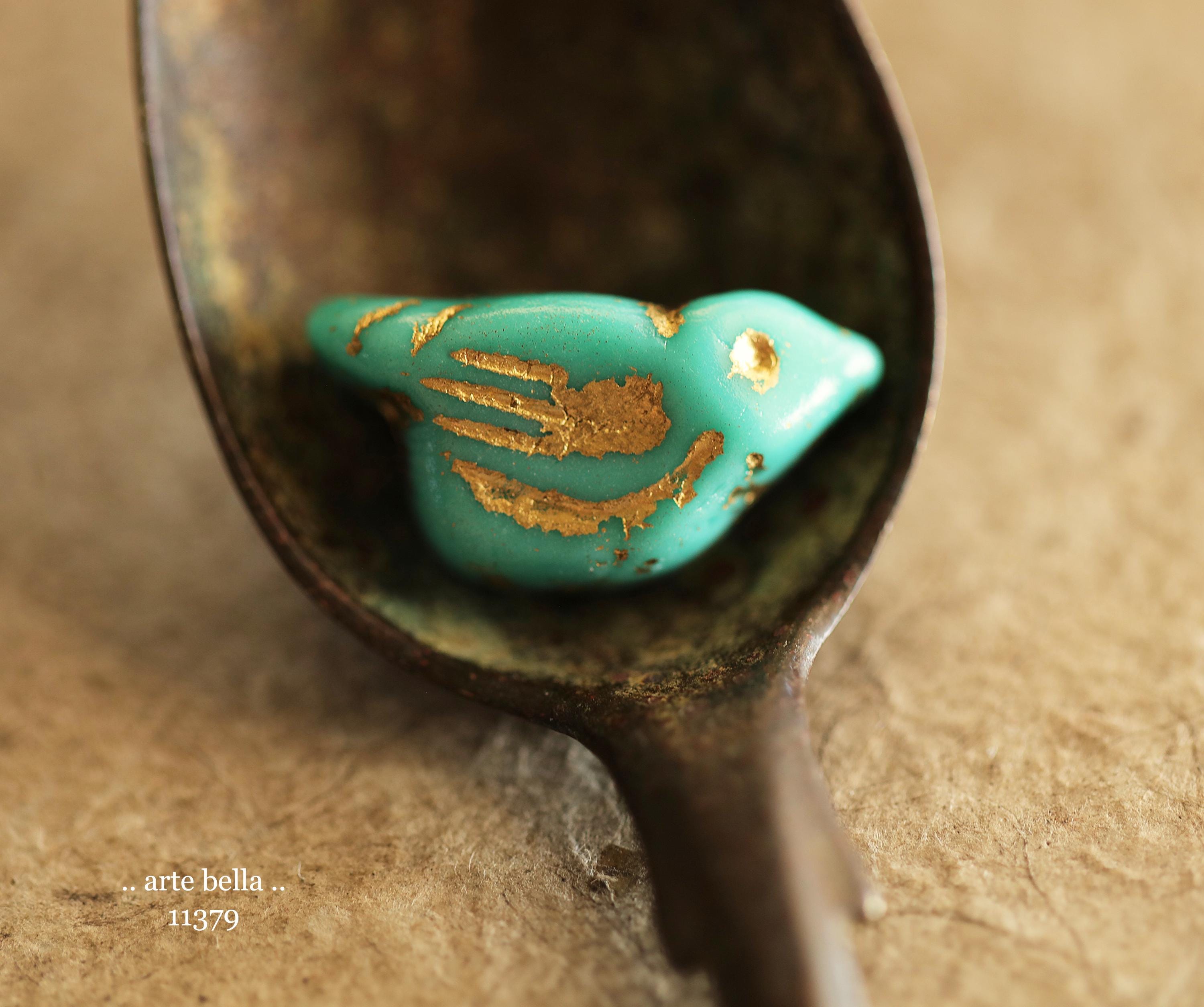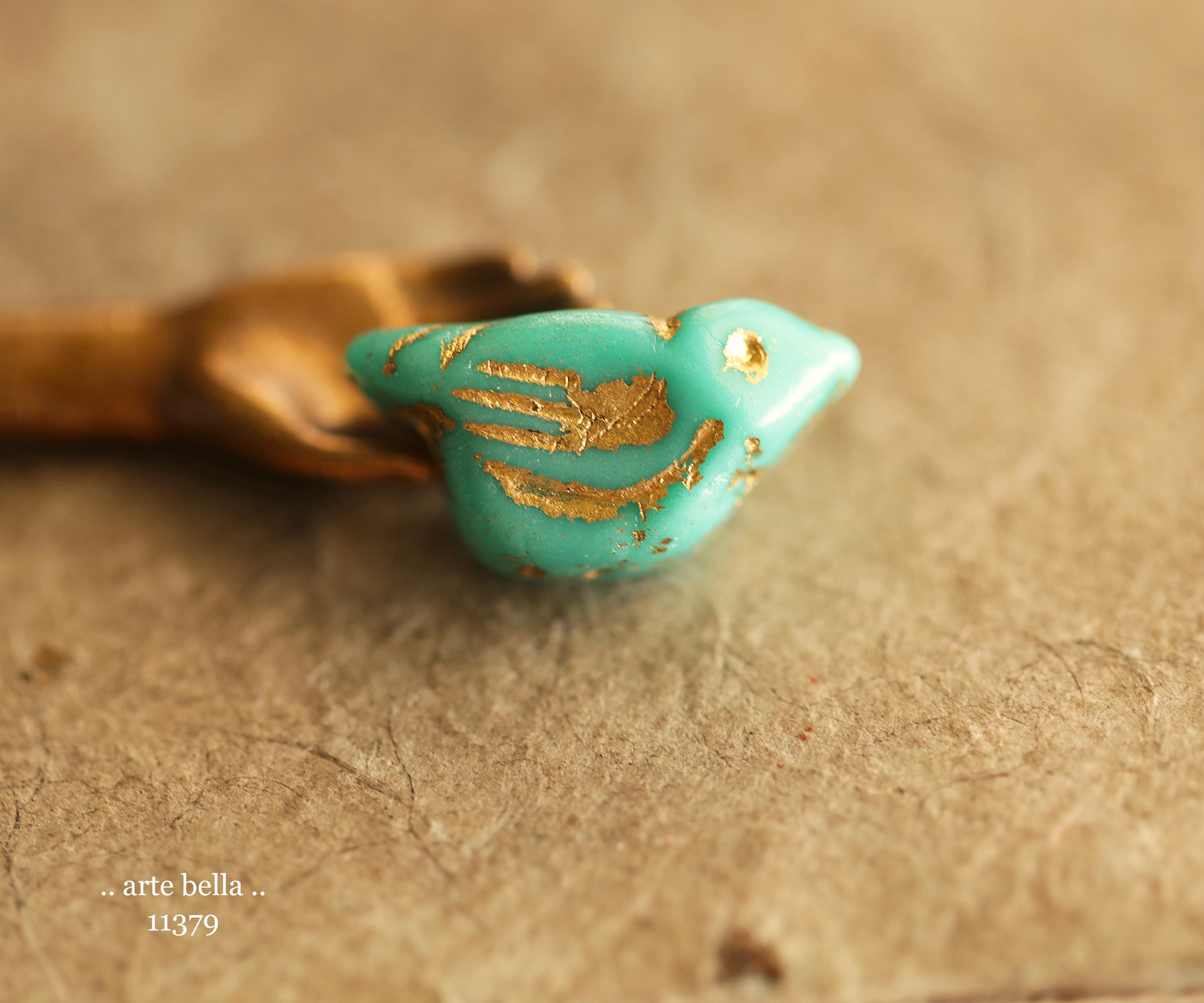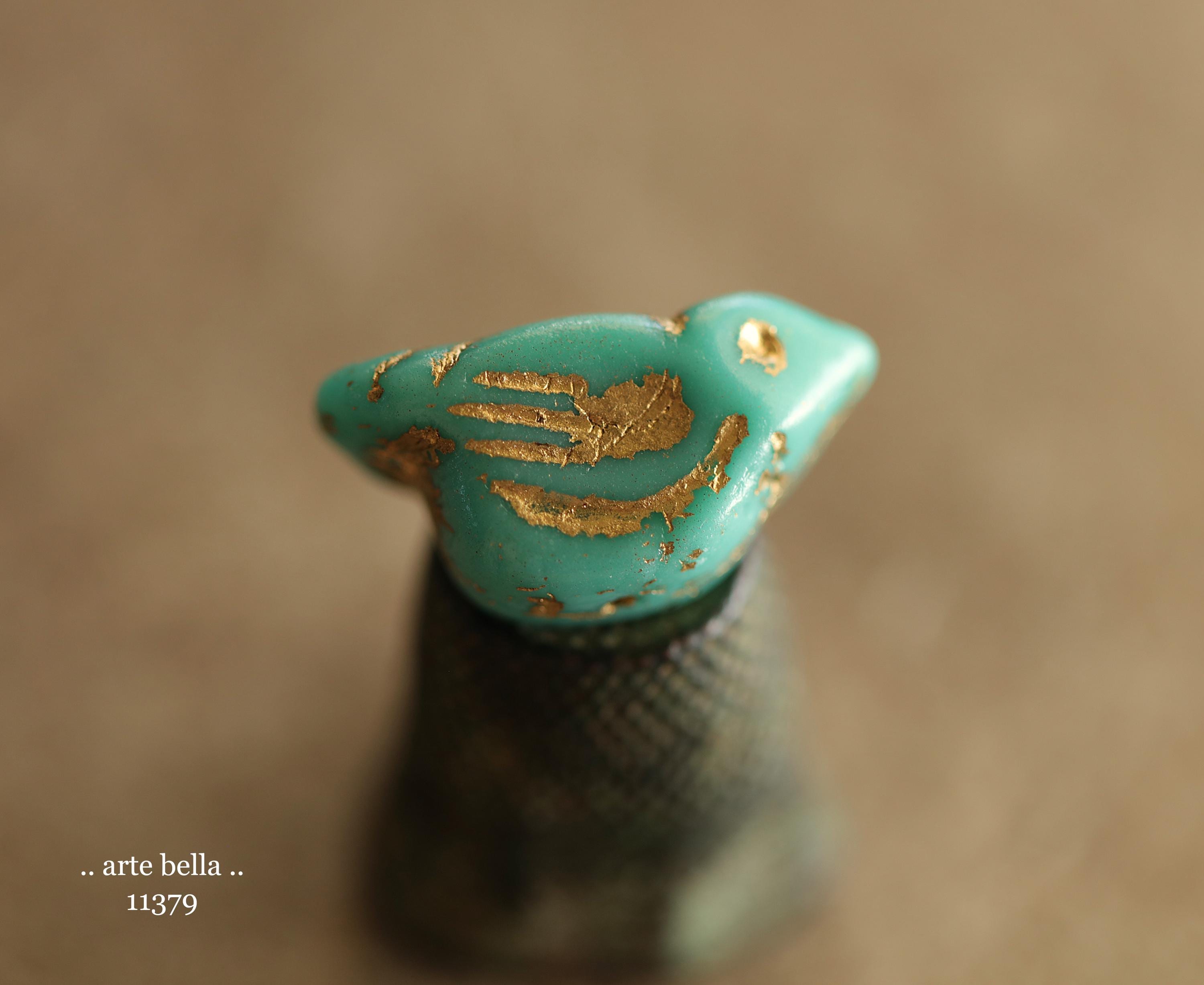 New .. GOLDEN TURQUOISE CHIRPS .. 6 Premium Czech Glass Bird Beads 11x22mm (11379-st) .. jewelry supplies