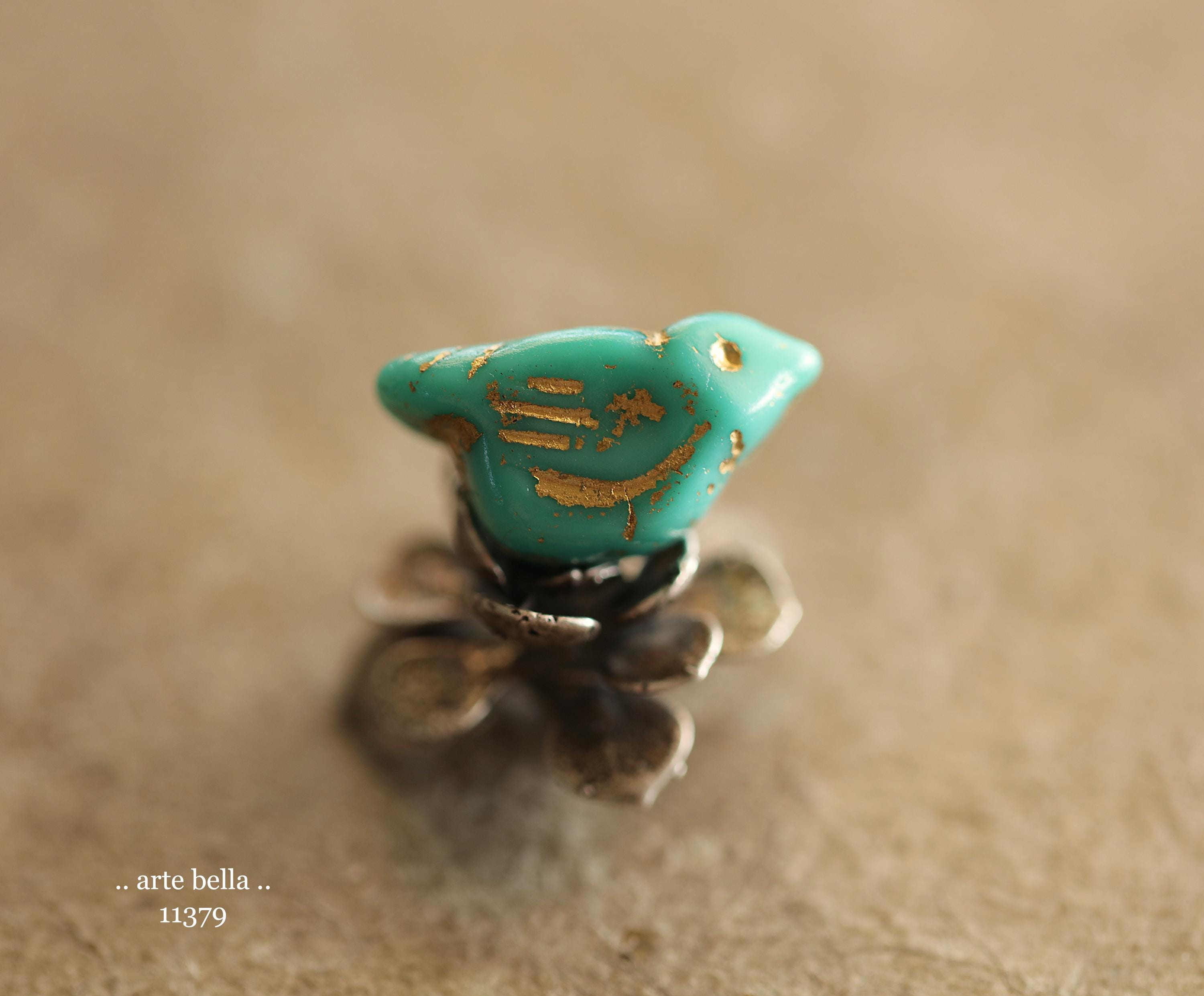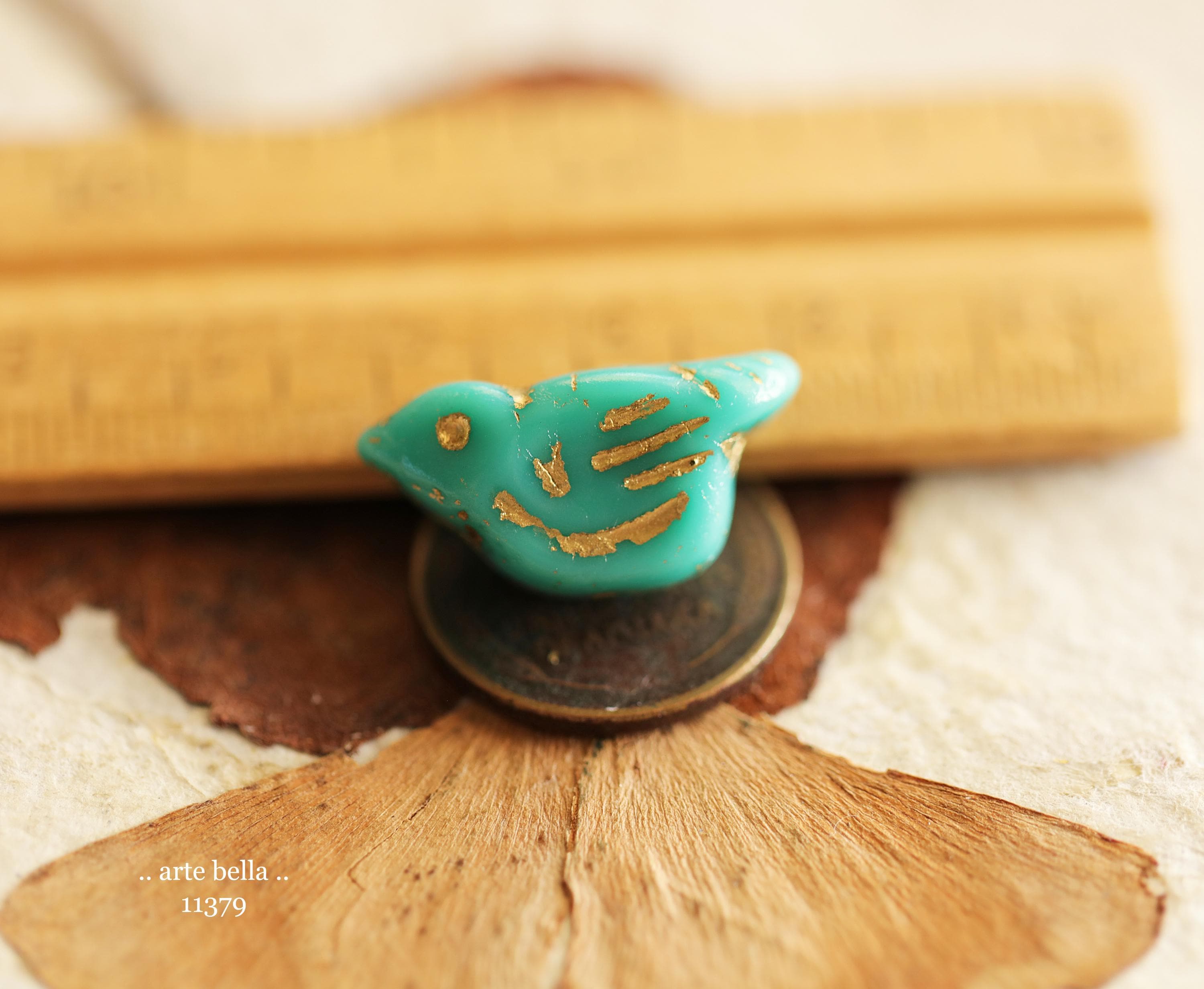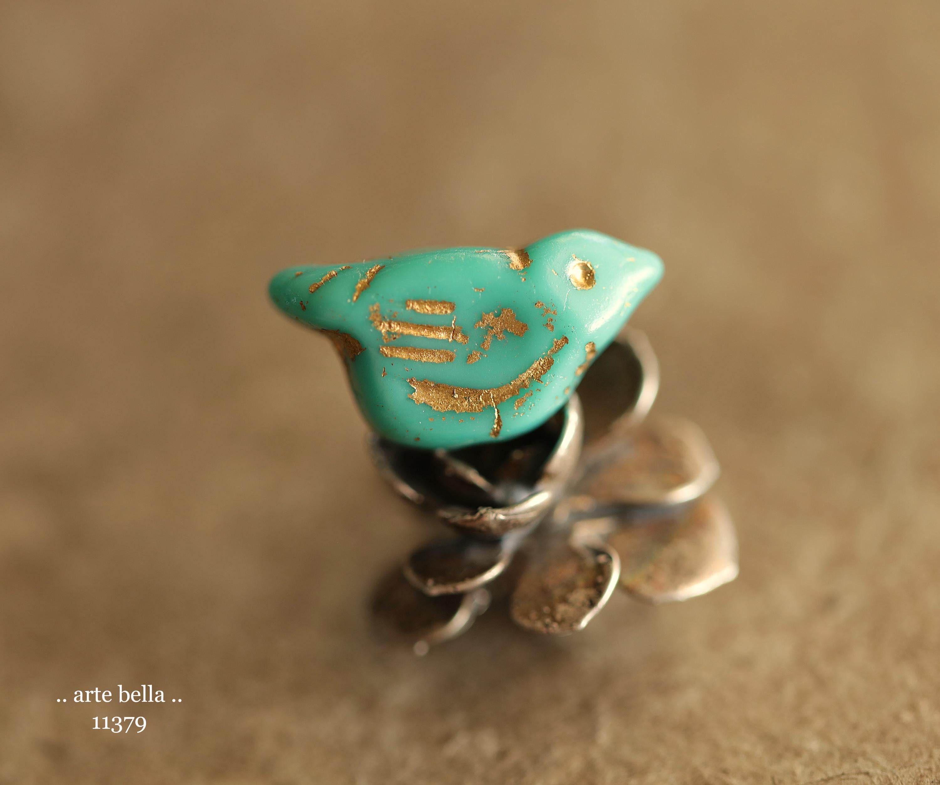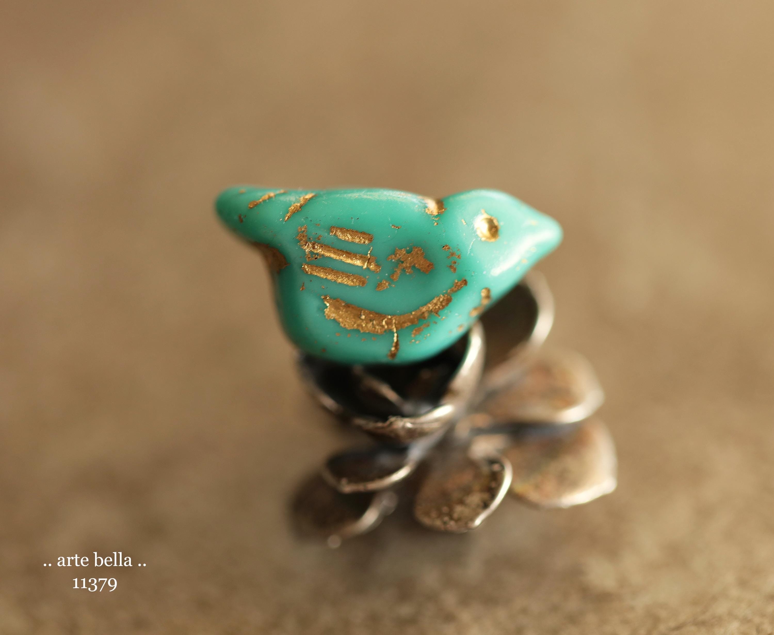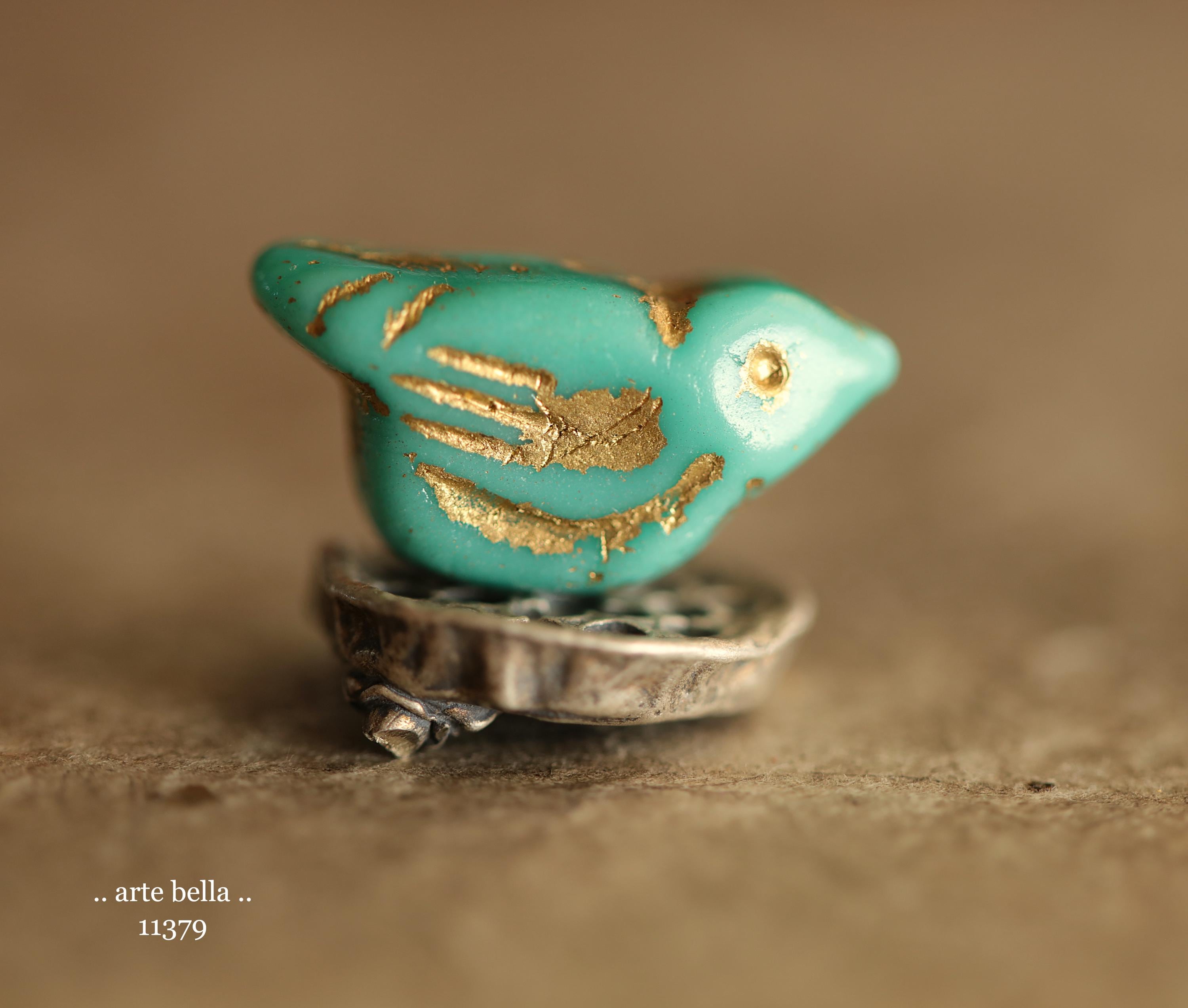 New .. GOLDEN TURQUOISE CHIRPS .. 6 Premium Czech Glass Bird Beads 11x22mm (11379-st) .. jewelry supplies