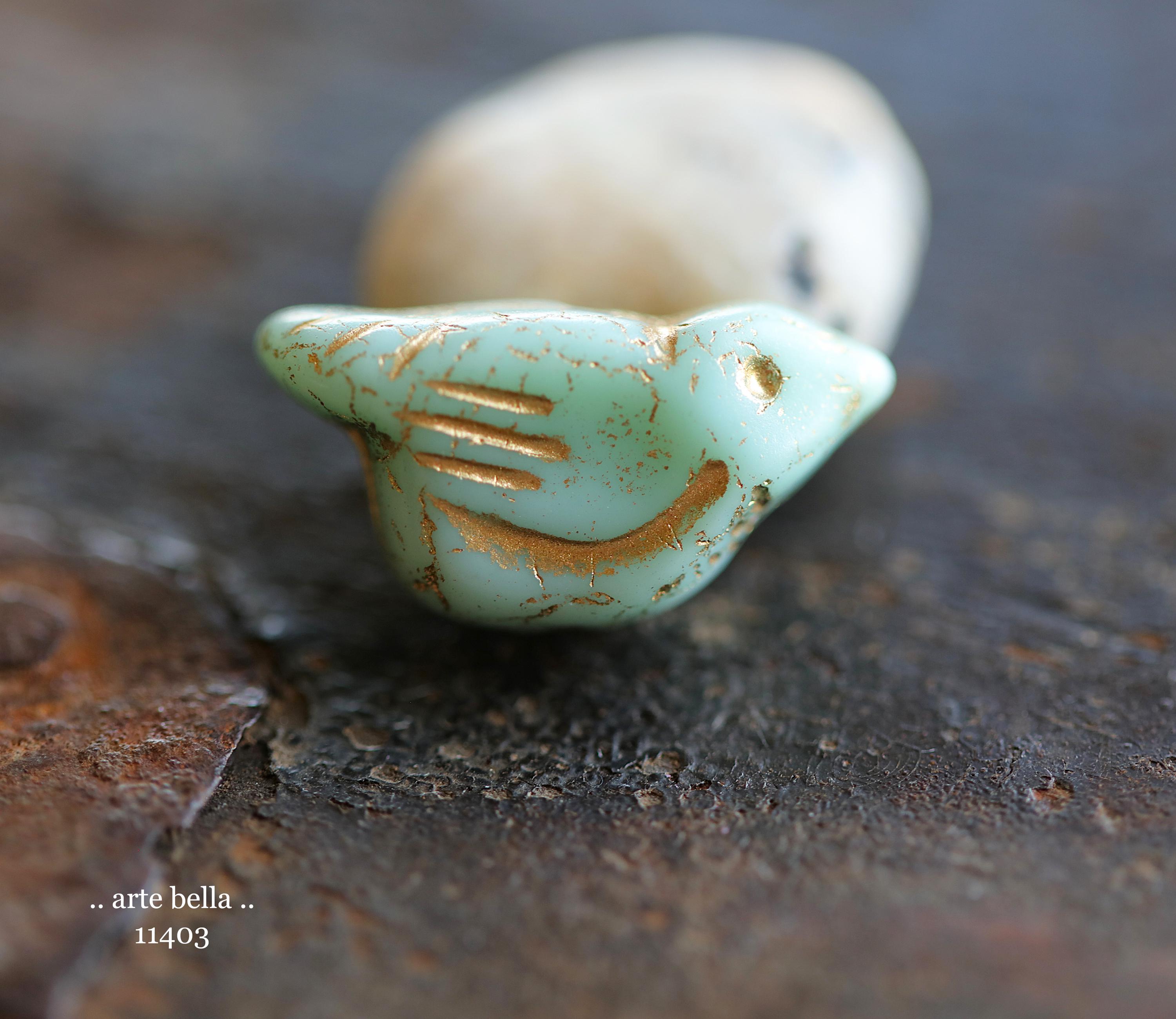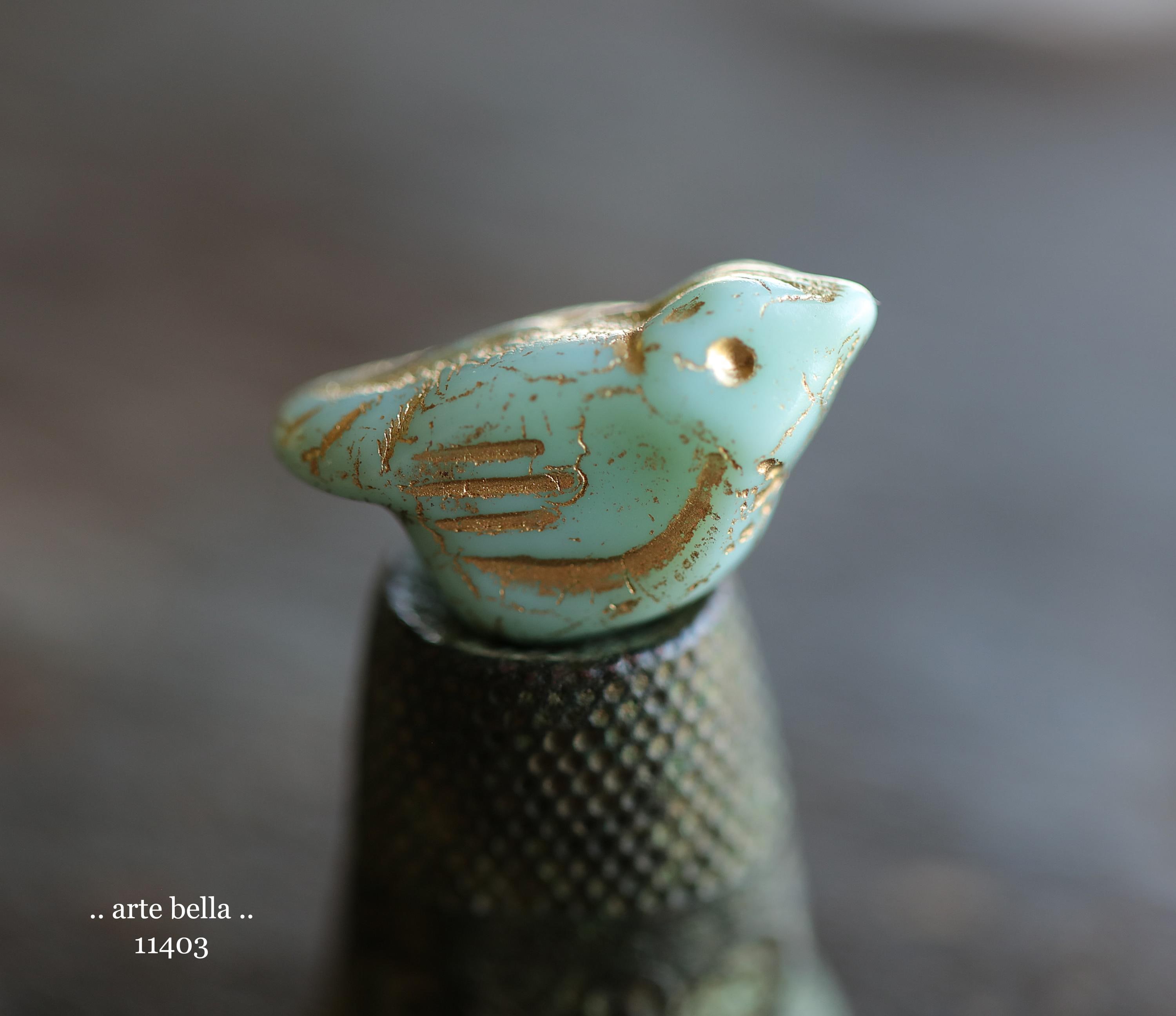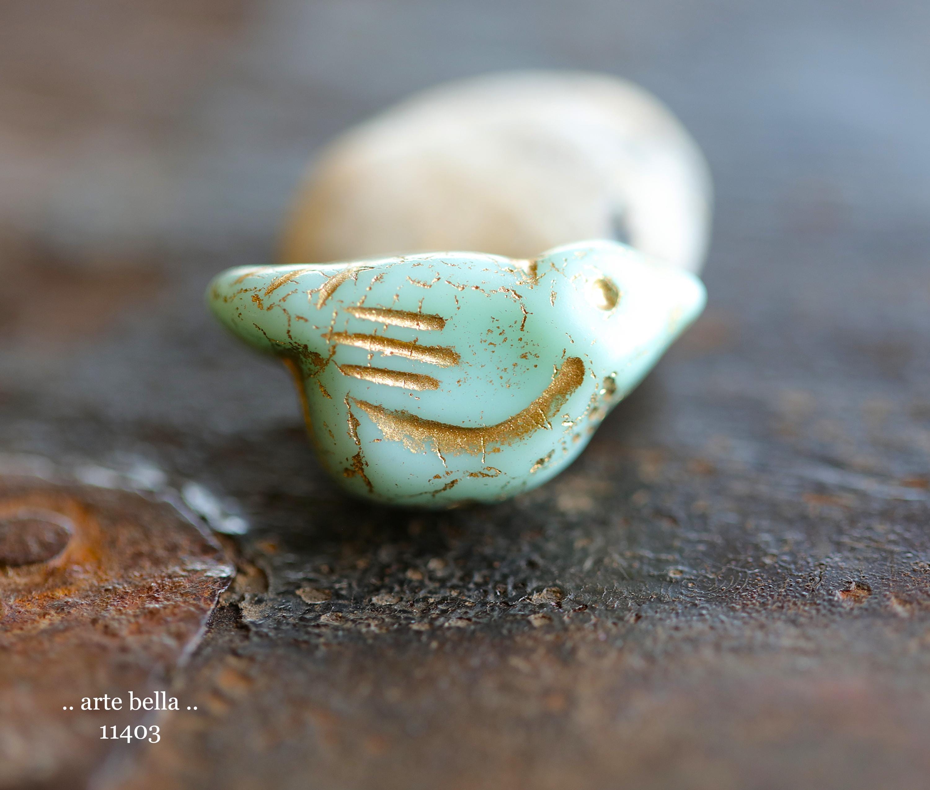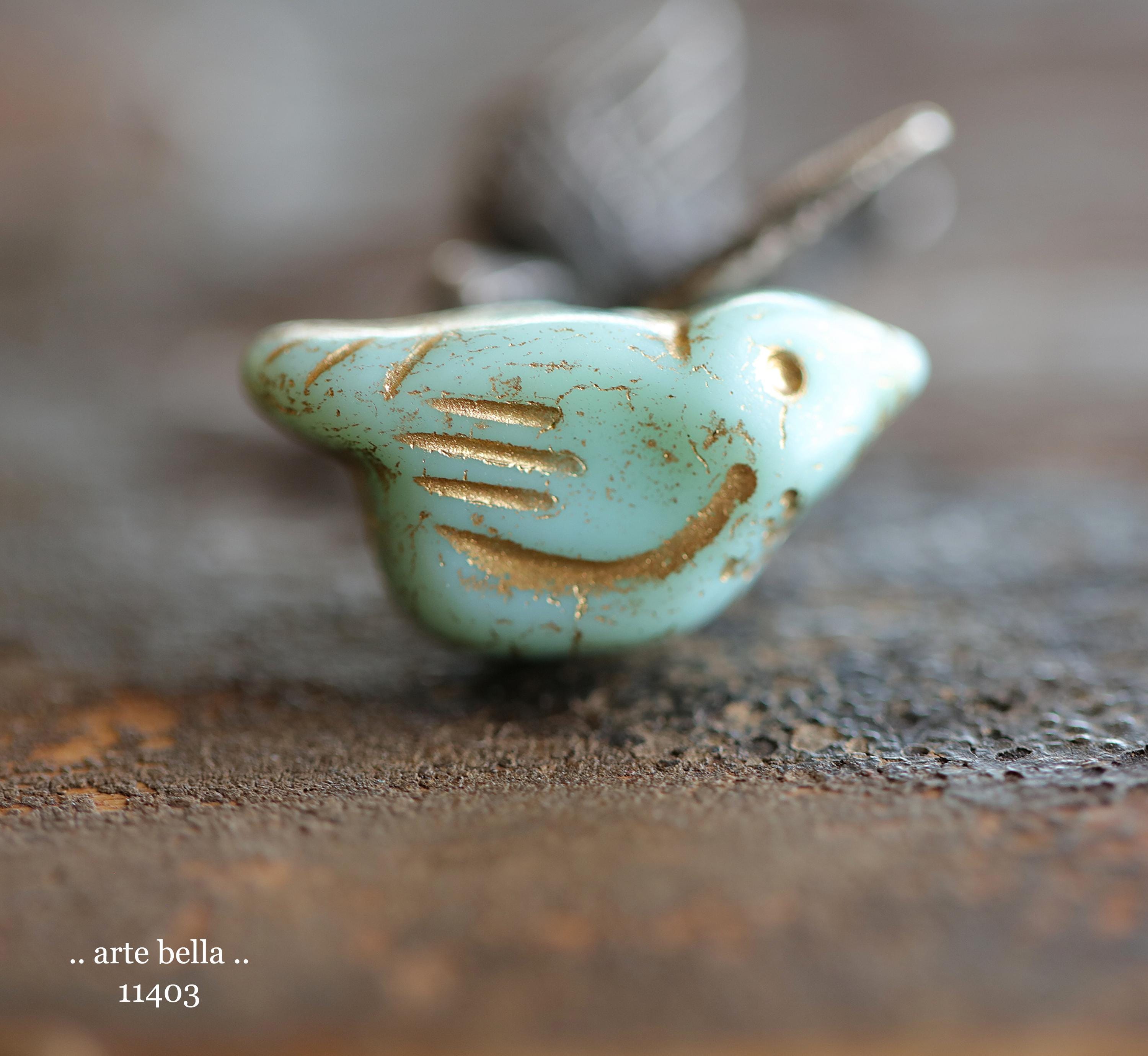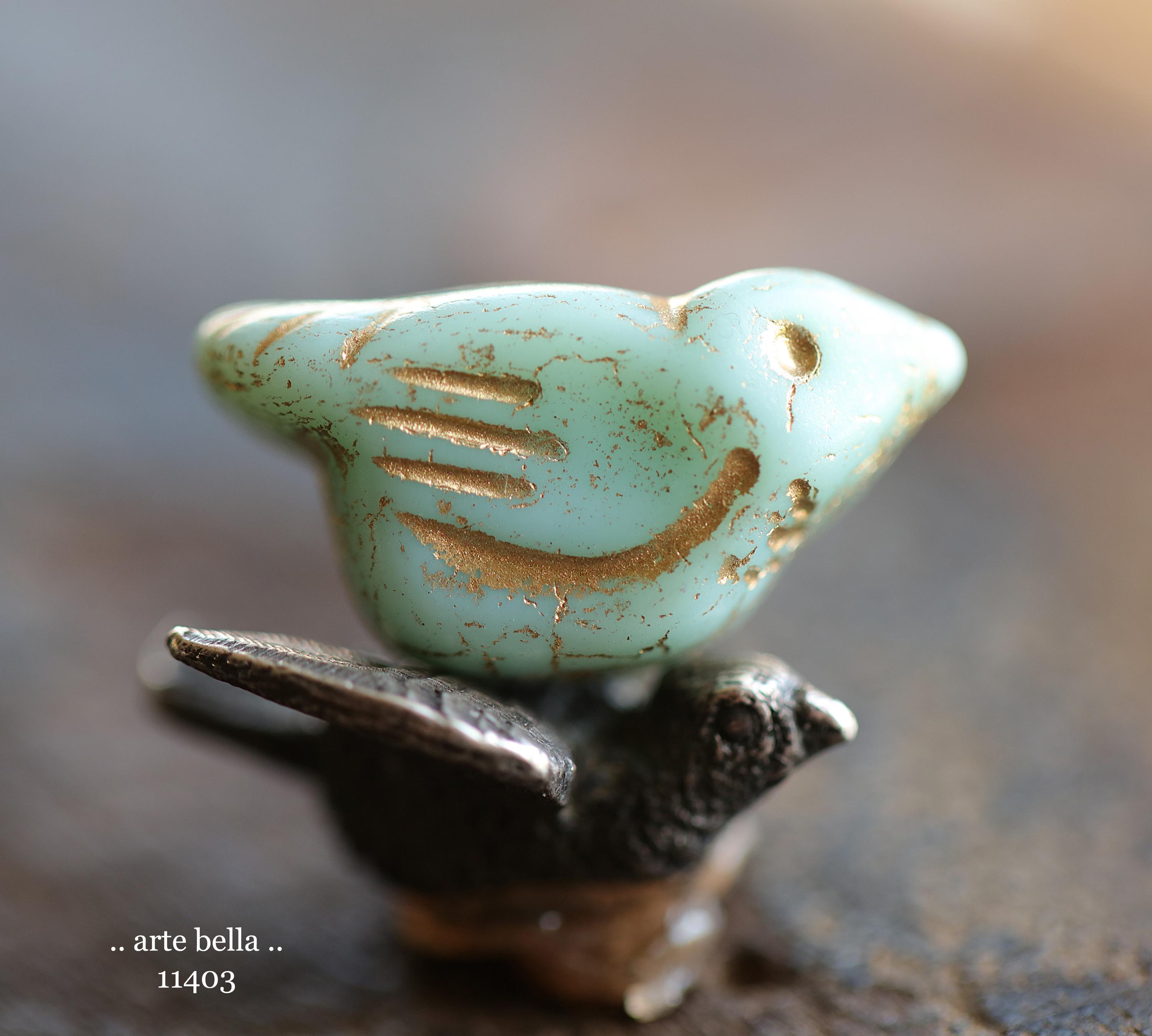 New .. GOLDEN MINT CHIRPS .. 6 Premium Czech Glass Bird Beads 11x22mm (11403-st) .. jewelry supplies