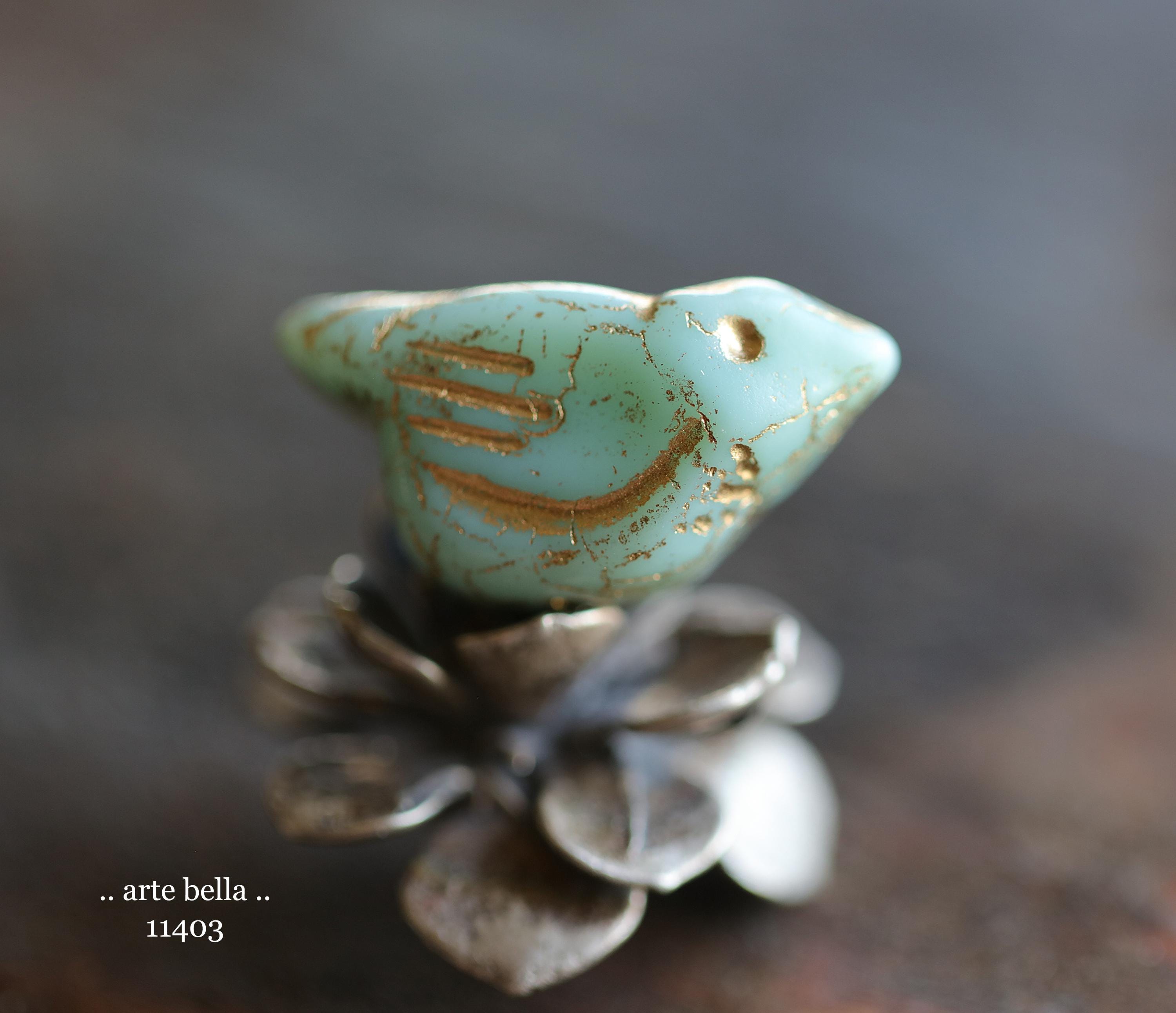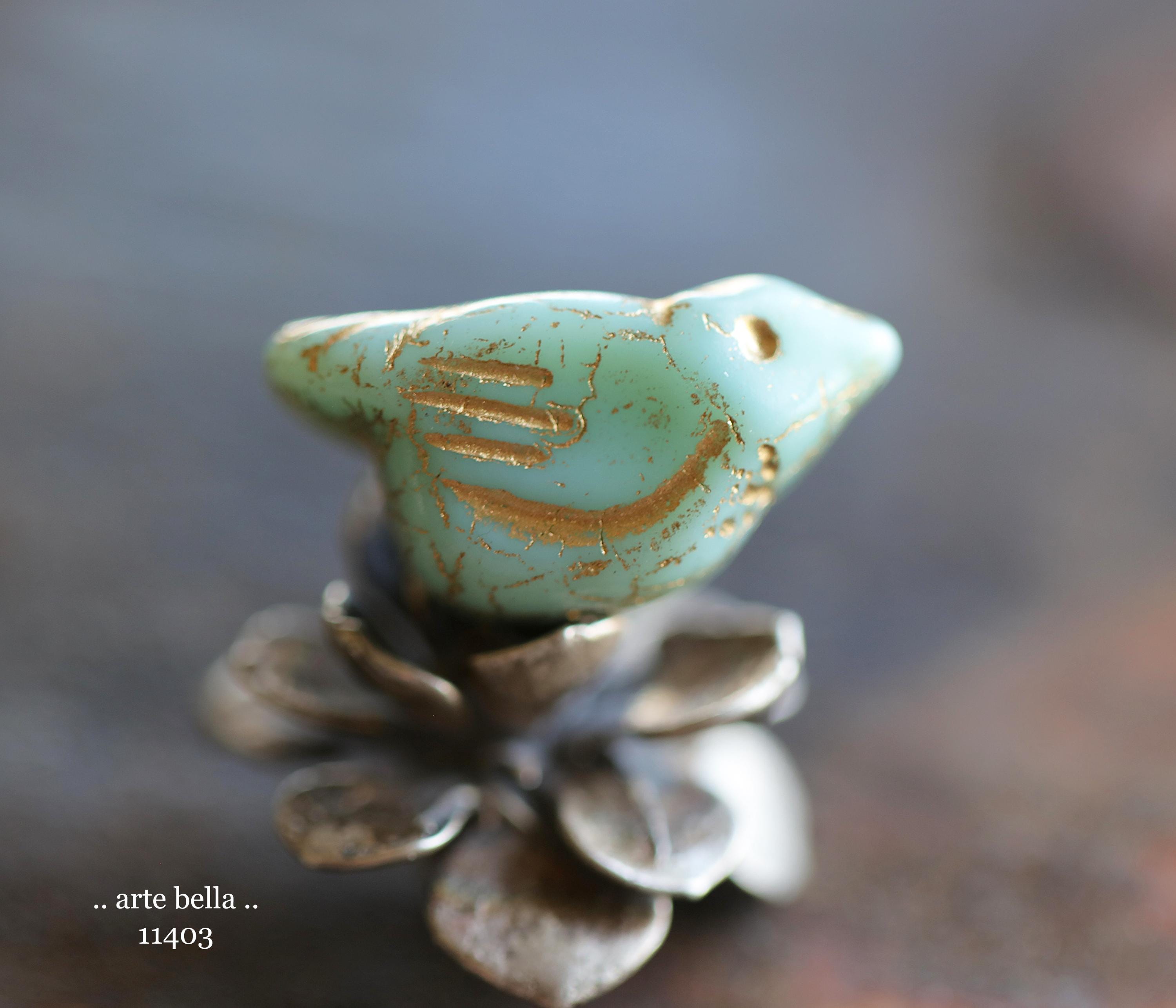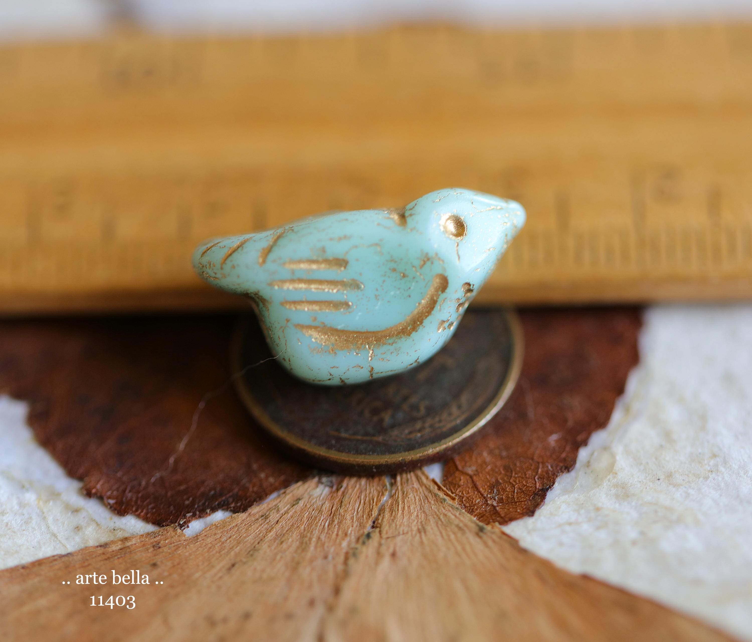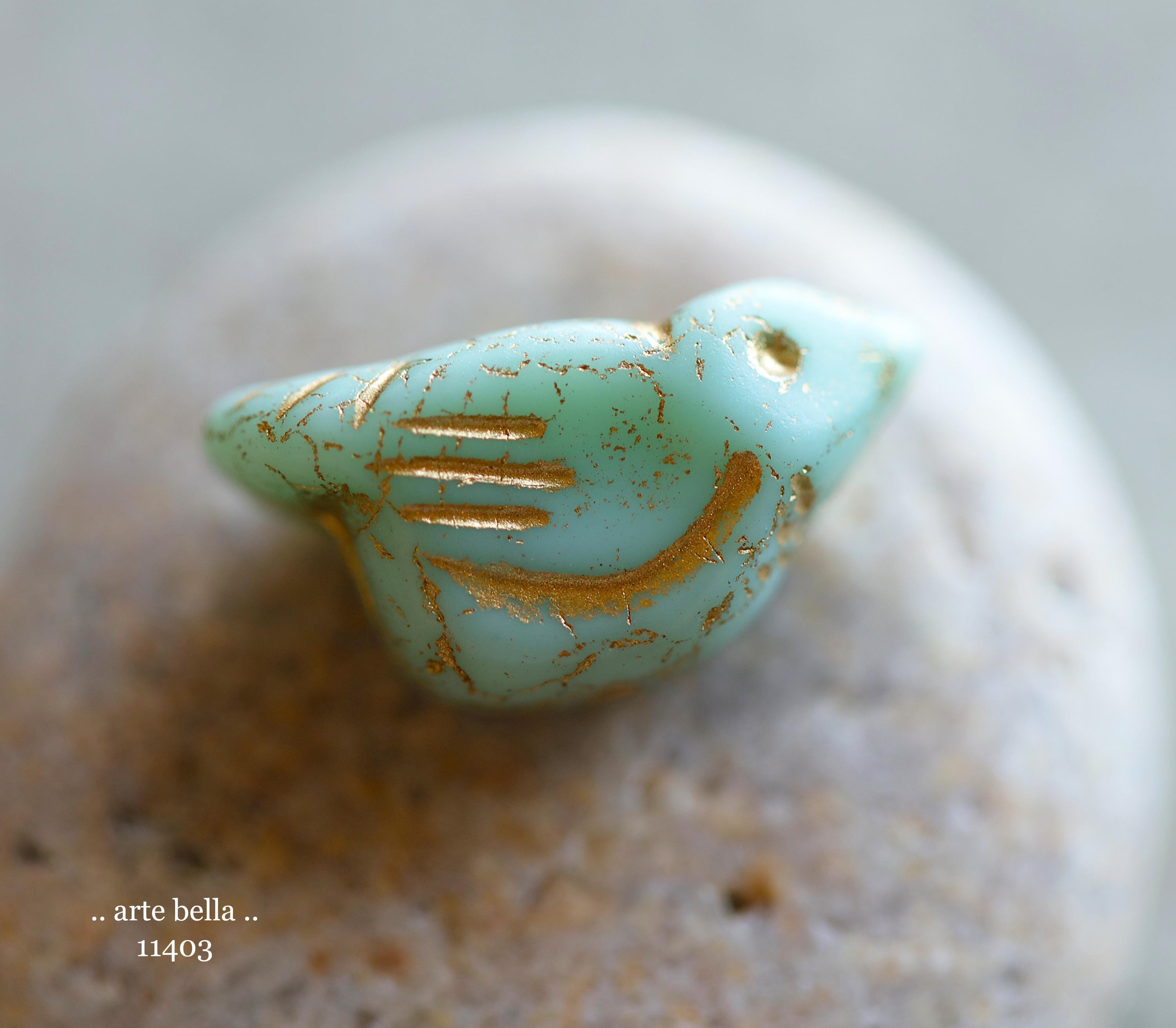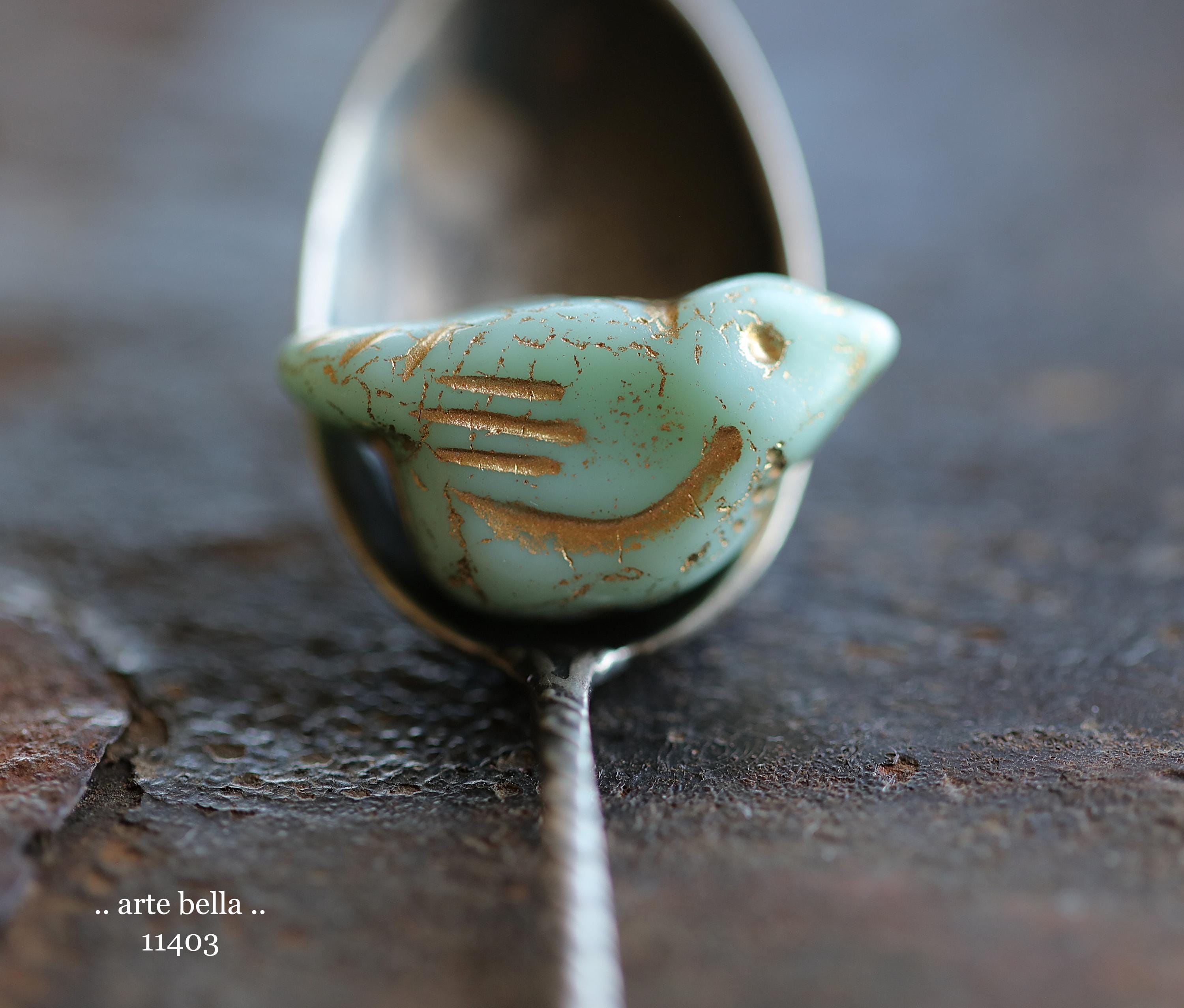 New .. GOLDEN MINT CHIRPS .. 6 Premium Czech Glass Bird Beads 11x22mm (11403-st) .. jewelry supplies