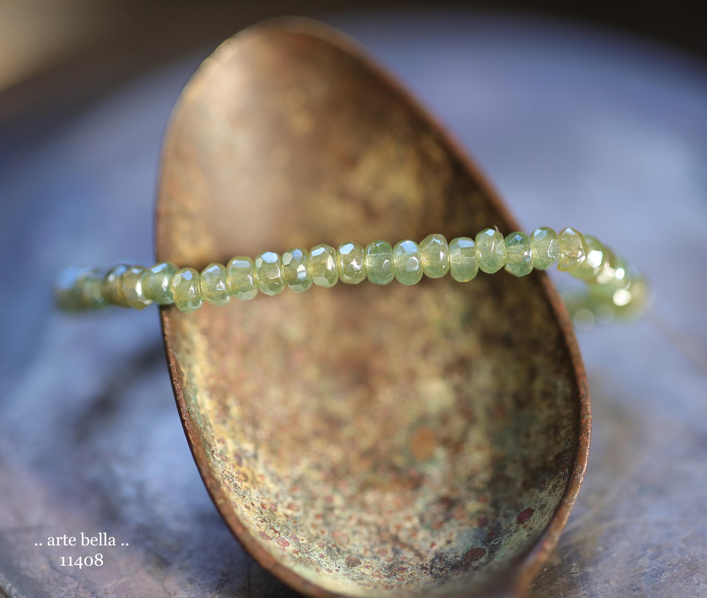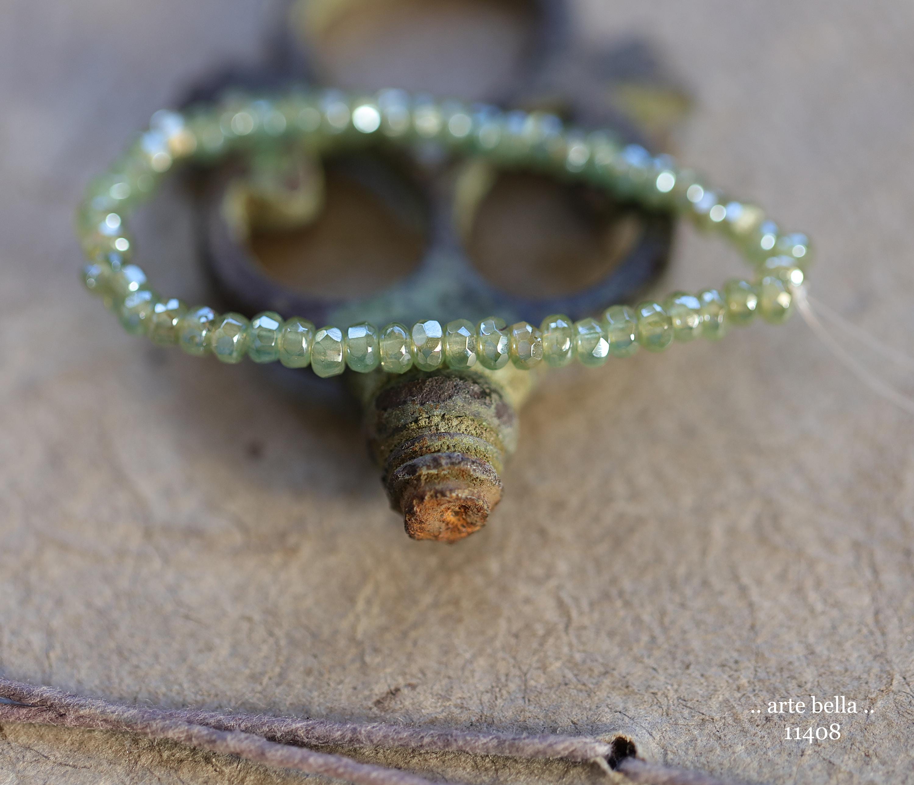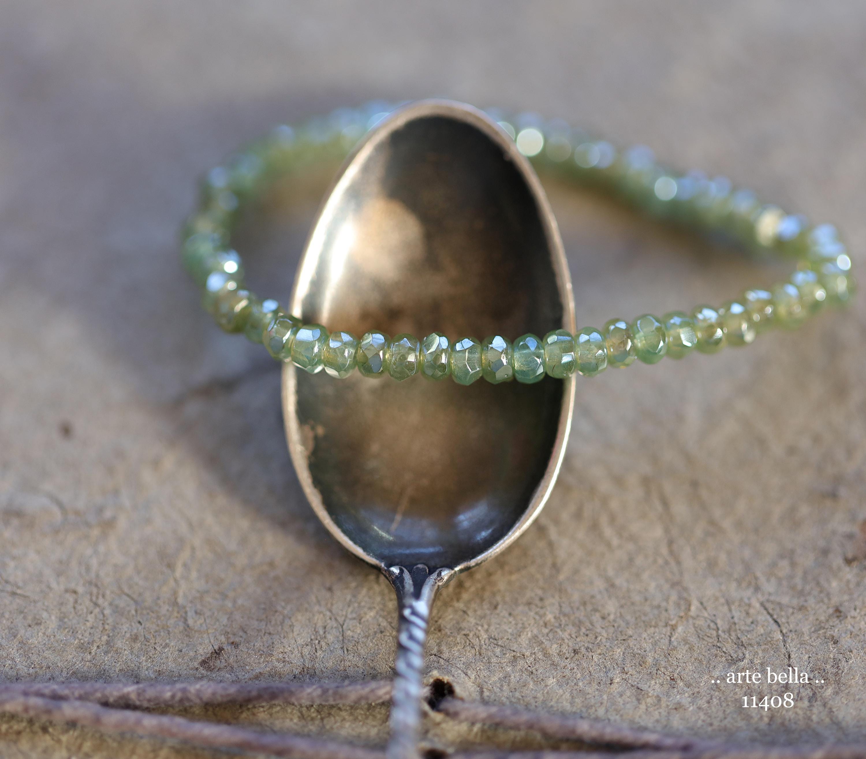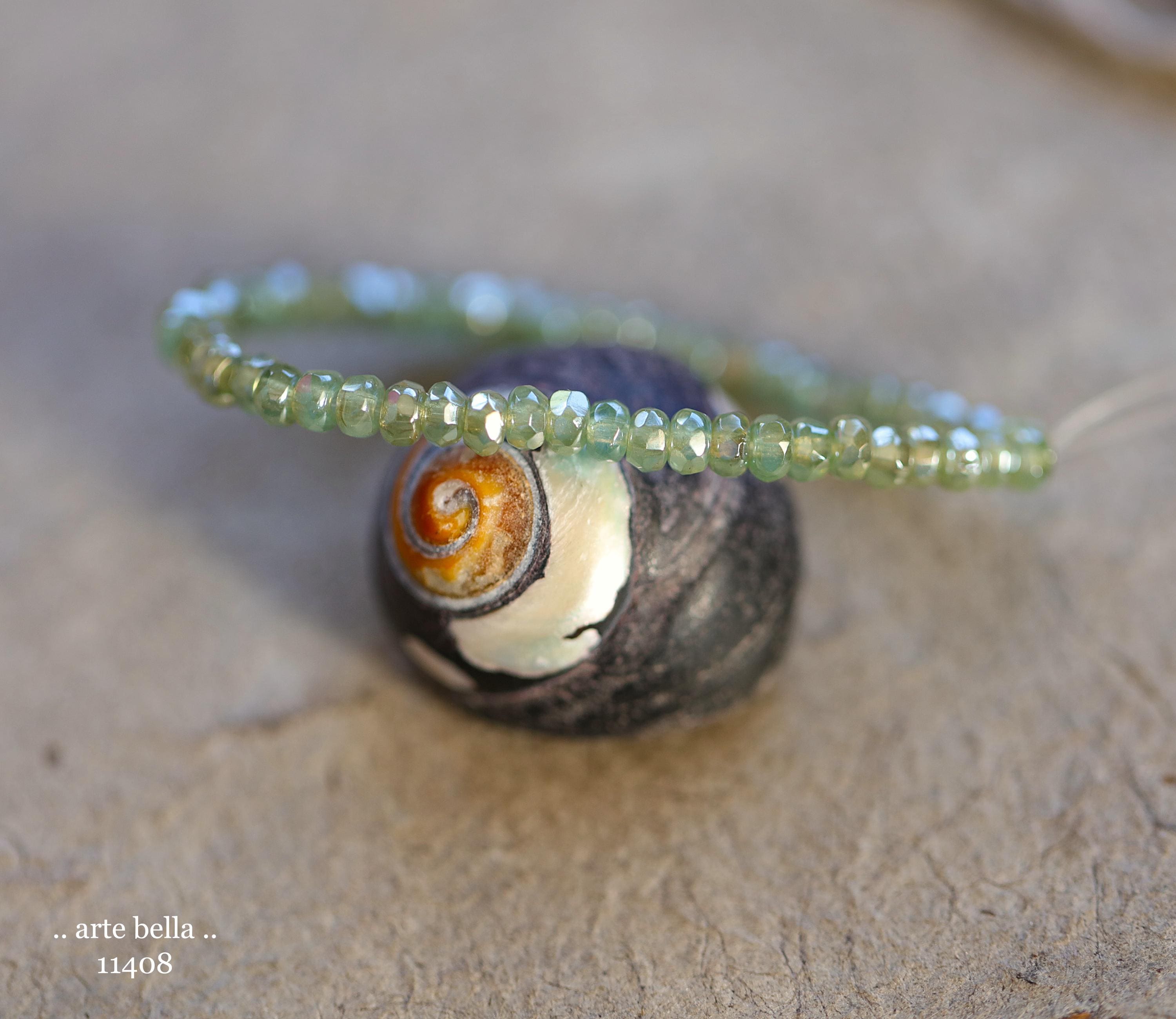 Tiny micro spacers in sage/eucalyptus green glass with a silver metallic luster finish. Super crisp gemstone cut facets give these lots of sparkle. Great for spacer beads!
