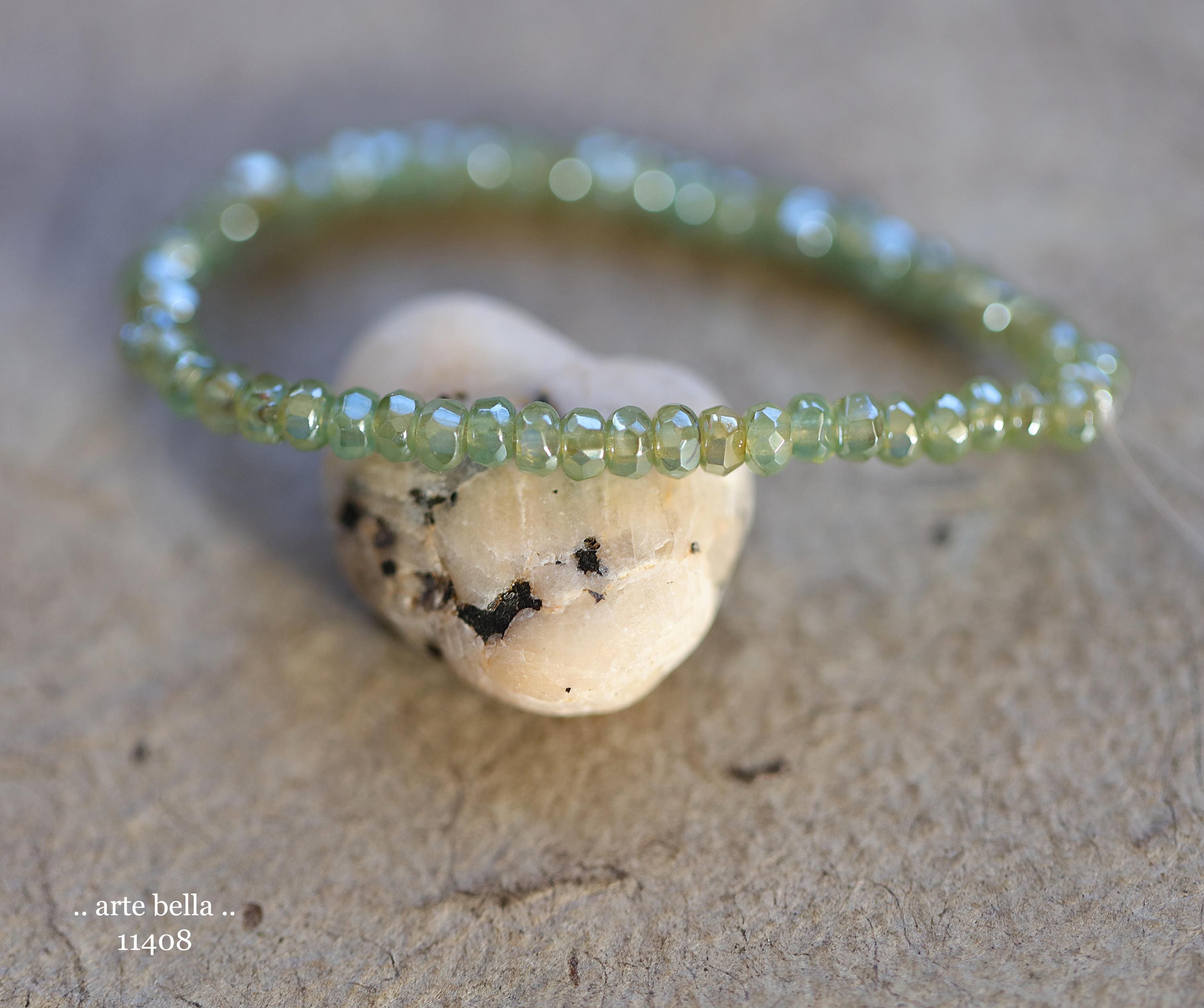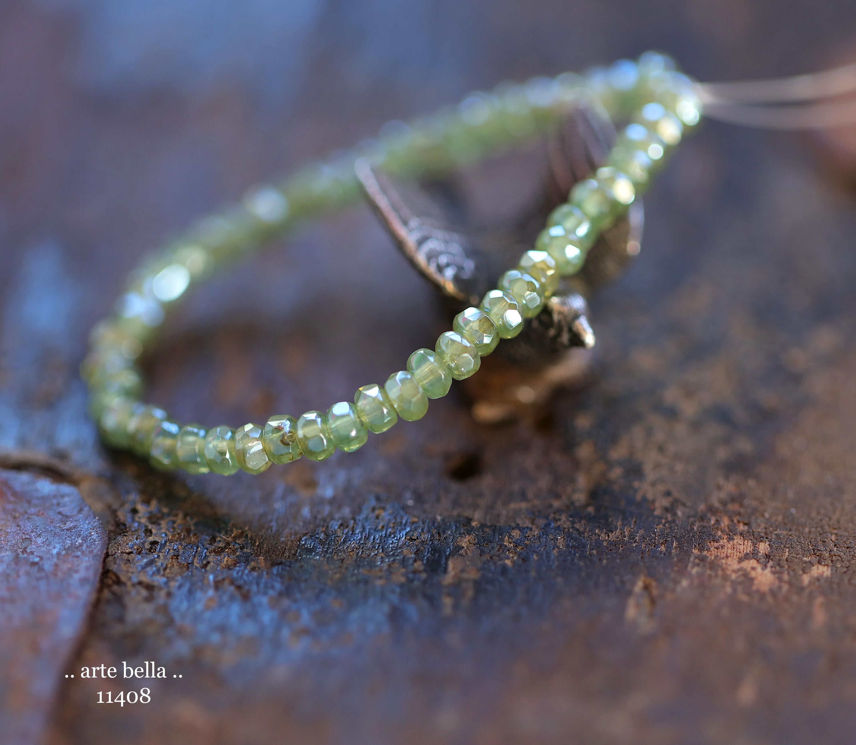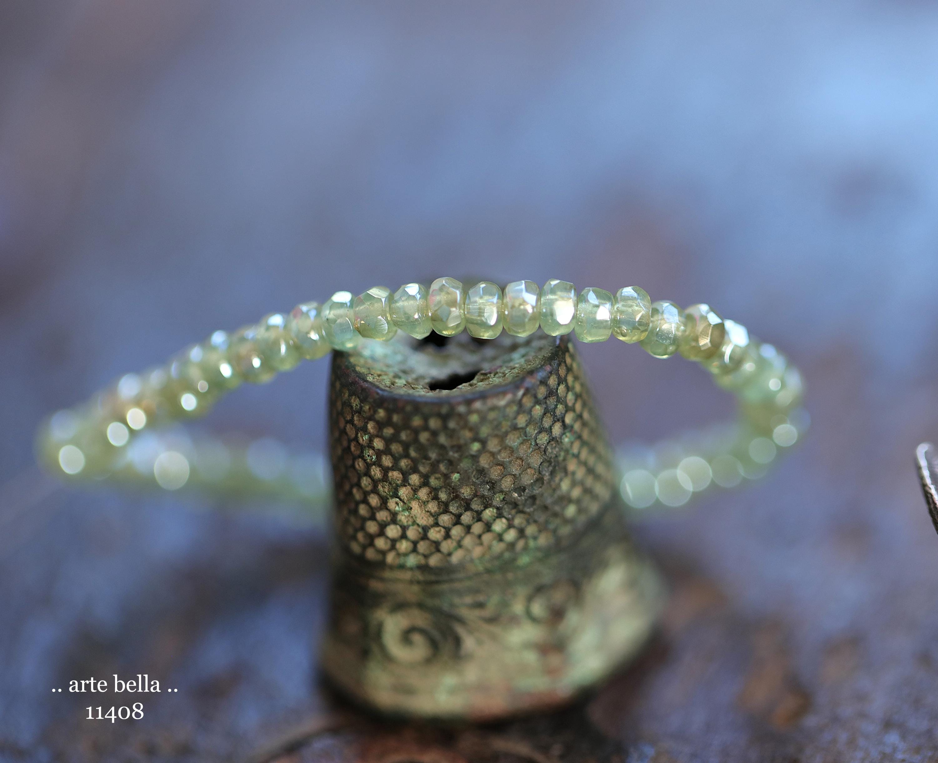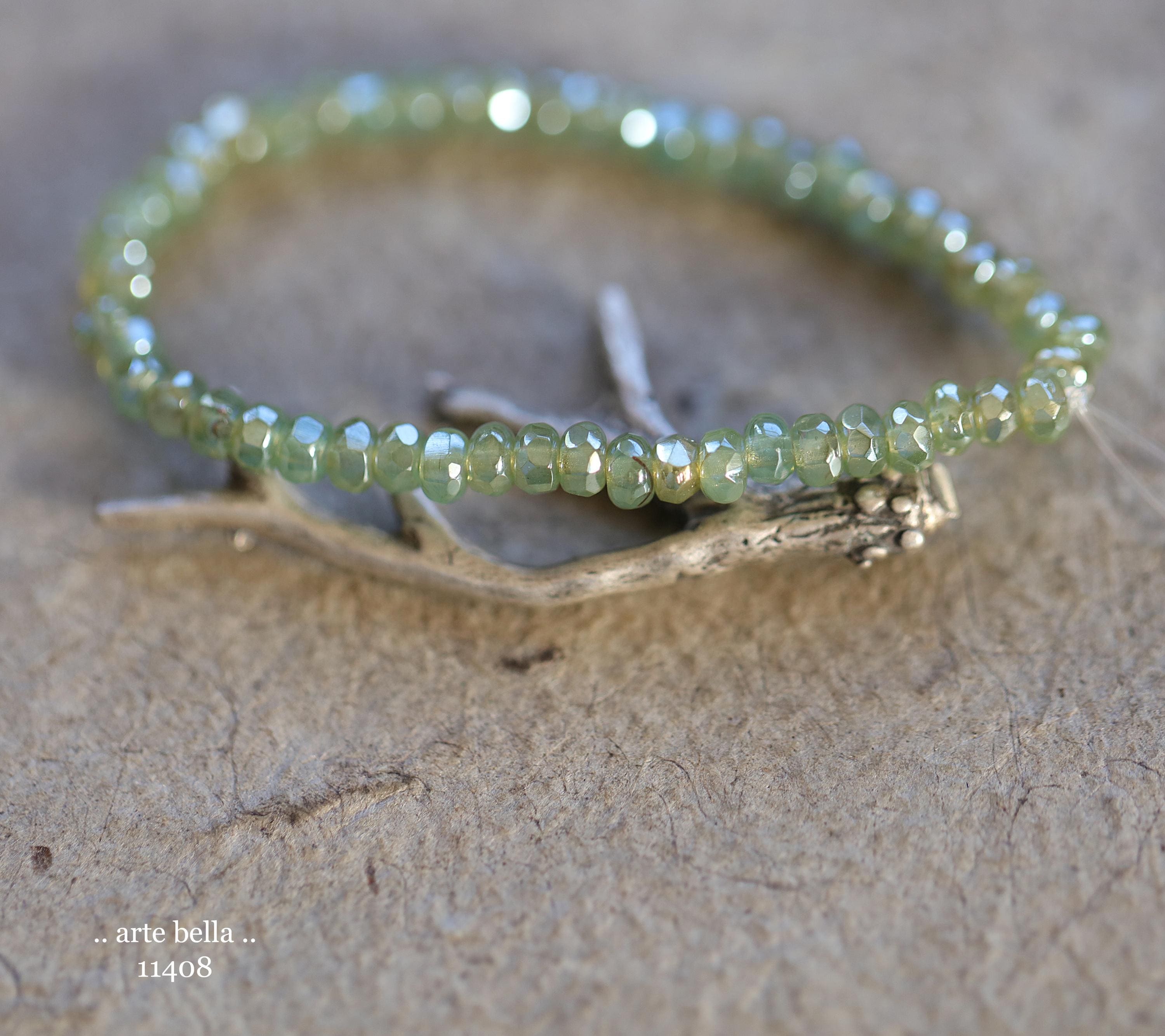 Tiny micro spacers in sage/eucalyptus green glass with a silver metallic luster finish. Super crisp gemstone cut facets give these lots of sparkle. Great for spacer beads!