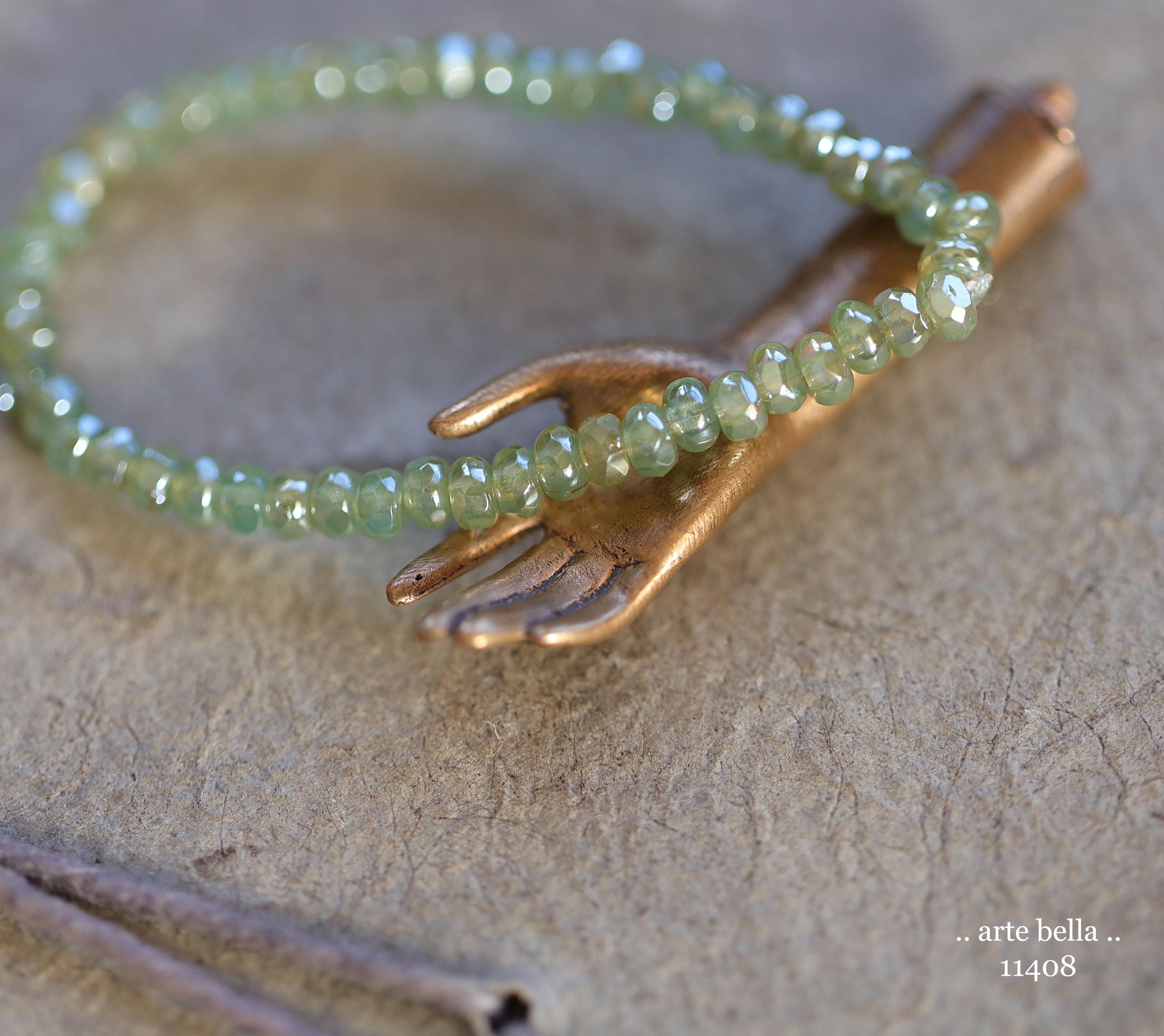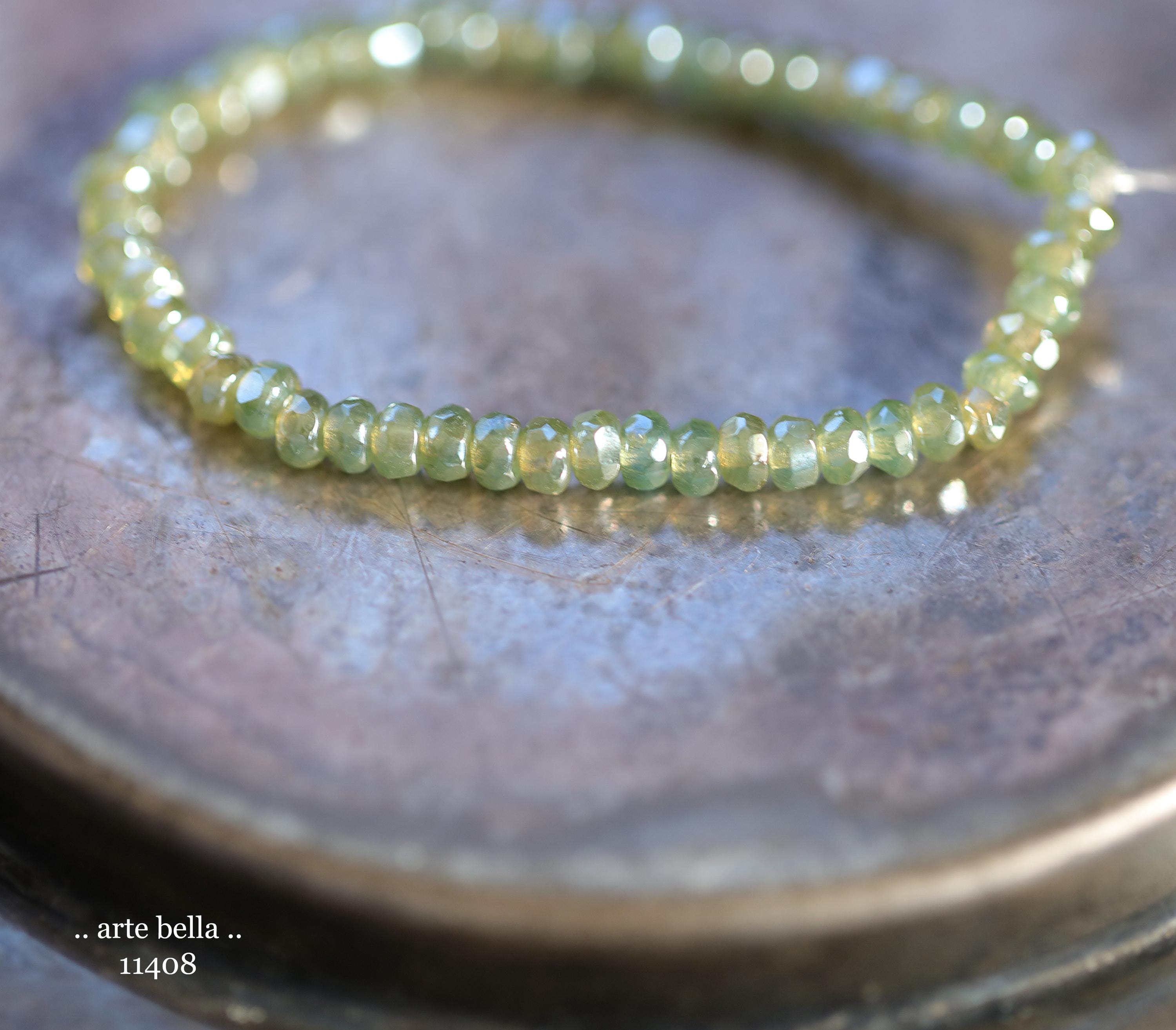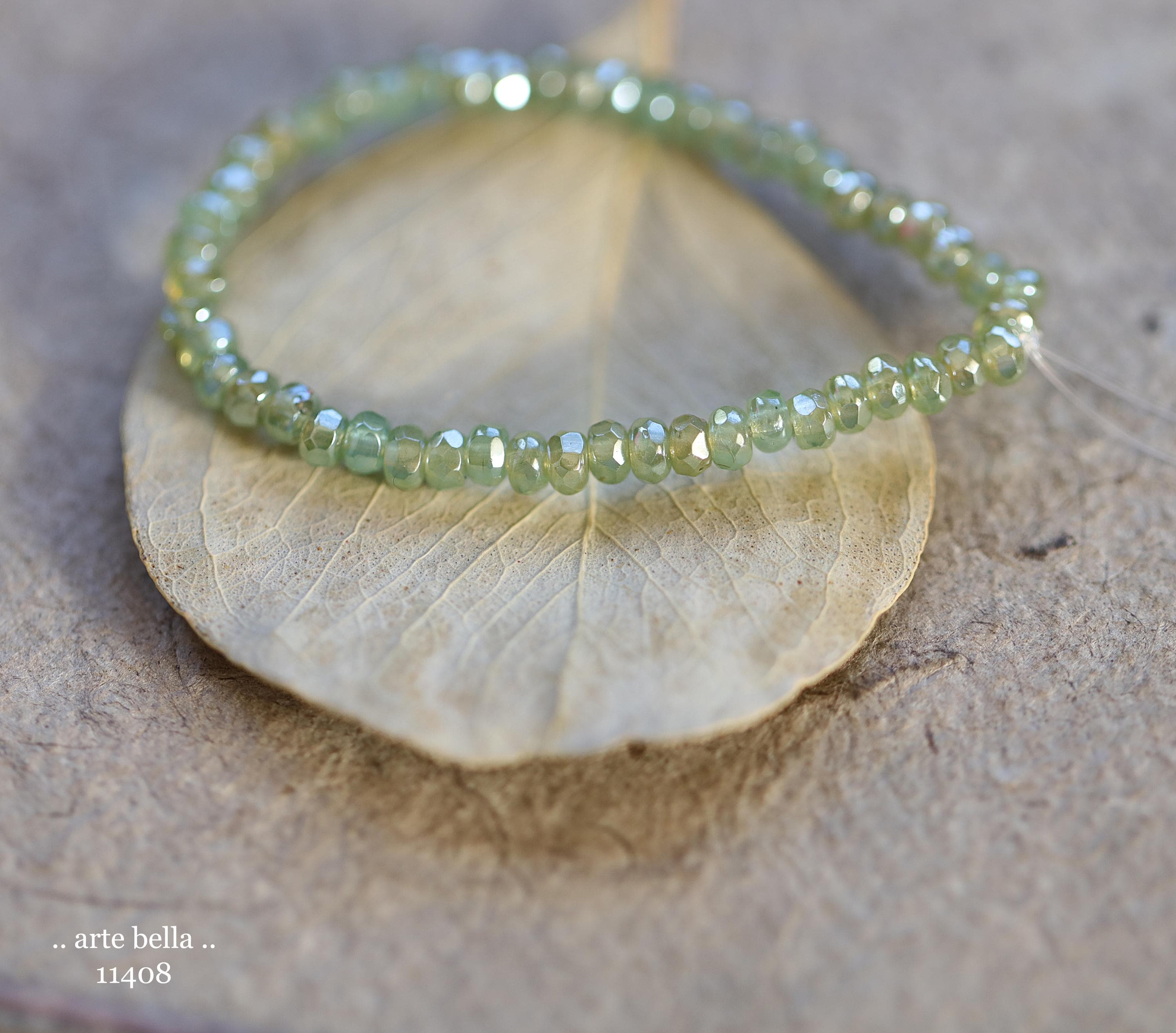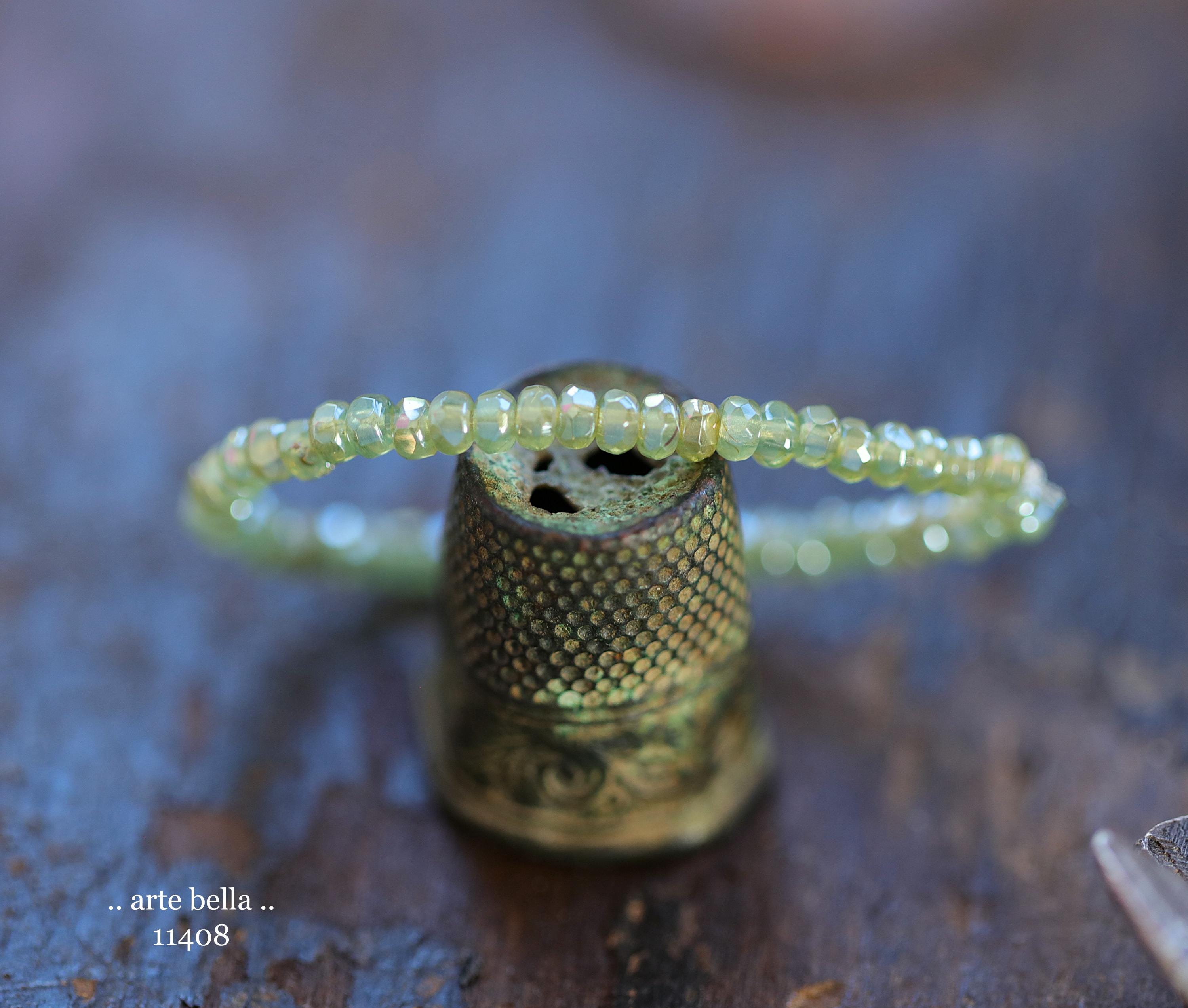 Tiny micro spacers in sage/eucalyptus green glass with a silver metallic luster finish. Super crisp gemstone cut facets give these lots of sparkle. Great for spacer beads!