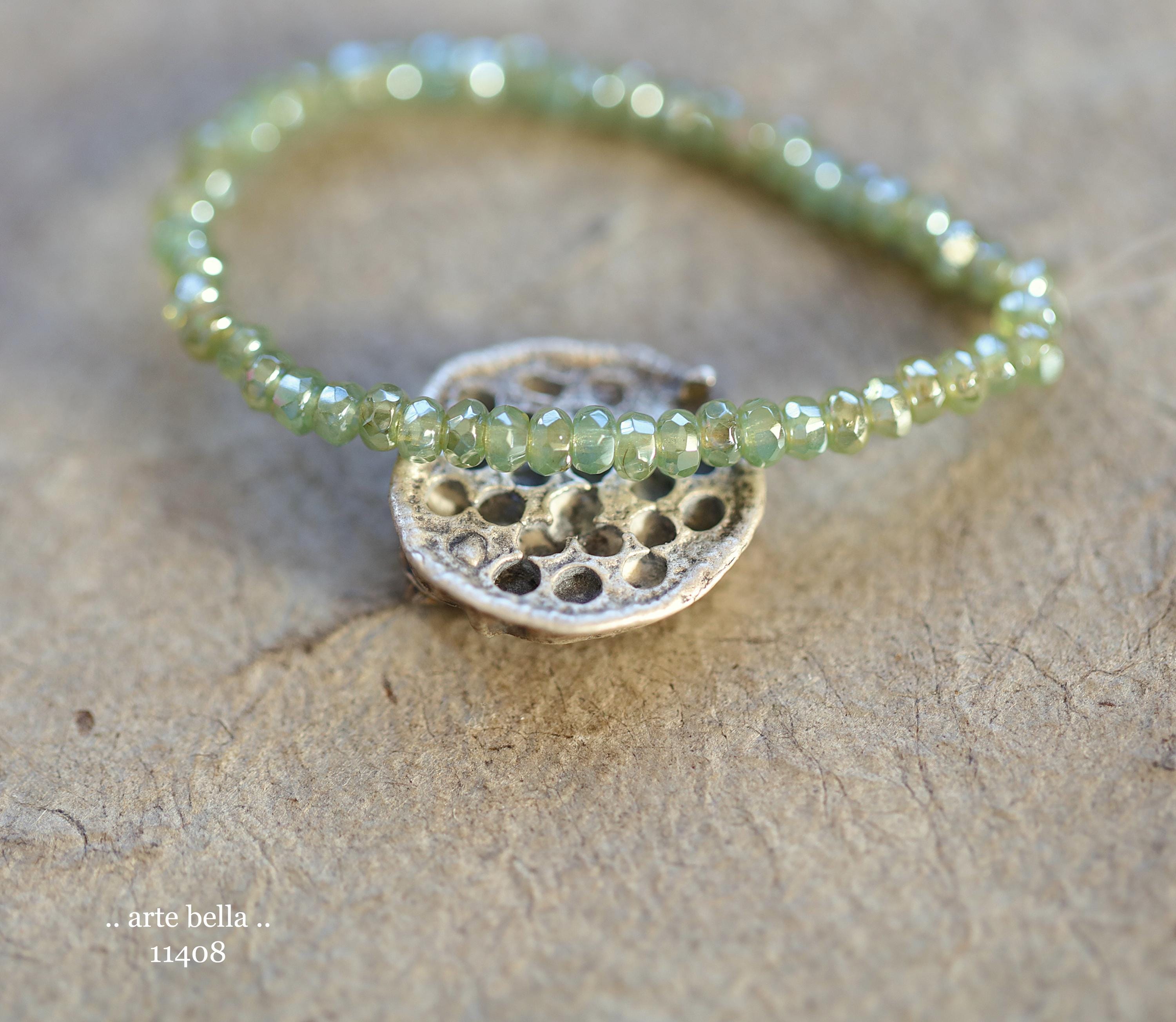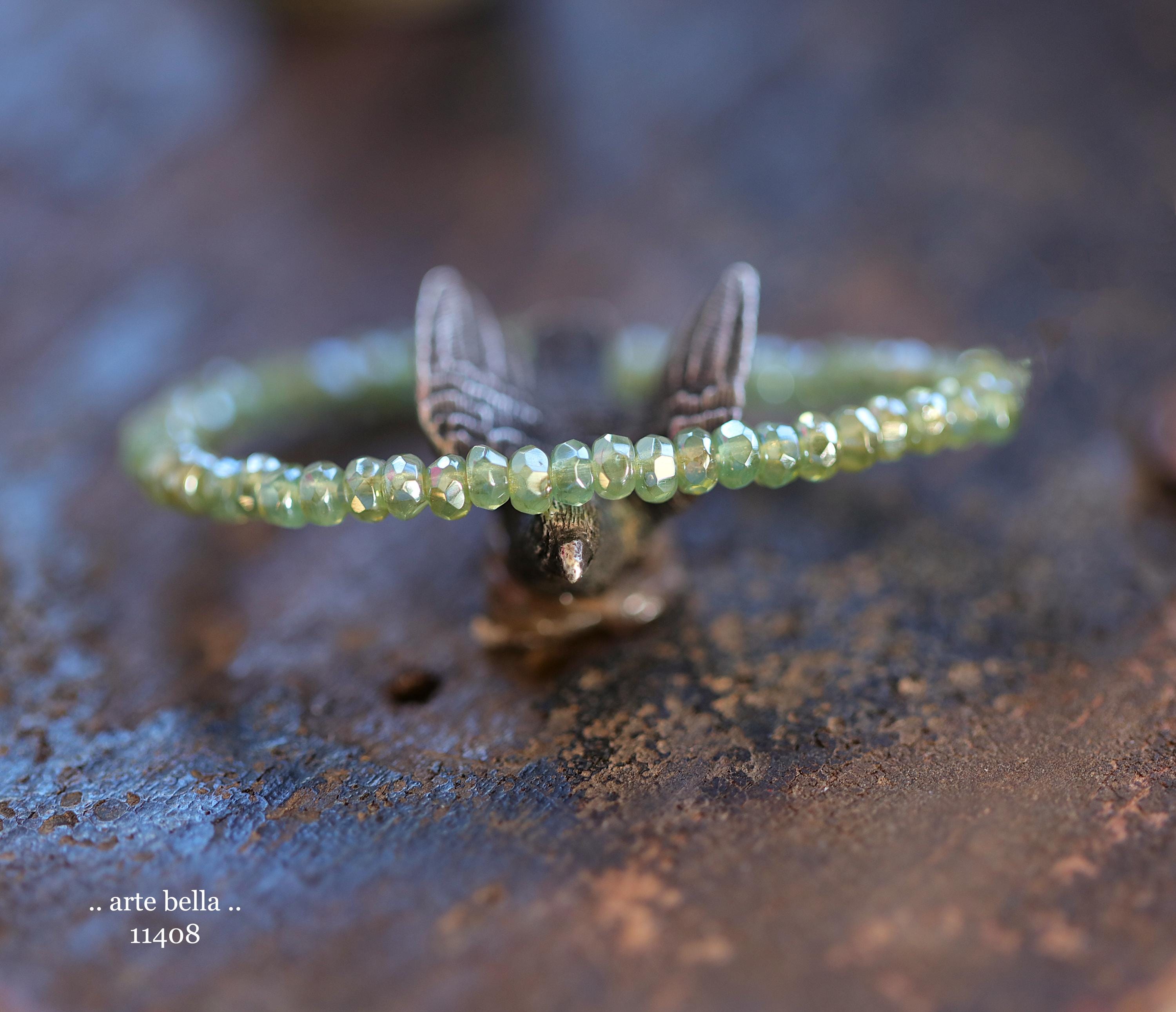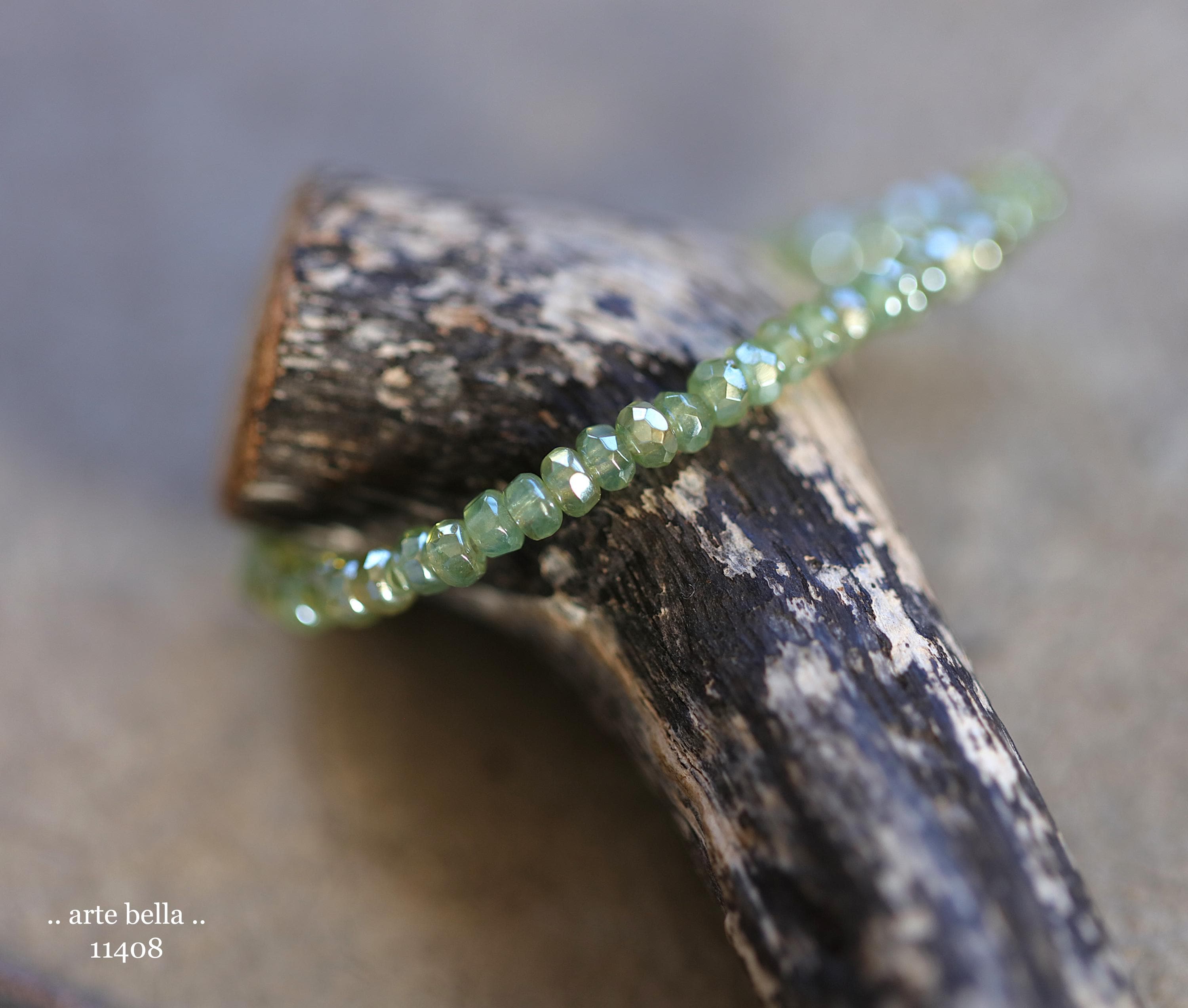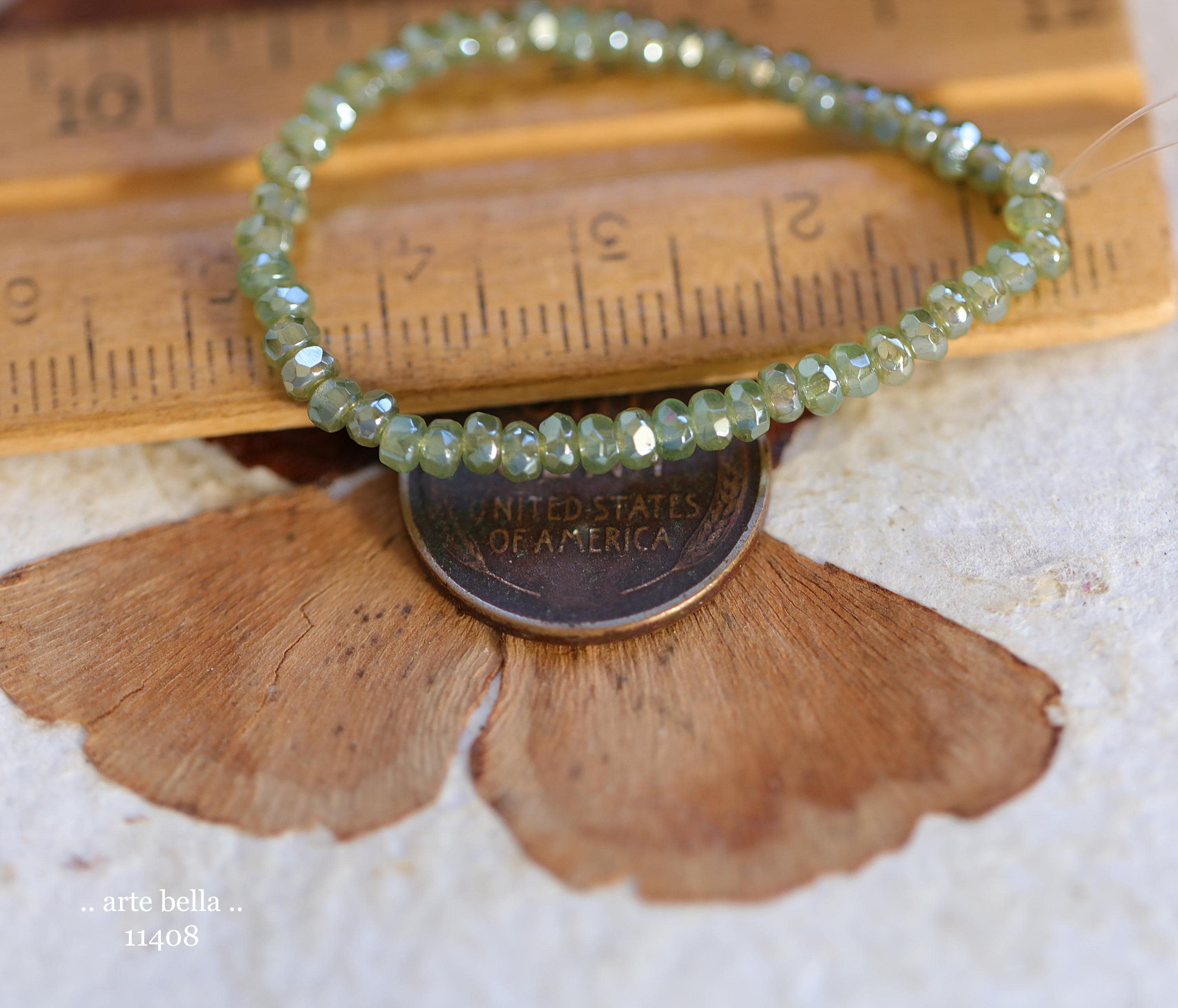 Tiny micro spacers in sage/eucalyptus green glass with a silver metallic luster finish. Super crisp gemstone cut facets give these lots of sparkle. Great for spacer beads!