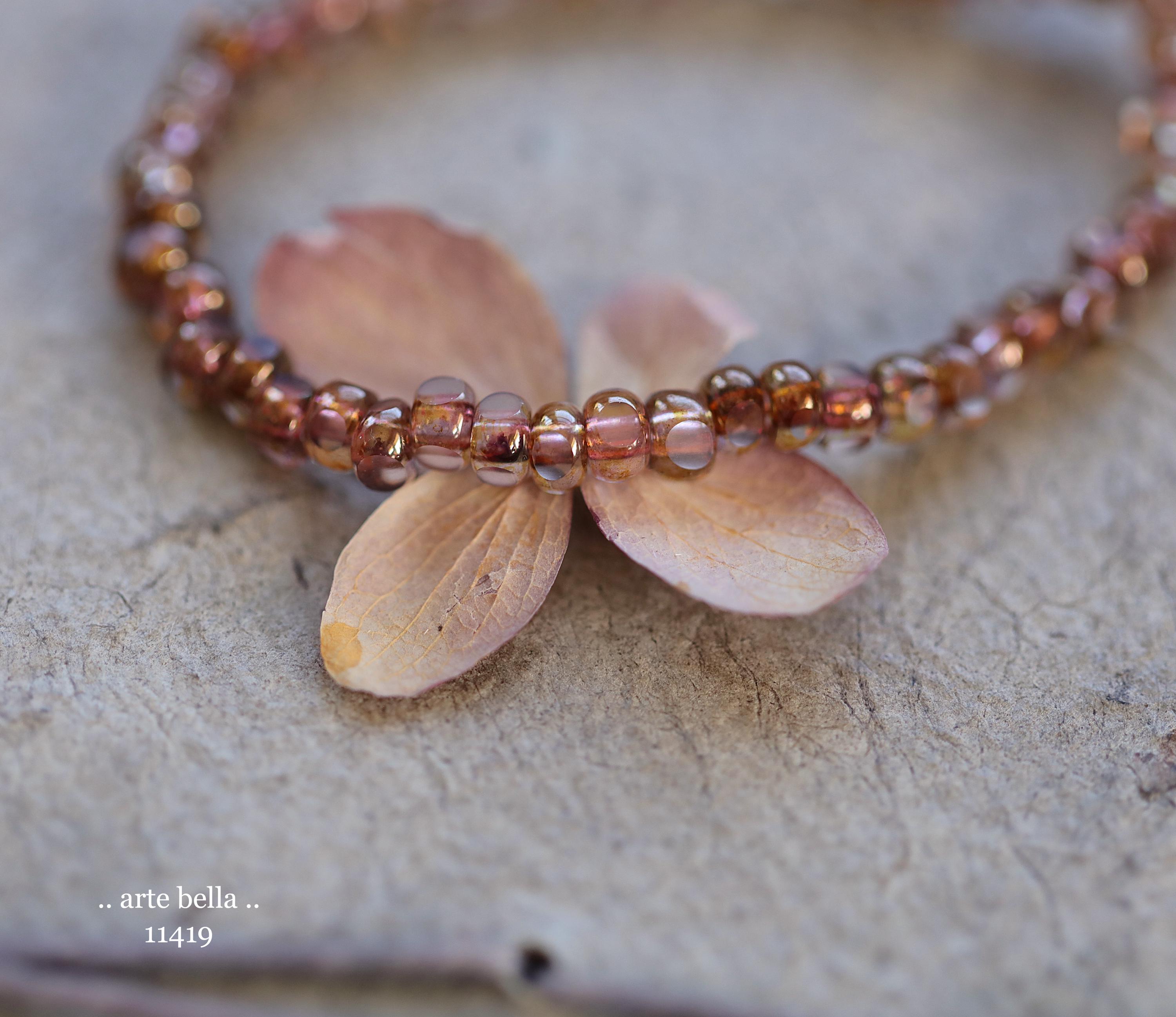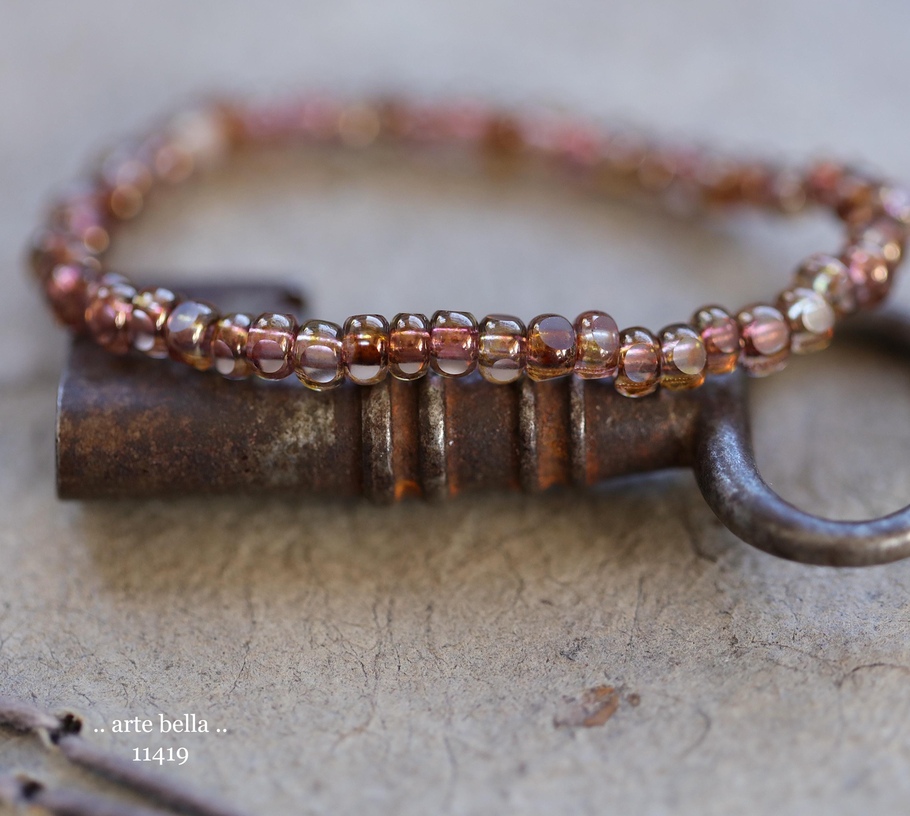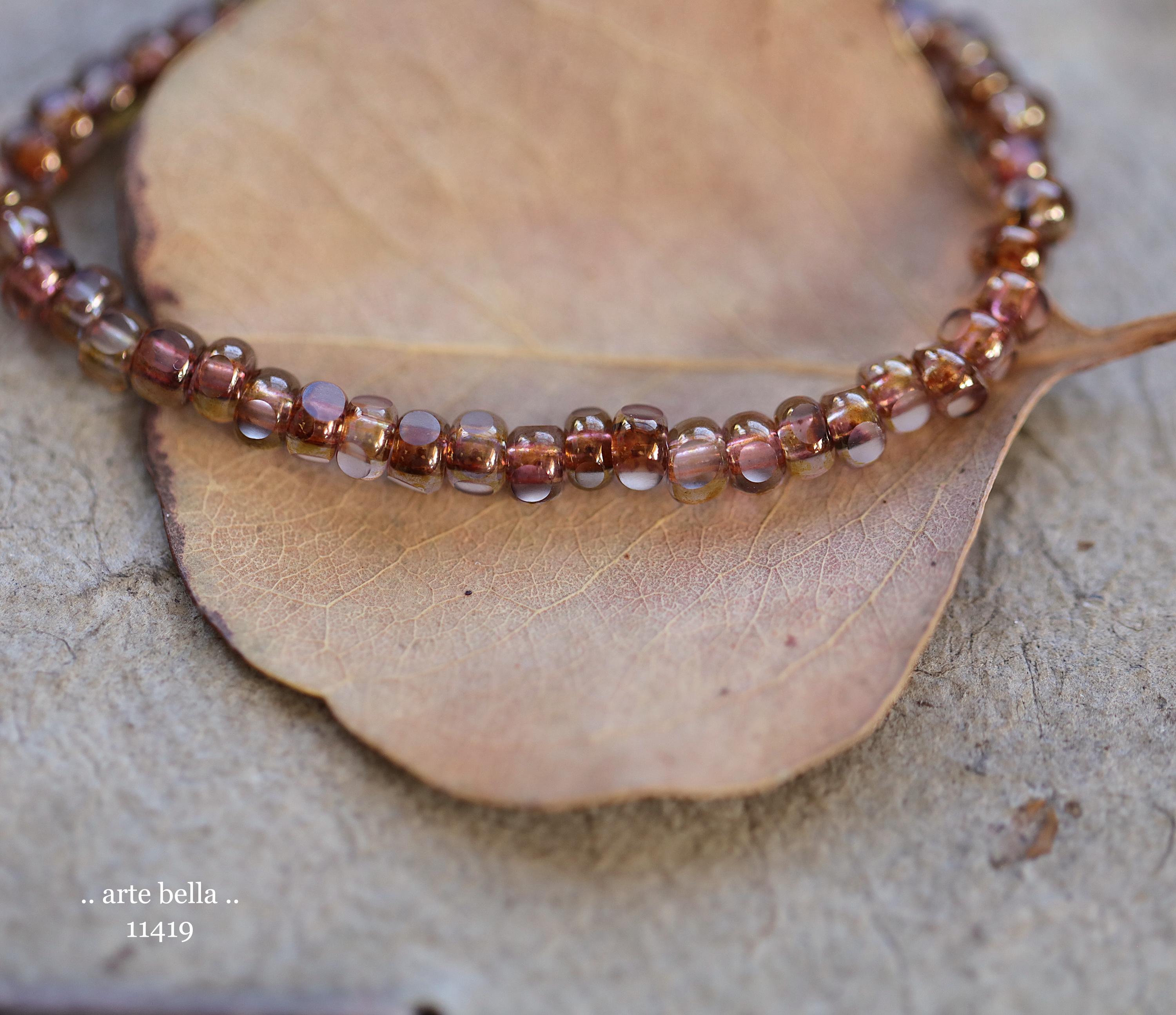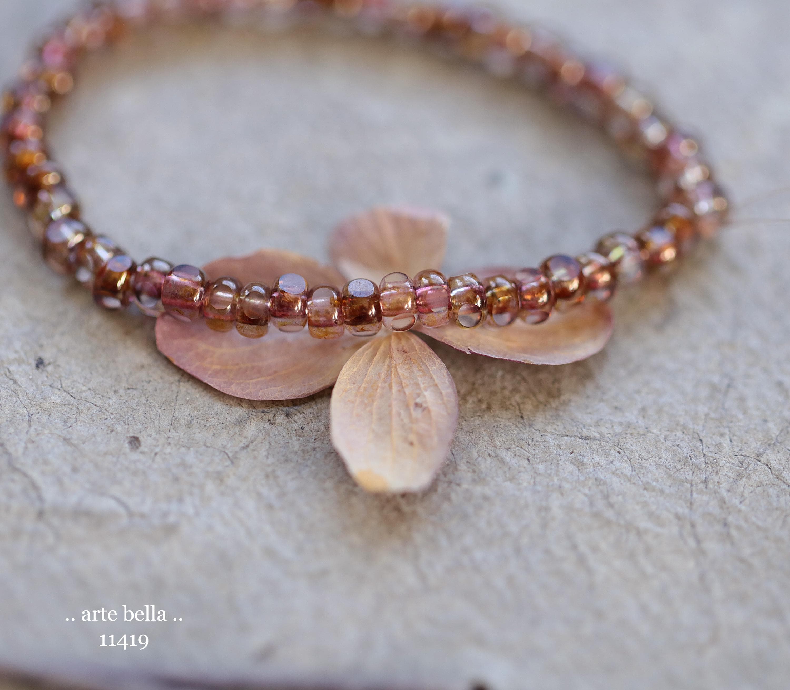Gorgeous faceted seed beads in matte clear glass with a golden rose pink metallic luster finish, matte facets. **PLEASE NOTE: I did notice that some beads are not perfectly faceted due to the handmade nature. Size of the beads do vary, please take this into account before ordering if you require beads to be a precise size for your project.**