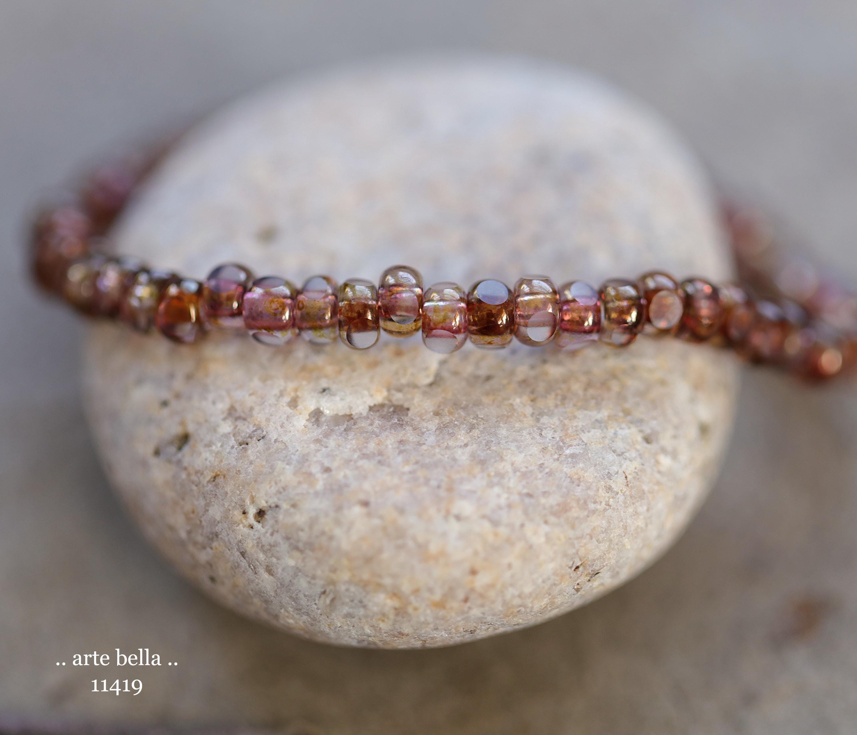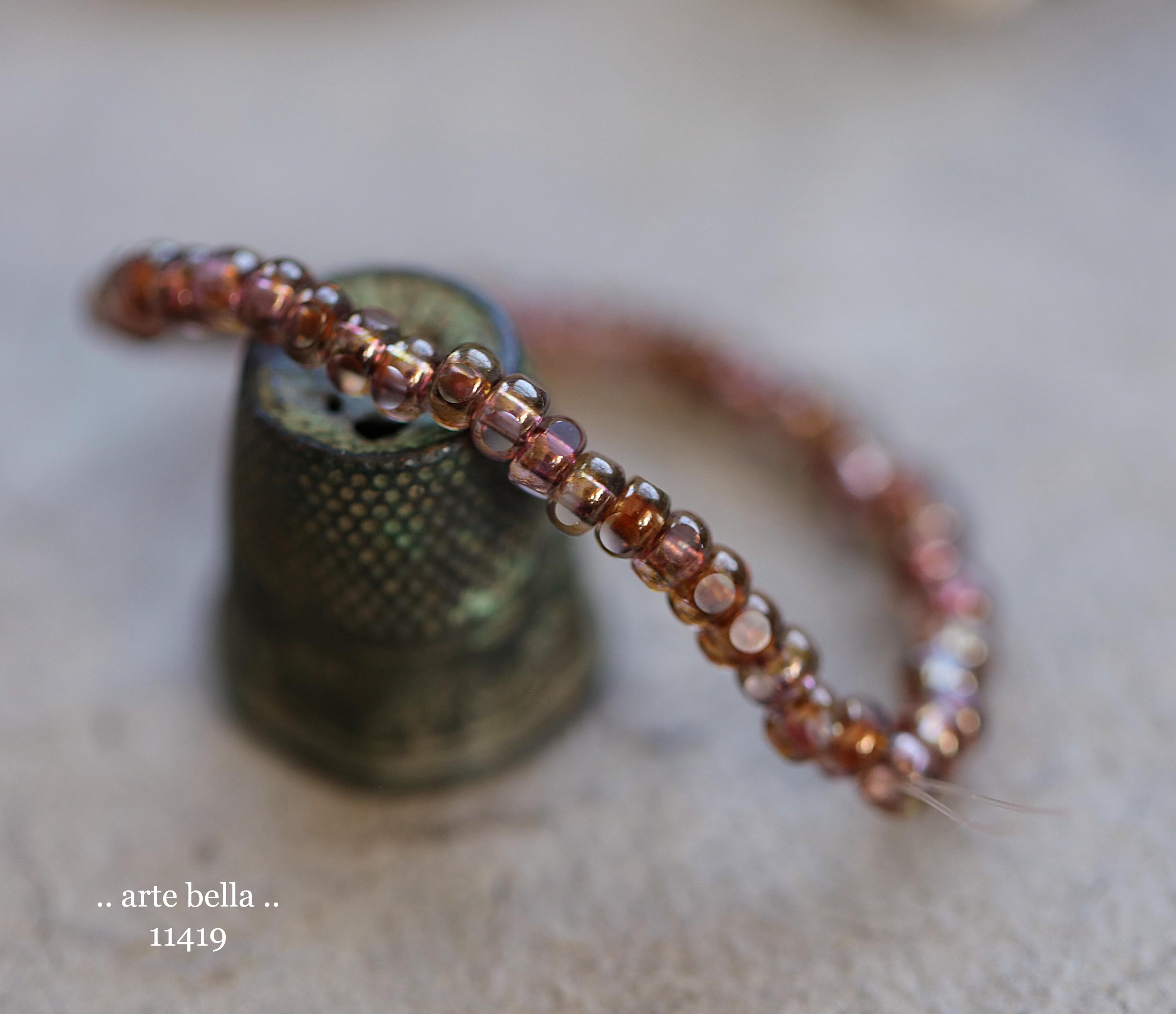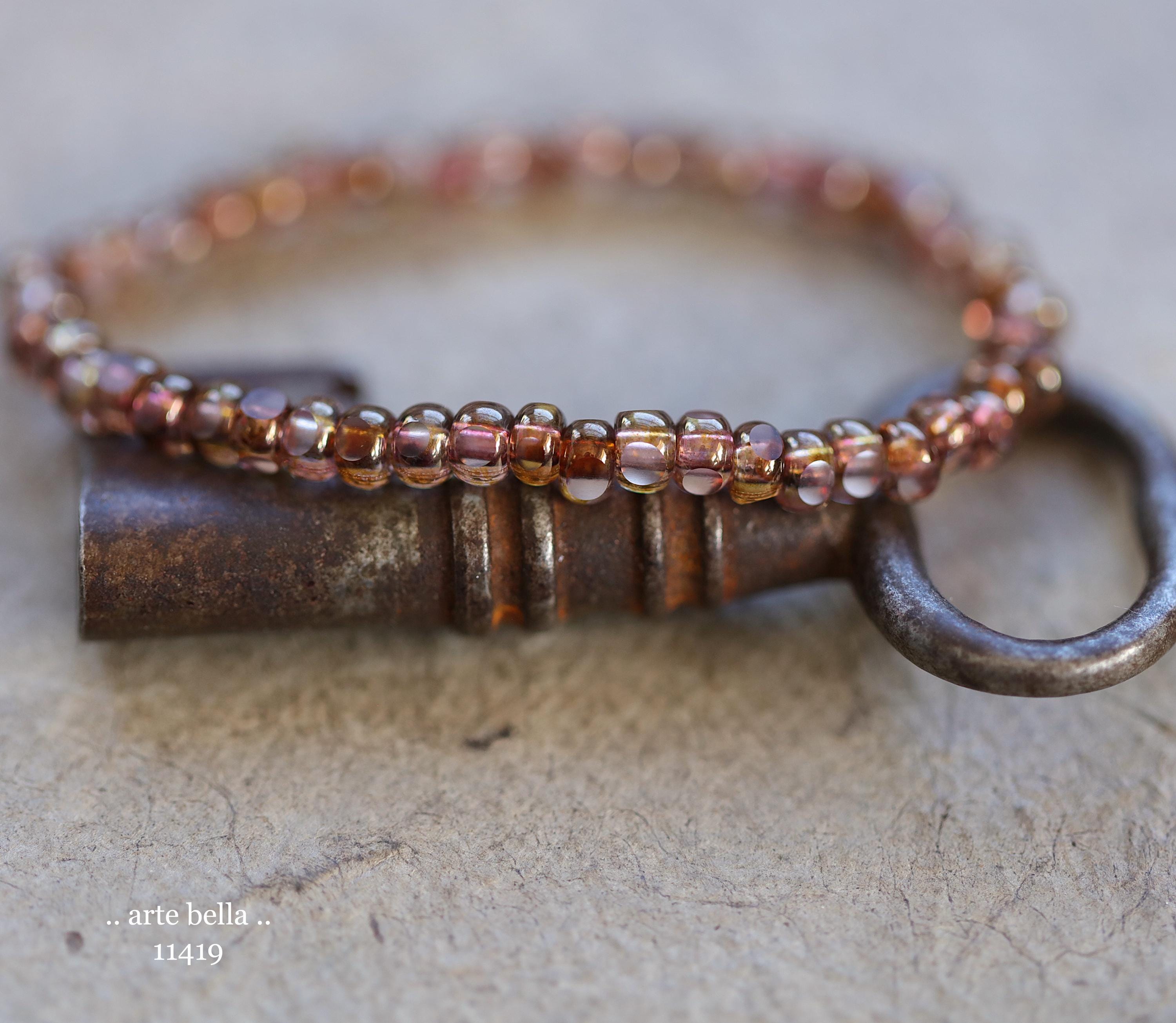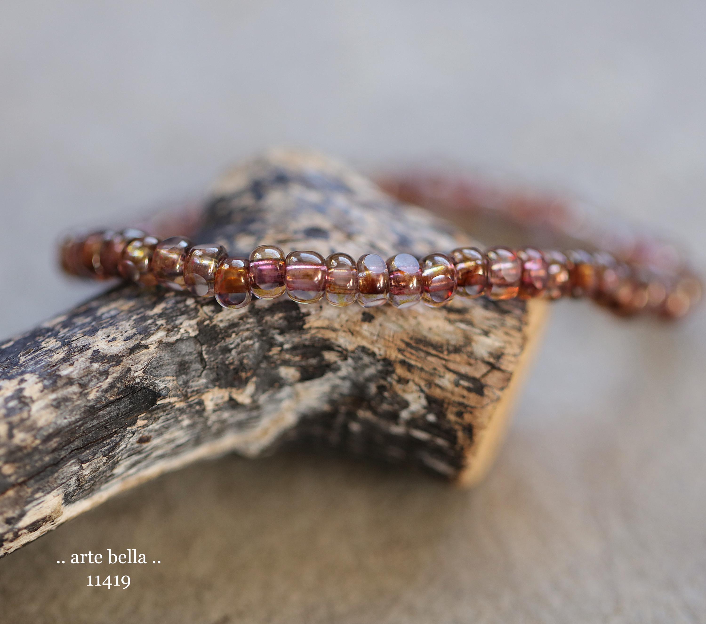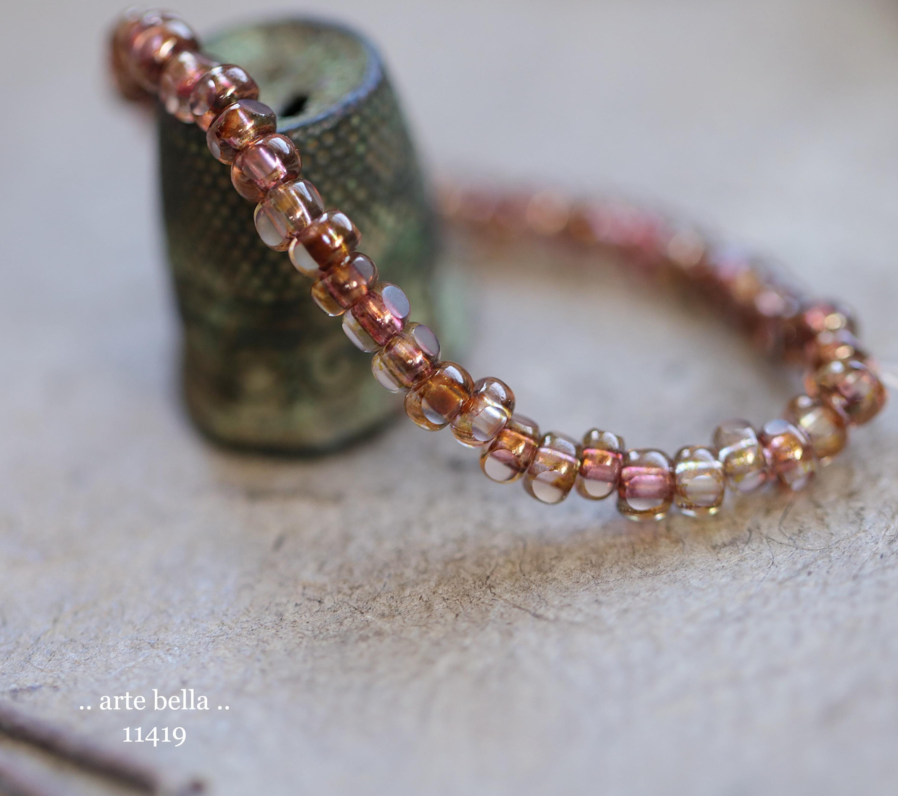Gorgeous faceted seed beads in matte clear glass with a golden rose pink metallic luster finish, matte facets. **PLEASE NOTE: I did notice that some beads are not perfectly faceted due to the handmade nature. Size of the beads do vary, please take this into account before ordering if you require beads to be a precise size for your project.**