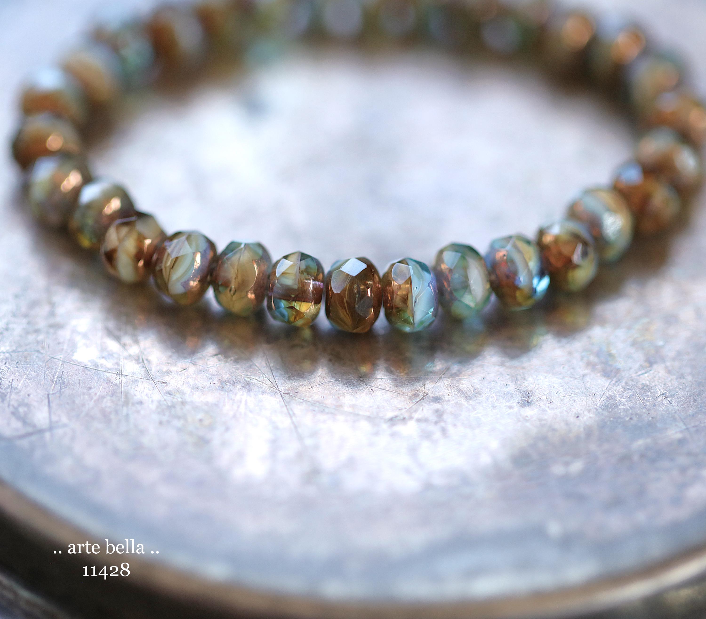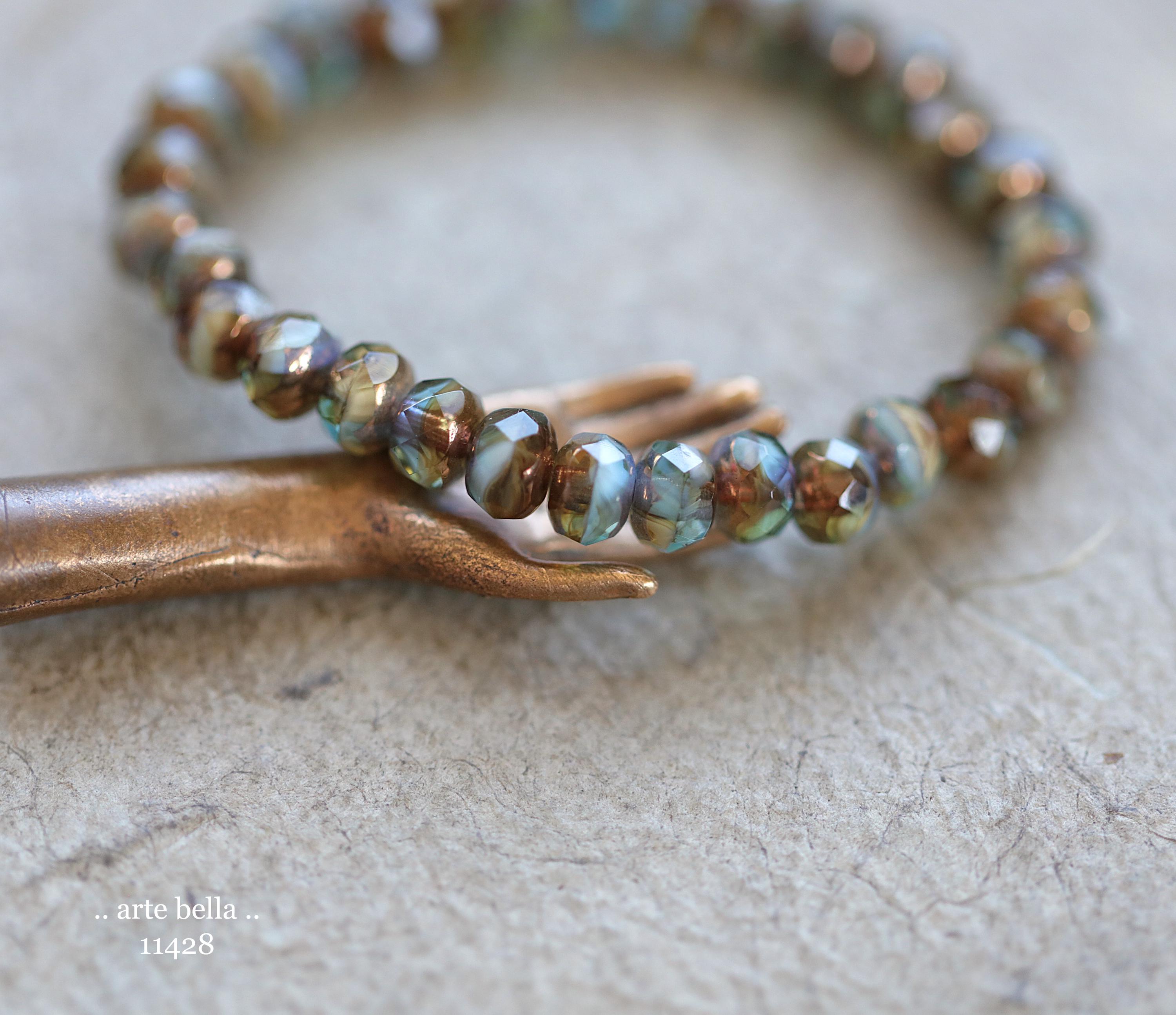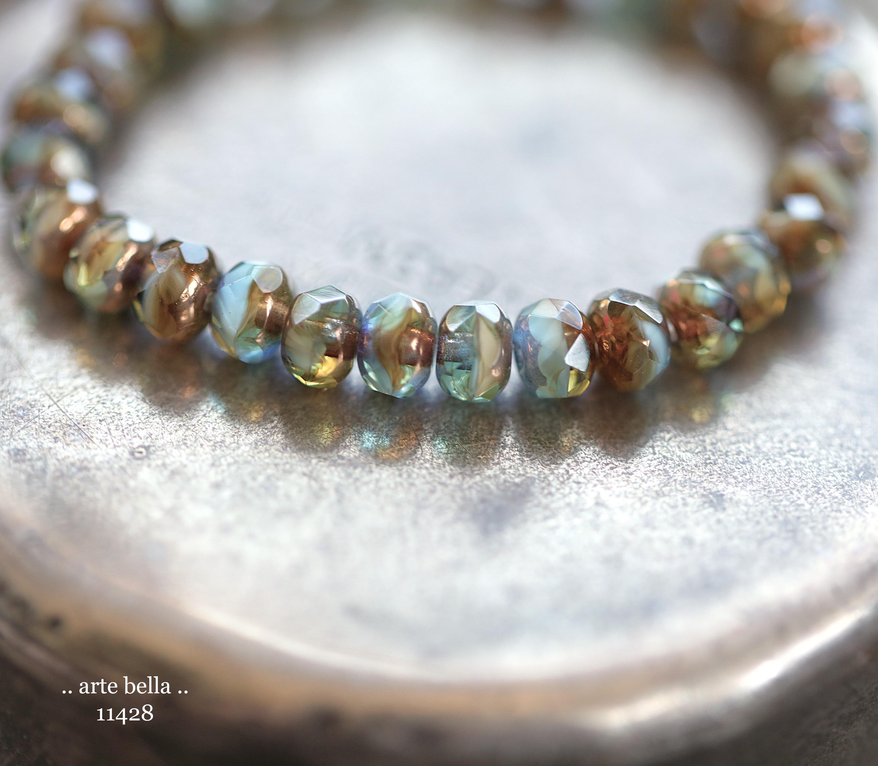 Pretty bead mix in translucent aqua blue, golden amber and opaque white glass with a bronze metallic luster around the bead hole, crisp fire polished facets.