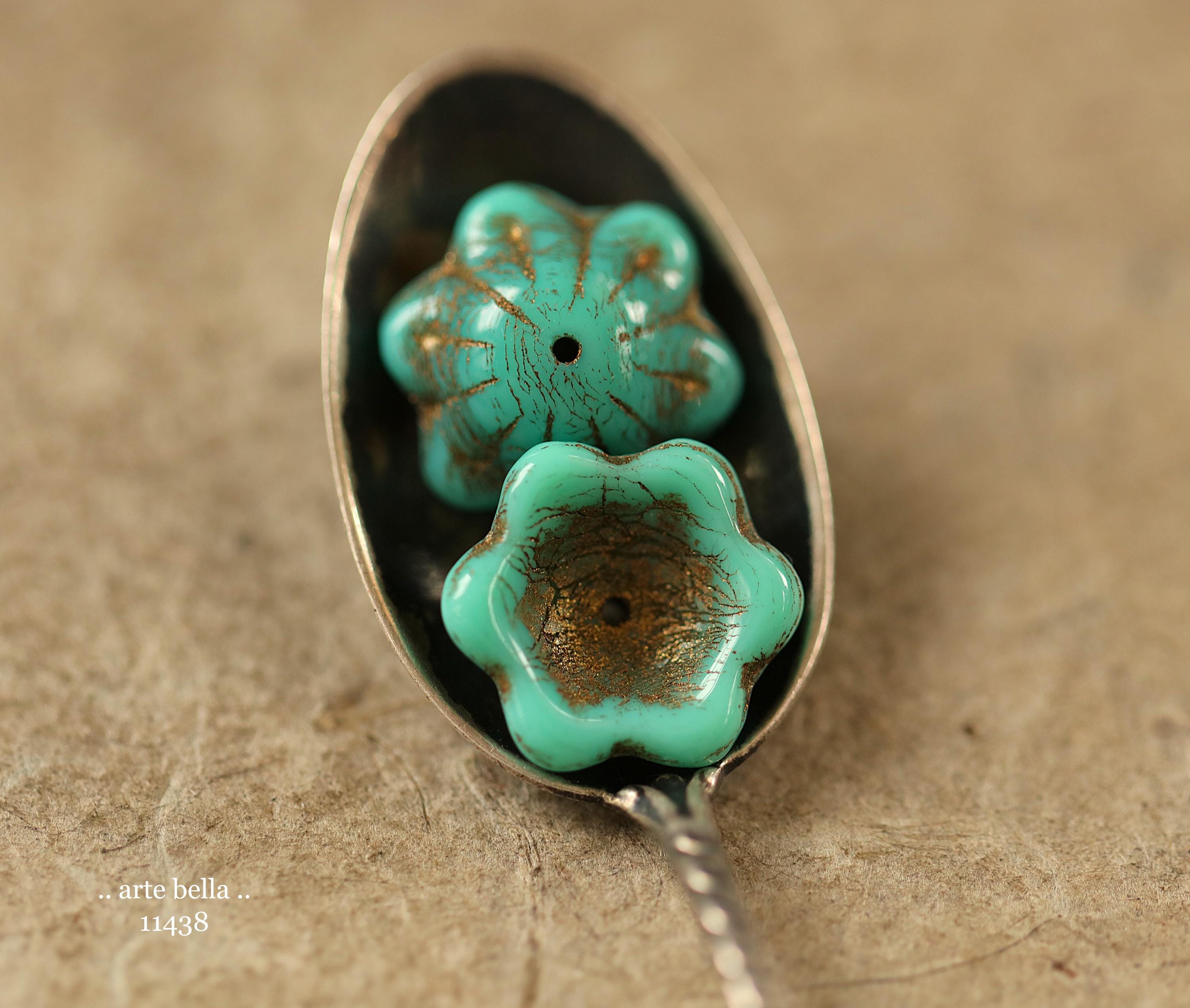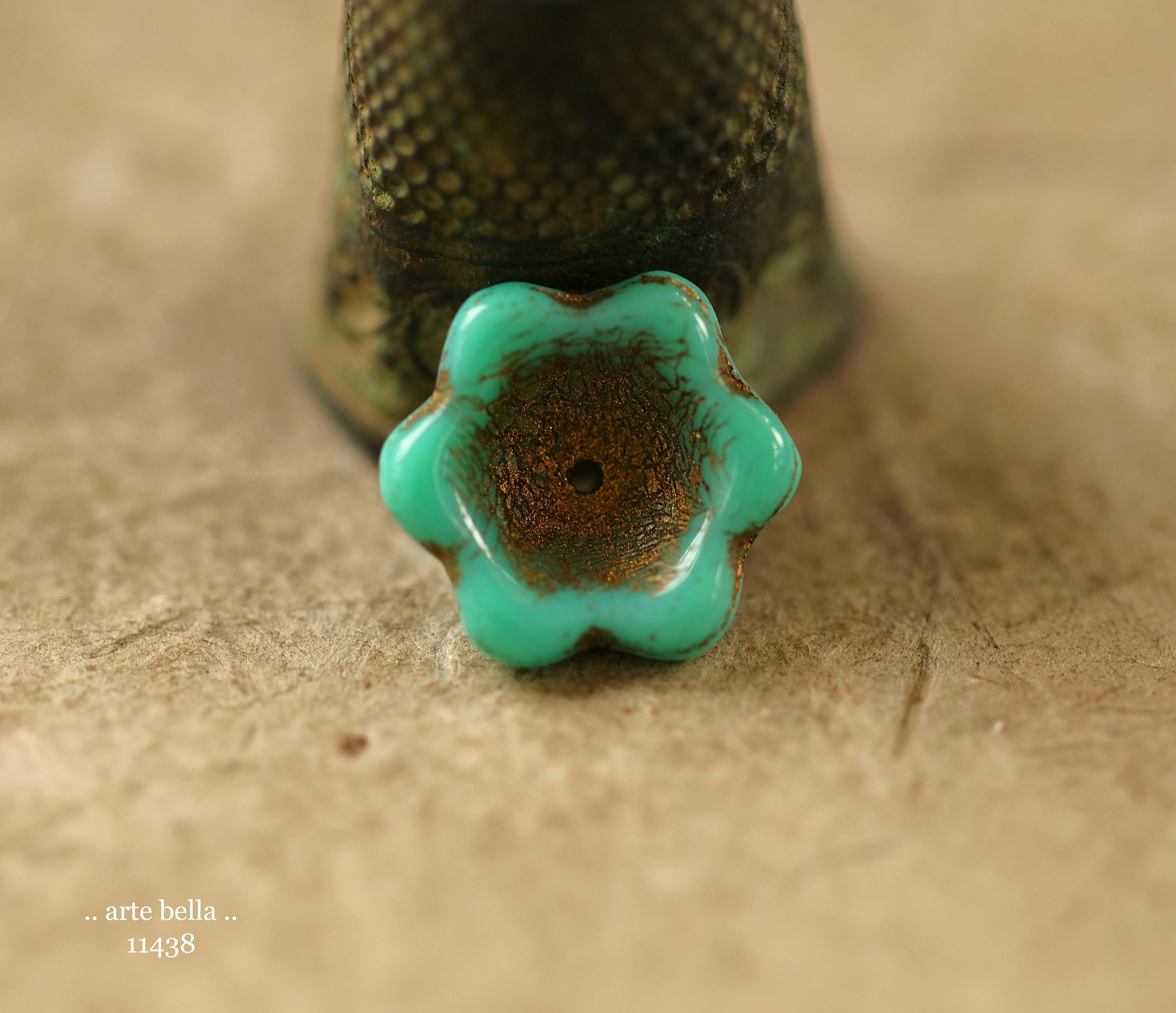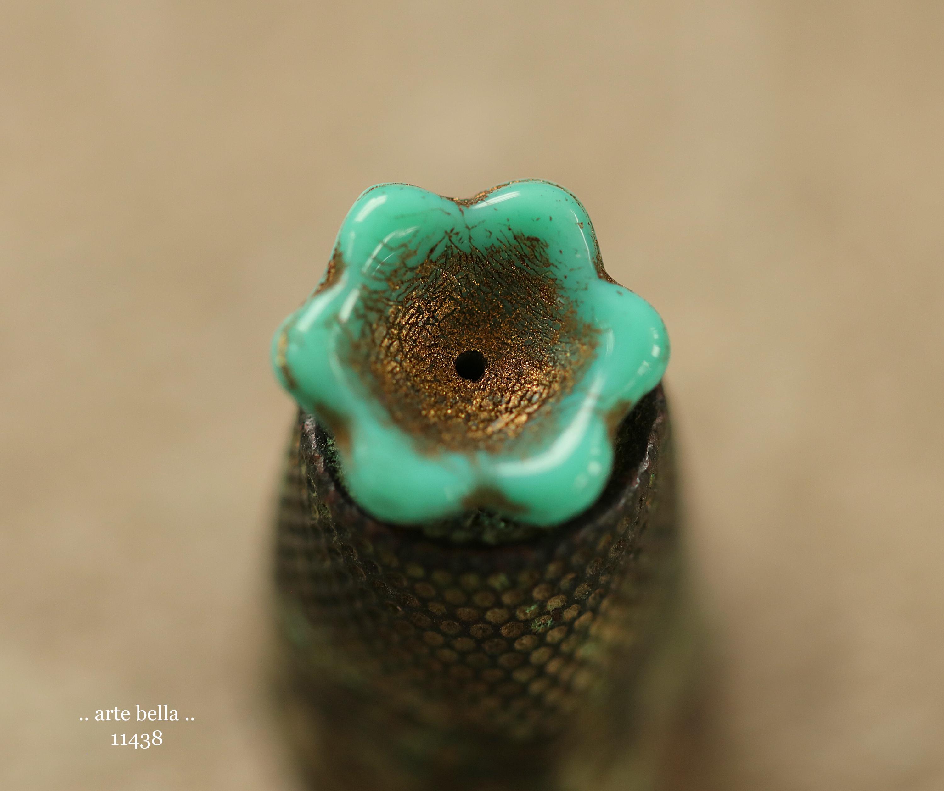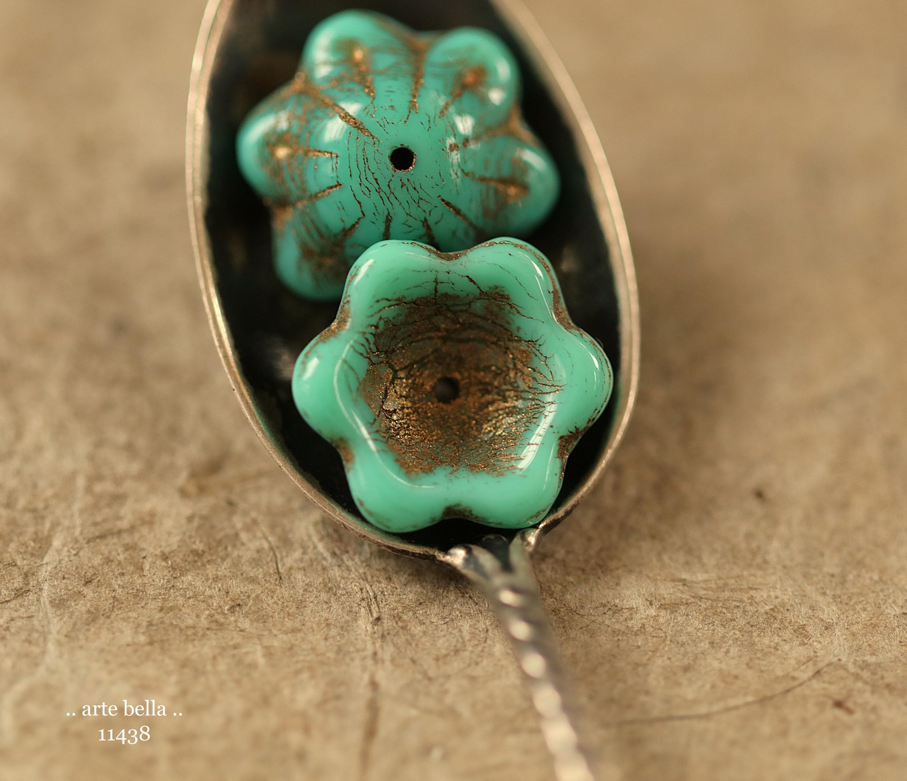 New .. BRONZED TURQUOISE WHIMSY .. 20 Premium Czech Glass Bellflower Beads 14x6mm (11438-st) .. jewelry supplies