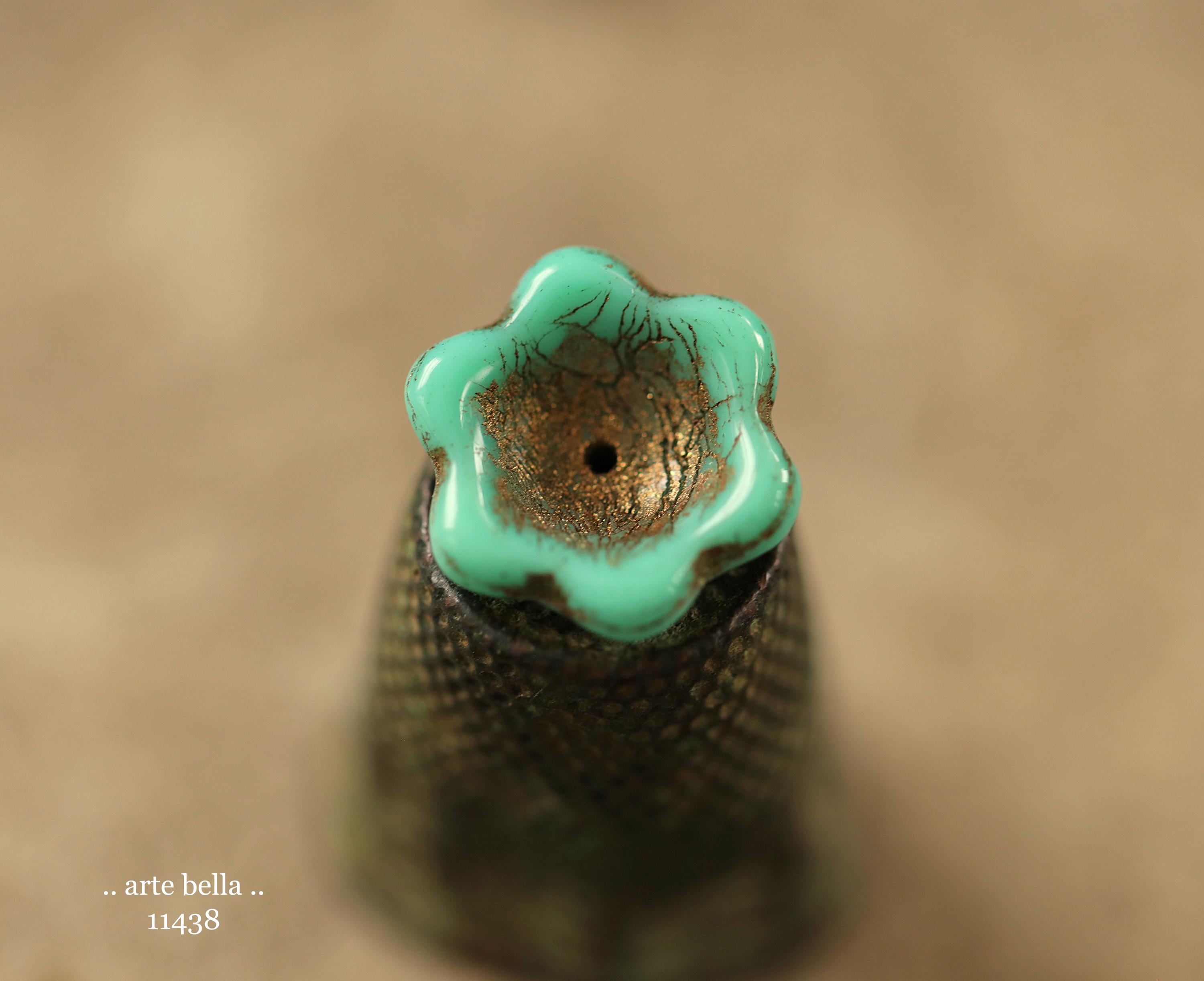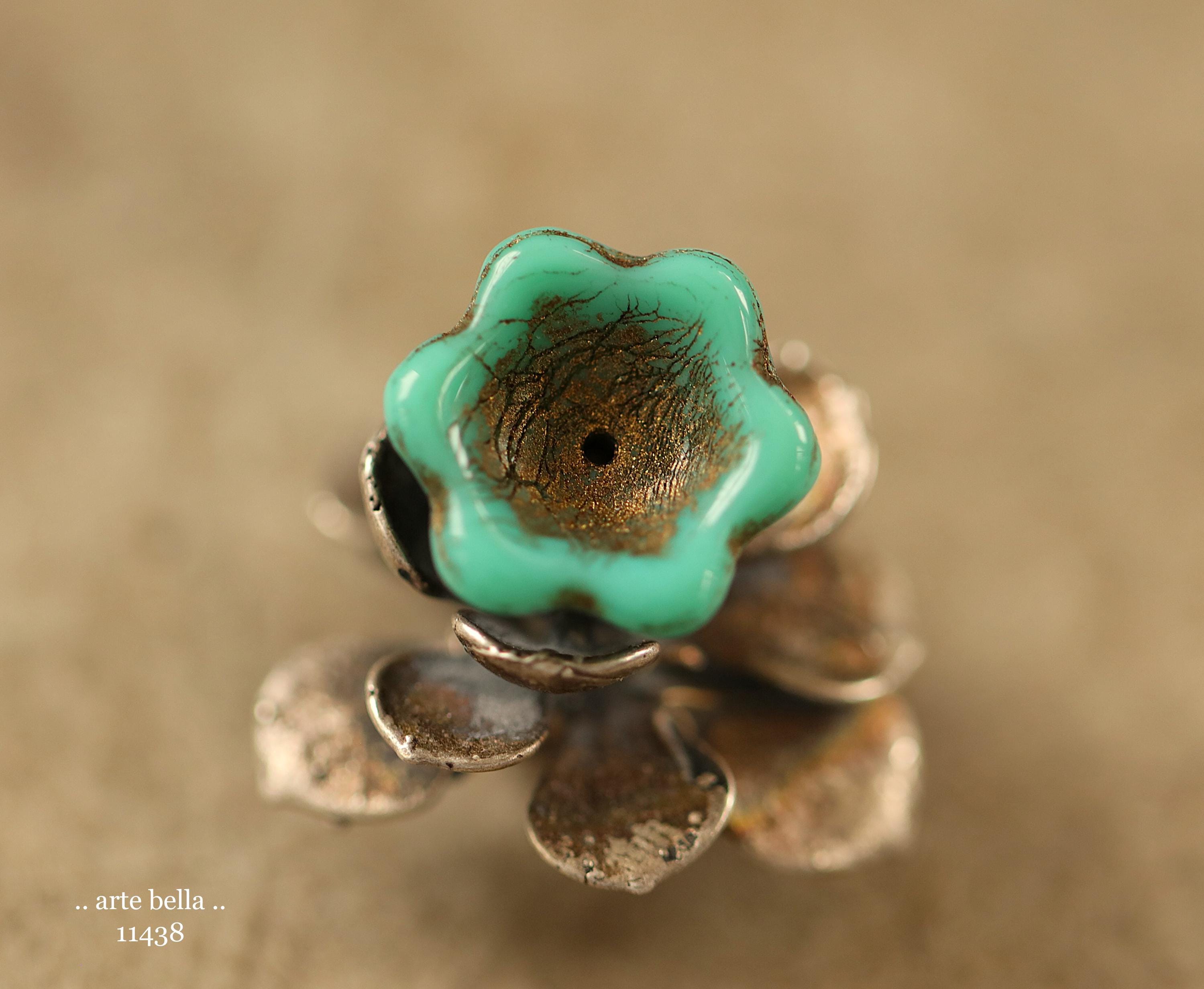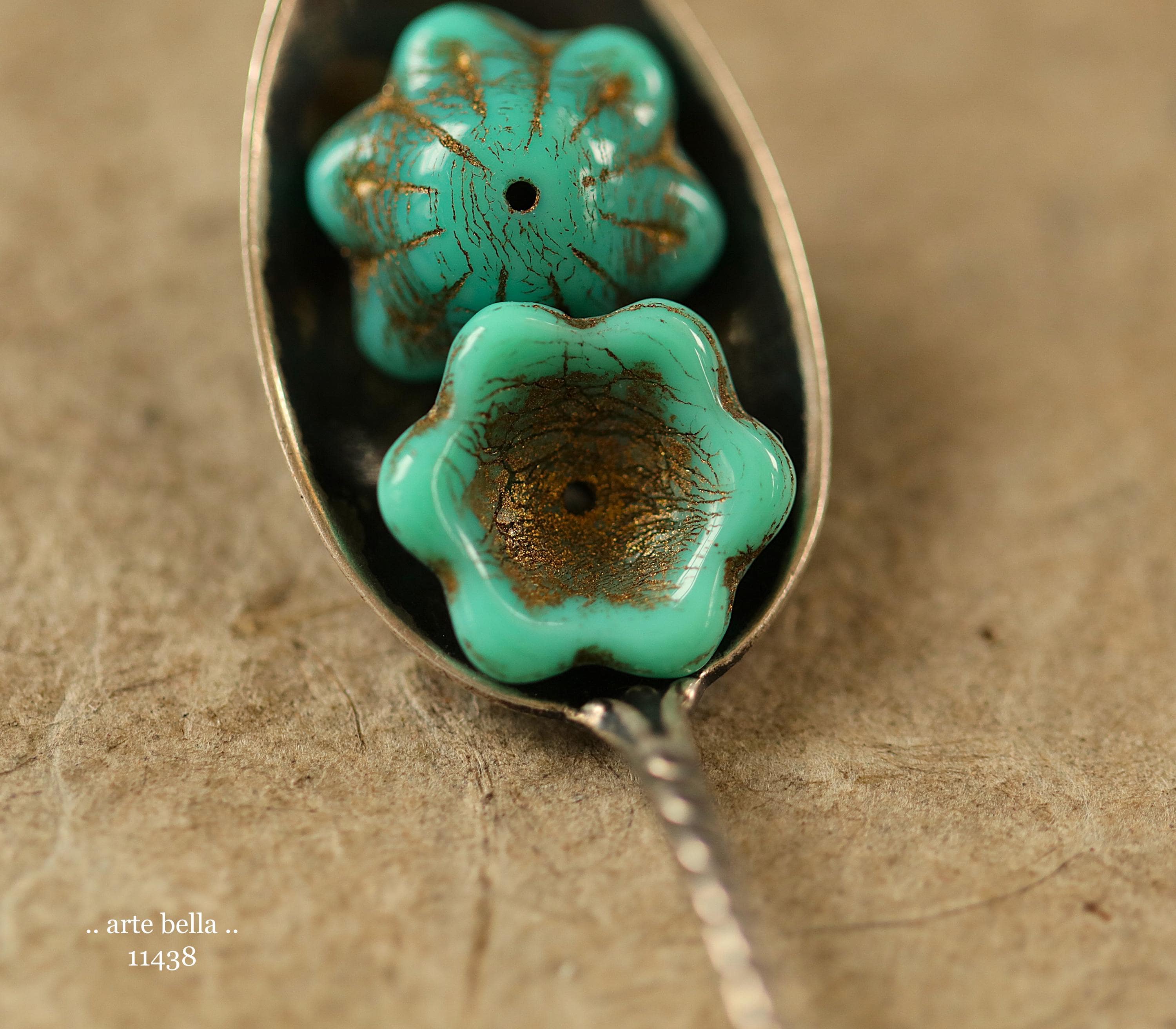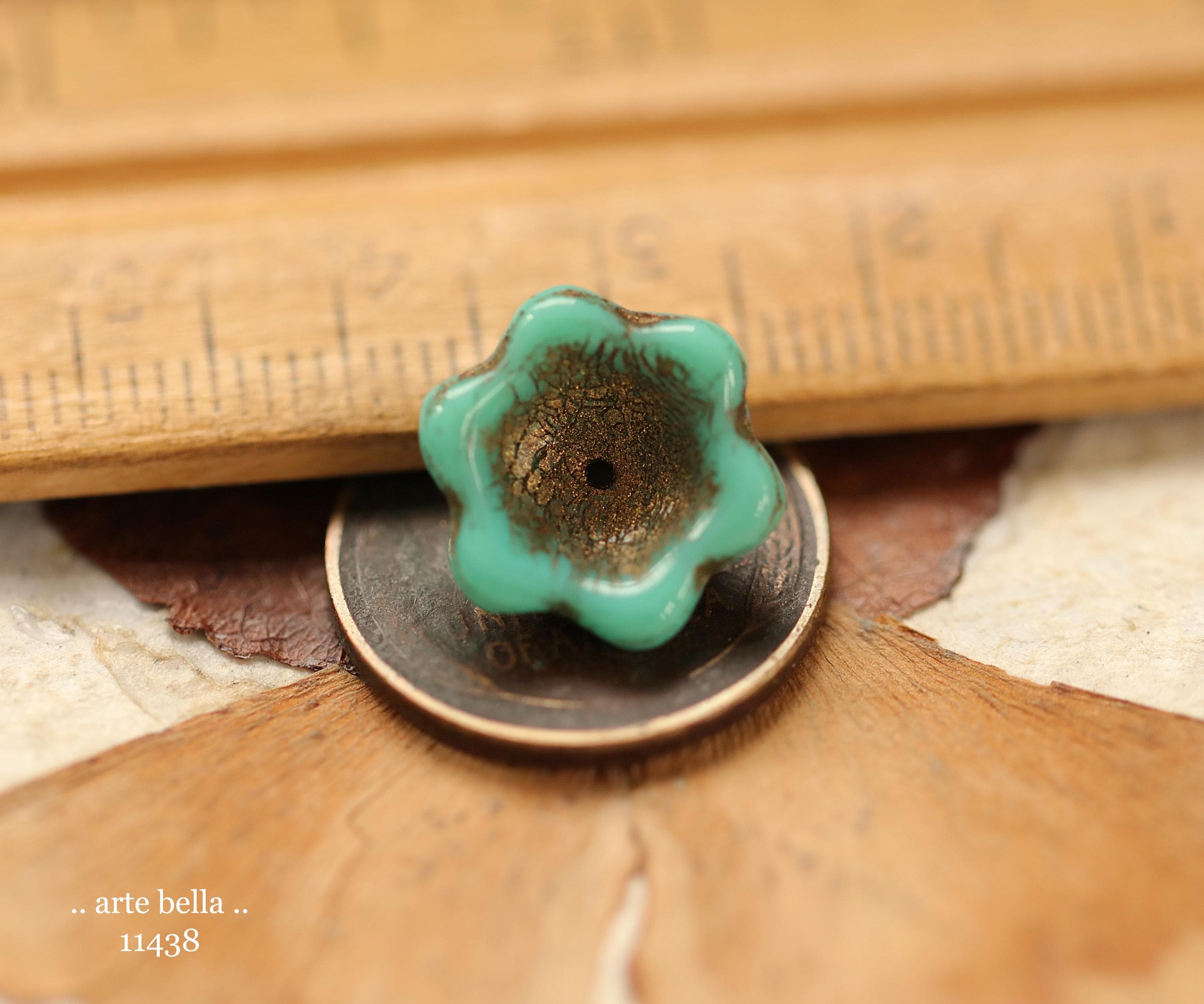 New .. BRONZED TURQUOISE WHIMSY .. 20 Premium Czech Glass Bellflower Beads 14x6mm (11438-st) .. jewelry supplies