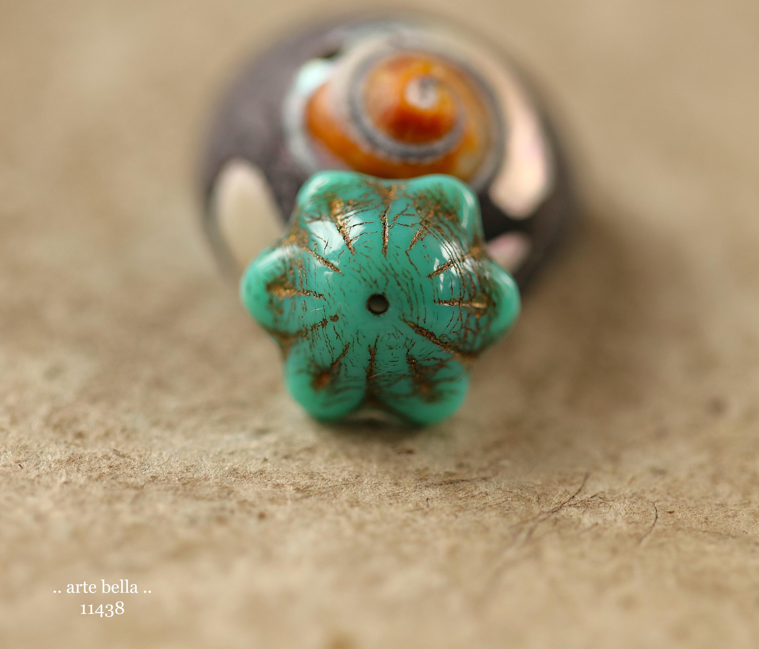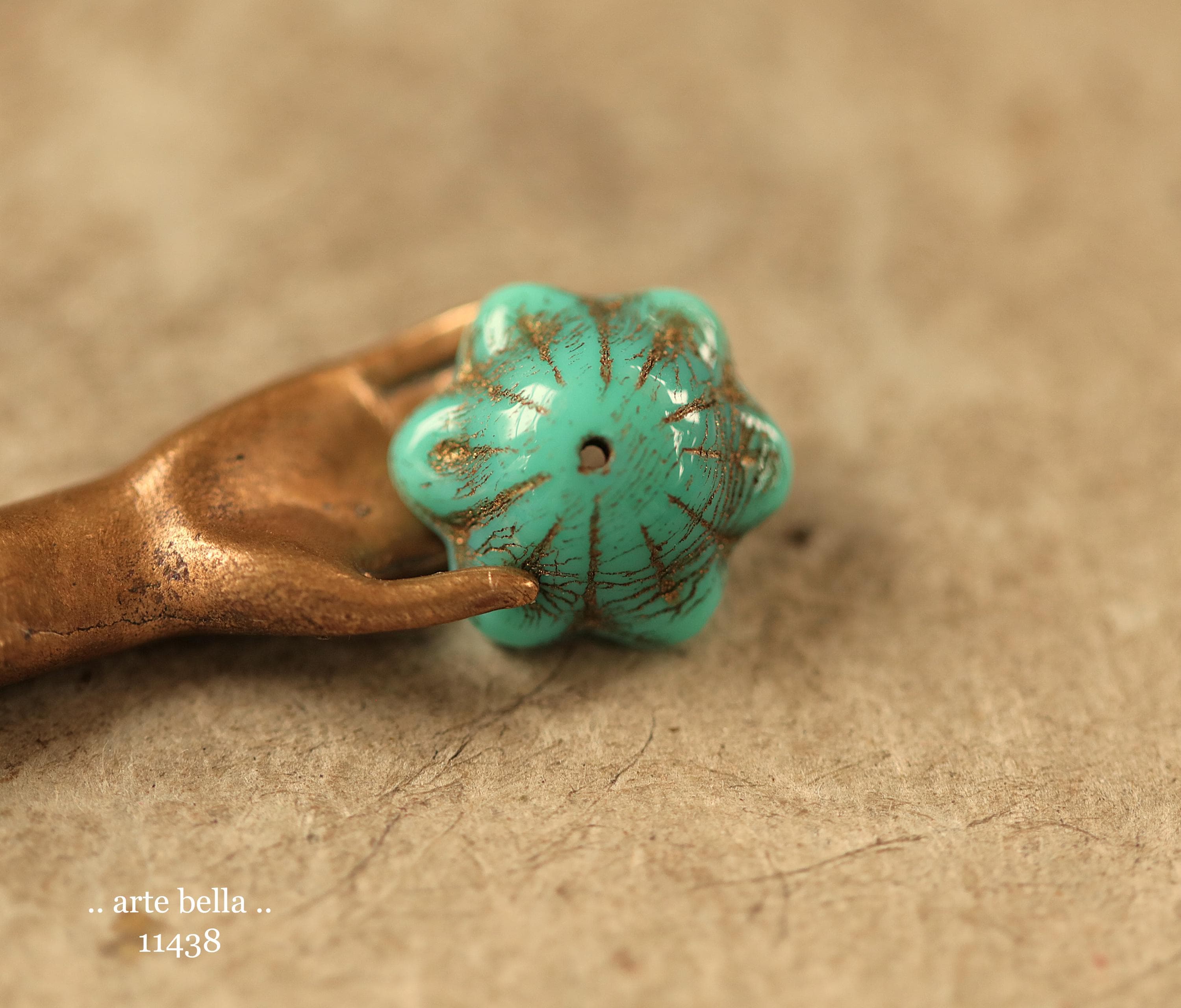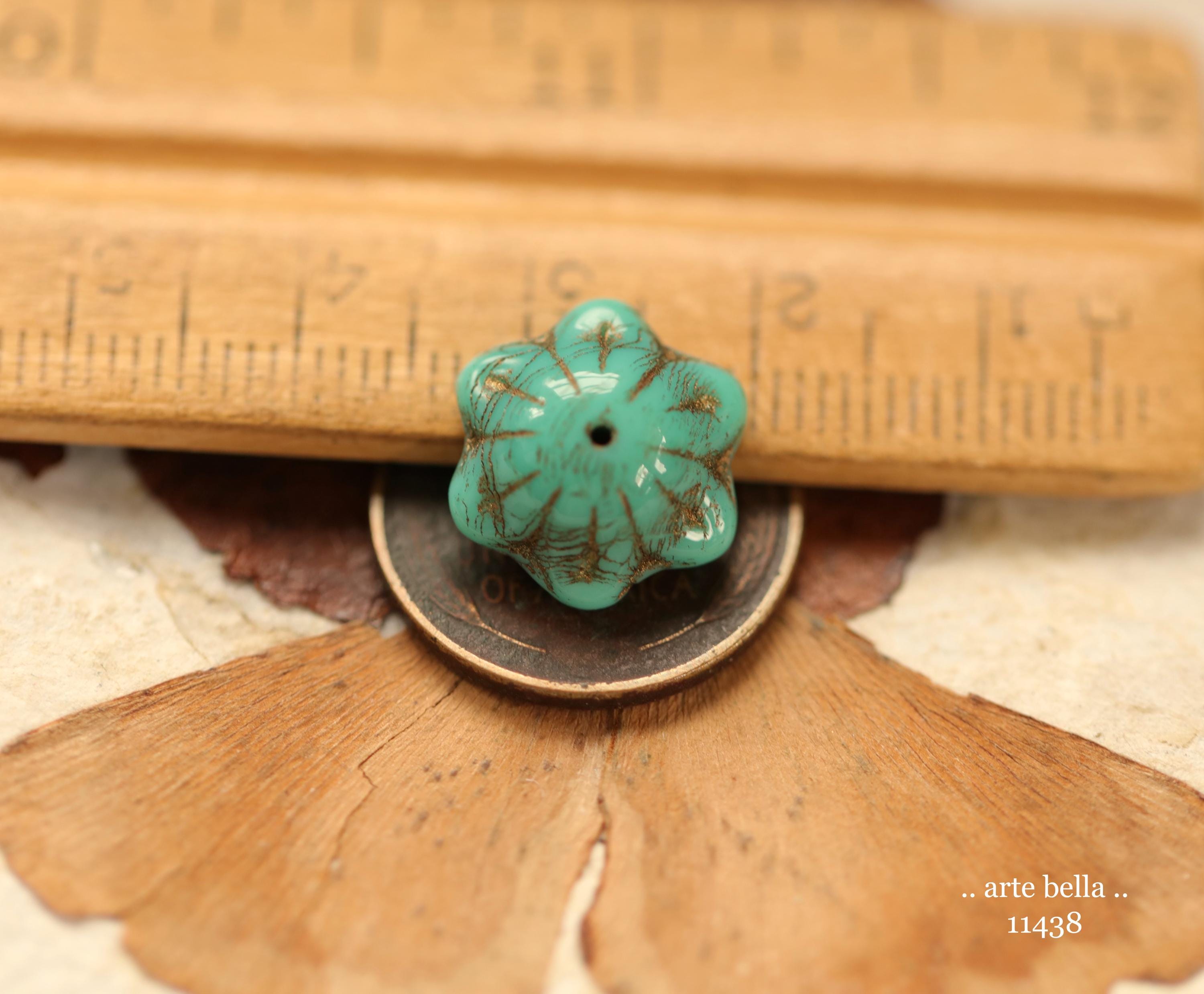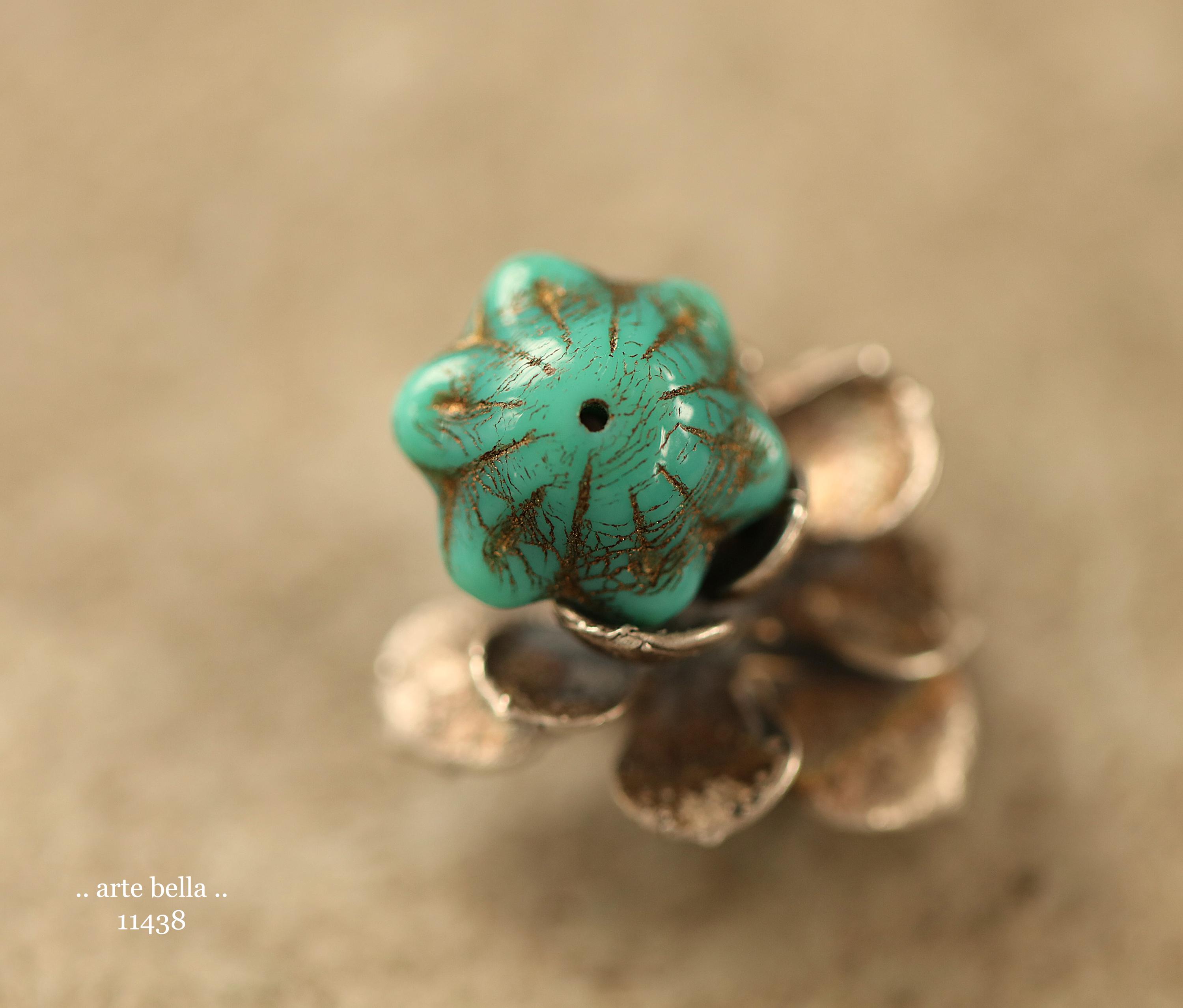 New .. BRONZED TURQUOISE WHIMSY .. 20 Premium Czech Glass Bellflower Beads 14x6mm (11438-st) .. jewelry supplies