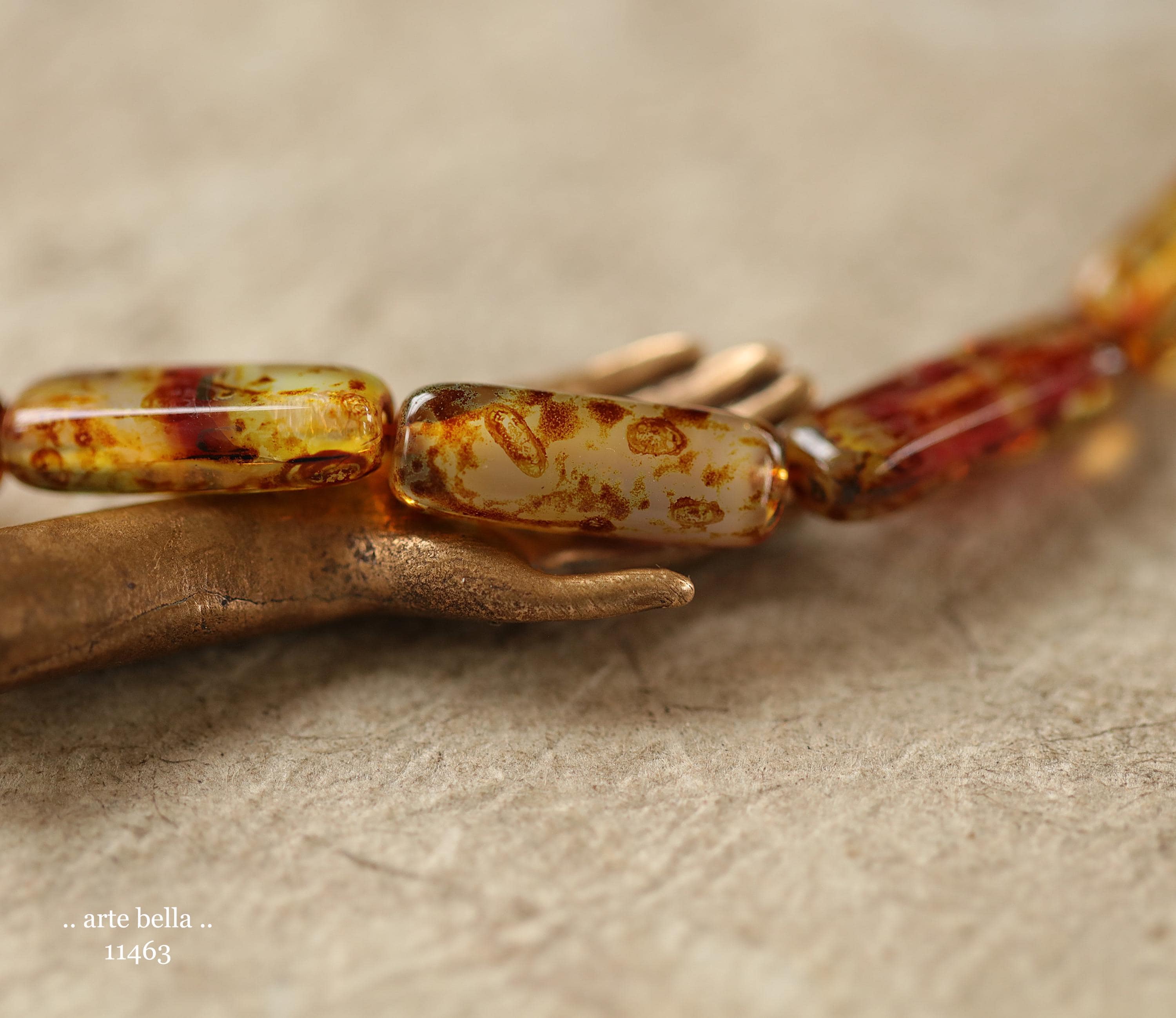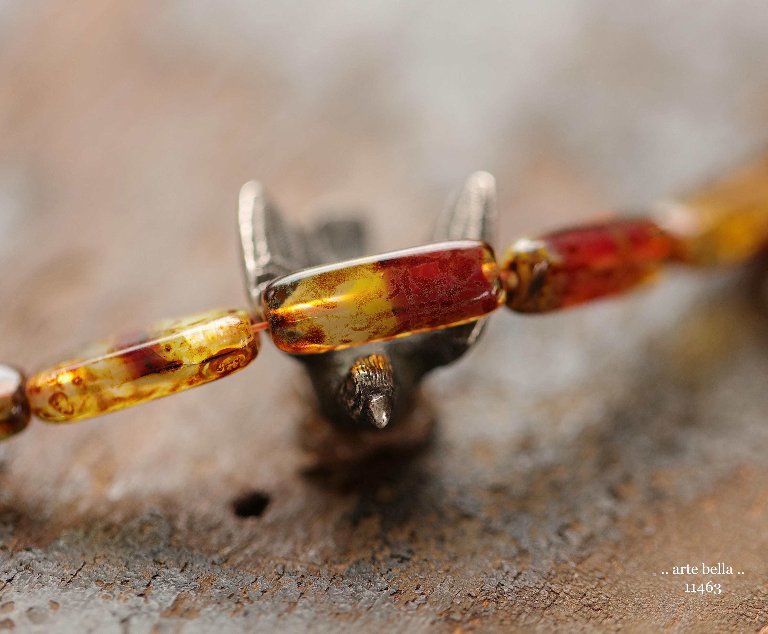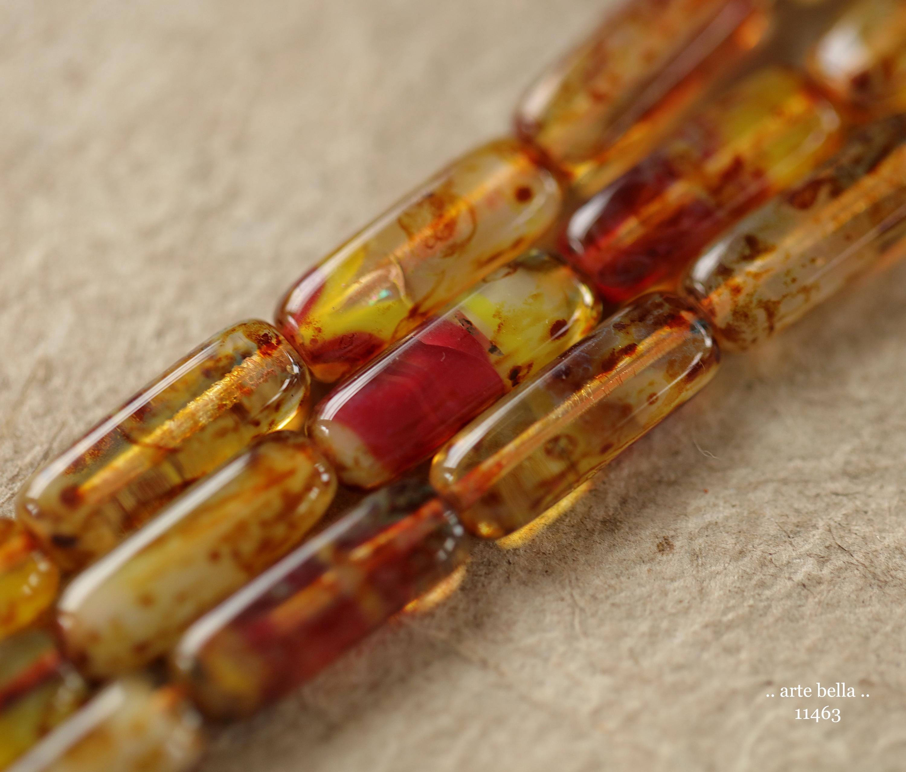 Translucent and opaque mix in maroon red, amber brown, cream, yellow and clear glass with an earthy Picasso and fire polished finishes. **PLEASE NOTE: As seen in my pictures, every bead is unique and one of a kind.**