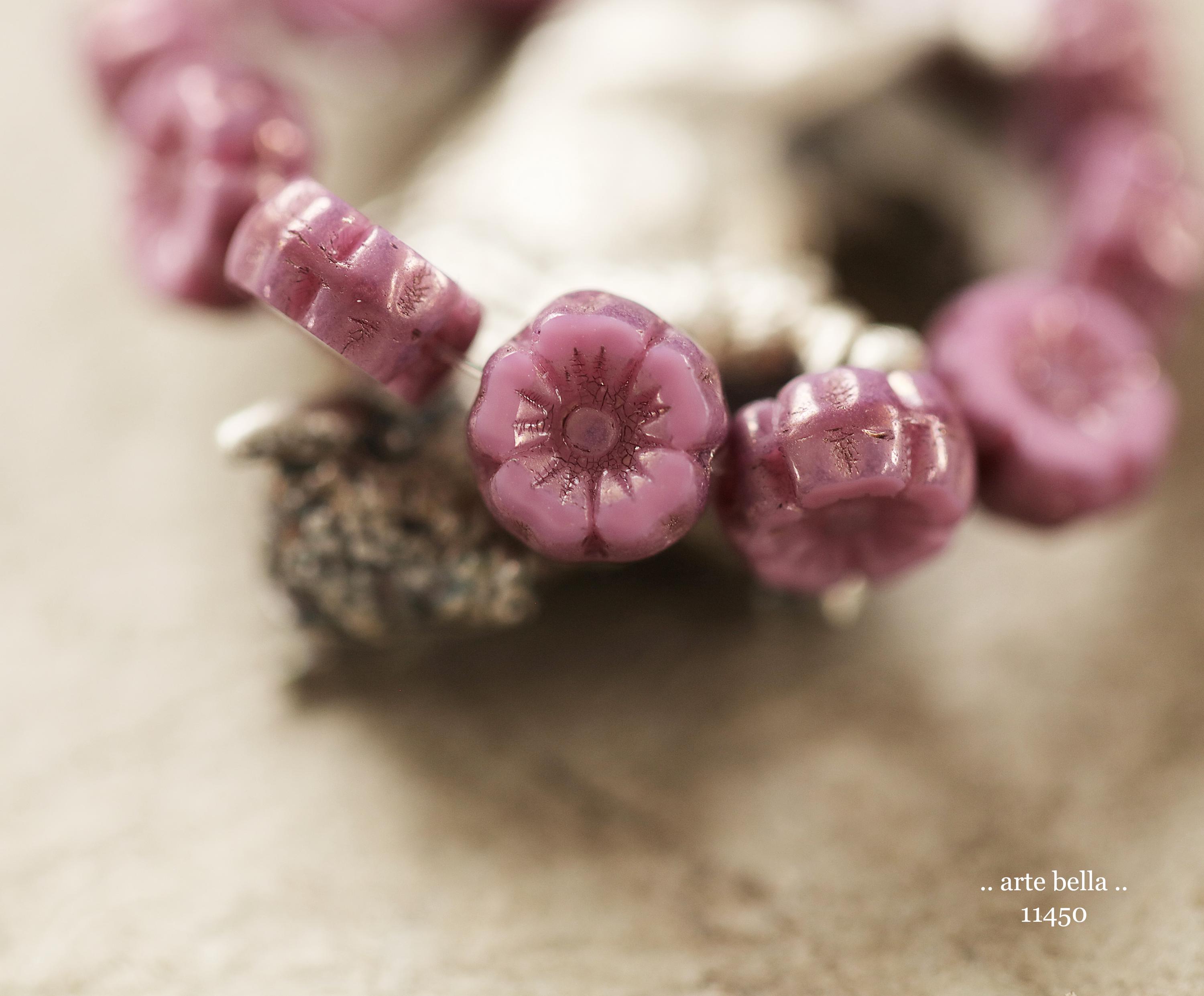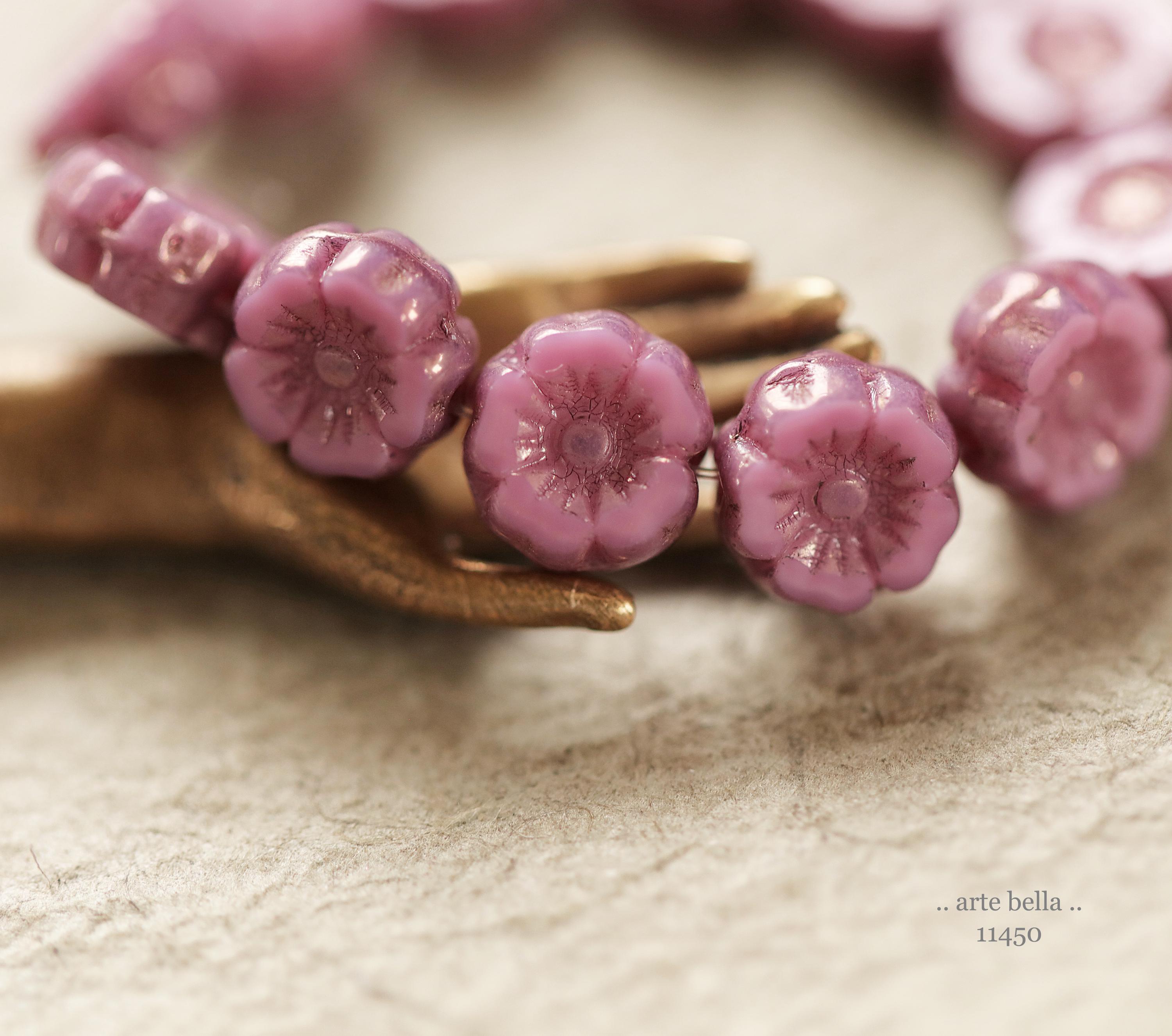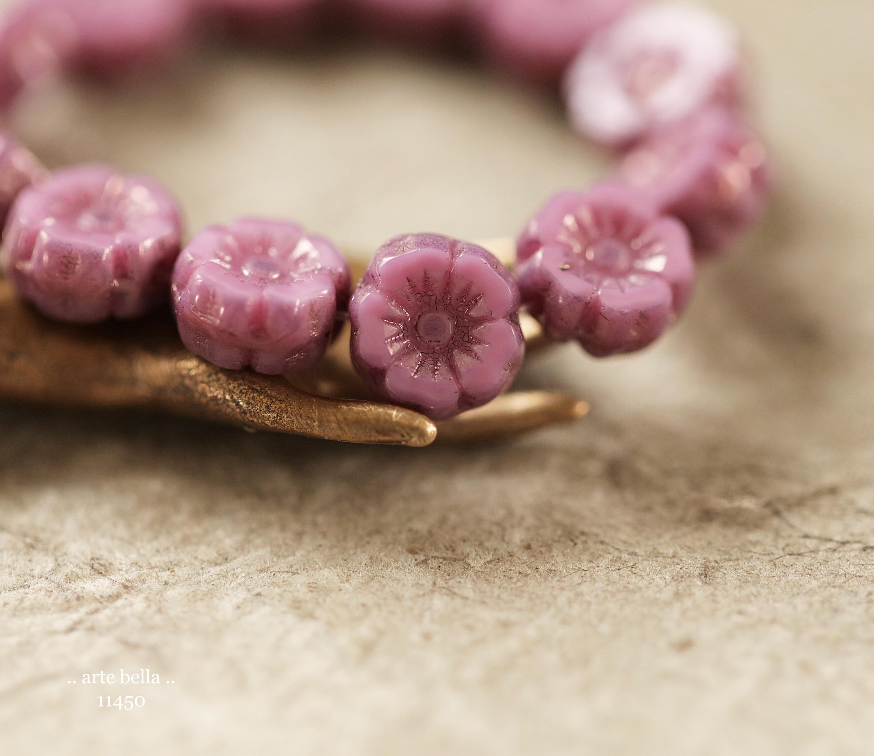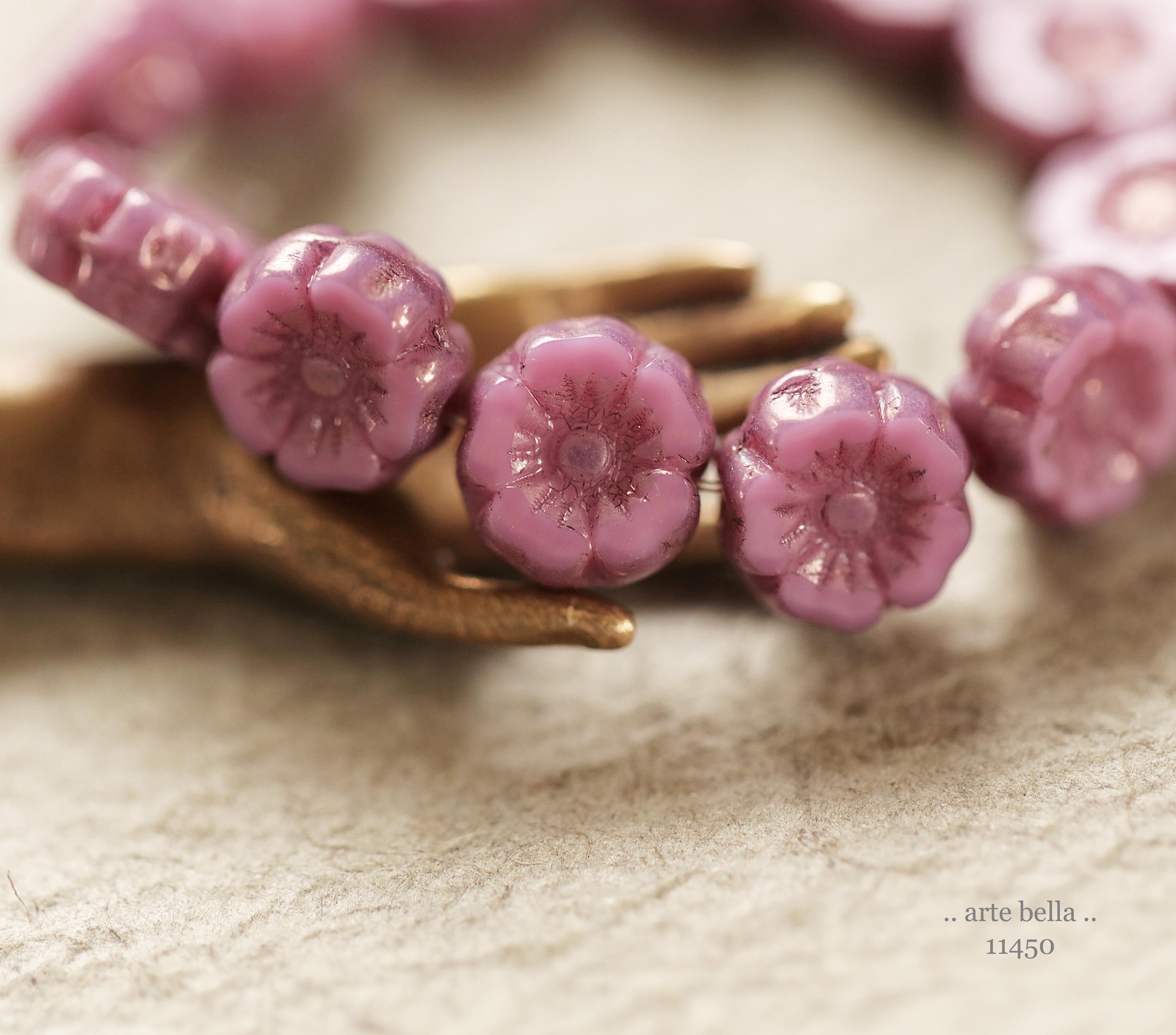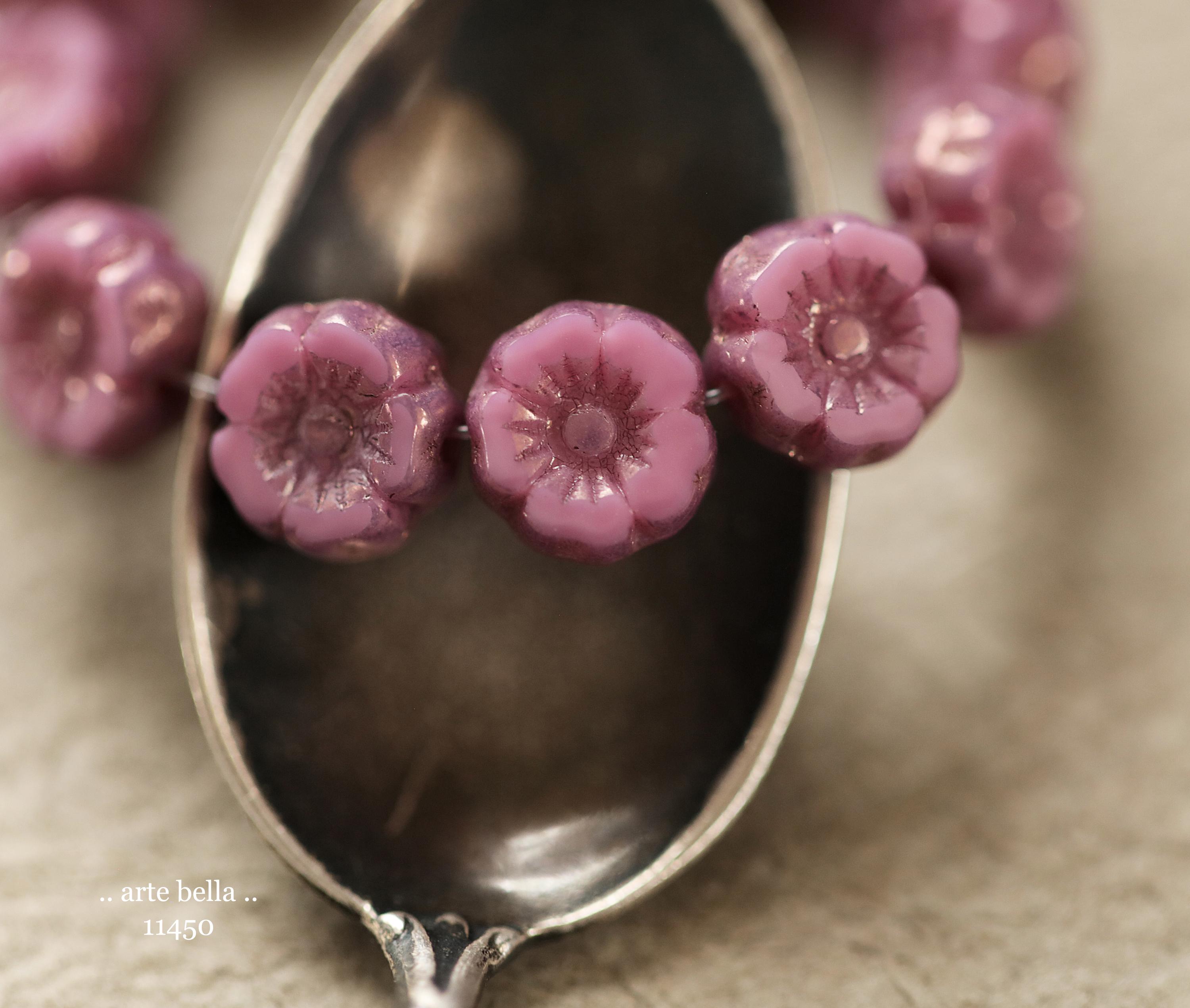 New .. BRONZED PINK PANSY 7mm .. 12 Premium Czech Glass Petite Hibiscus Flower Beads (11450-st) .. jewelry supplies