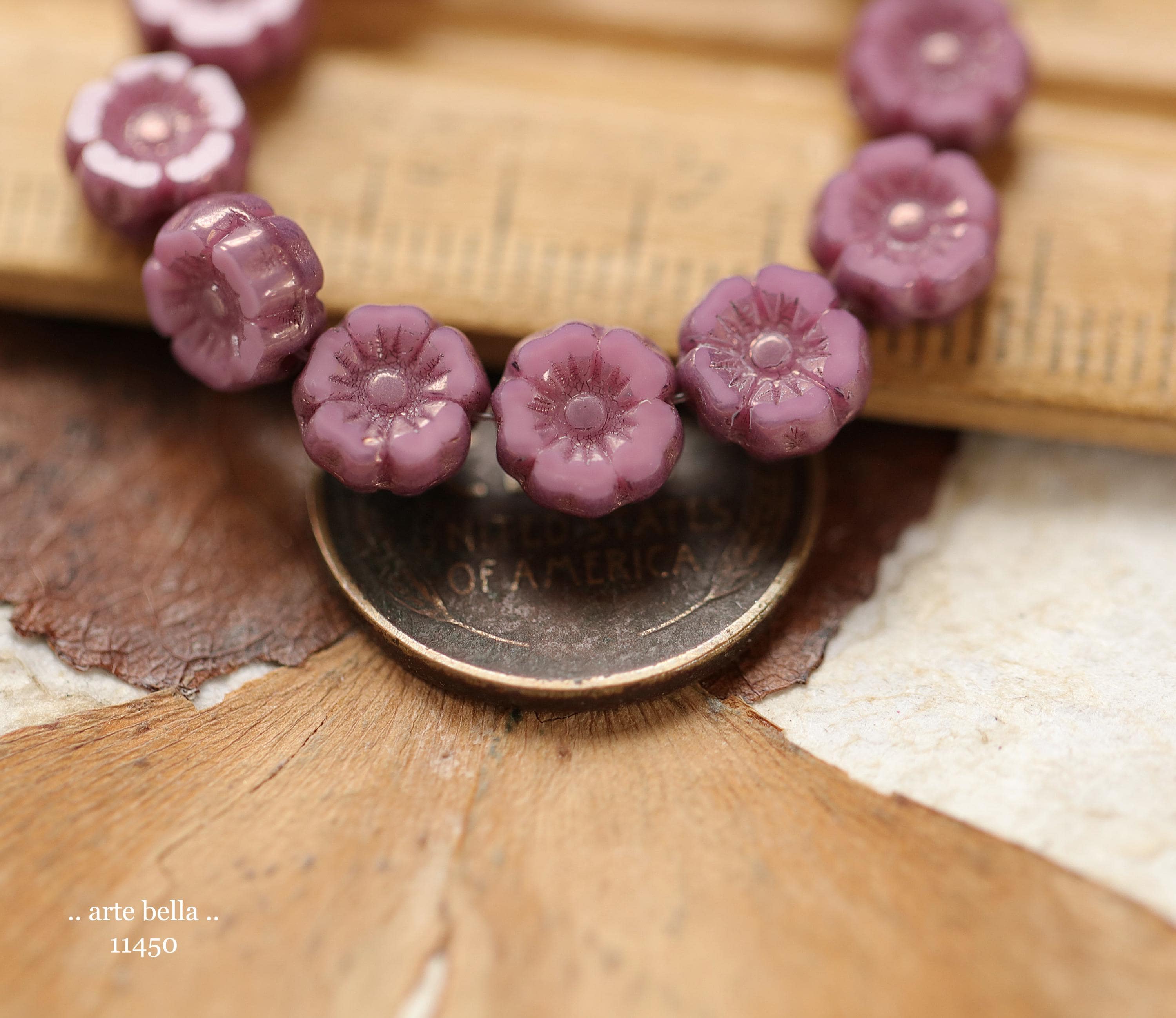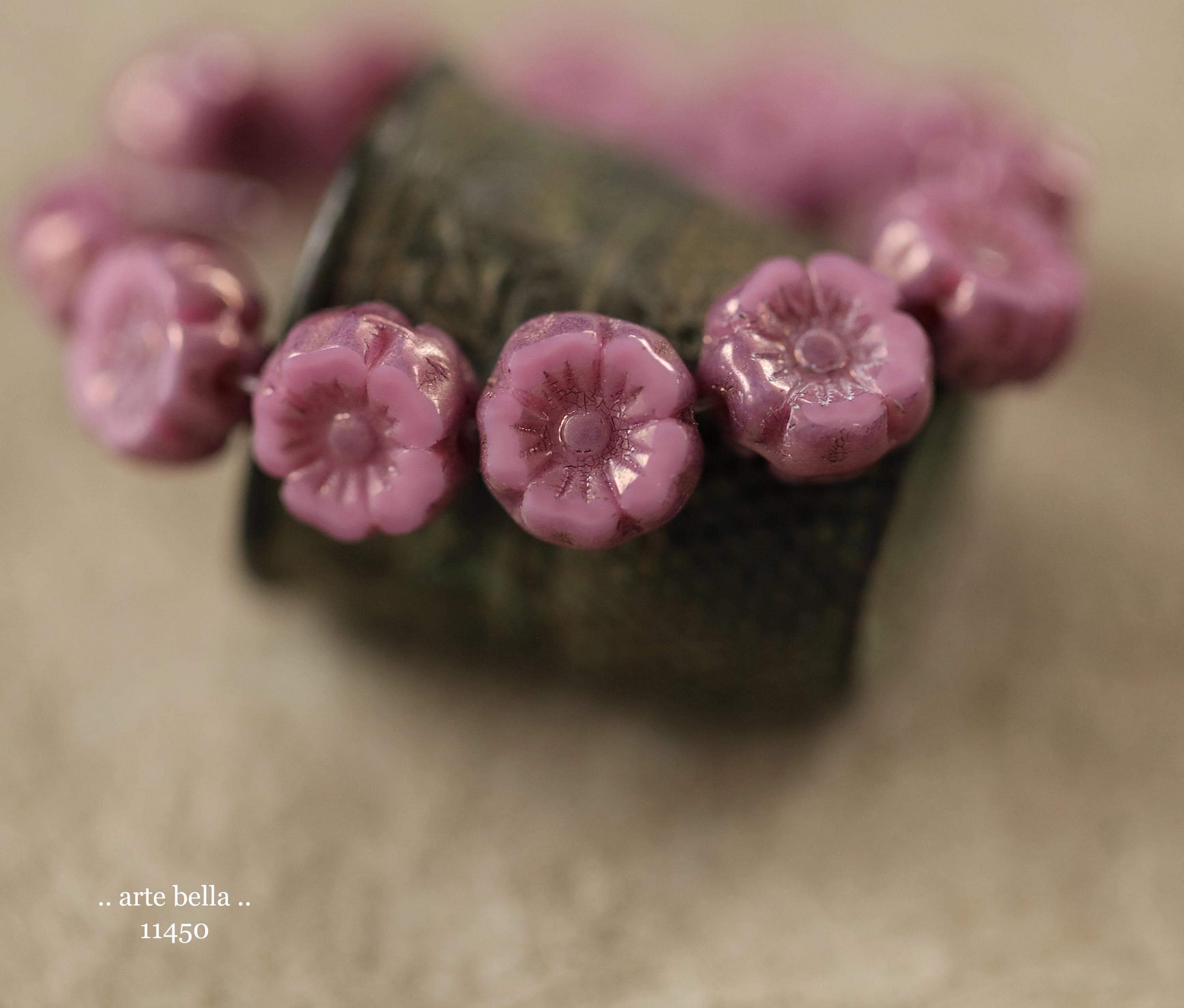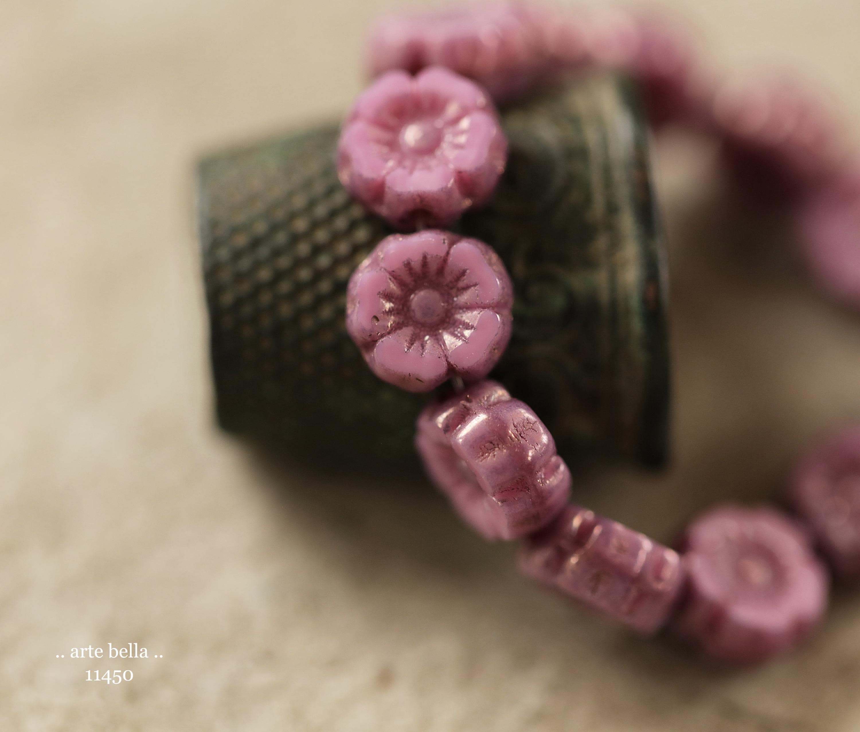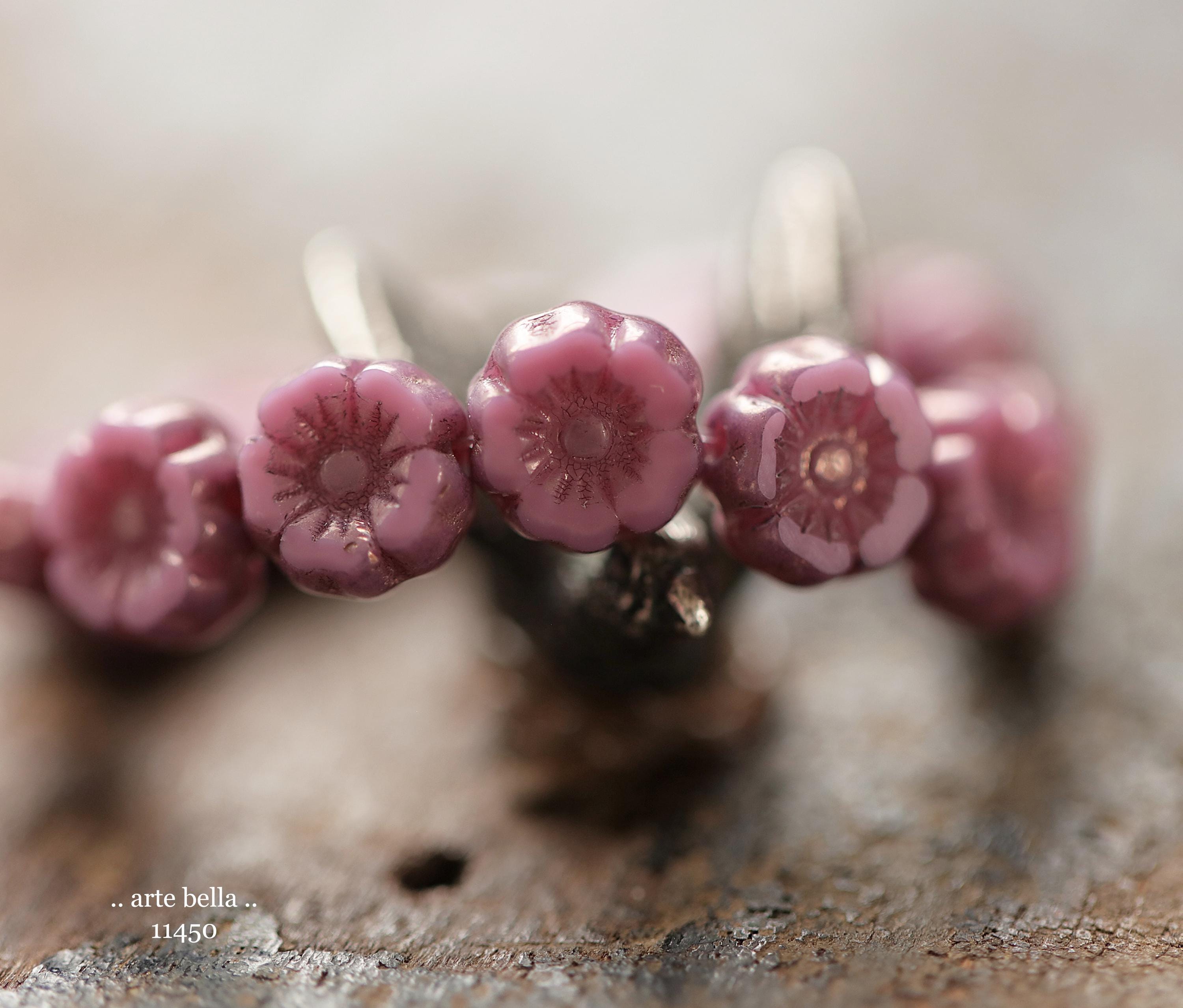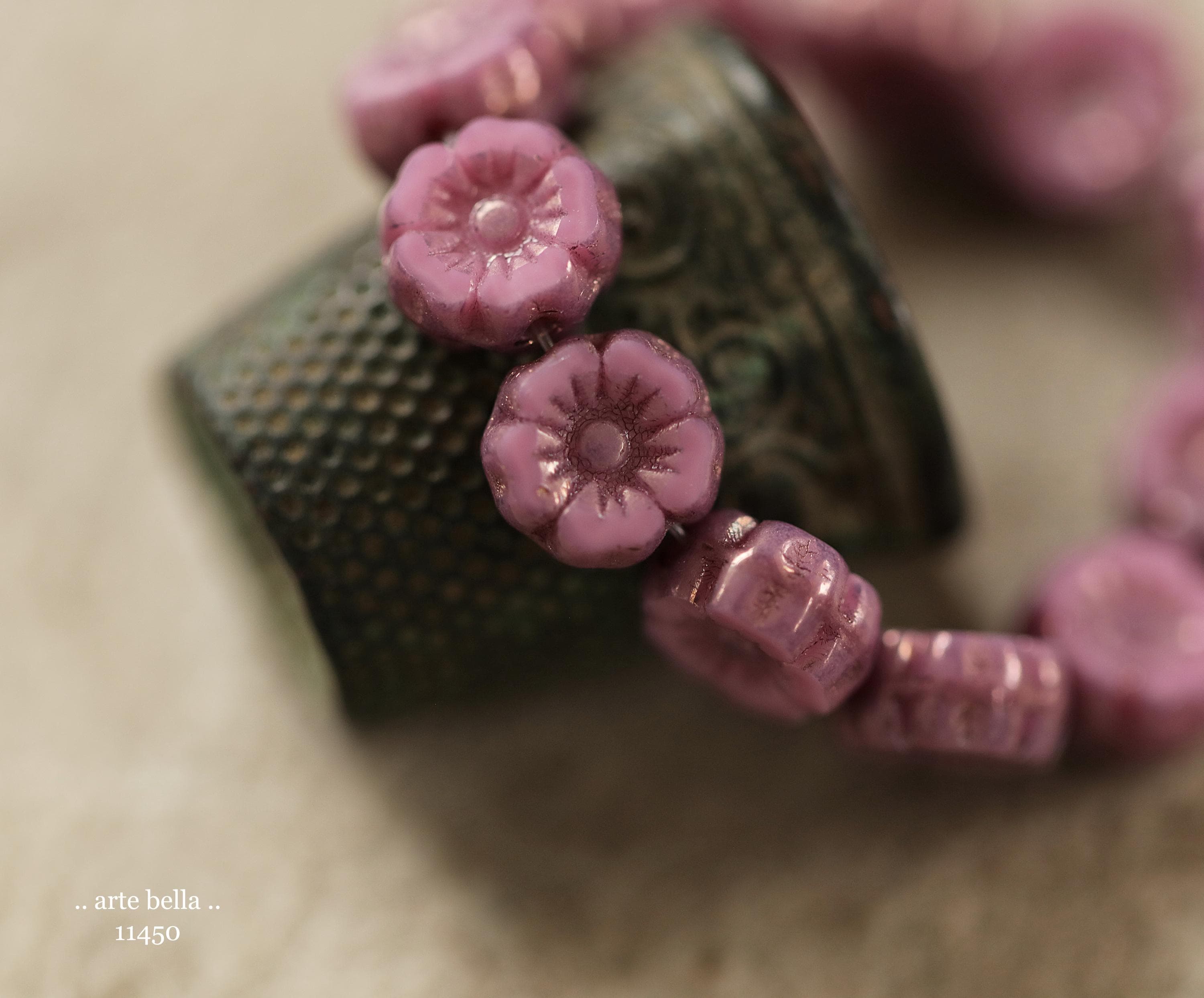 New .. BRONZED PINK PANSY 7mm .. 12 Premium Czech Glass Petite Hibiscus Flower Beads (11450-st) .. jewelry supplies