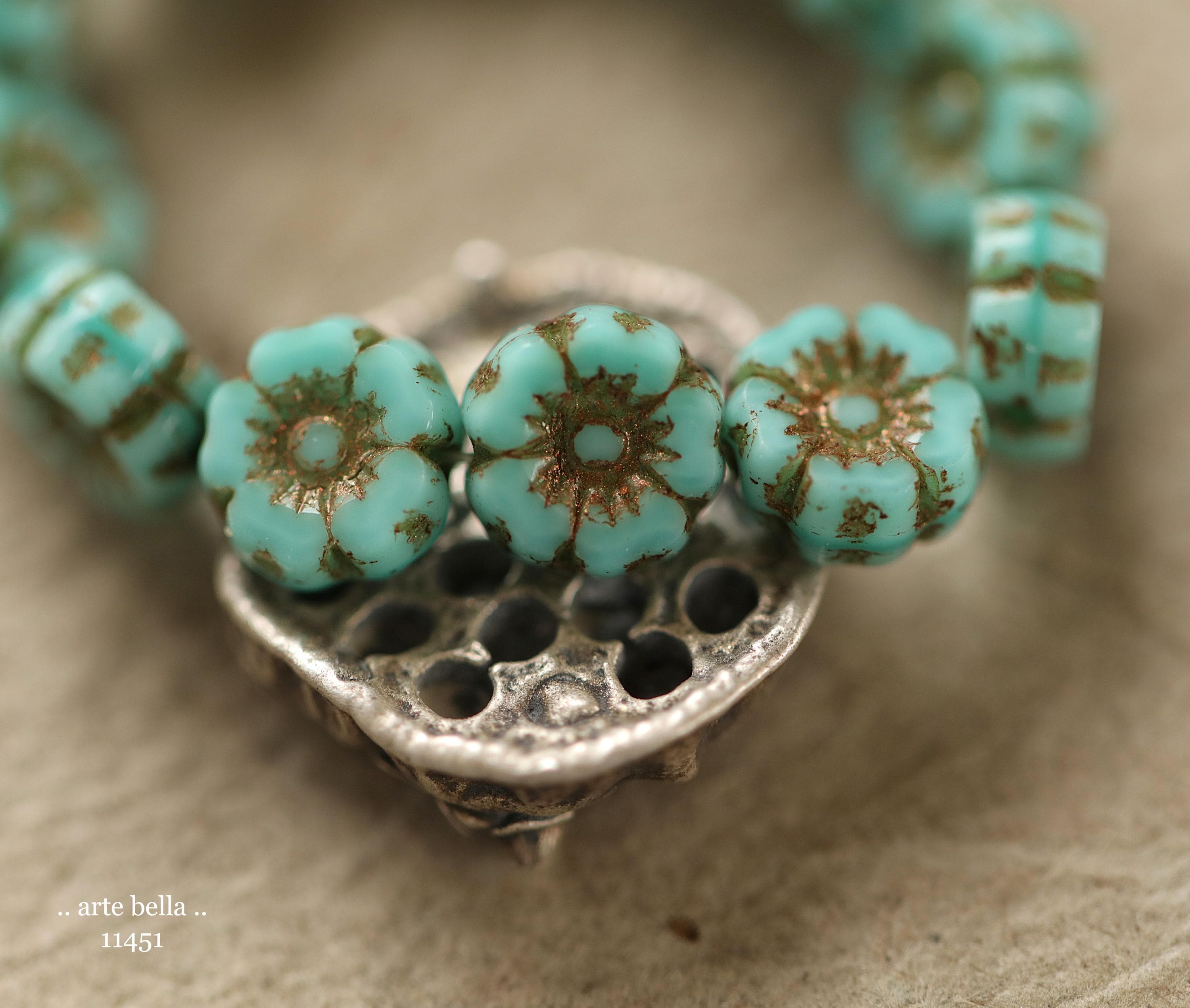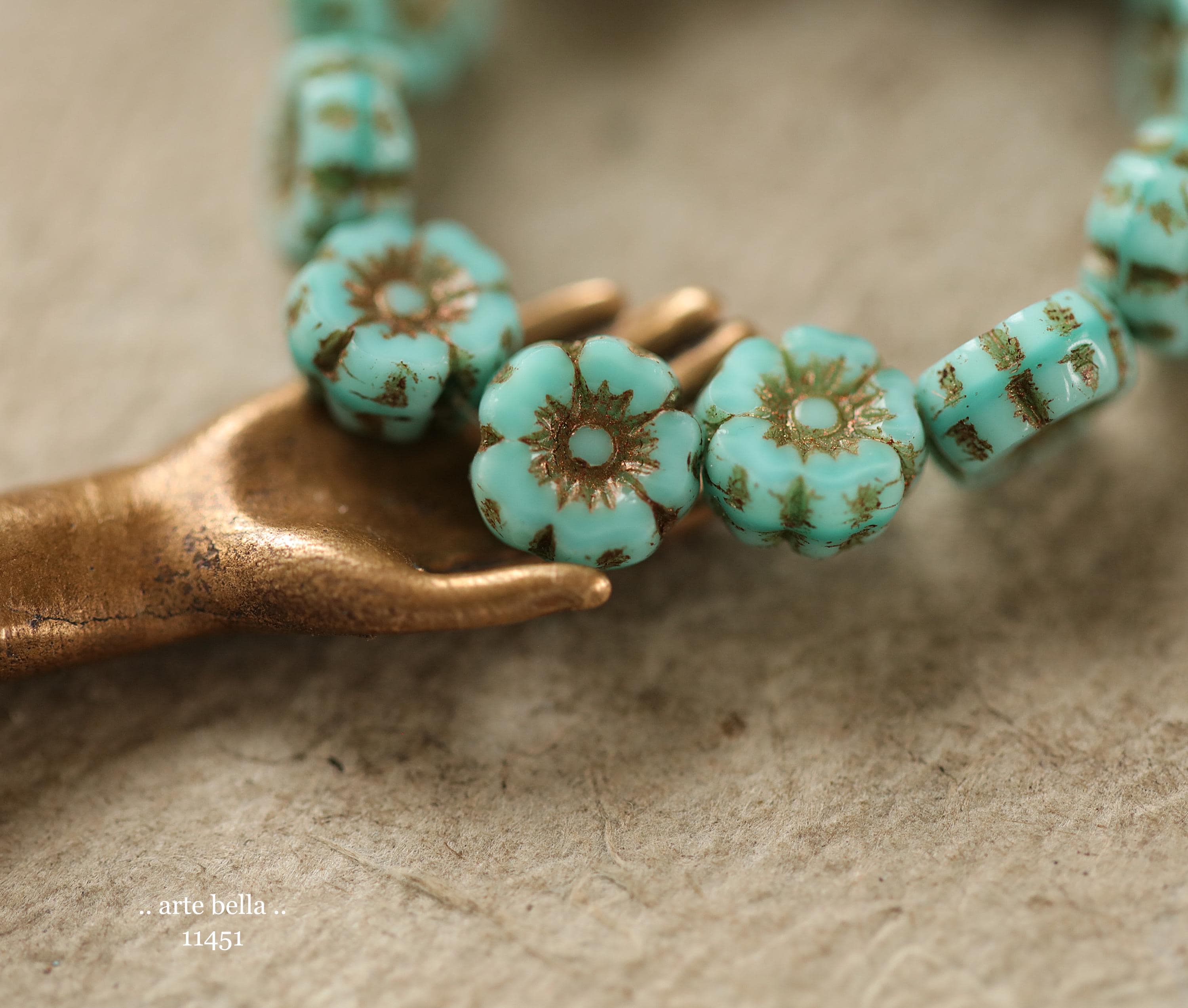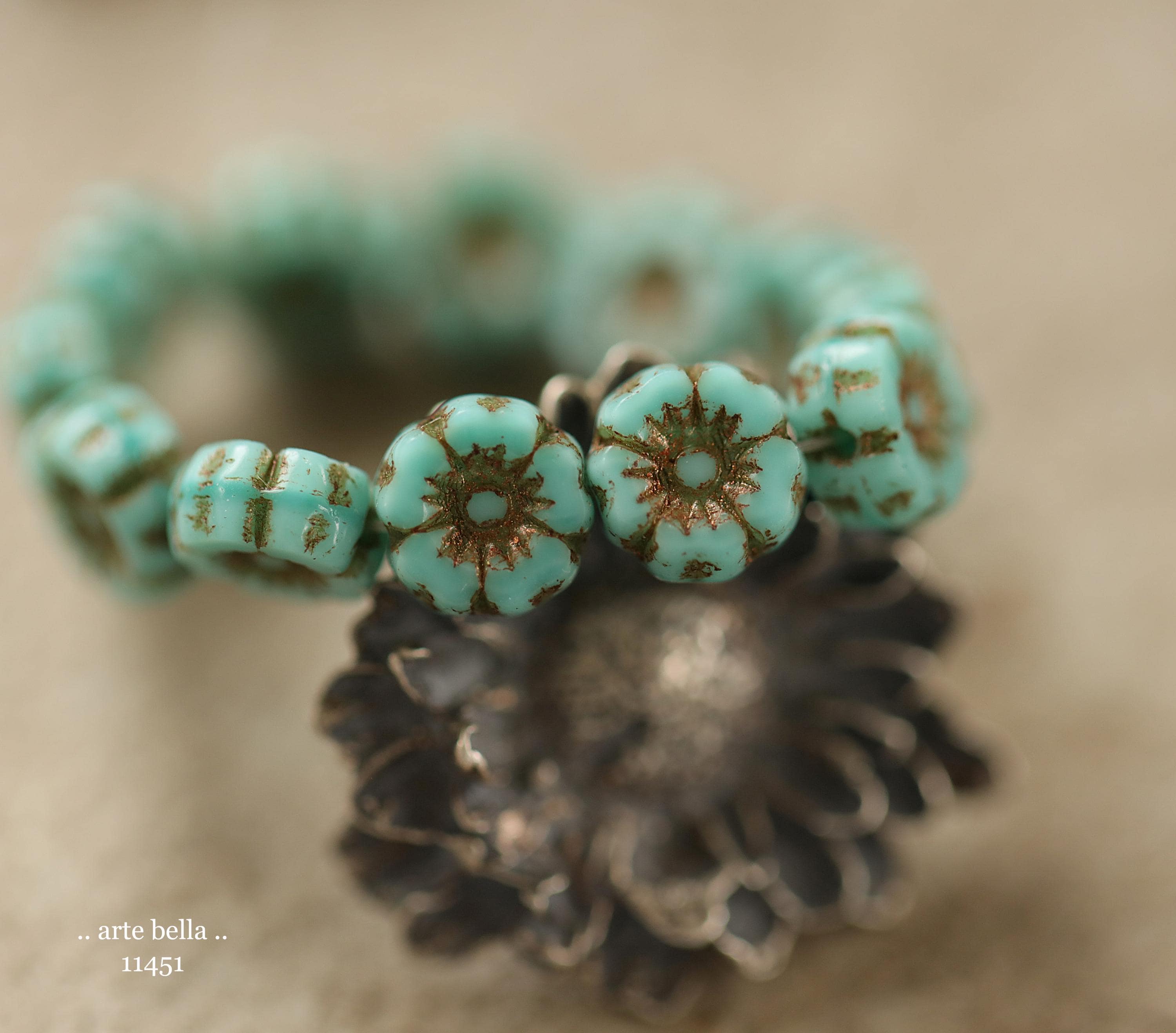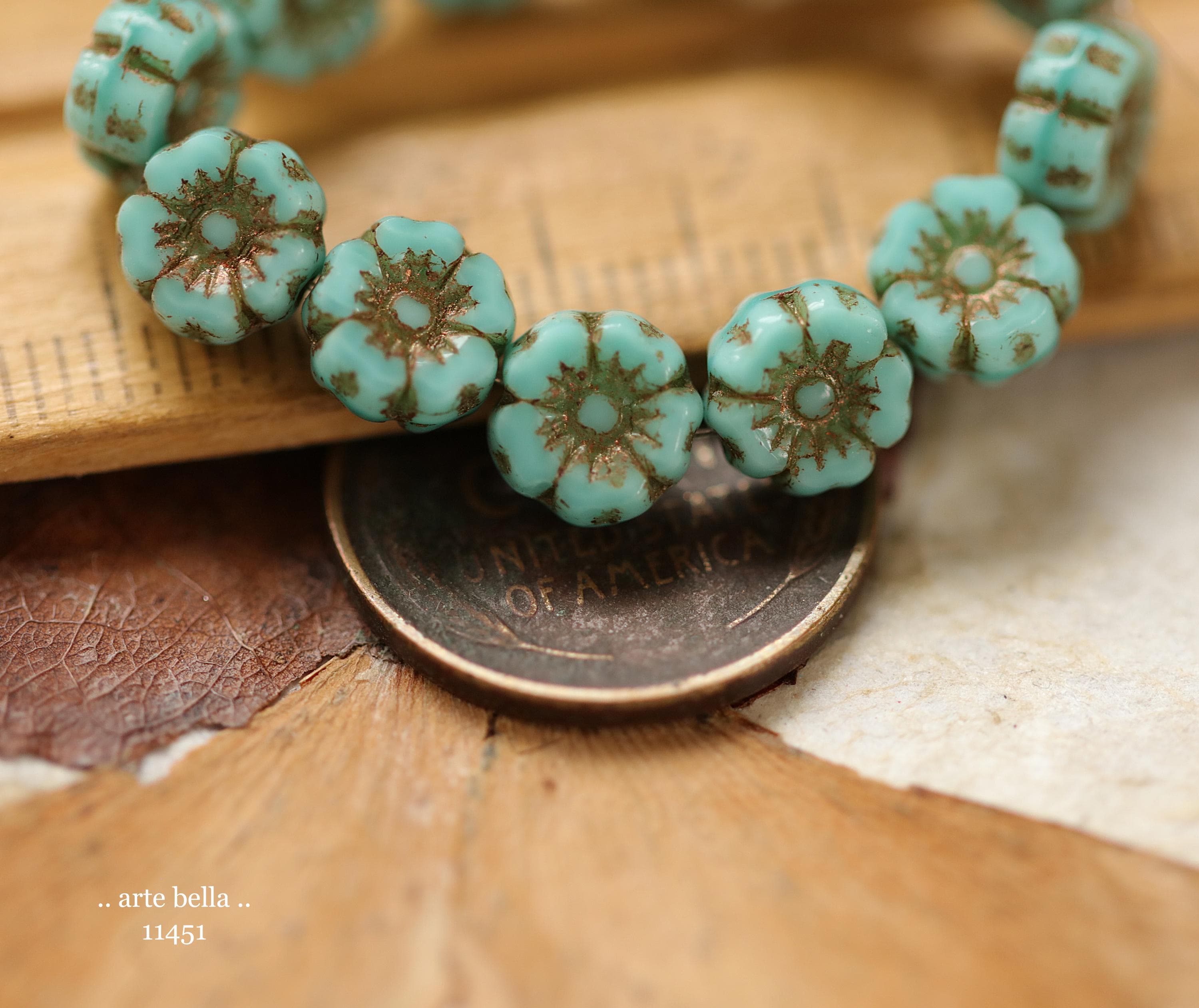 New .. BRONZED TURQUOISE PANSY 7mm .. 12 Premium Czech Glass Petite Hibiscus Flower Beads (11451-st) .. jewelry supplies